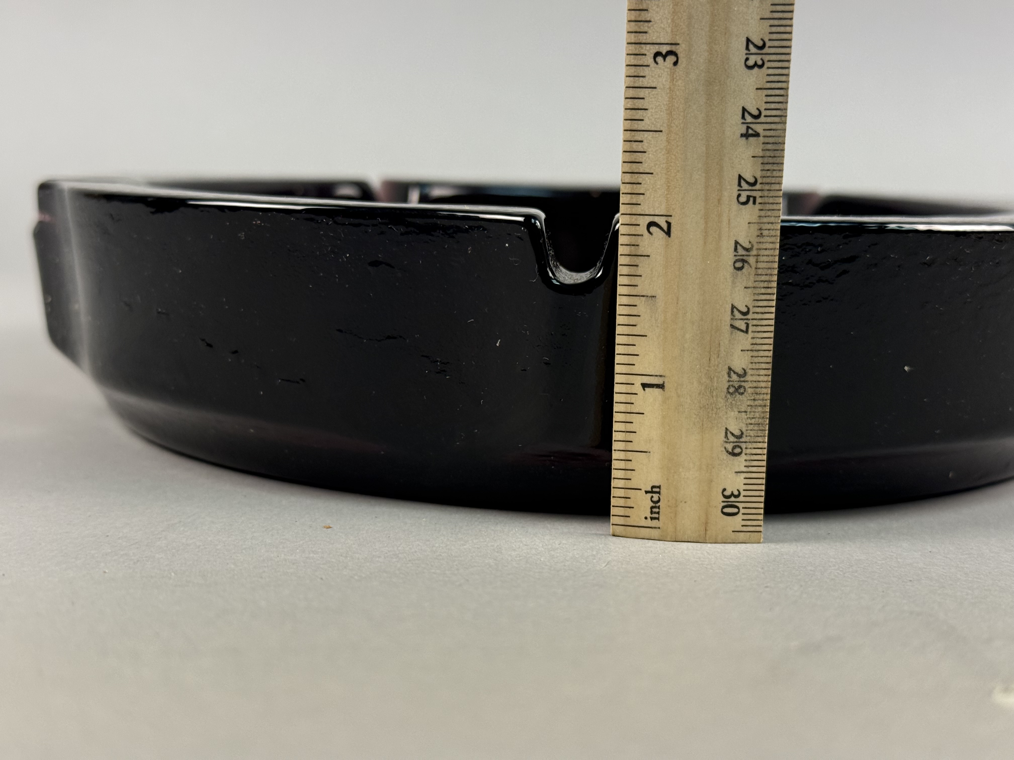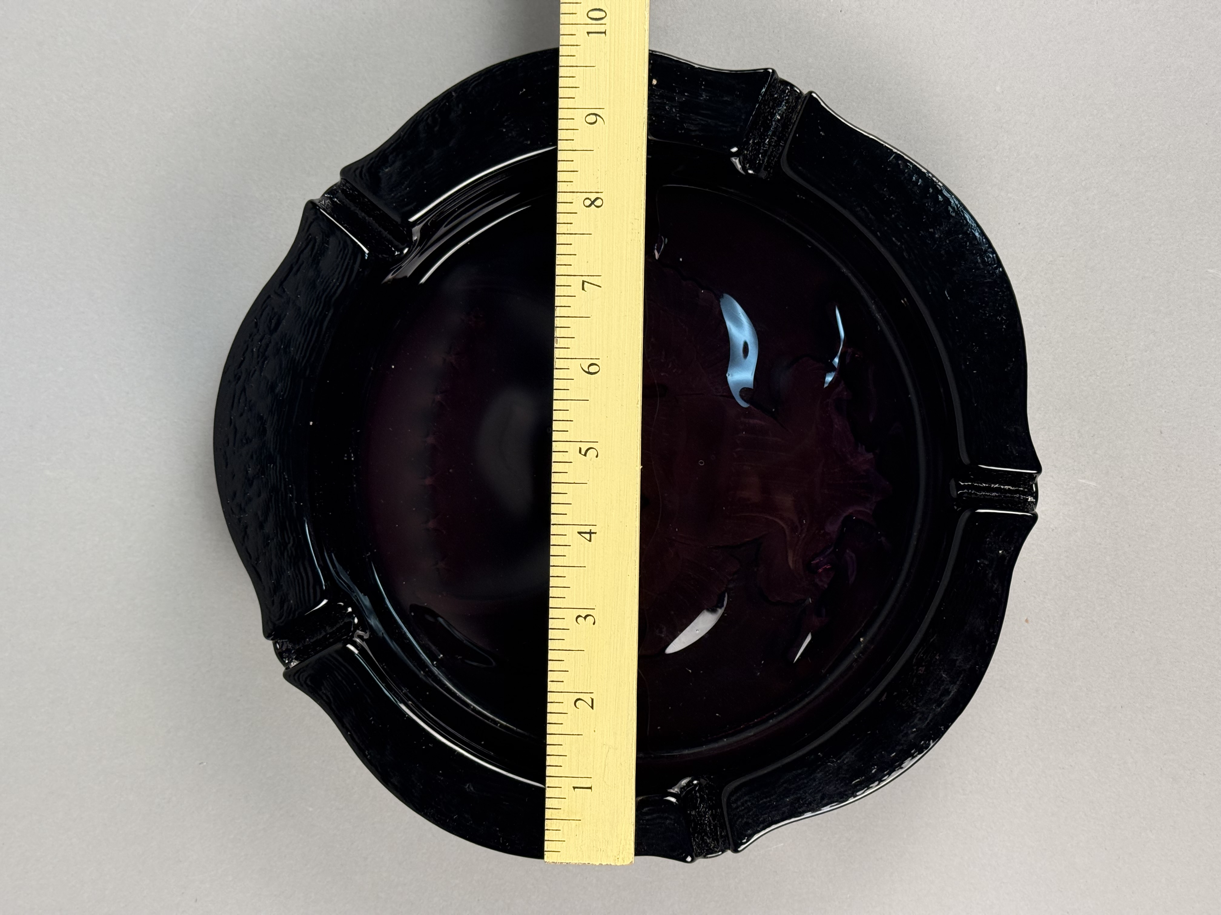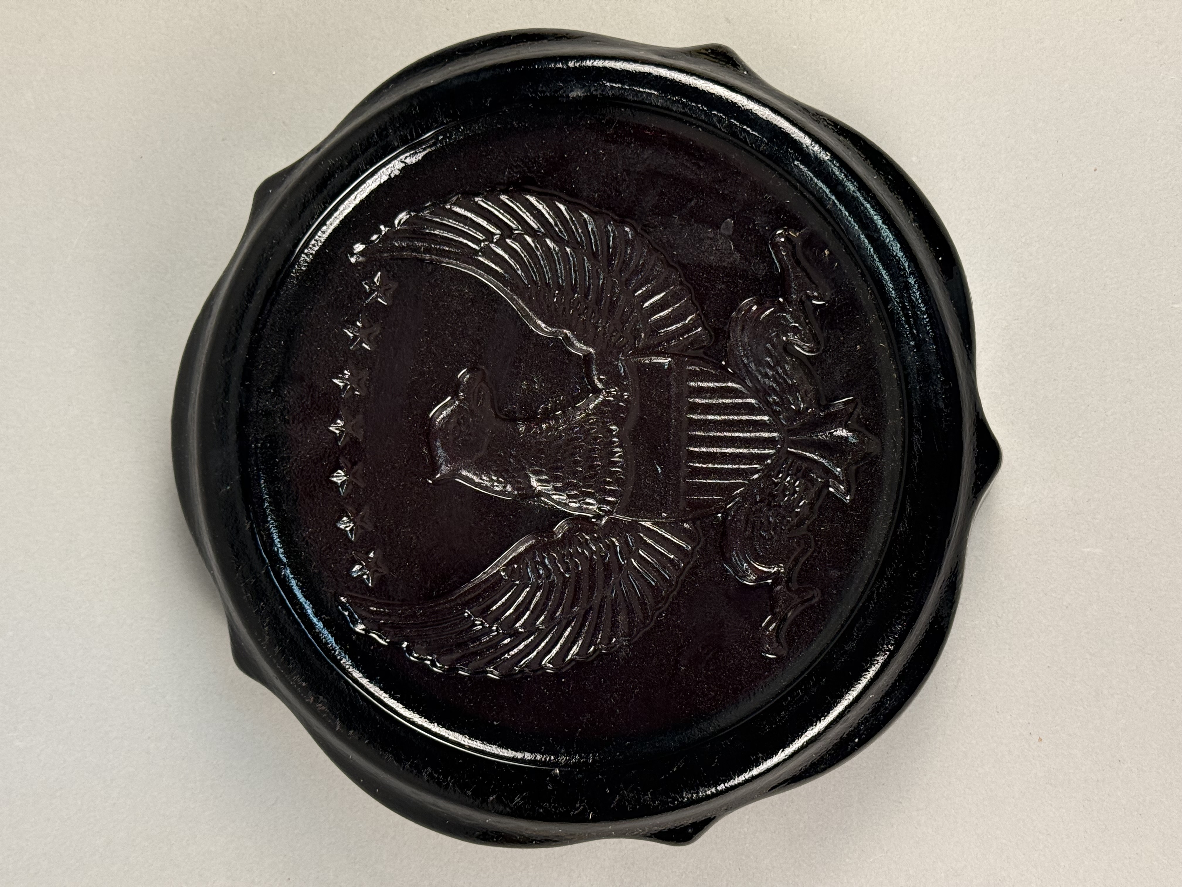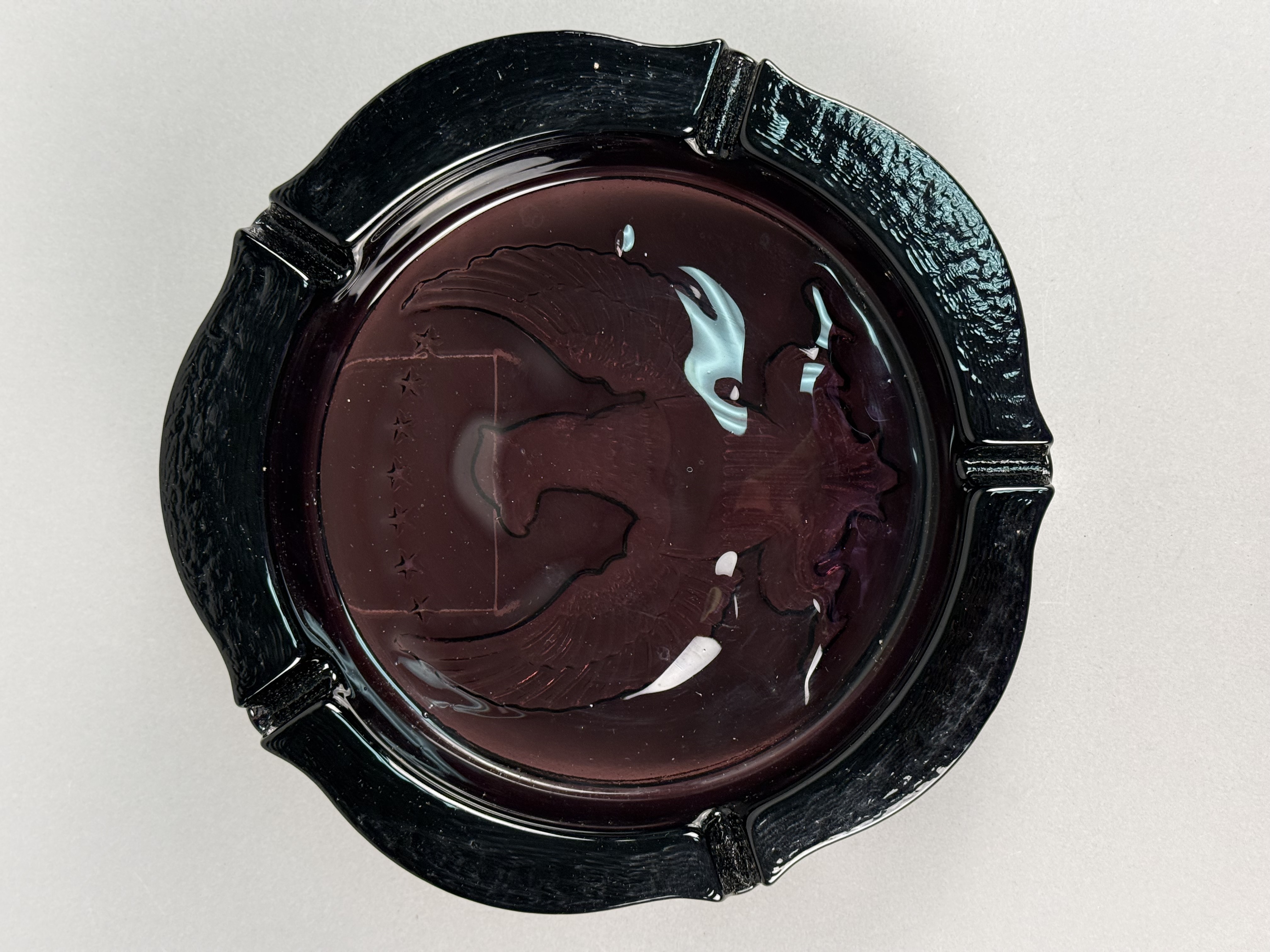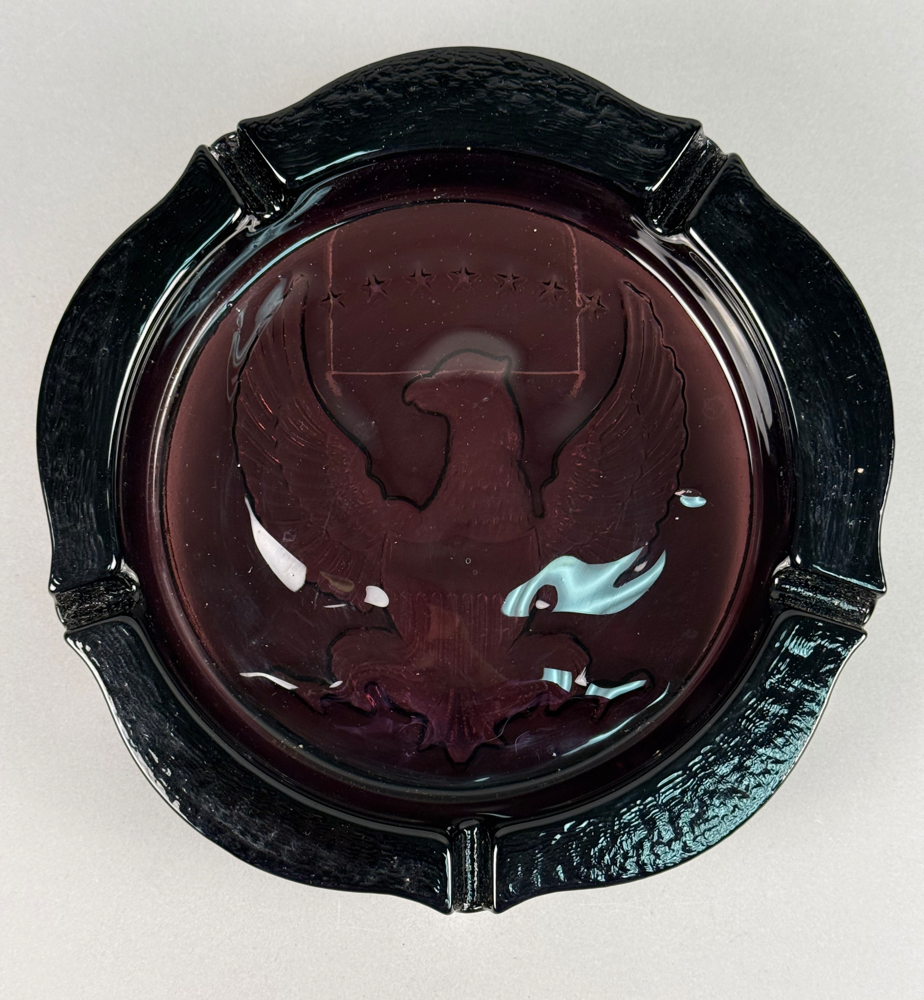 This large circular ashtray is attributed to Indiana Glass and features a pressed intaglio design of an American bald eagle. The central motif depicts an eagle with outstretched wings, a striped shield, and a series of stars, modeled after the Great Seal of the United States. The piece is constructed from black amethyst glass, a material that appears opaque black under normal lighting conditions but reveals a deep purple translucency when held to a direct light source. The exterior rim is finished with a heavy bark-like texture and includes four integrated wide cigarette rests. No manufacturer marks or signatures are present on the item. Diameter: 9.75 inches Height: 2 inches The item is in good vintage condition. There are minor surface scuffs and light shelf wear on the base consistent with age and use. No chips, cracks, or structural repairs are visible.