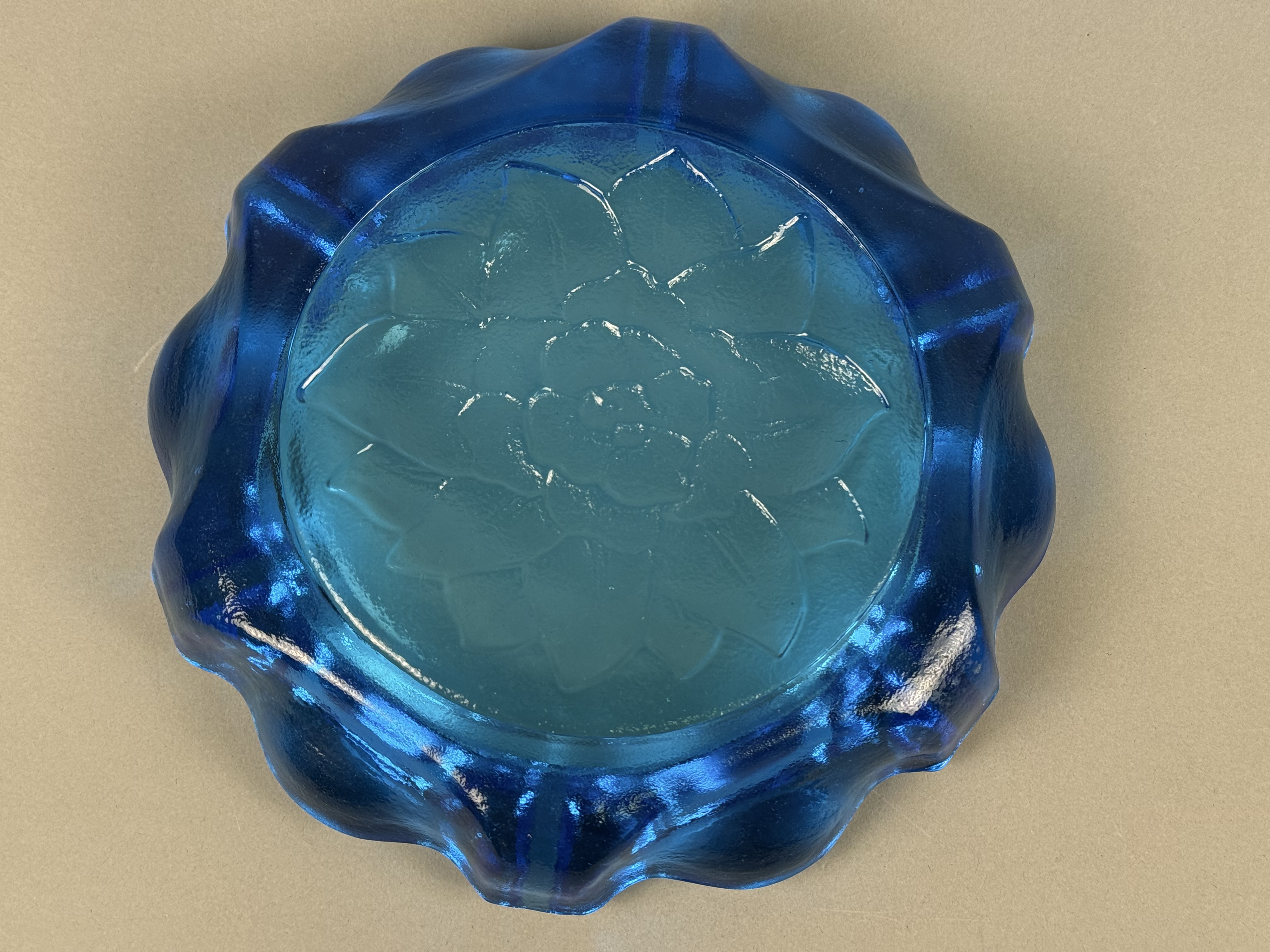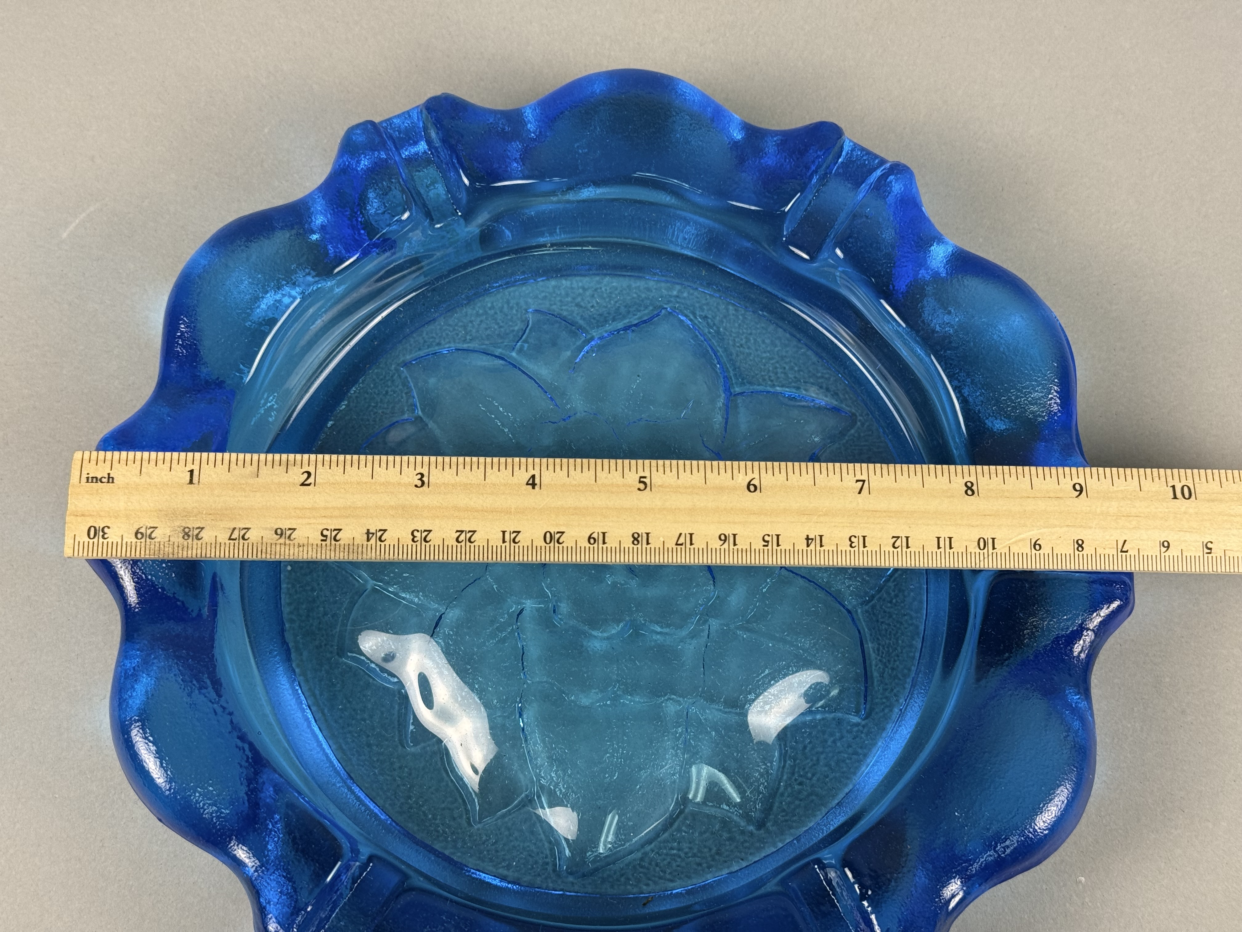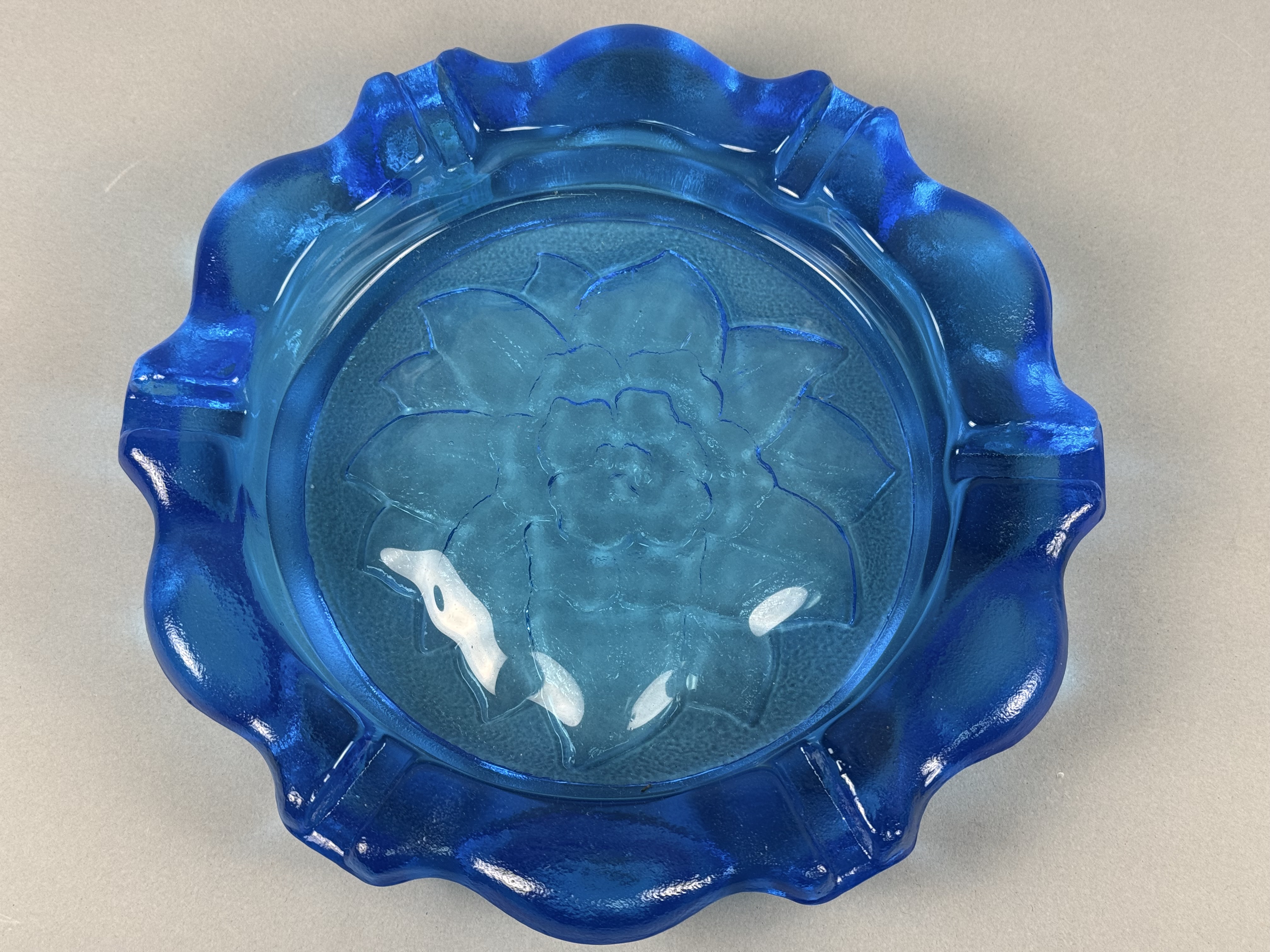 This large pressed glass ashtray is the Lotus Flower pattern produced by Indiana Glass for Tiara Exclusives. The piece is constructed from heavy cobalt blue glass and features a central embossed floral motif resembling a lotus or peony. The background of the center well is finished with a stippled orange peel texture. The wide, flared rim is heavily scalloped with a ruffled edge and incorporates four integrated cigarette rests. This item is characteristic of mid-20th-century American decorative glassware. No maker marks, letters, or symbols are present on the body or base. Diameter: 9.5 inches The item is in good condition. There are no visible chips, cracks, or significant surface wear.