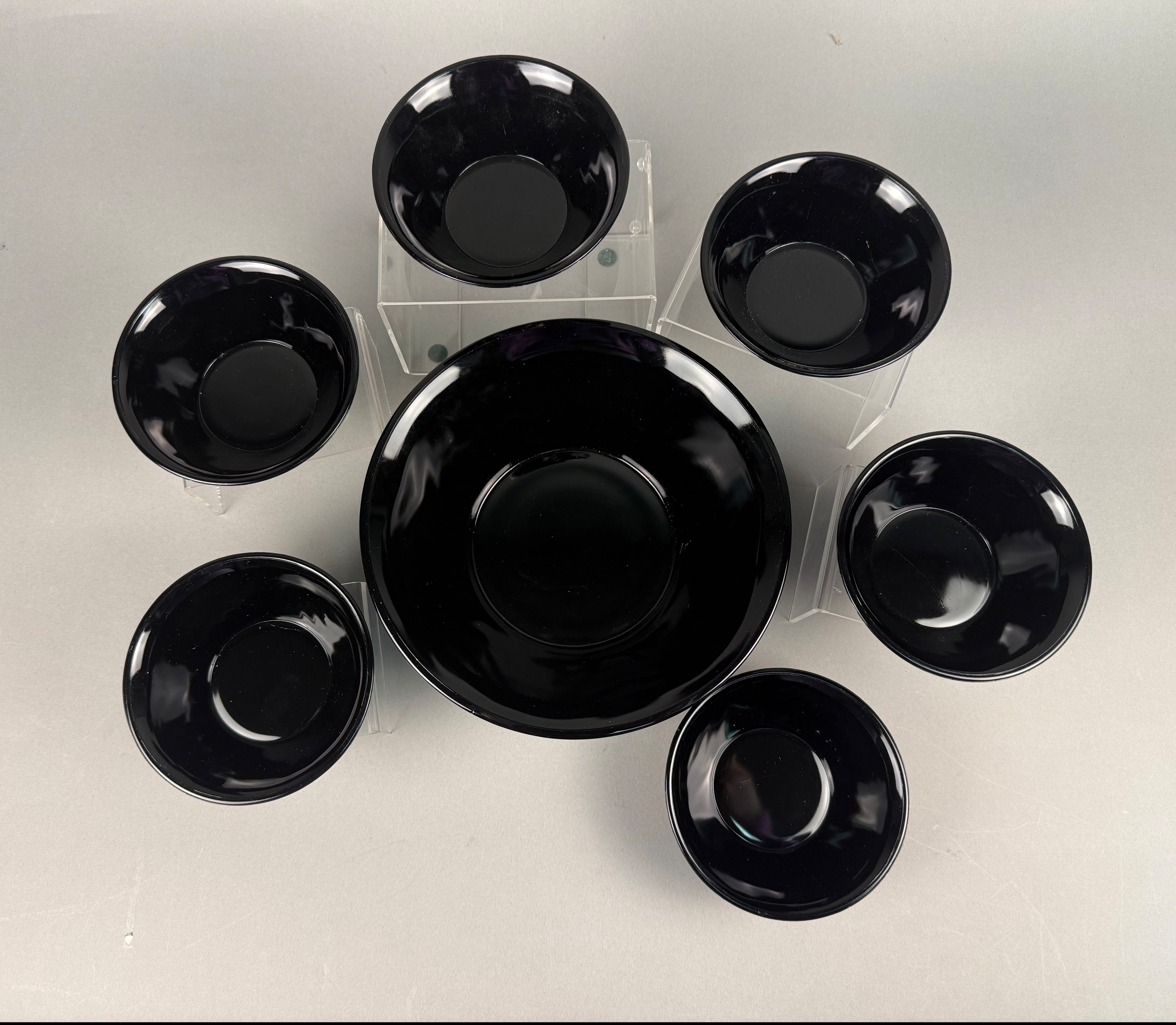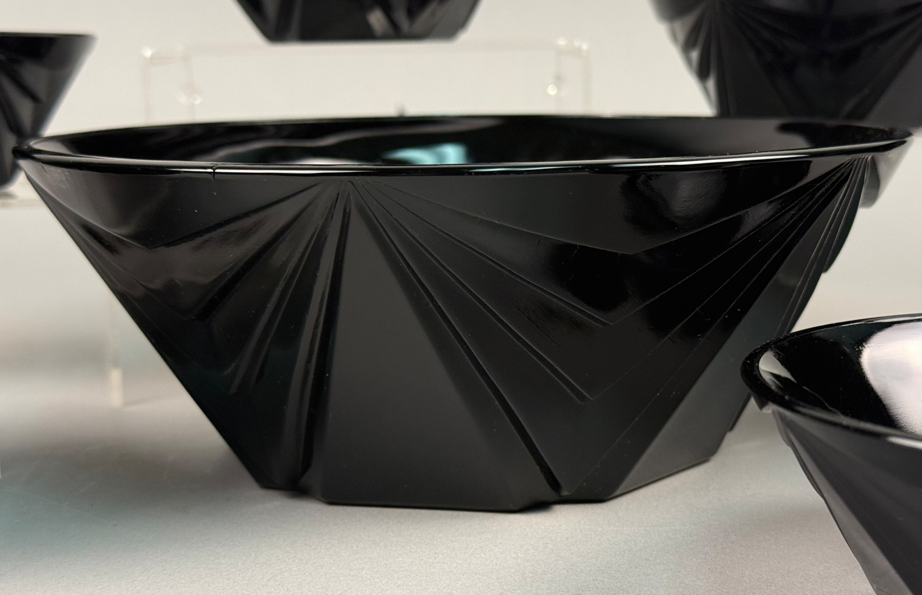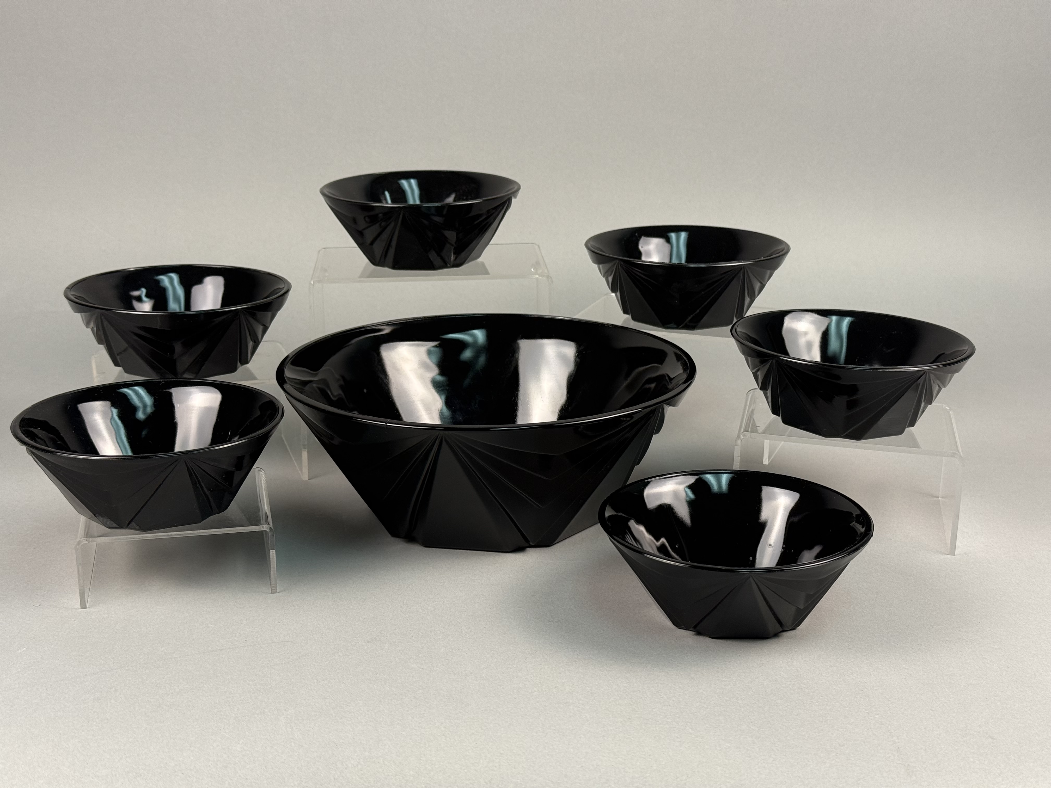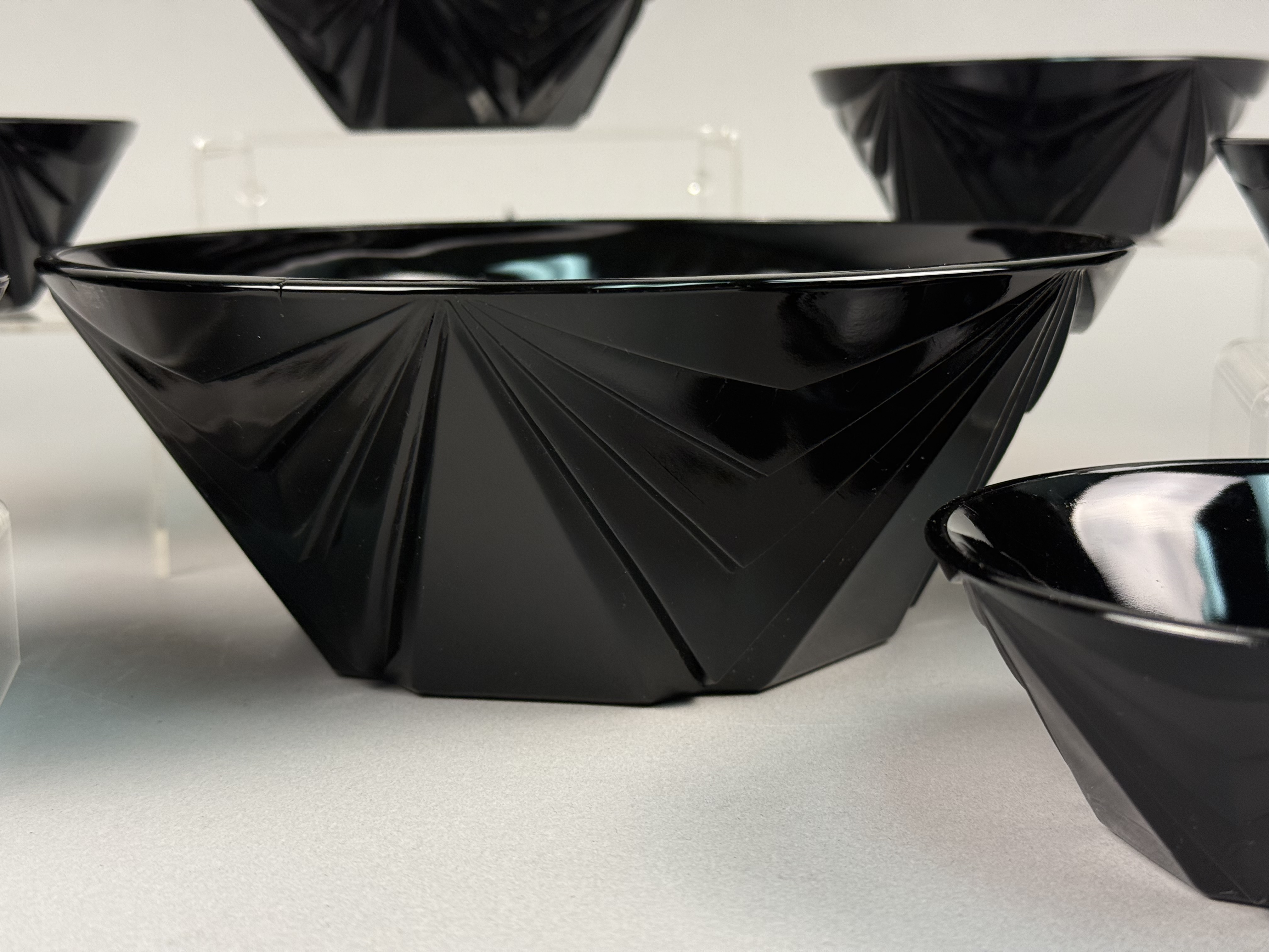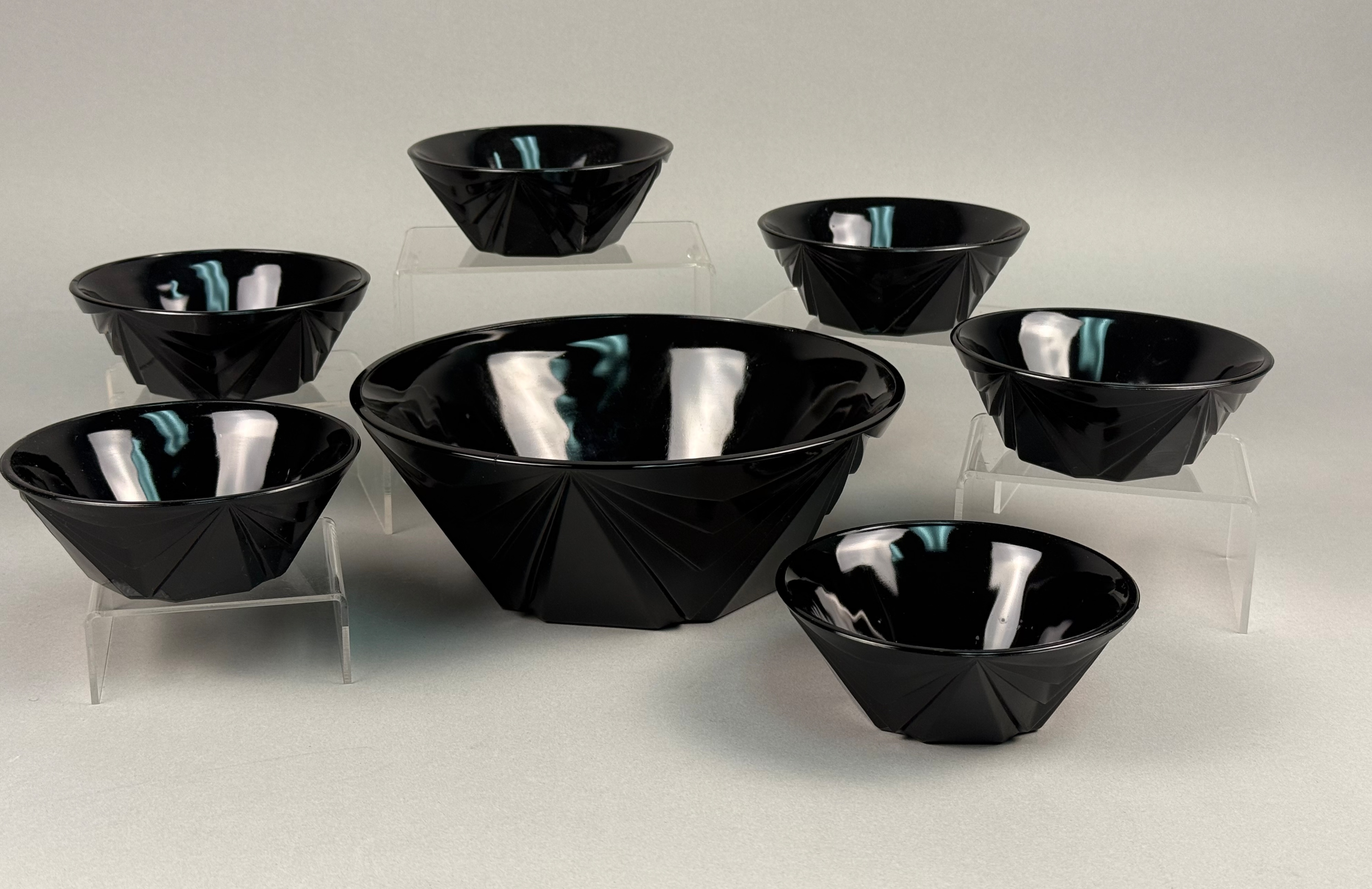 This set of opaque black glass bowls is in the Pyramid pattern, produced by the Indiana Glass Company. The Art Deco design, attributed to George Sakier, features radiating fan-like segments and a faceted, multi-sided base. The glass is opaque with a high-gloss finish. The set consists of one large master bowl and six individual small bowls. No alphanumeric characters, symbols, or logos are present on the bases of any items in the collection. Large Bowl: 8 1/4 inches in diameter; 3 inches in height Small Bowls: 4 1/2 inches in diameter; 1 3/4 inches in height. The set is in good overall condition. A minor flea bite is noted on the rim of the large master bowl. Typical light surface wear is present, consistent with age and use. No other significant chips, cracks, or repairs are visible.