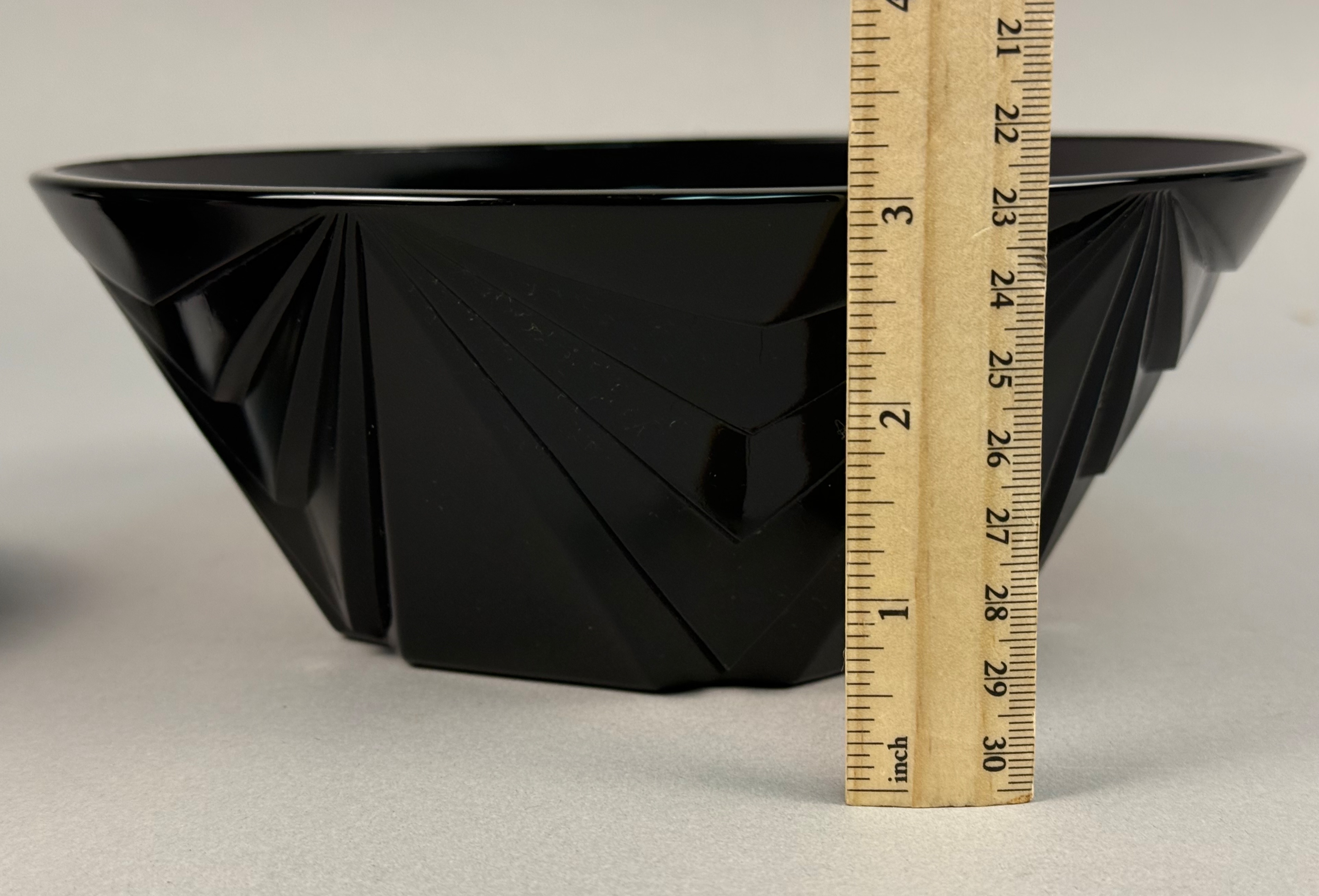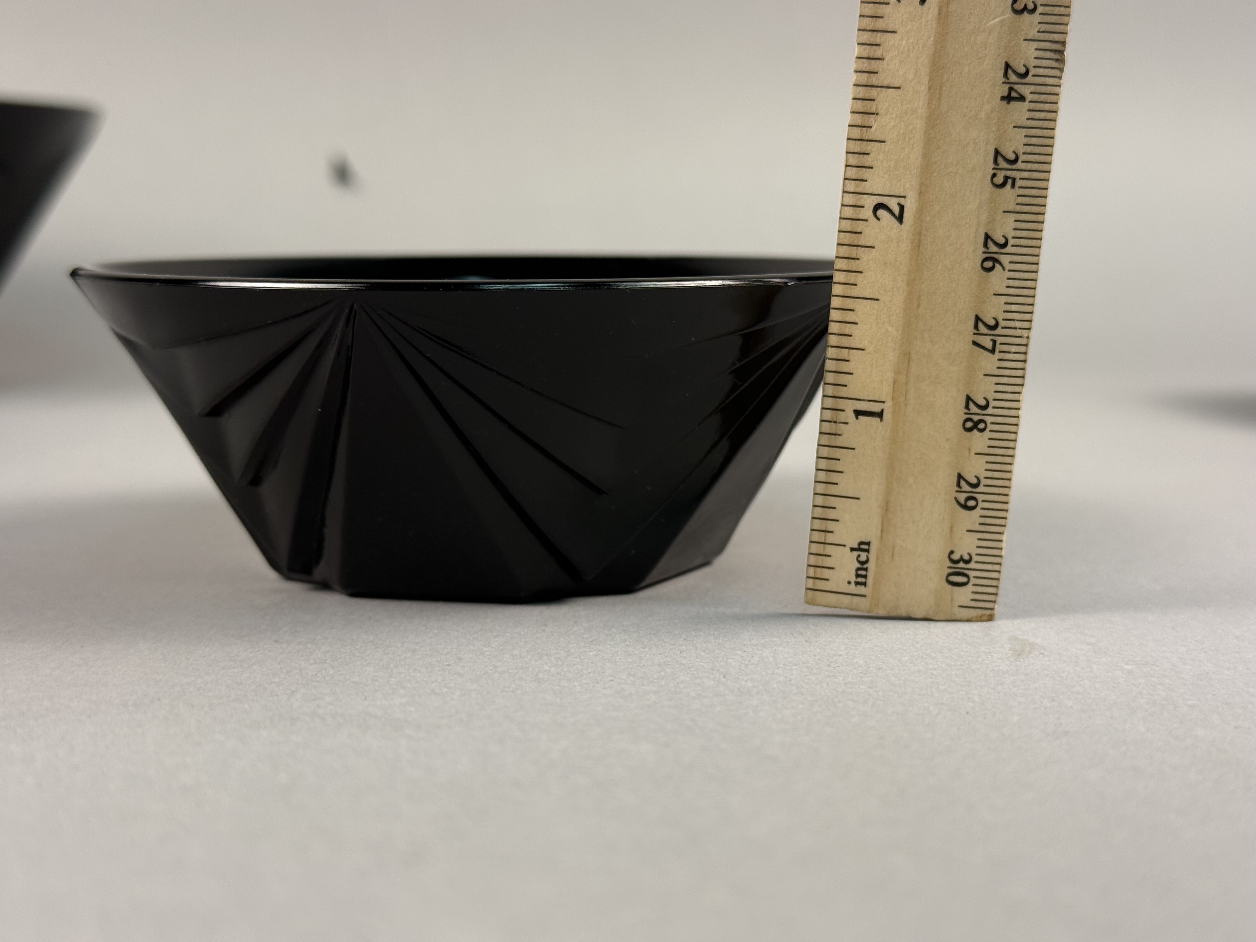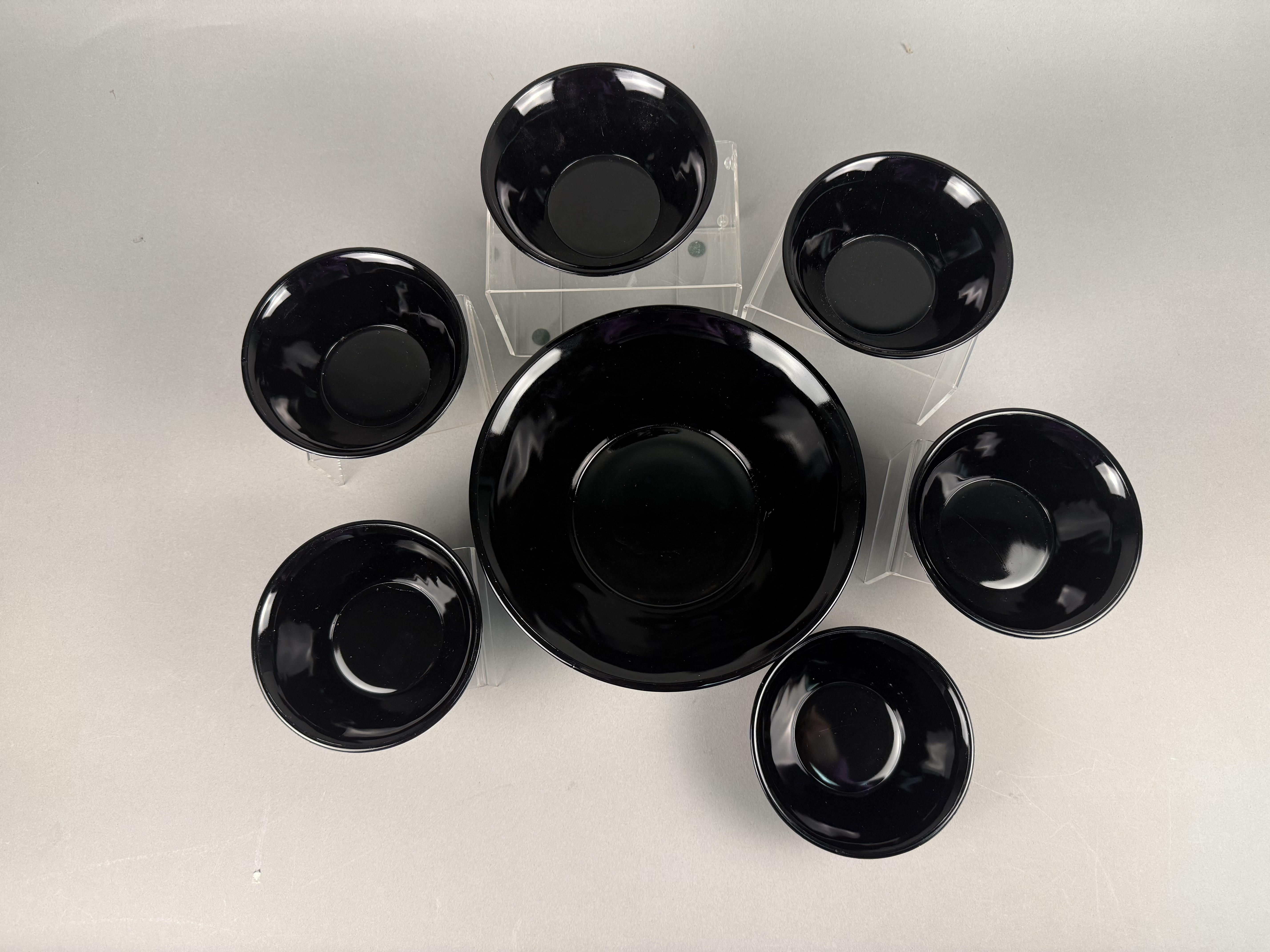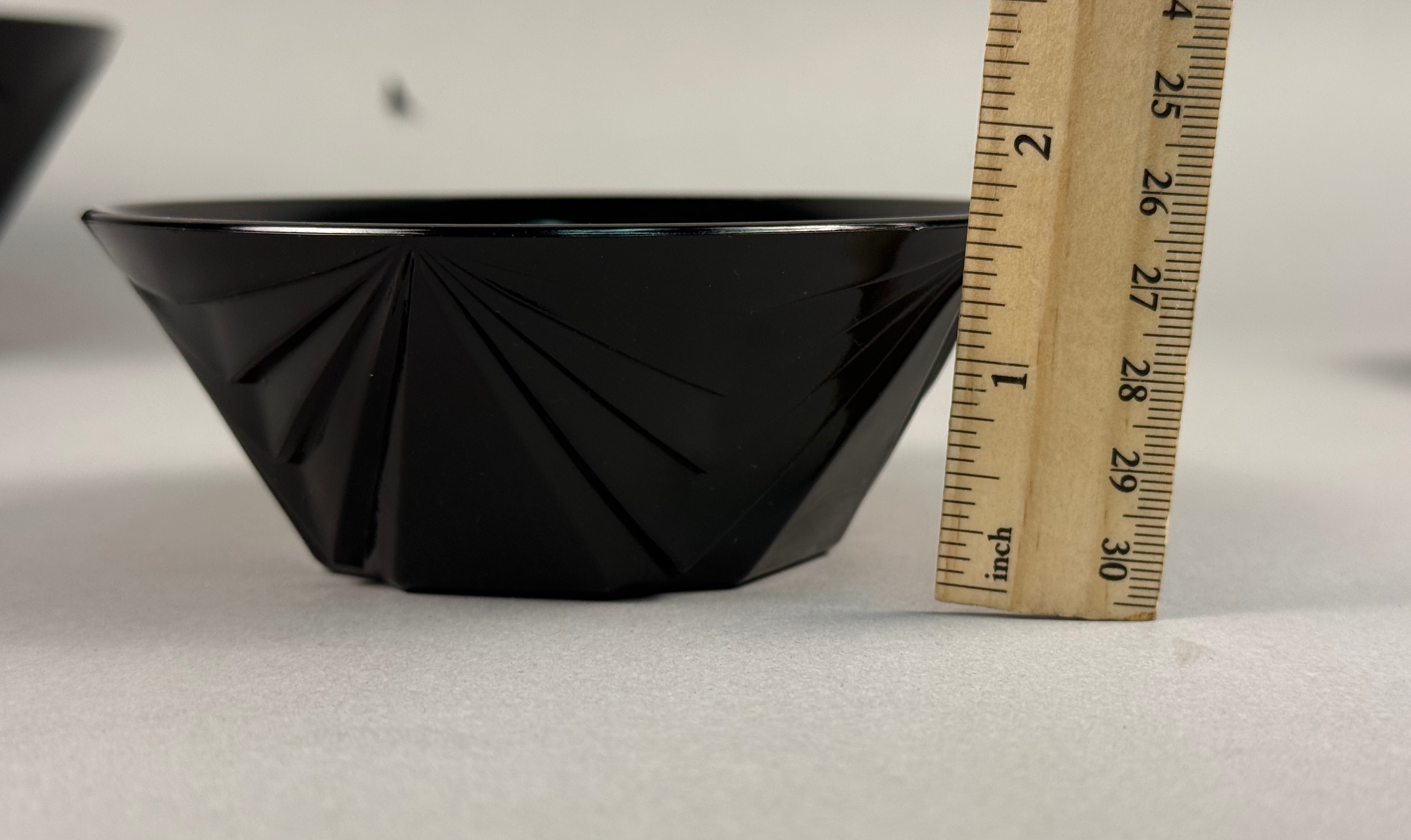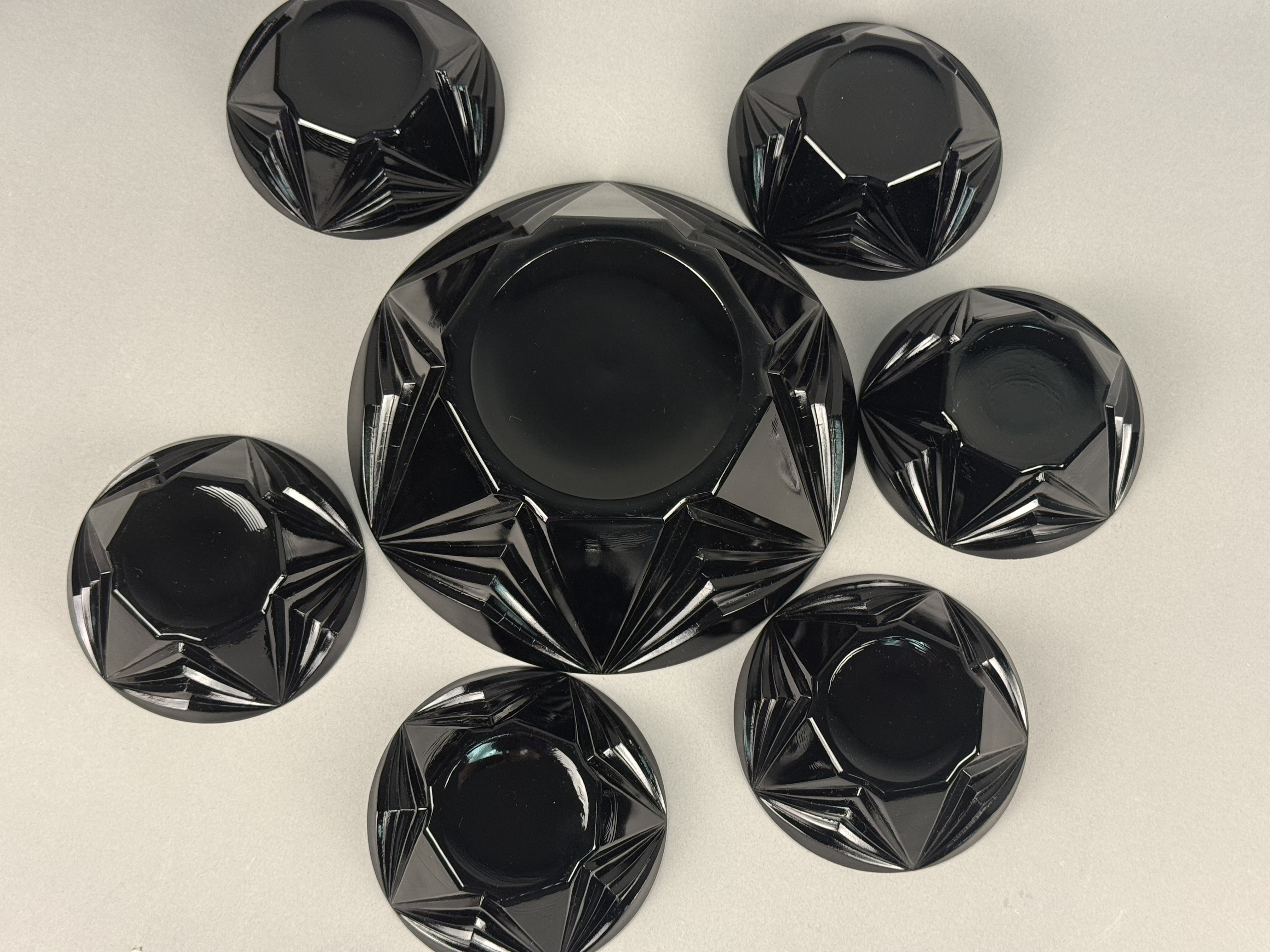 This set of opaque black glass bowls is in the Pyramid pattern, produced by the Indiana Glass Company. The Art Deco design, attributed to George Sakier, features radiating fan-like segments and a faceted, multi-sided base. The glass is opaque with a high-gloss finish. The set consists of one large master bowl and six individual small bowls. No alphanumeric characters, symbols, or logos are present on the bases of any items in the collection. Large Bowl: 8 1/4 inches in diameter; 3 inches in height Small Bowls: 4 1/2 inches in diameter; 1 3/4 inches in height. The set is in good overall condition. A minor flea bite is noted on the rim of the large master bowl. Typical light surface wear is present, consistent with age and use. No other significant chips, cracks, or repairs are visible.
