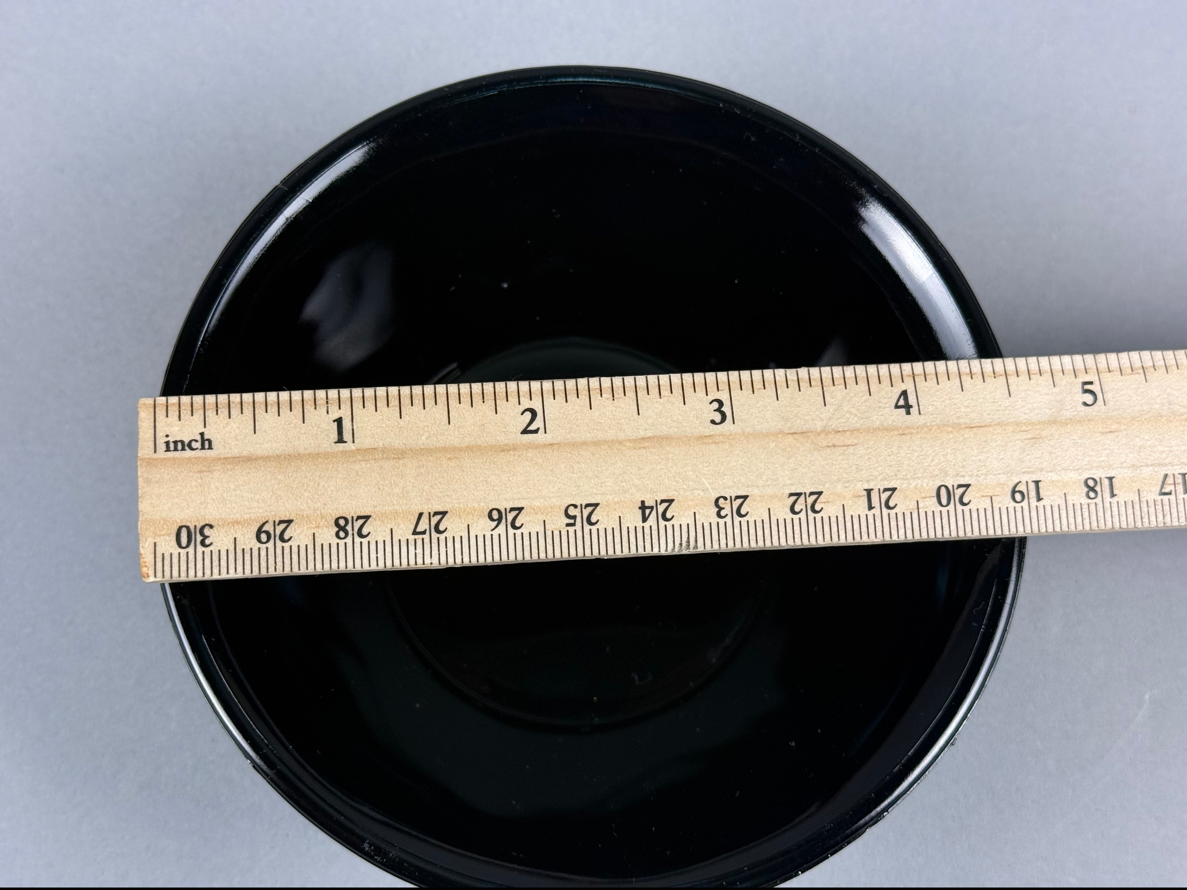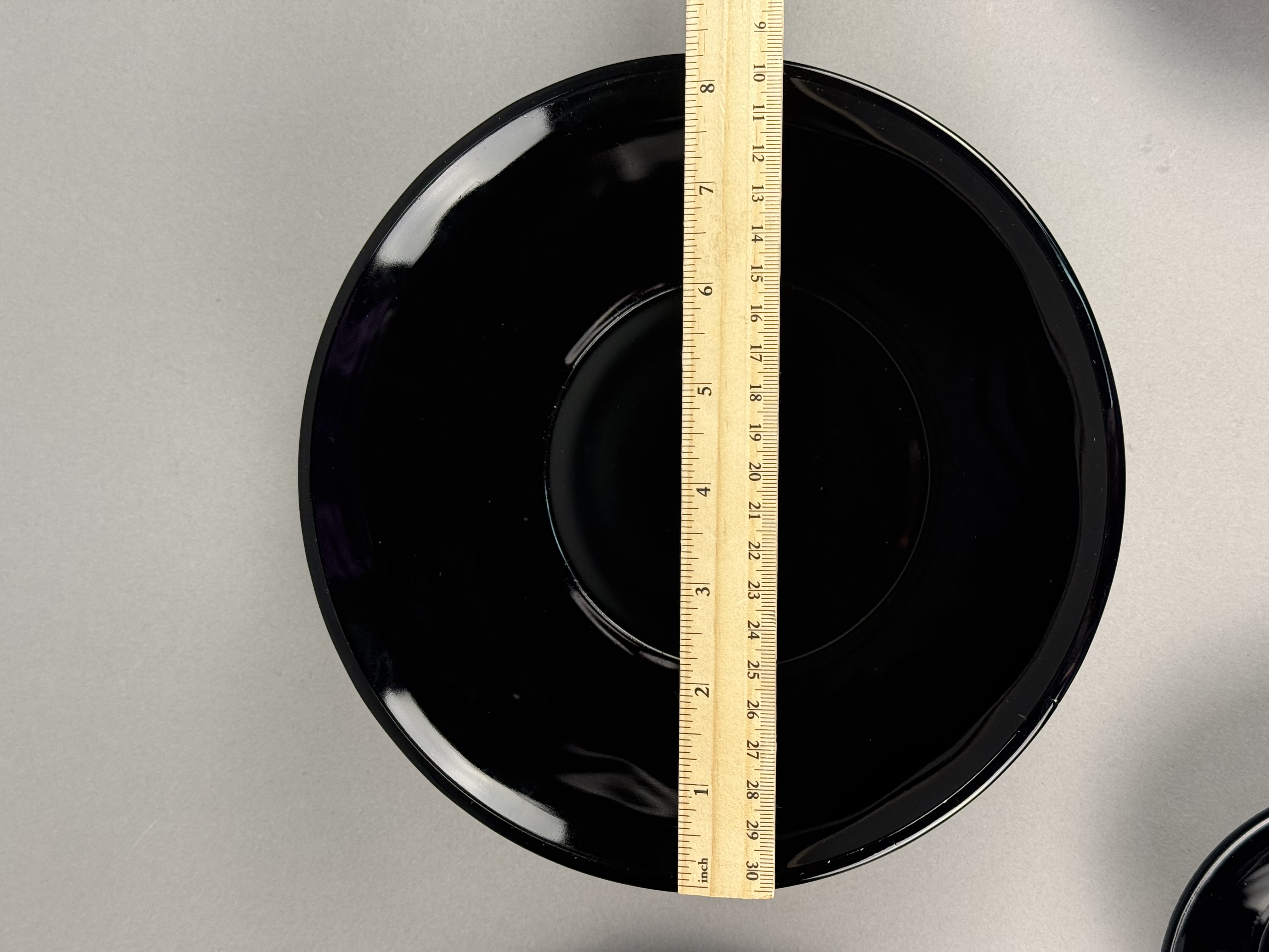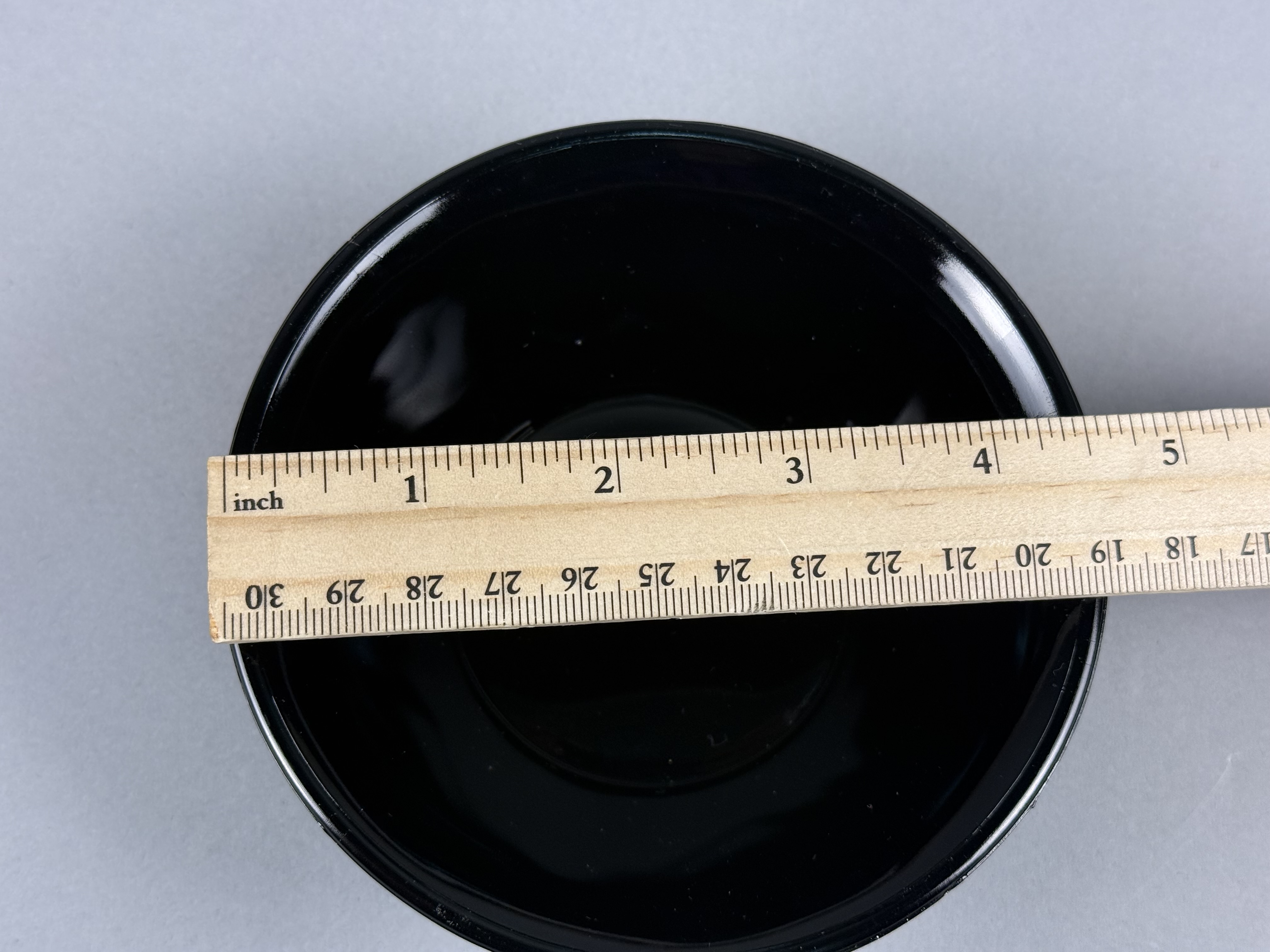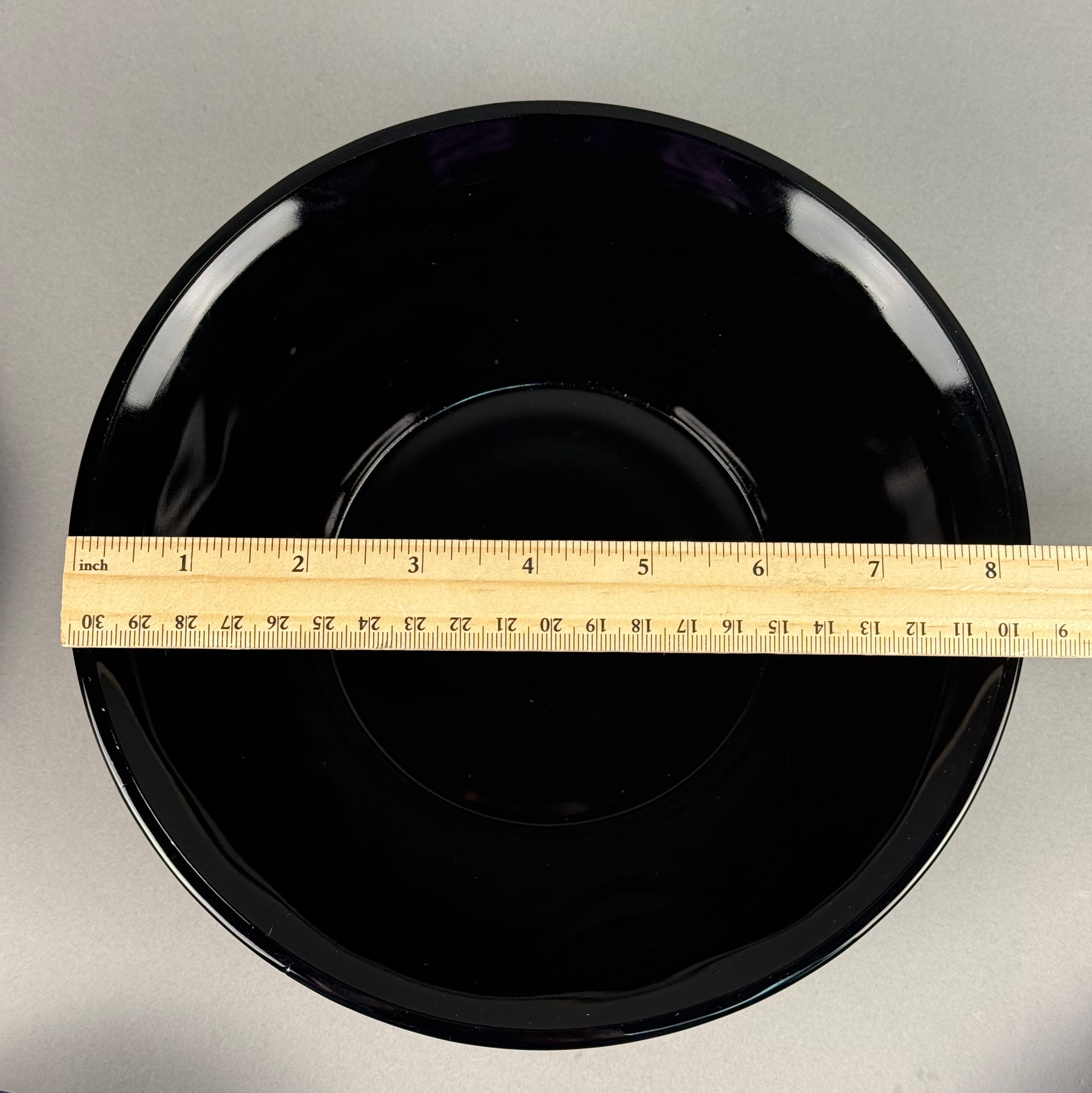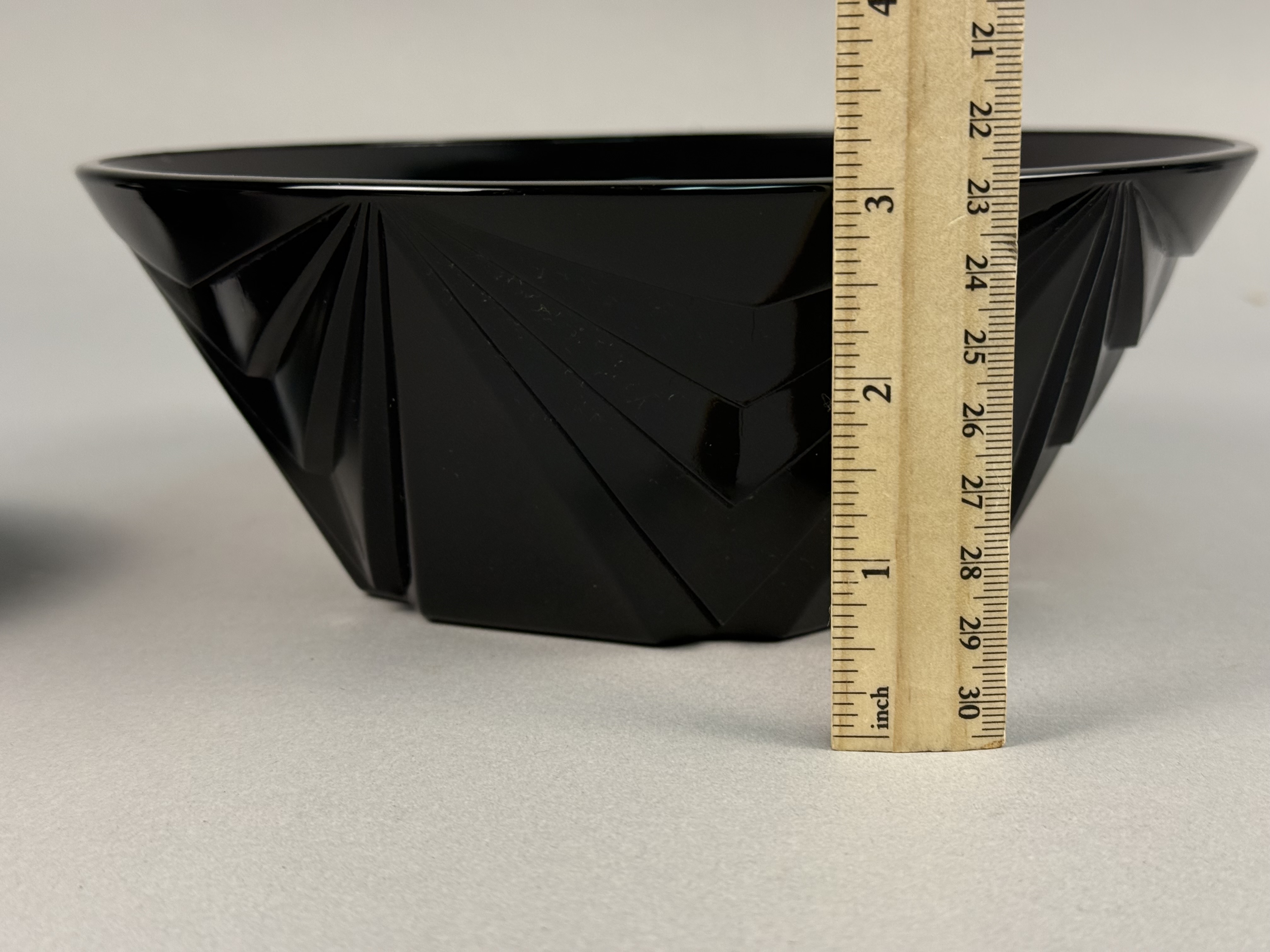 This set of opaque black glass bowls is in the Pyramid pattern, produced by the Indiana Glass Company. The Art Deco design, attributed to George Sakier, features radiating fan-like segments and a faceted, multi-sided base. The glass is opaque with a high-gloss finish. The set consists of one large master bowl and six individual small bowls. No alphanumeric characters, symbols, or logos are present on the bases of any items in the collection. Large Bowl: 8 1/4 inches in diameter; 3 inches in height Small Bowls: 4 1/2 inches in diameter; 1 3/4 inches in height. The set is in good overall condition. A minor flea bite is noted on the rim of the large master bowl. Typical light surface wear is present, consistent with age and use. No other significant chips, cracks, or repairs are visible.