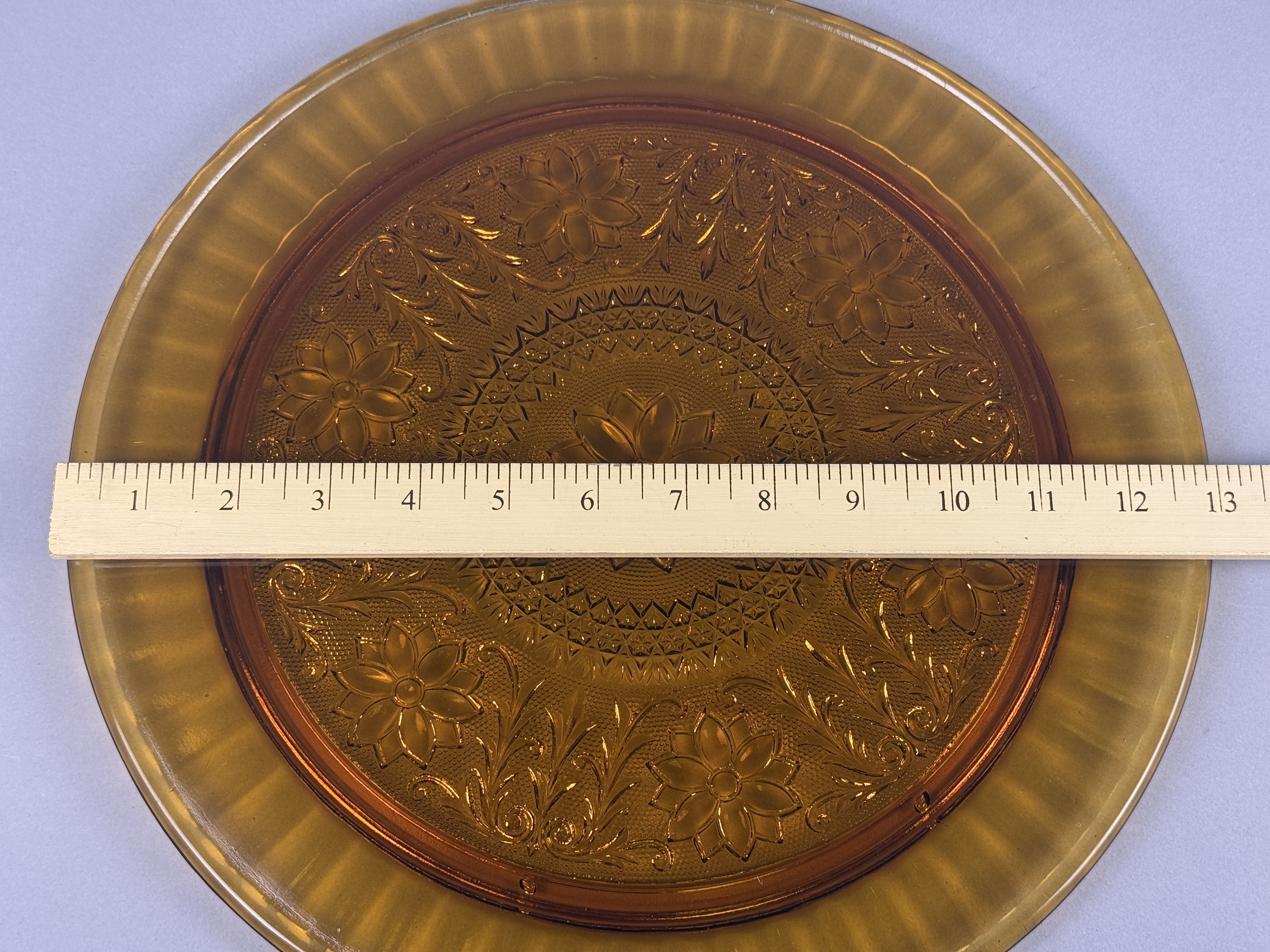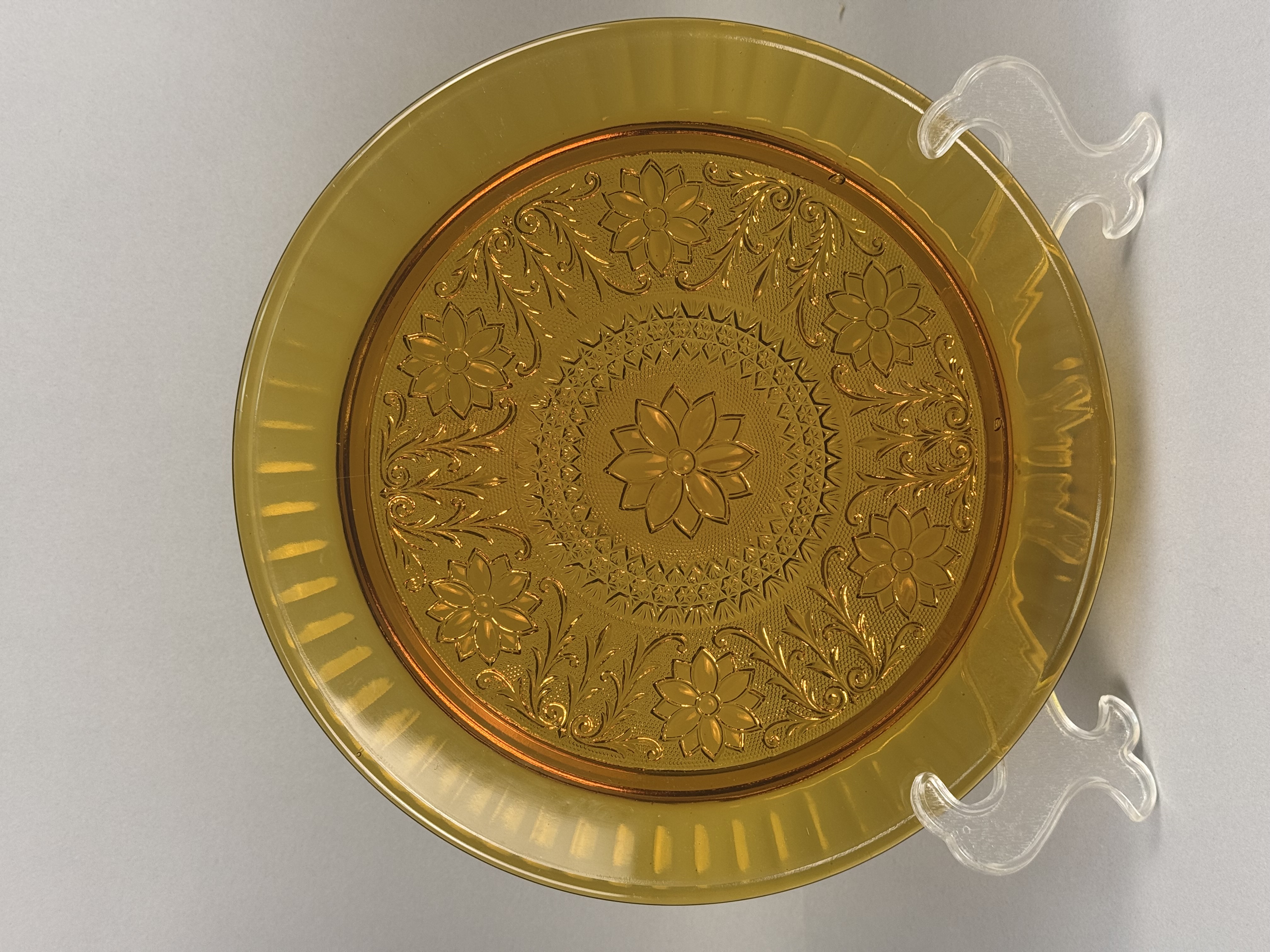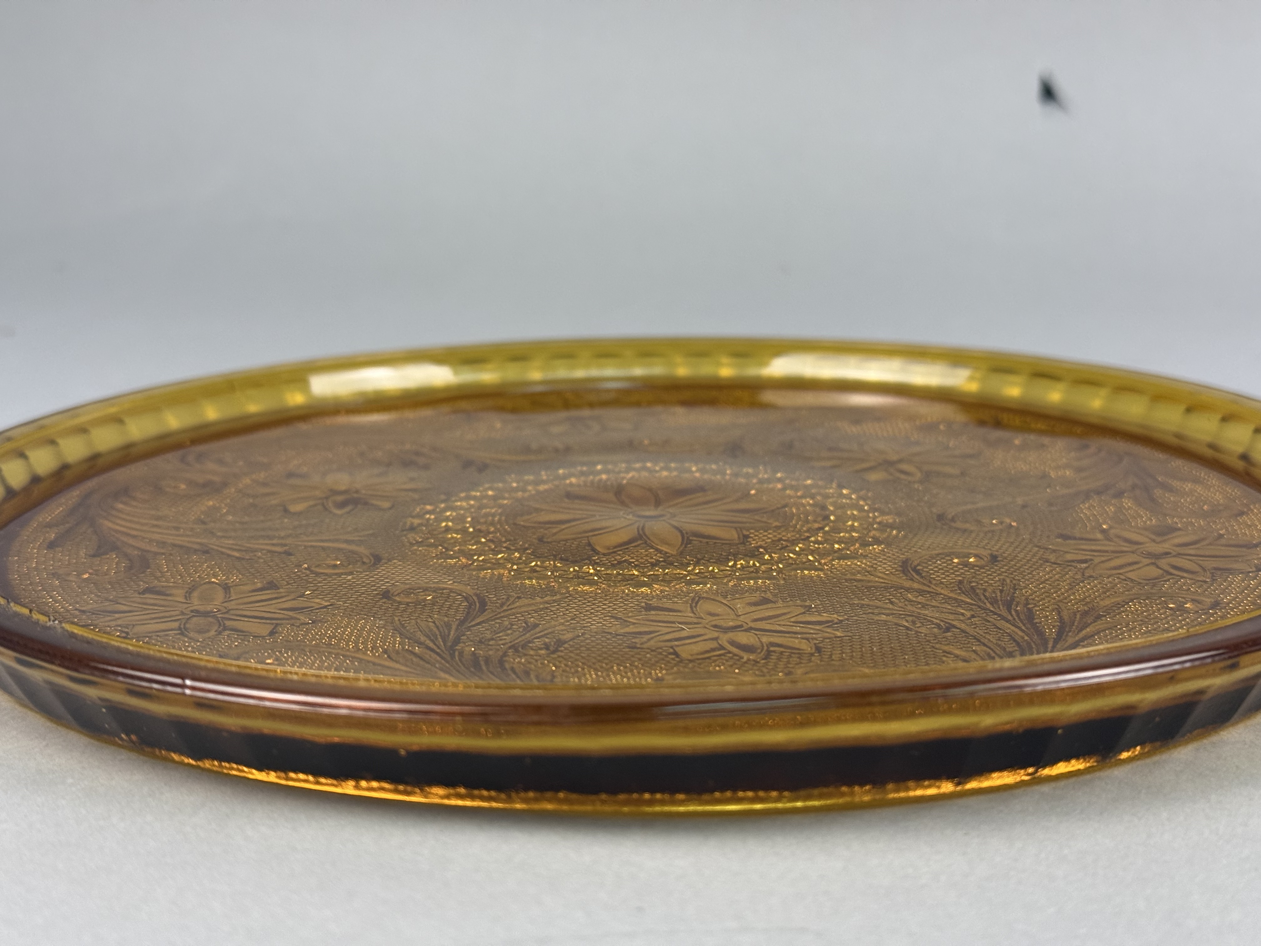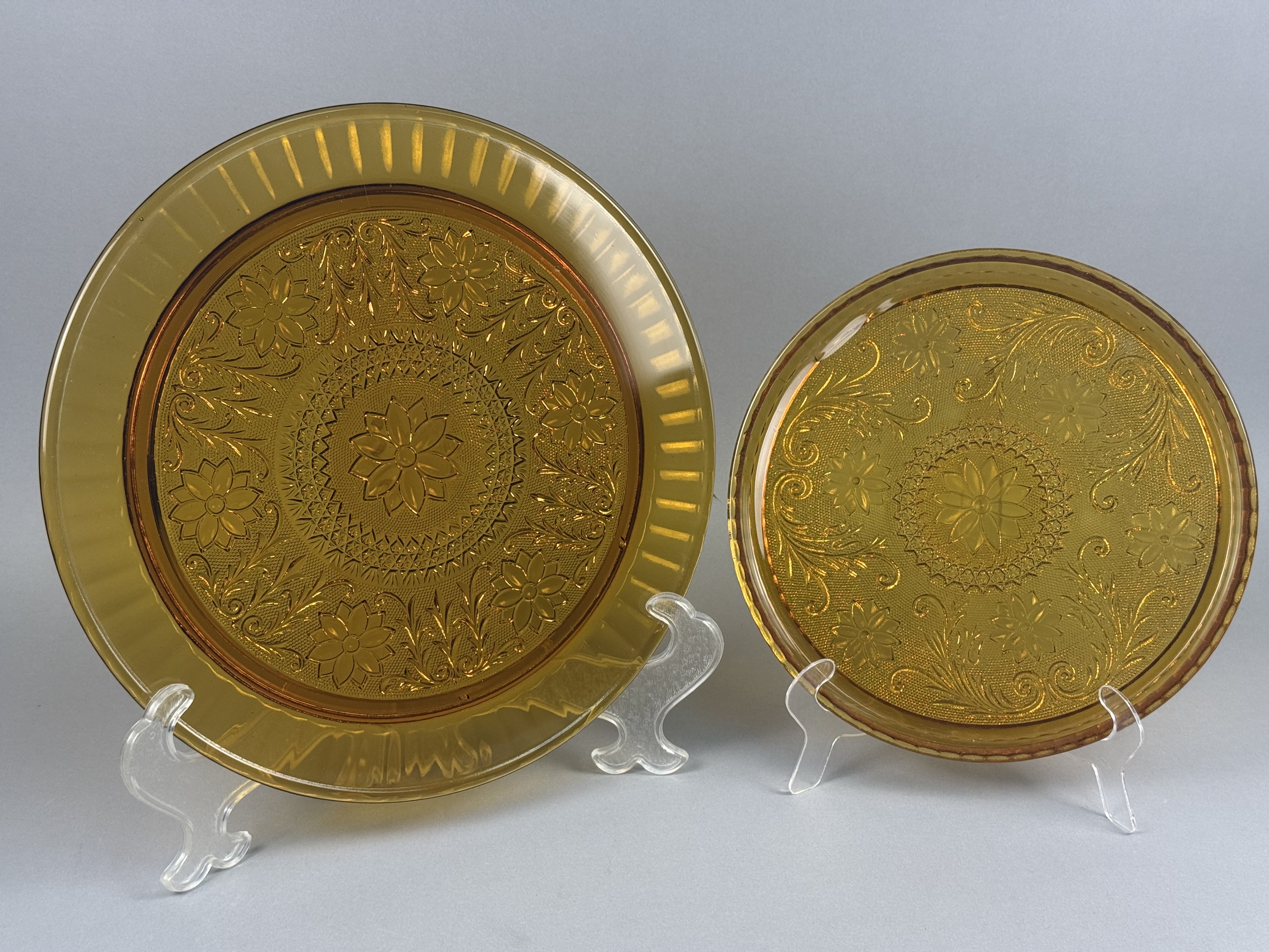 Two pressed glass platters in the Sandwich pattern, manufactured by the Indiana Glass Company and distributed by Tiara Exclusives. Both items are made of translucent amber glass. The decorative program consists of a central multi-petal floral medallion surrounded by a stippled ground, scrollwork, and secondary floral motifs. The larger platter is distinguished by a wide, fluted rim. No maker marks or labels are present on either piece. Large Platter: 13 inches in diameter Small Platter: 10 inches in diameter. Both items are in good overall condition. No chips, cracks, or repairs are visible. Minor surface wear and manufacturing bubbles consistent with pressed glass of this period may be present.