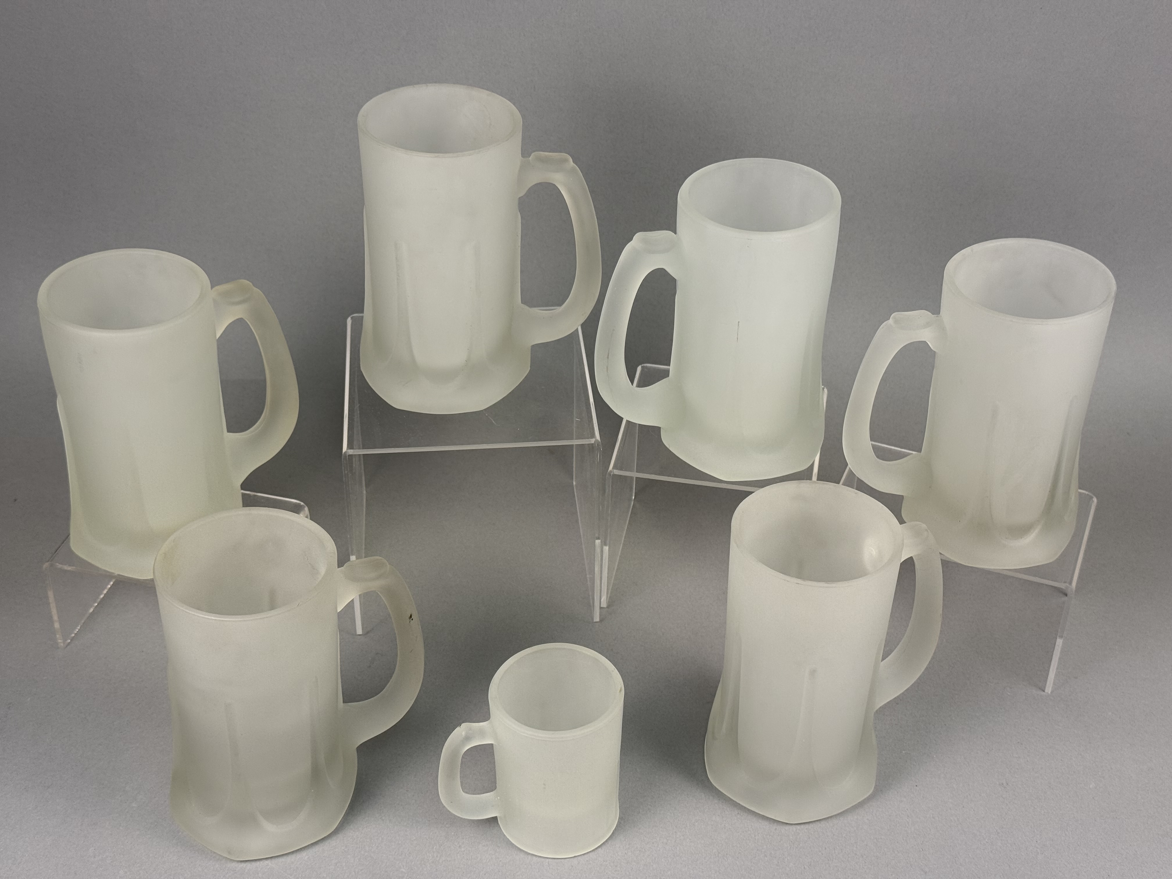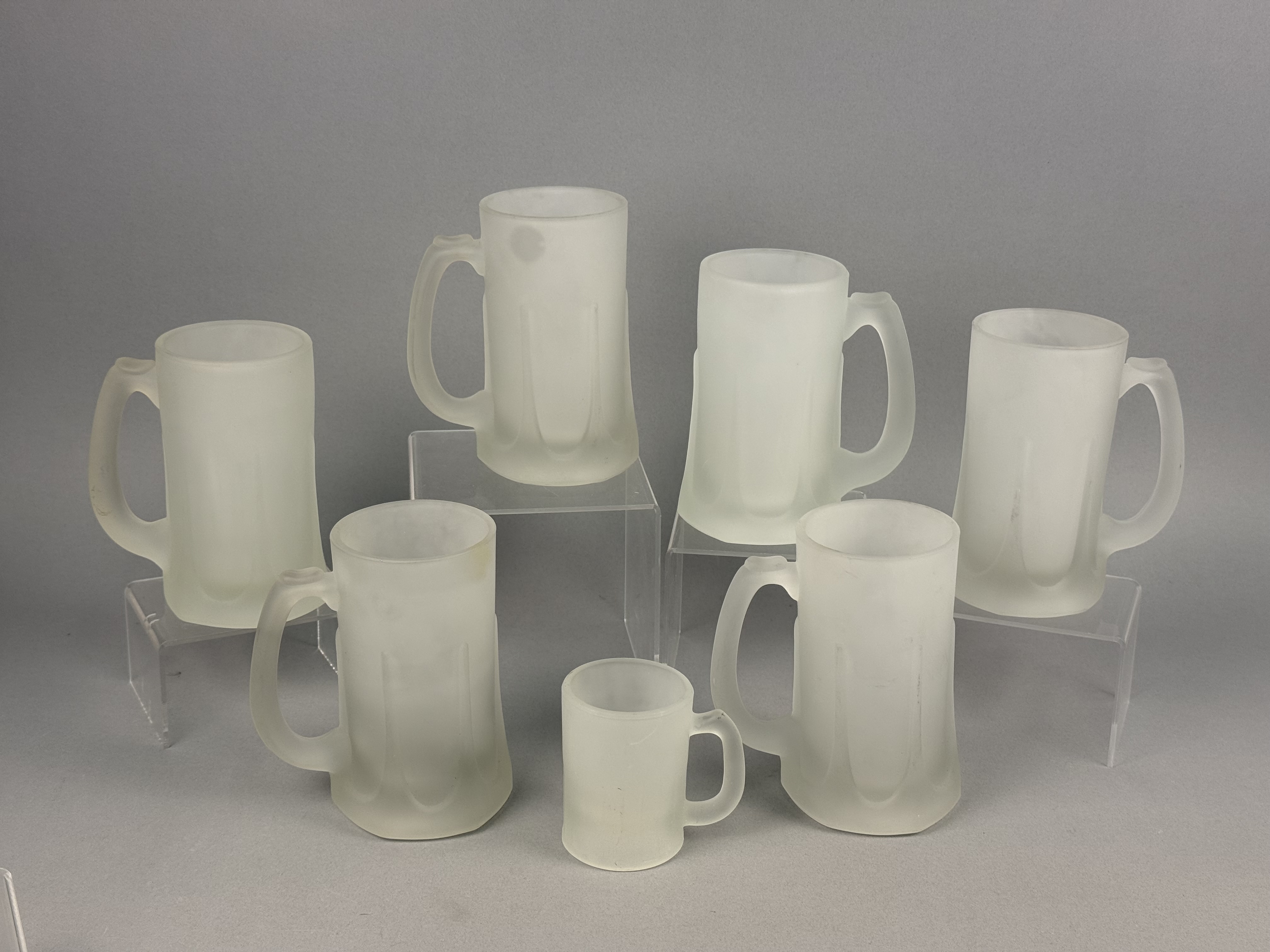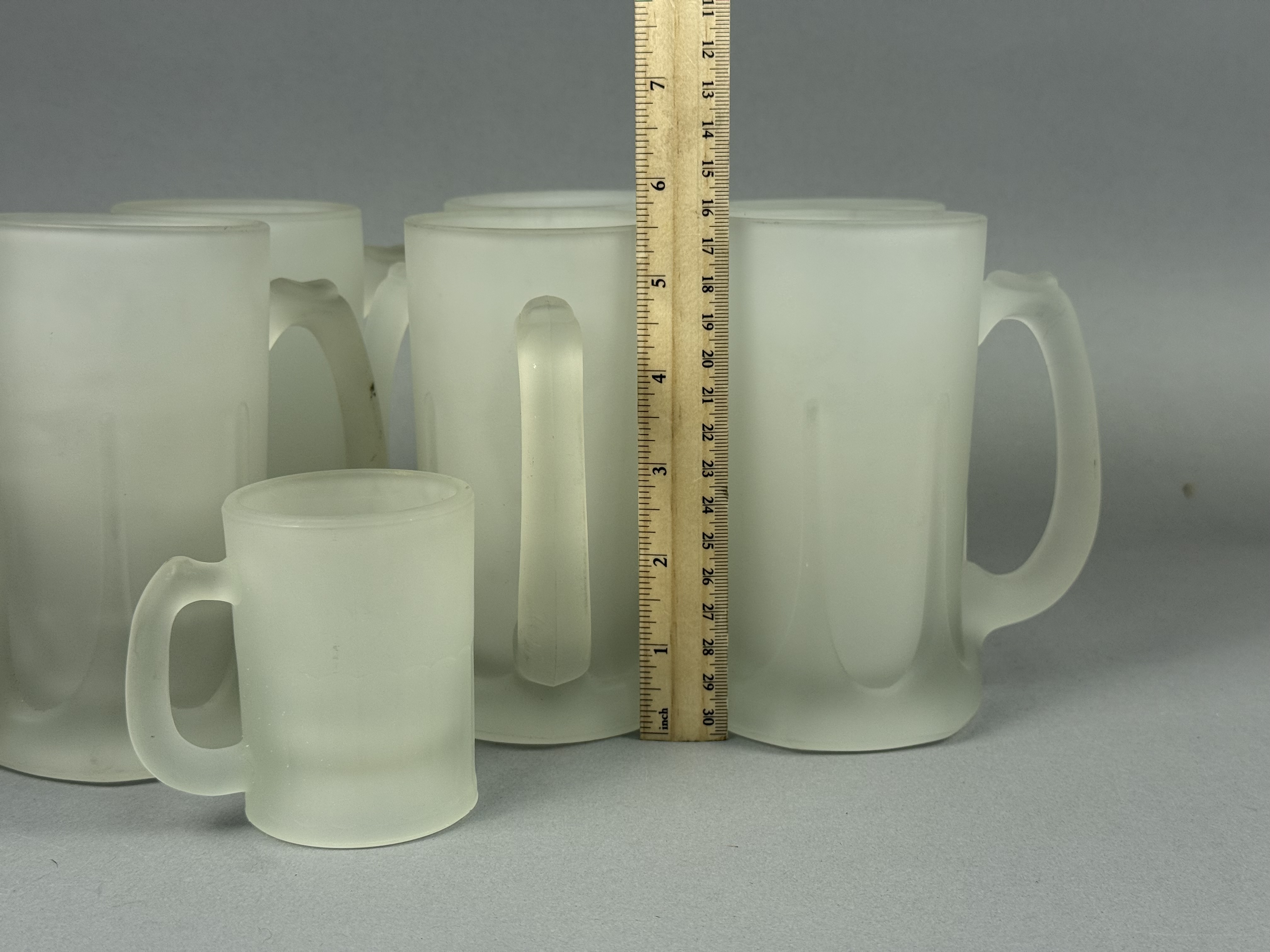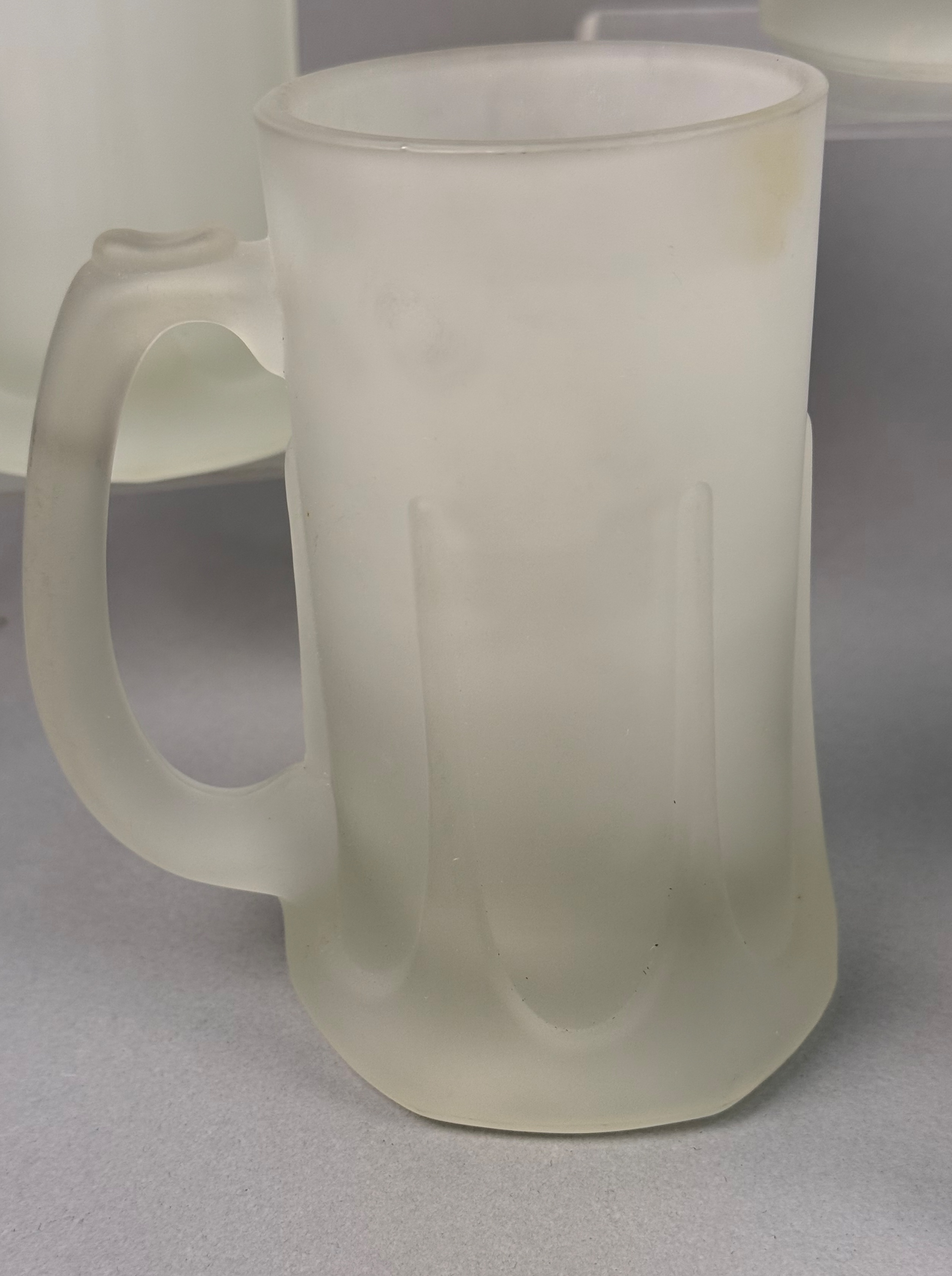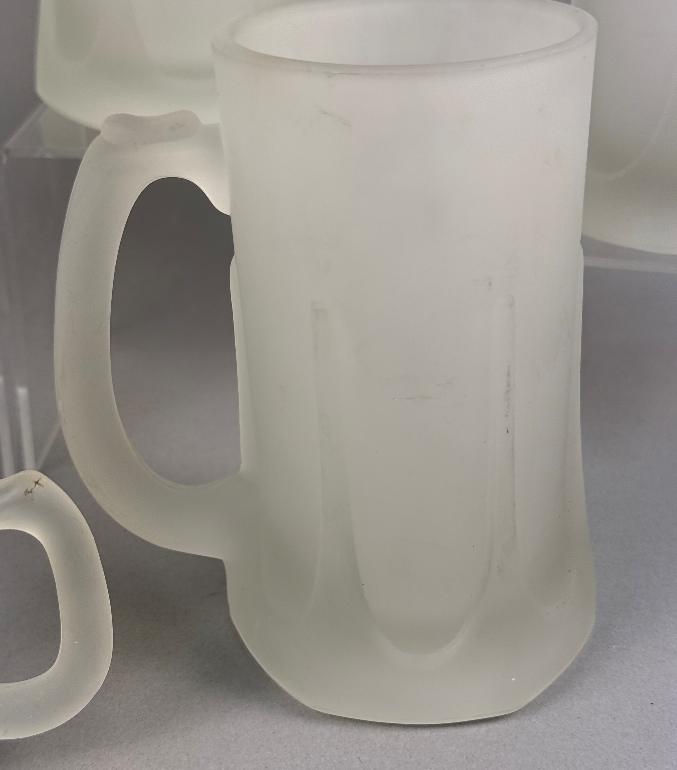 A collection of frosted clear glass mugs including larger beer mugs and a smaller child’s mug, with heights ranging from approximately 3 to 5.5 inches. Free from chips or cracks. some staining and discoloration present.