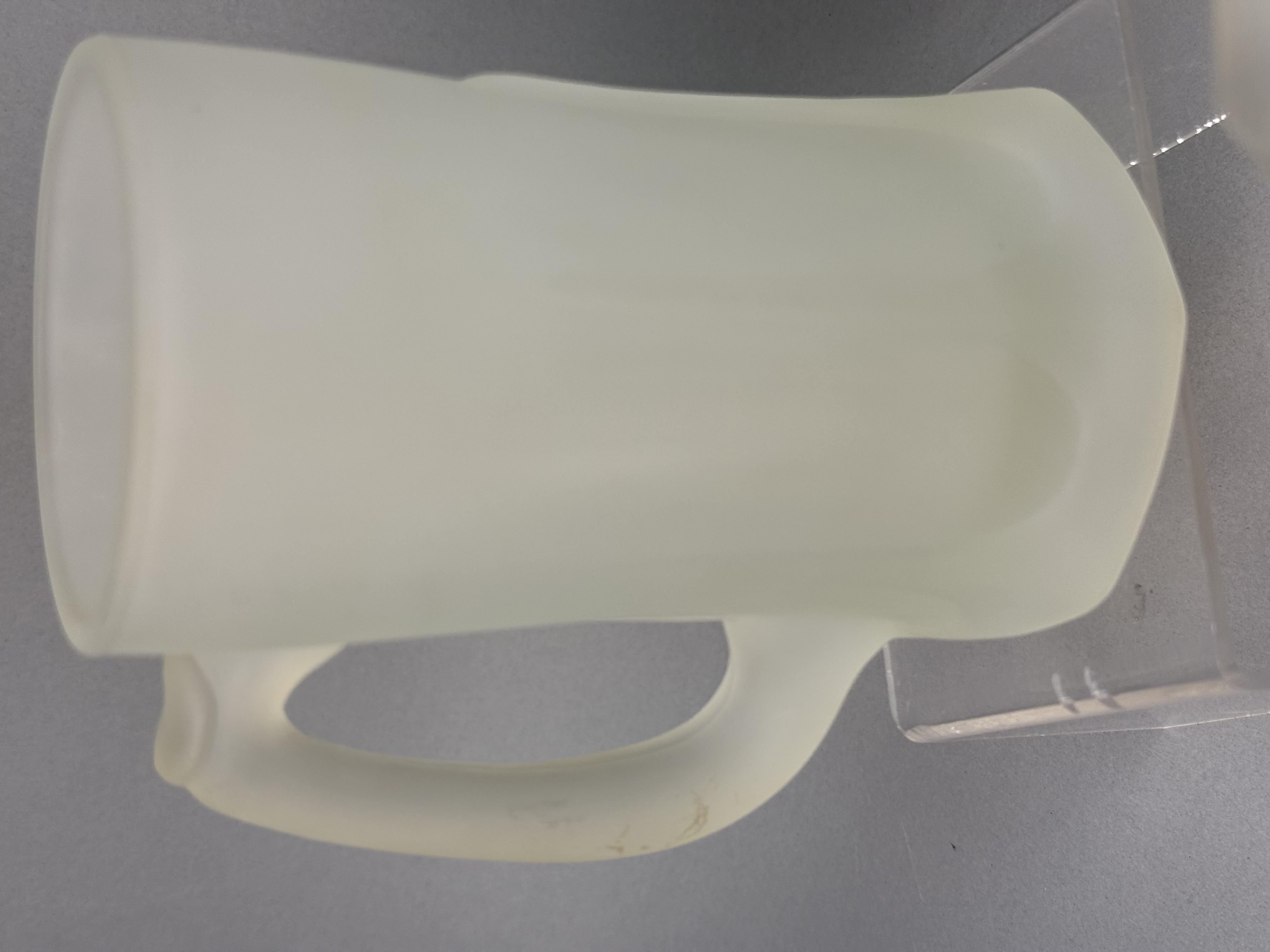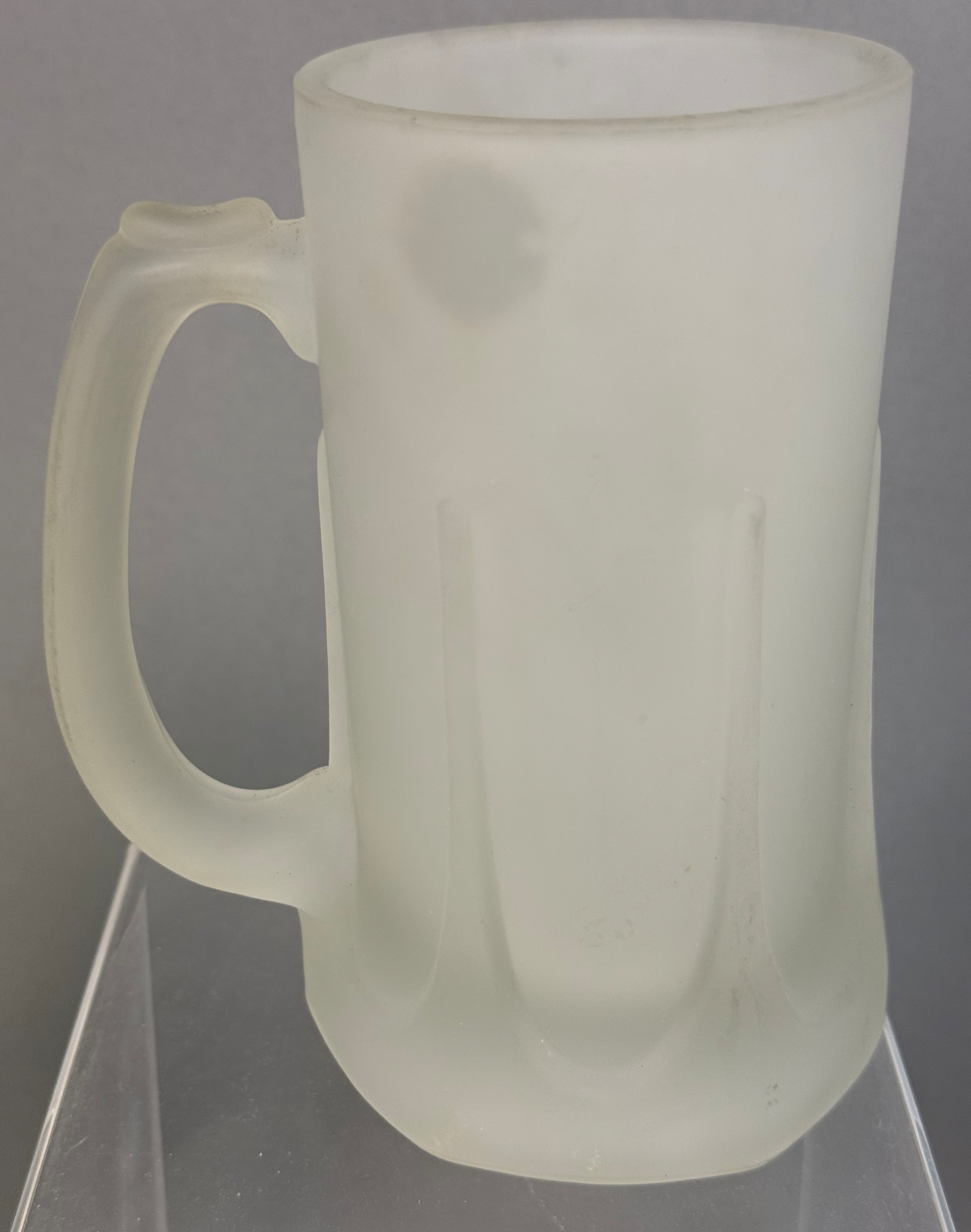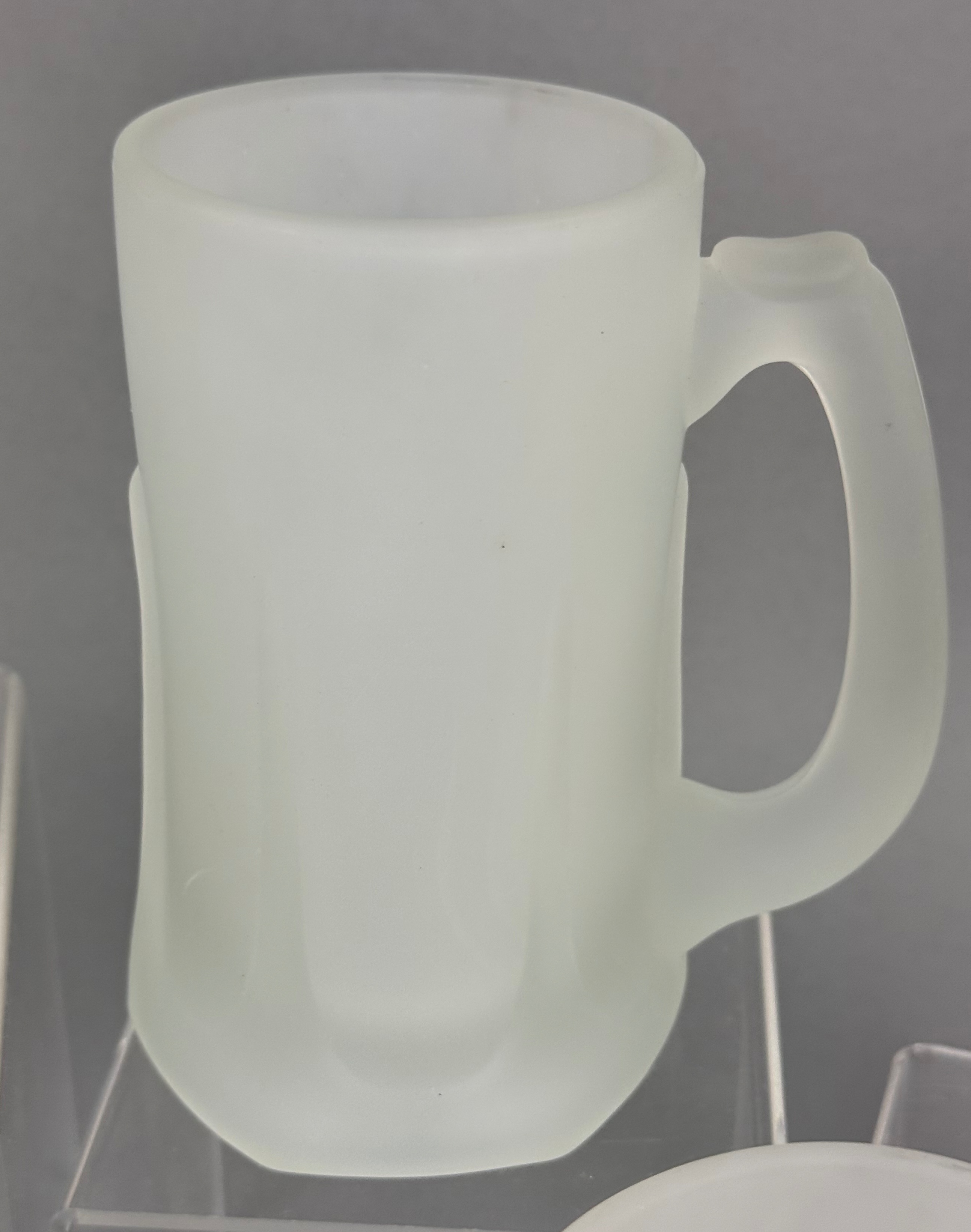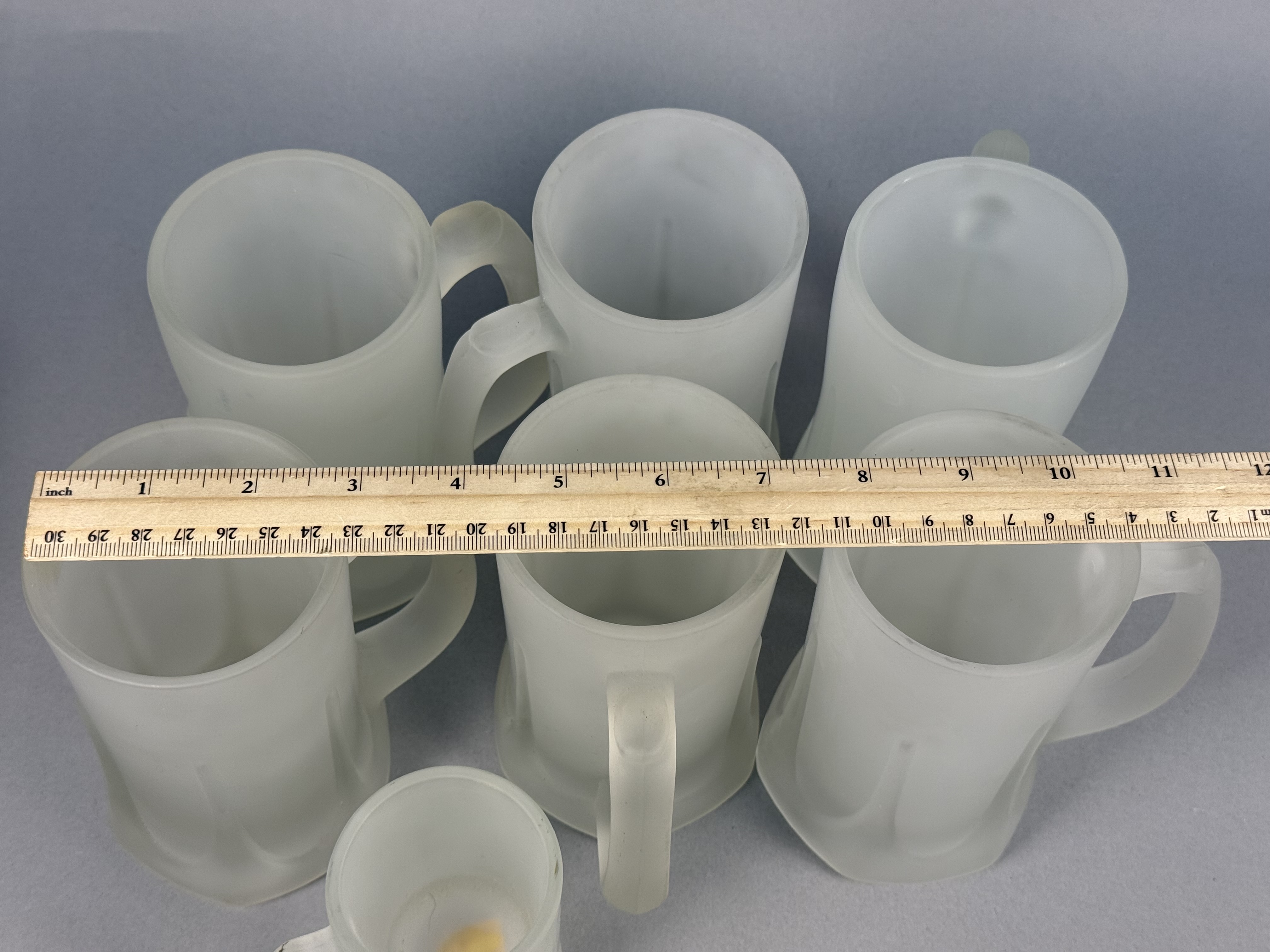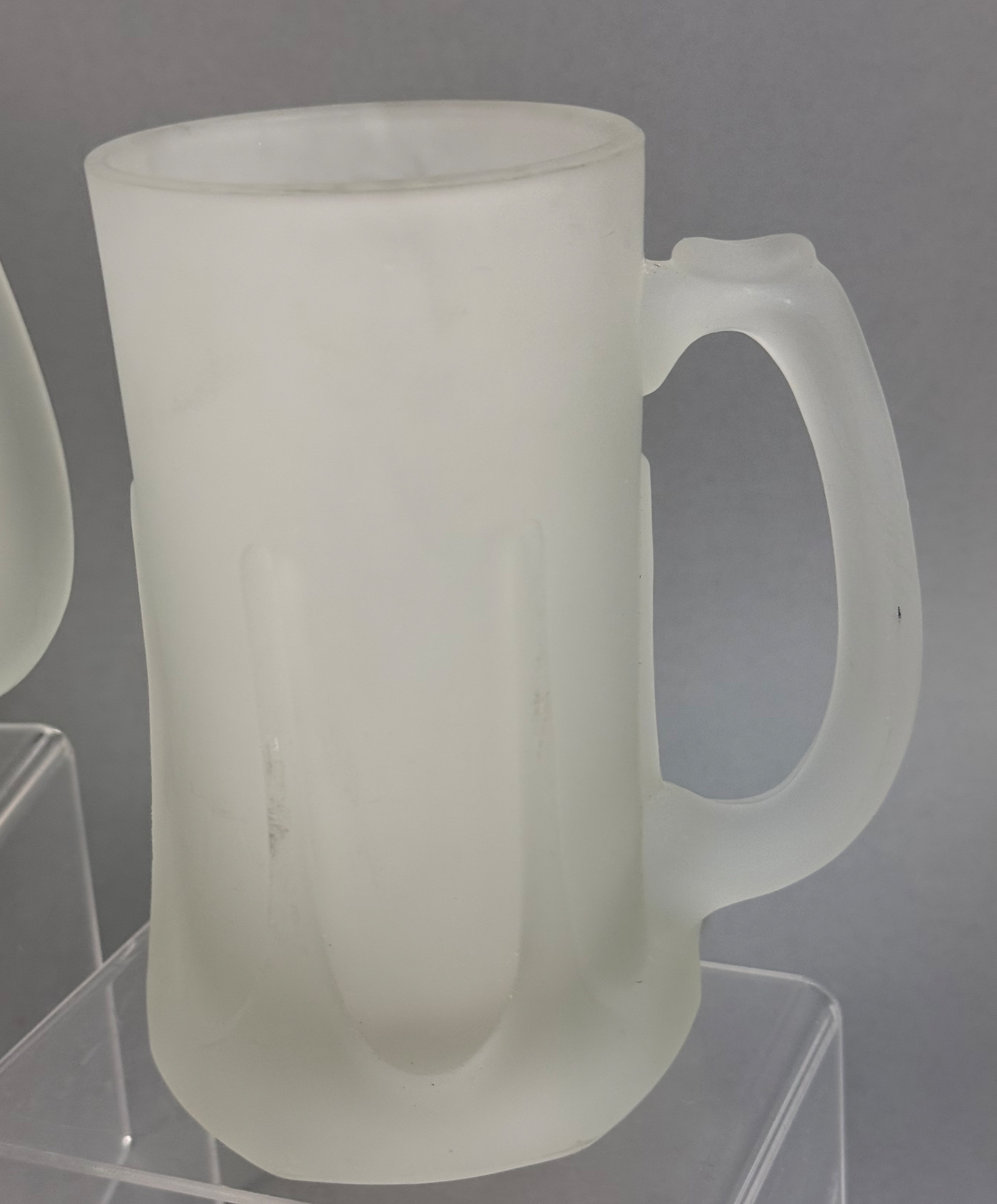 A collection of frosted clear glass mugs including larger beer mugs and a smaller child’s mug, with heights ranging from approximately 3 to 5.5 inches. Free from chips or cracks. some staining and discoloration present.