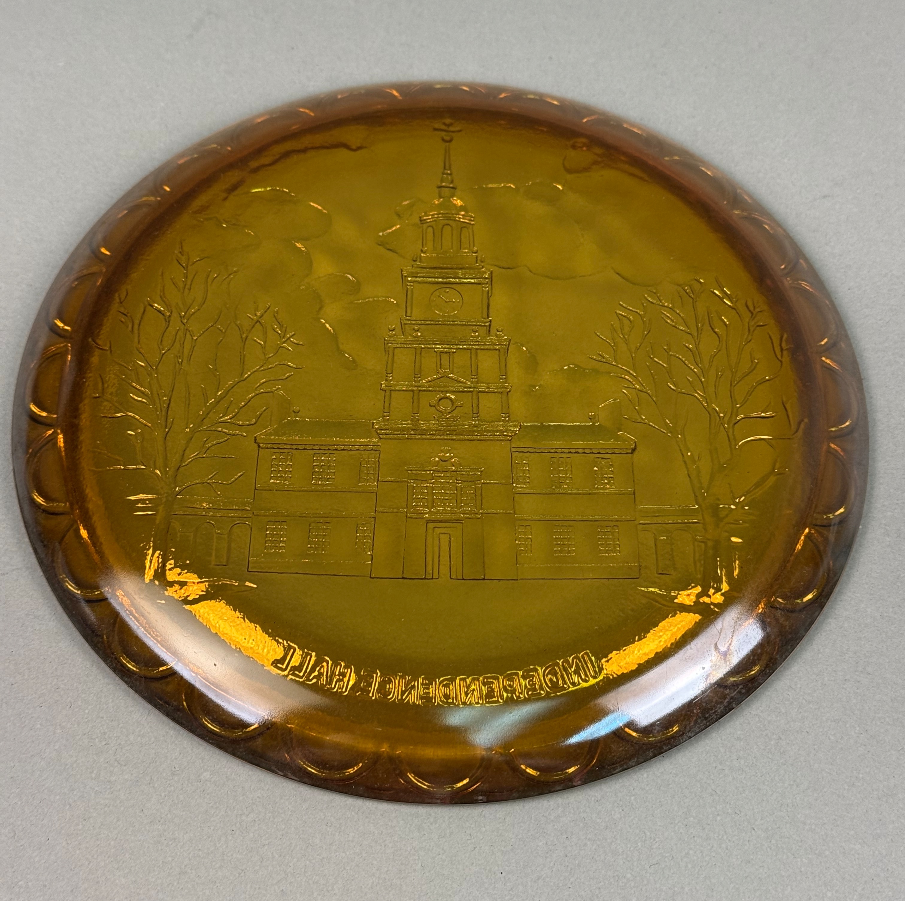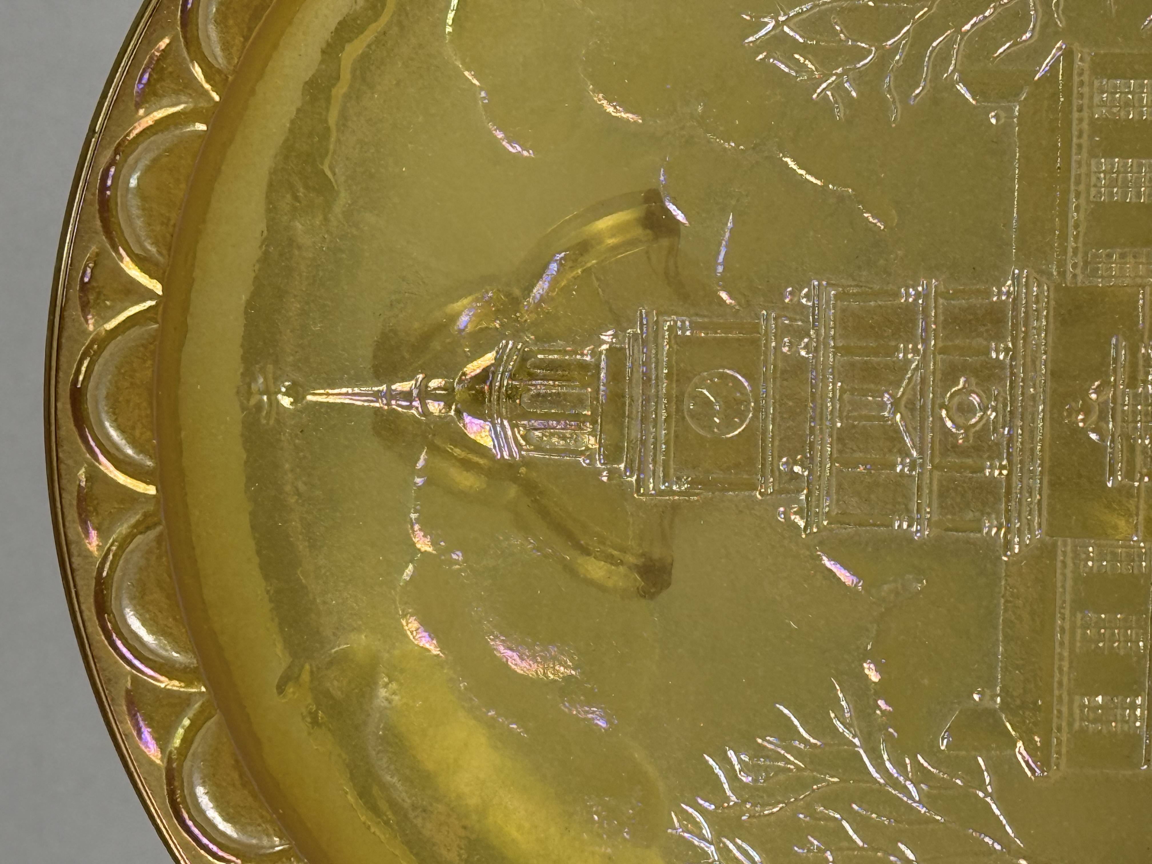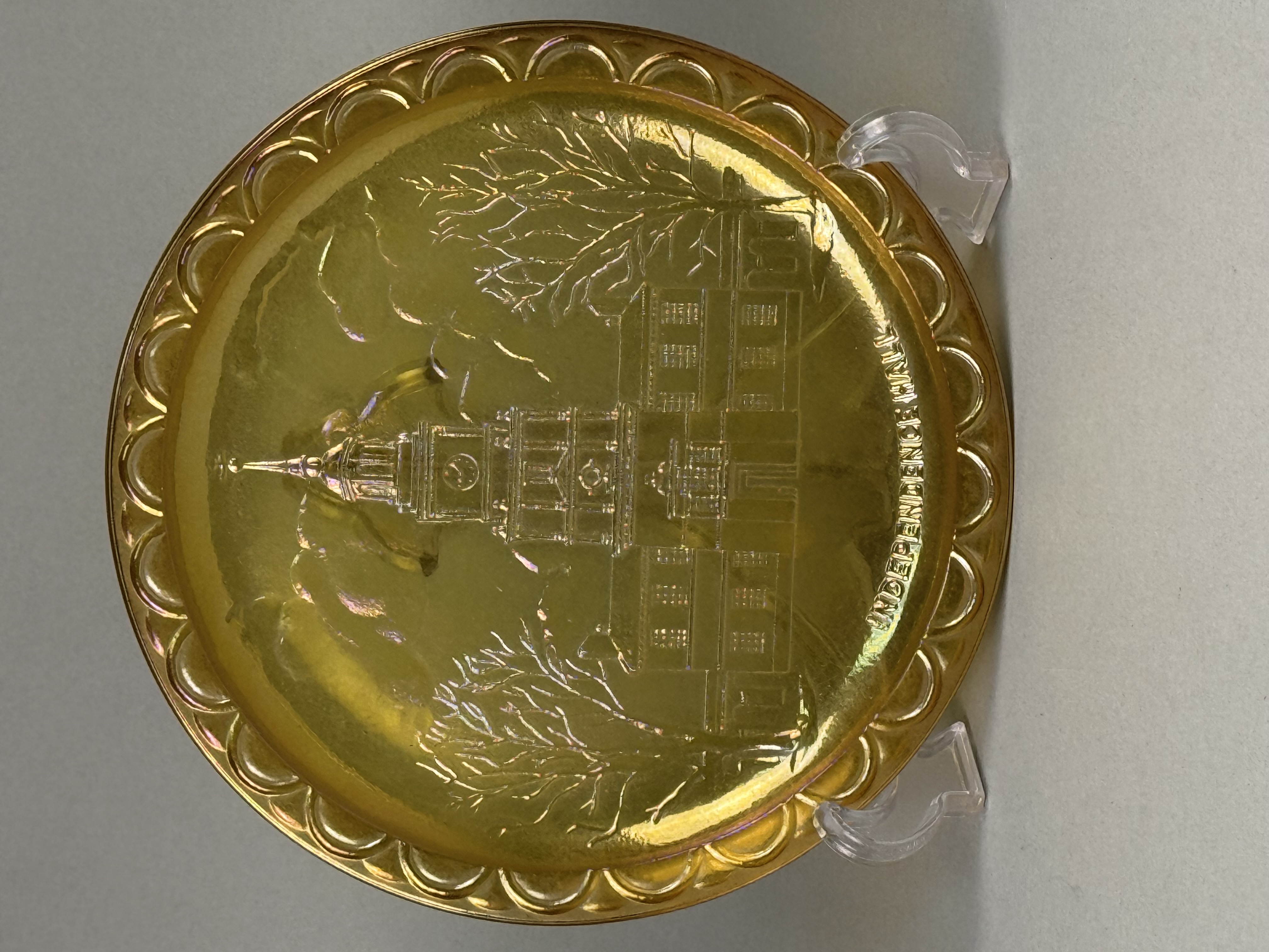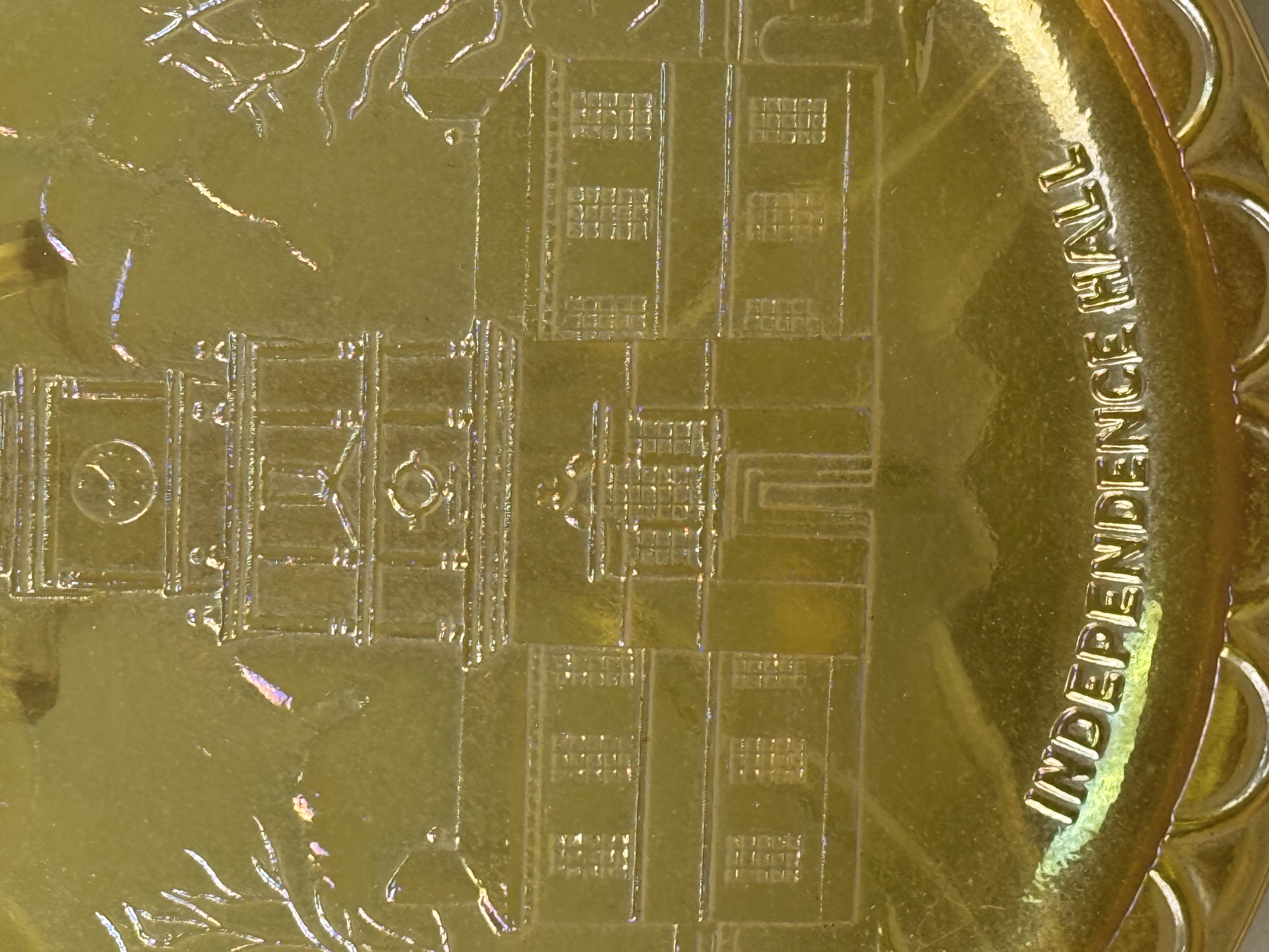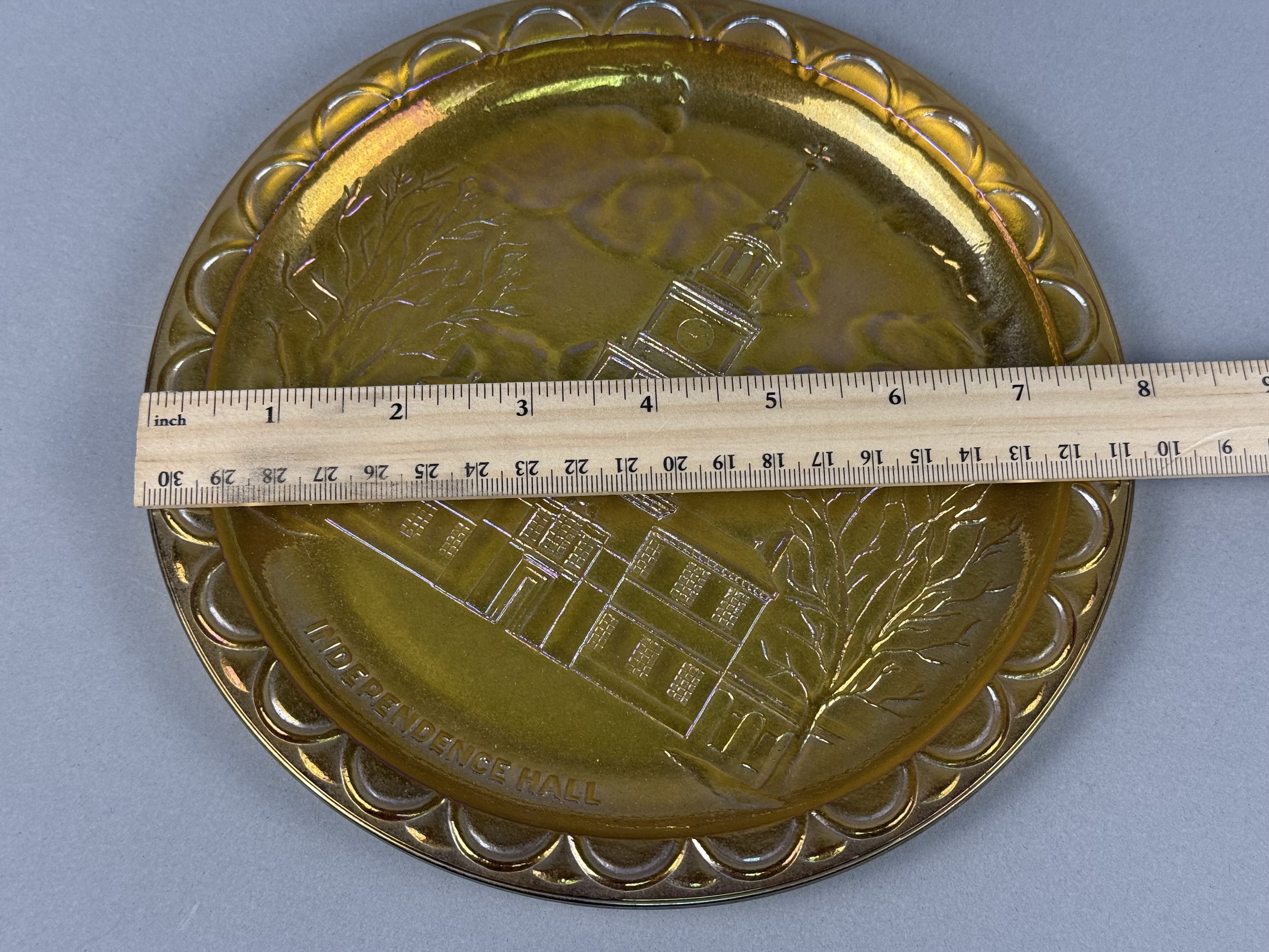 The item is constructed of pressed glass with a marigold iridescent surface treatment over an amber-yellow base. The central well features a raised-relief depiction of Independence Hall flanked by leafless trees. The plate is designed with a scalloped rim and a decorative open-lace style border. The words INDEPENDENCE HALL are embossed in raised lettering on the face of the plate. The base is smooth and lacks a pontil mark, indicating a molded manufacturing process. Diameter: 8 inches. The plate is in good condition with no observed chips, cracks, or structural repairs. The iridescent finish shows typical age-appropriate wear but remains largely uniform across the surface.