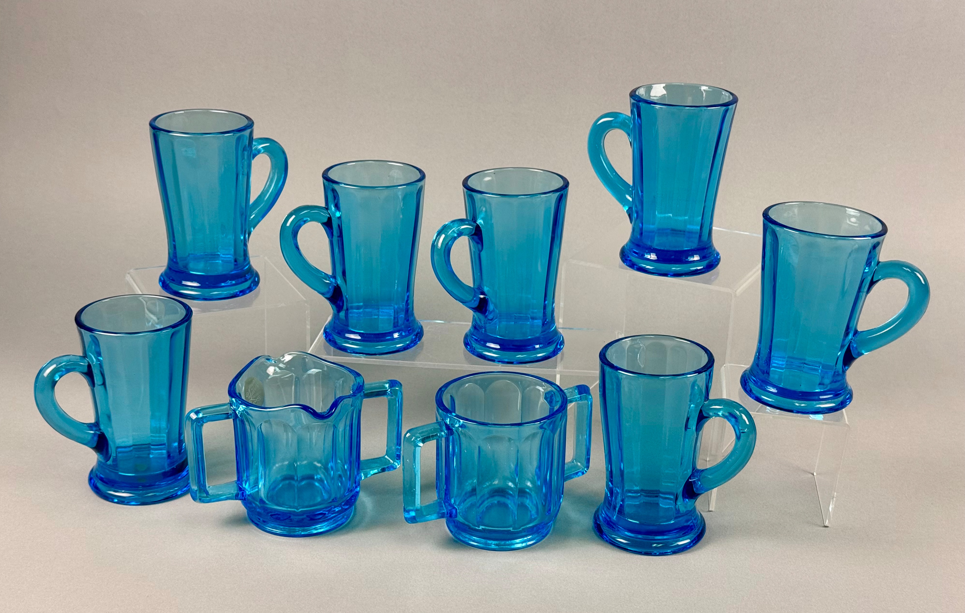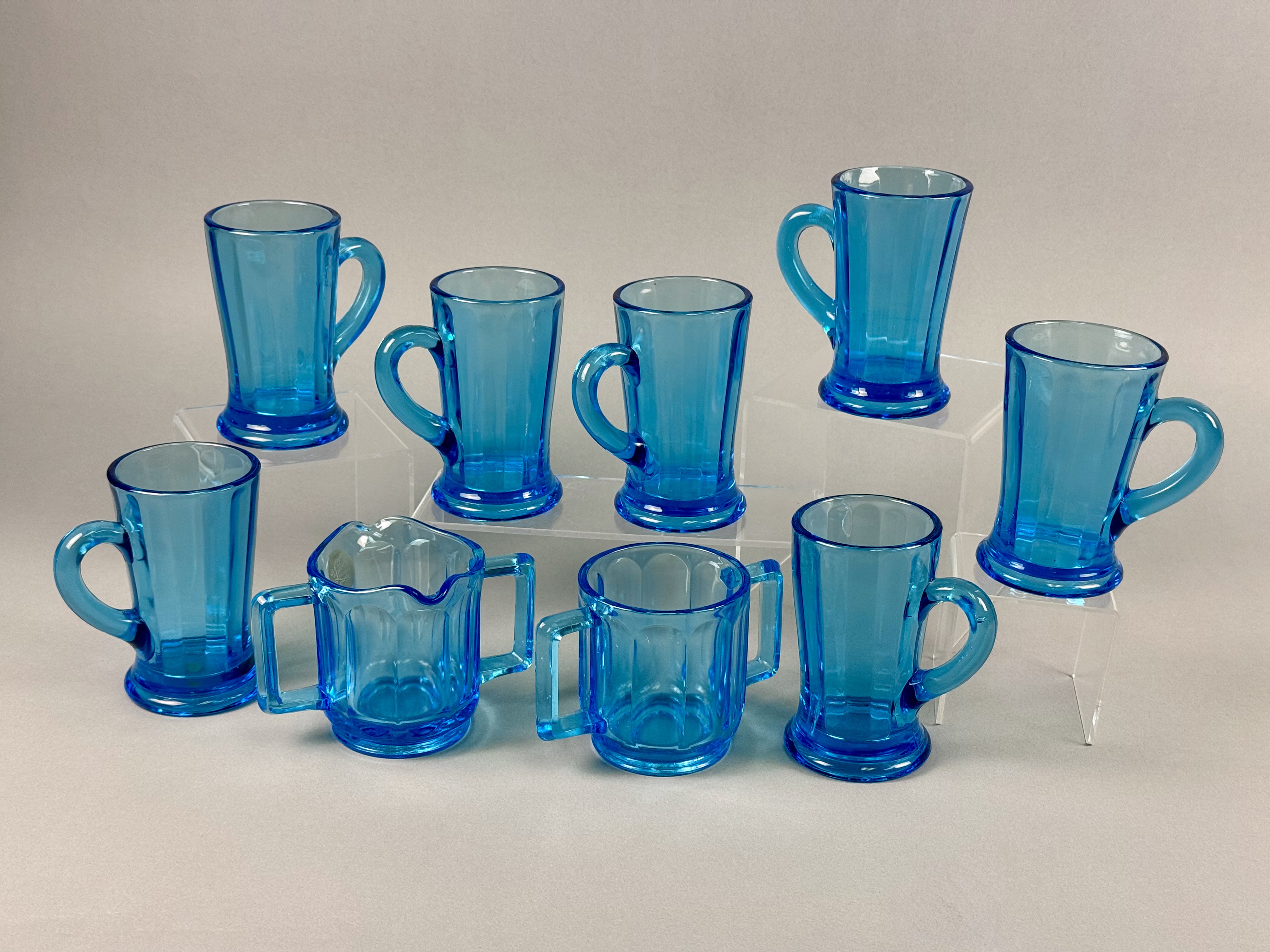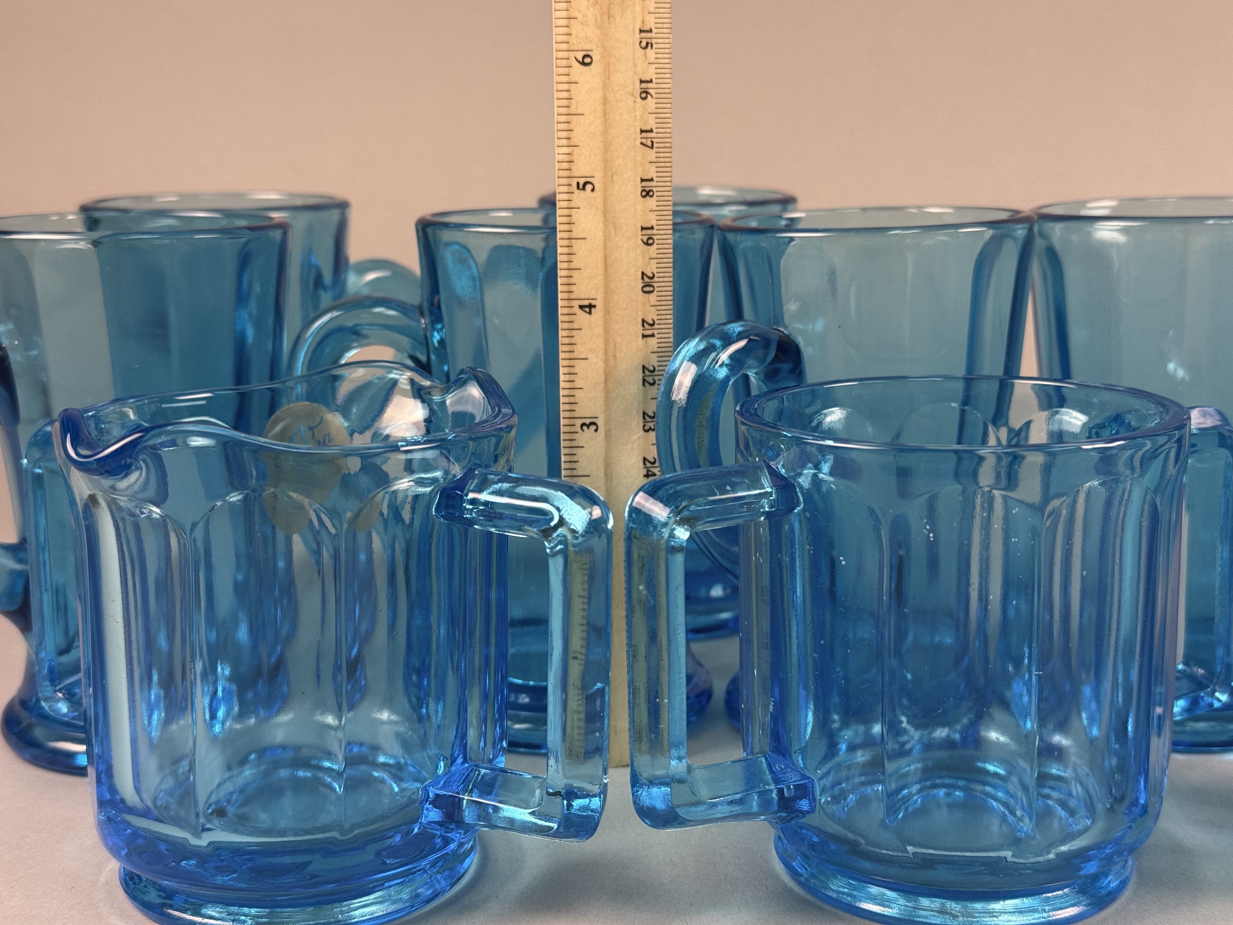 This set of nine pressed glass items is finished in a transparent blue color known as Monarch Blue. The collection includes seven tall footed mugs, one creamer with a pouring spout, and one open sugar bowl. The pieces are designed in the Versailles pattern, characterized by wide vertical panels that end in arched shoulders near the rim. The mugs feature a pedestal base and a C-shaped handle, while the creamer and sugar bowl are designed with dual squared-off handles. One piece retains a partial gold foil manufacturer label on the interior with the cursive text Tiara and the word EXCLUSIVE. These items were distributed by Tiara Exclusives and manufactured by the Indiana Glass Company between 1970 and 1998. Creamer and sugar bowl: 3 inches Mugs: 4.5 to 5 inches The set is in good vintage condition with no visible chips, cracks, or significant surface wear. One piece retains the original manufacturer foil label.