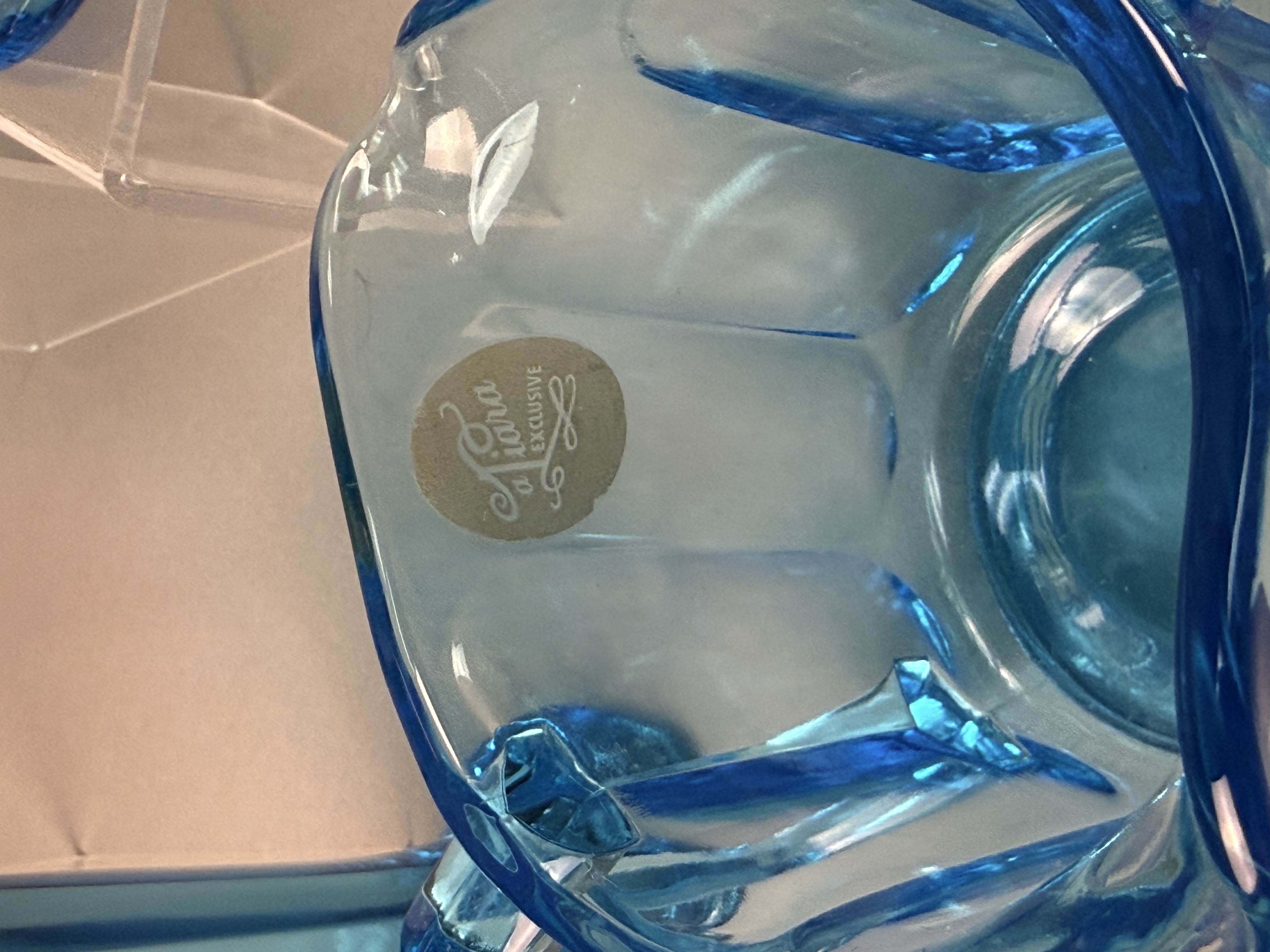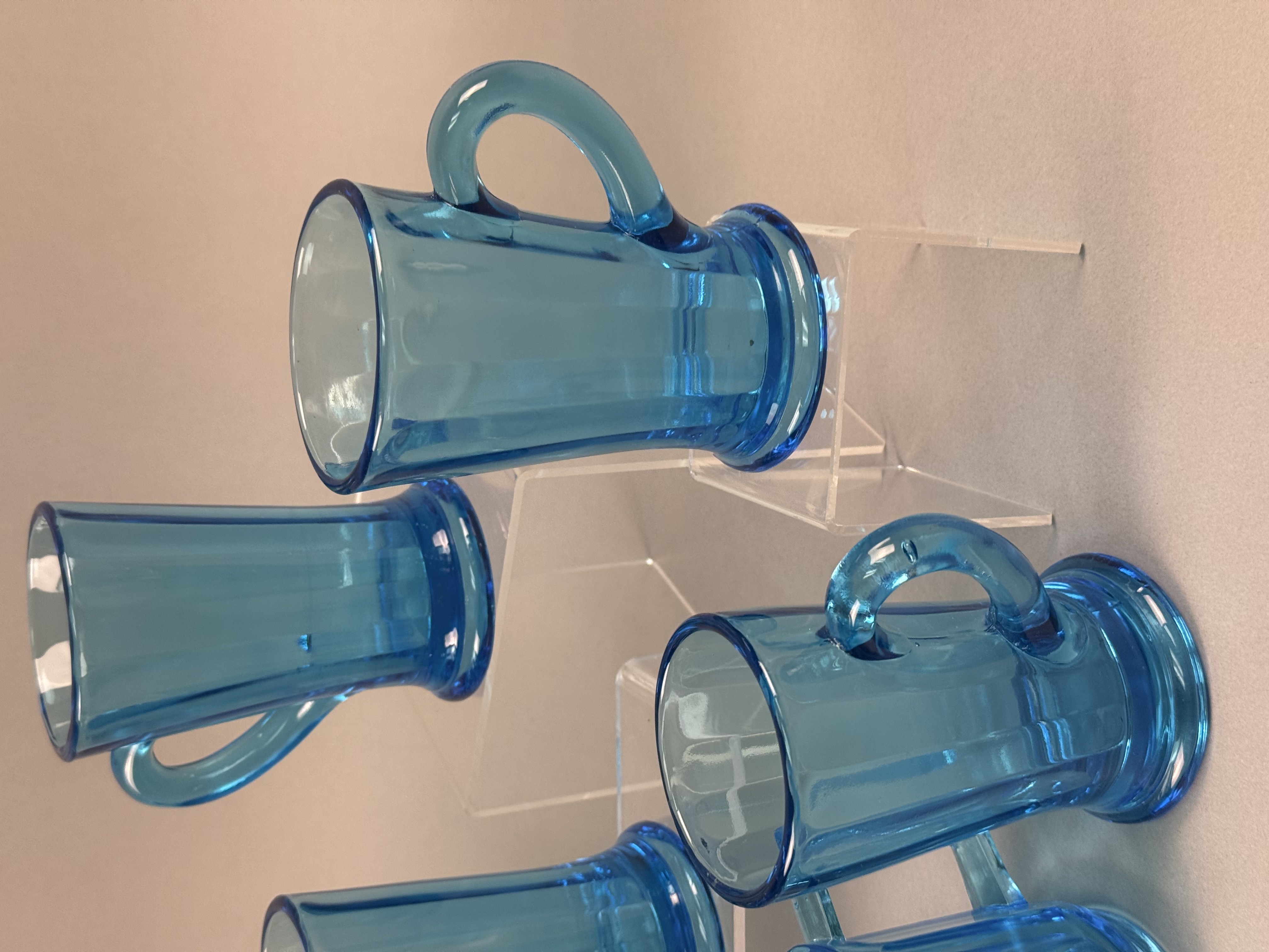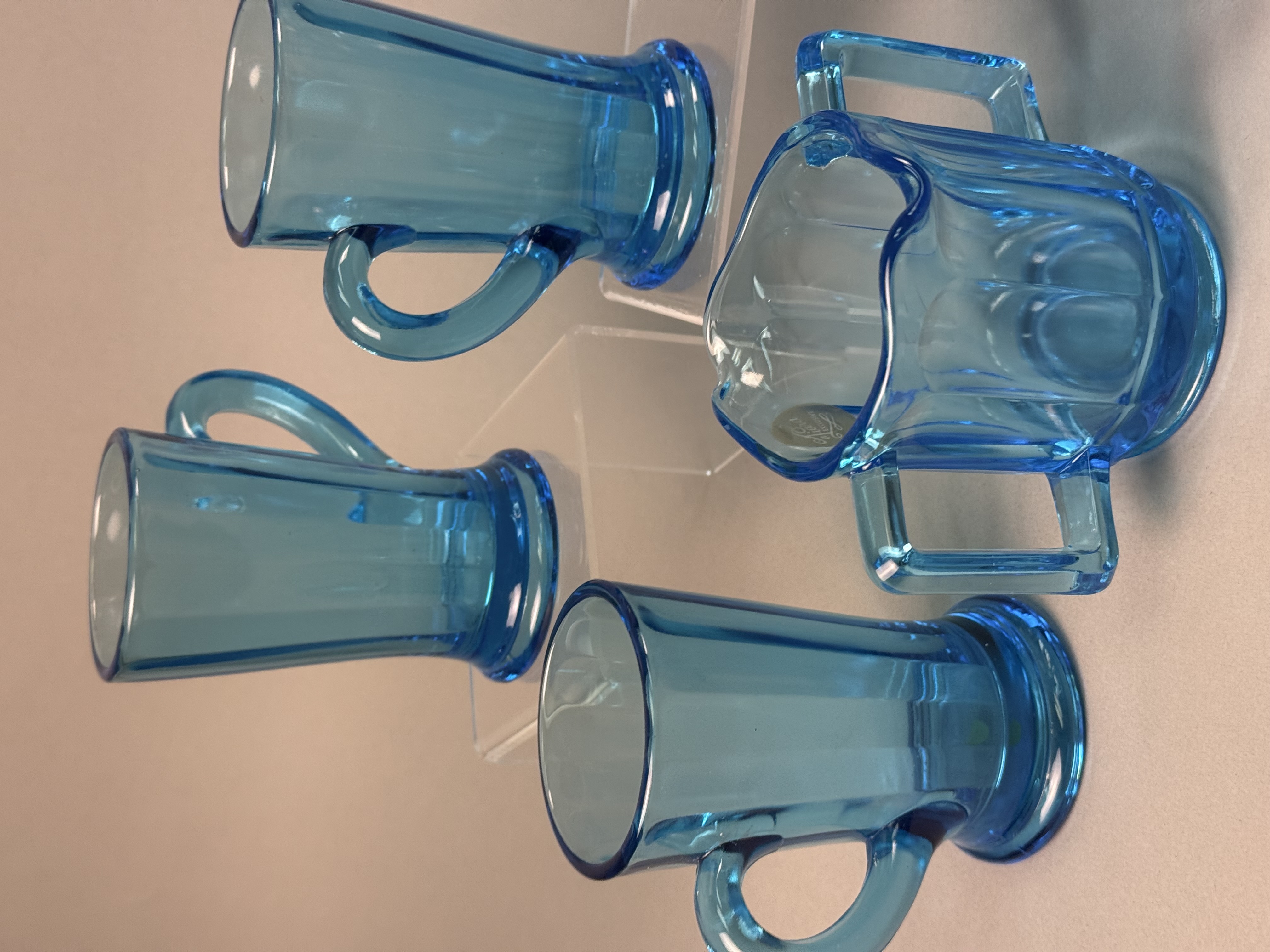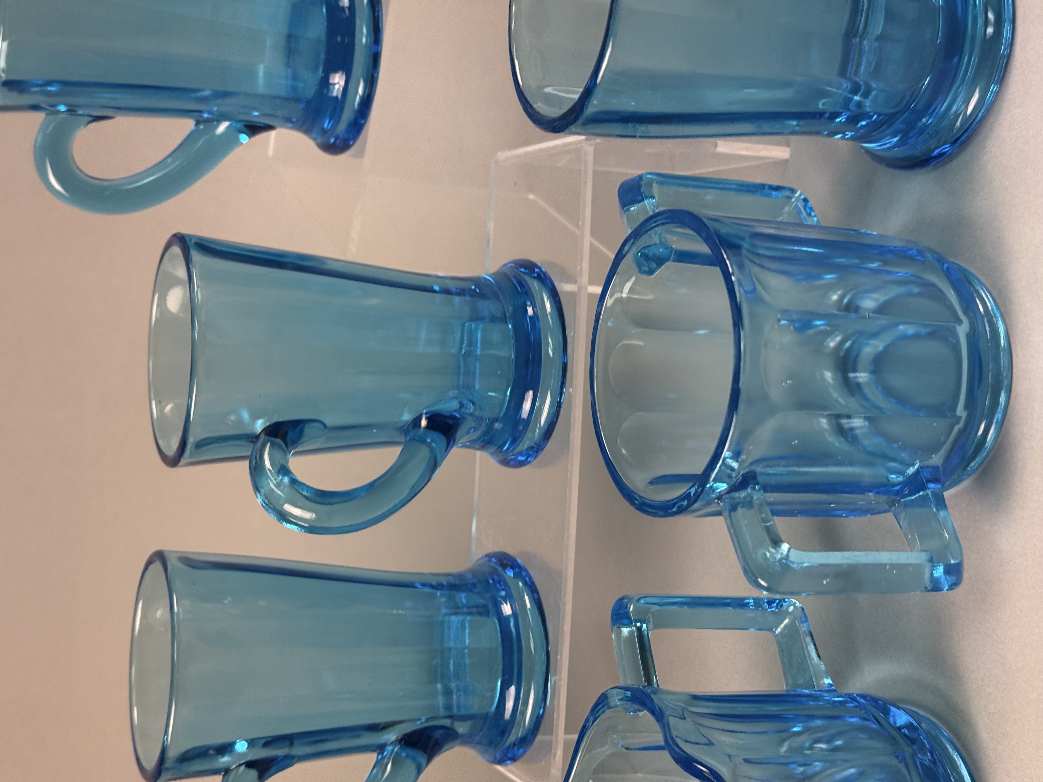 This set of nine pressed glass items is finished in a transparent blue color known as Monarch Blue. The collection includes seven tall footed mugs, one creamer with a pouring spout, and one open sugar bowl. The pieces are designed in the Versailles pattern, characterized by wide vertical panels that end in arched shoulders near the rim. The mugs feature a pedestal base and a C-shaped handle, while the creamer and sugar bowl are designed with dual squared-off handles. One piece retains a partial gold foil manufacturer label on the interior with the cursive text Tiara and the word EXCLUSIVE. These items were distributed by Tiara Exclusives and manufactured by the Indiana Glass Company between 1970 and 1998. Creamer and sugar bowl: 3 inches Mugs: 4.5 to 5 inches The set is in good vintage condition with no visible chips, cracks, or significant surface wear. One piece retains the original manufacturer foil label.