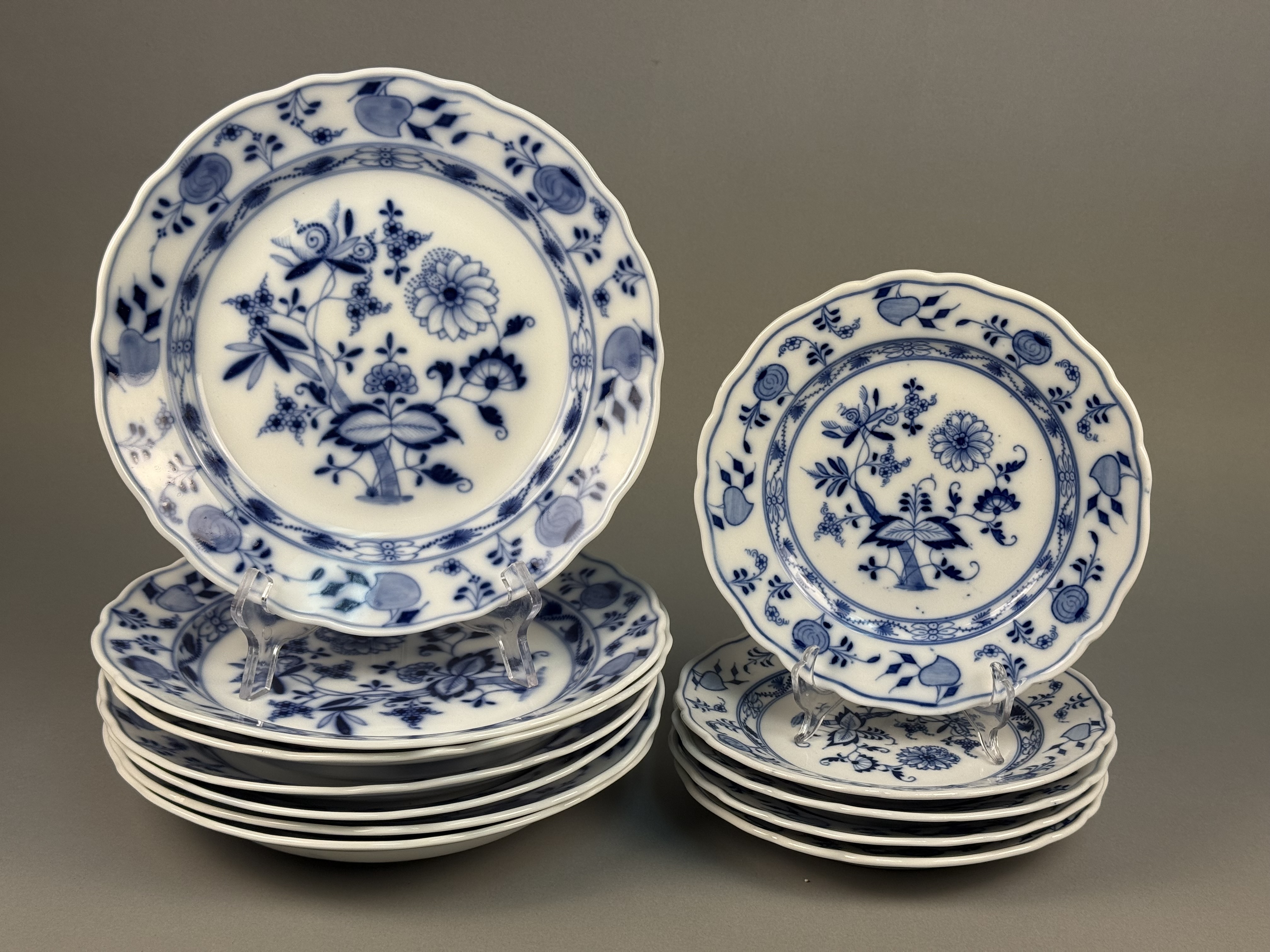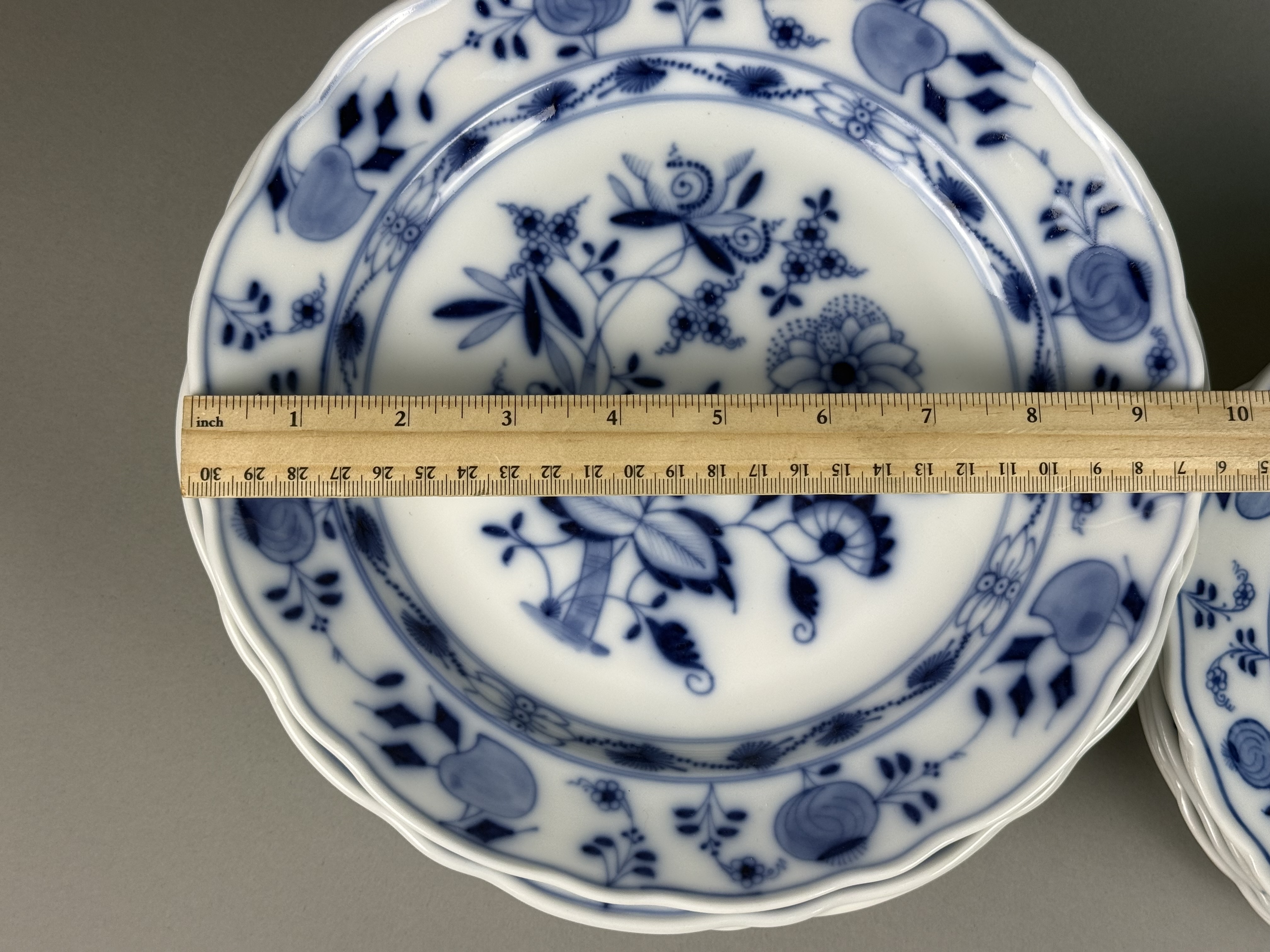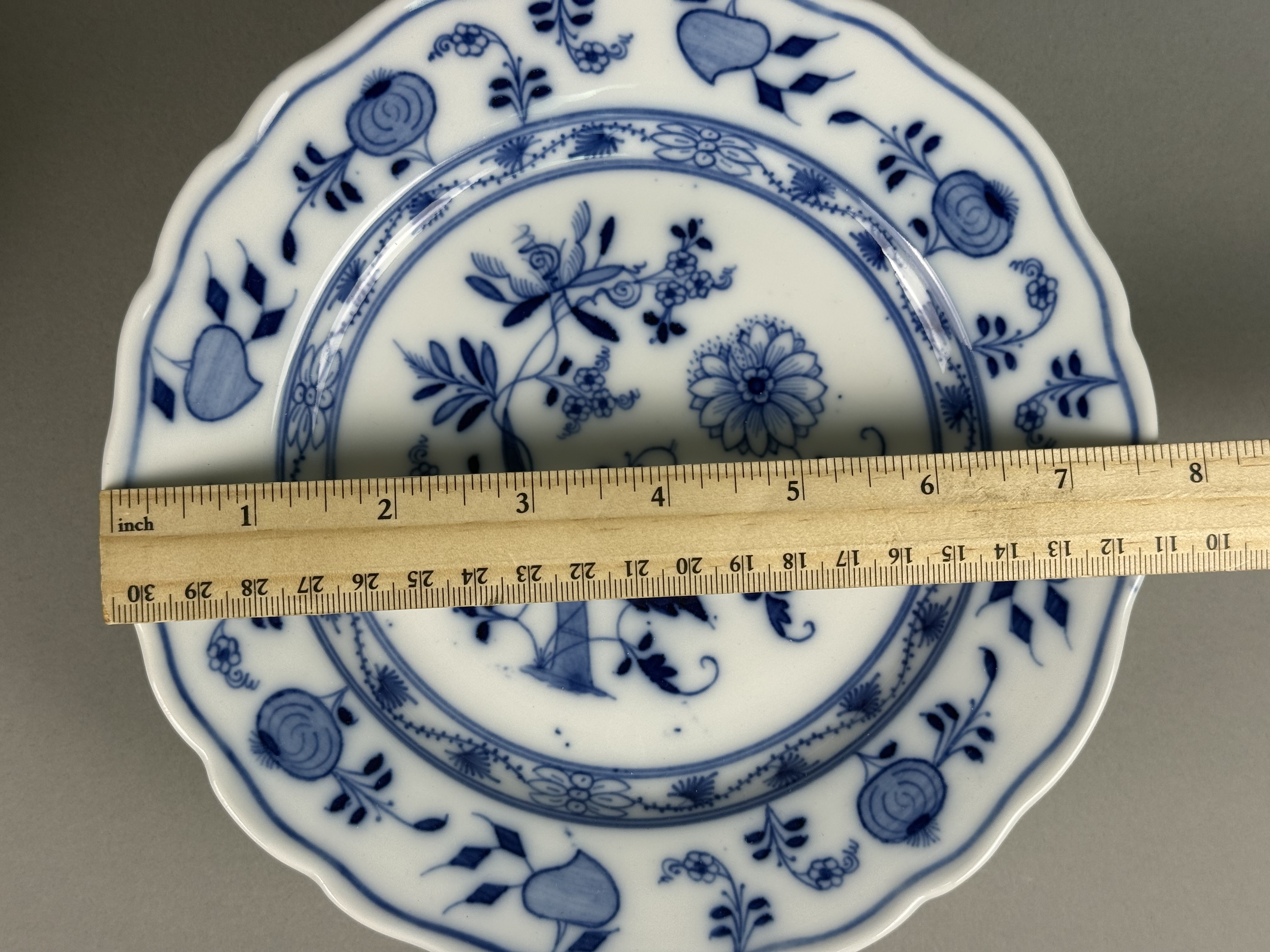 This set of twelve porcelain plates is produced by the Carl Teichert factory in Meissen, Germany, commonly known as City Meissen. The plates are decorated in the traditional Blue Onion or Zwiebelmuster pattern using an underglaze blue transfer-ware technique. The decoration features a central floral and foliate motif with a stylized bamboo stalk, surrounded by a border of alternating pomegranates, peaches, and floral sprigs. Each plate is designed with a circular form and a scalloped rim. The larger plates bear an underglaze blue mark consisting of the name MEISSEN in an arch below a cross and arrow symbol, along with an impressed MEISSEN mark. The smaller plates feature an underglaze blue oval mark containing the name MEISSEN with a small symbol to the right. Large Plates: Approx. 9.75 in diameter Small Plates: Approx. 7.75 in diameter The plates are in good overall condition with no visible chips, cracks, or repairs. Minimal shelf wear is present on the foot rings.