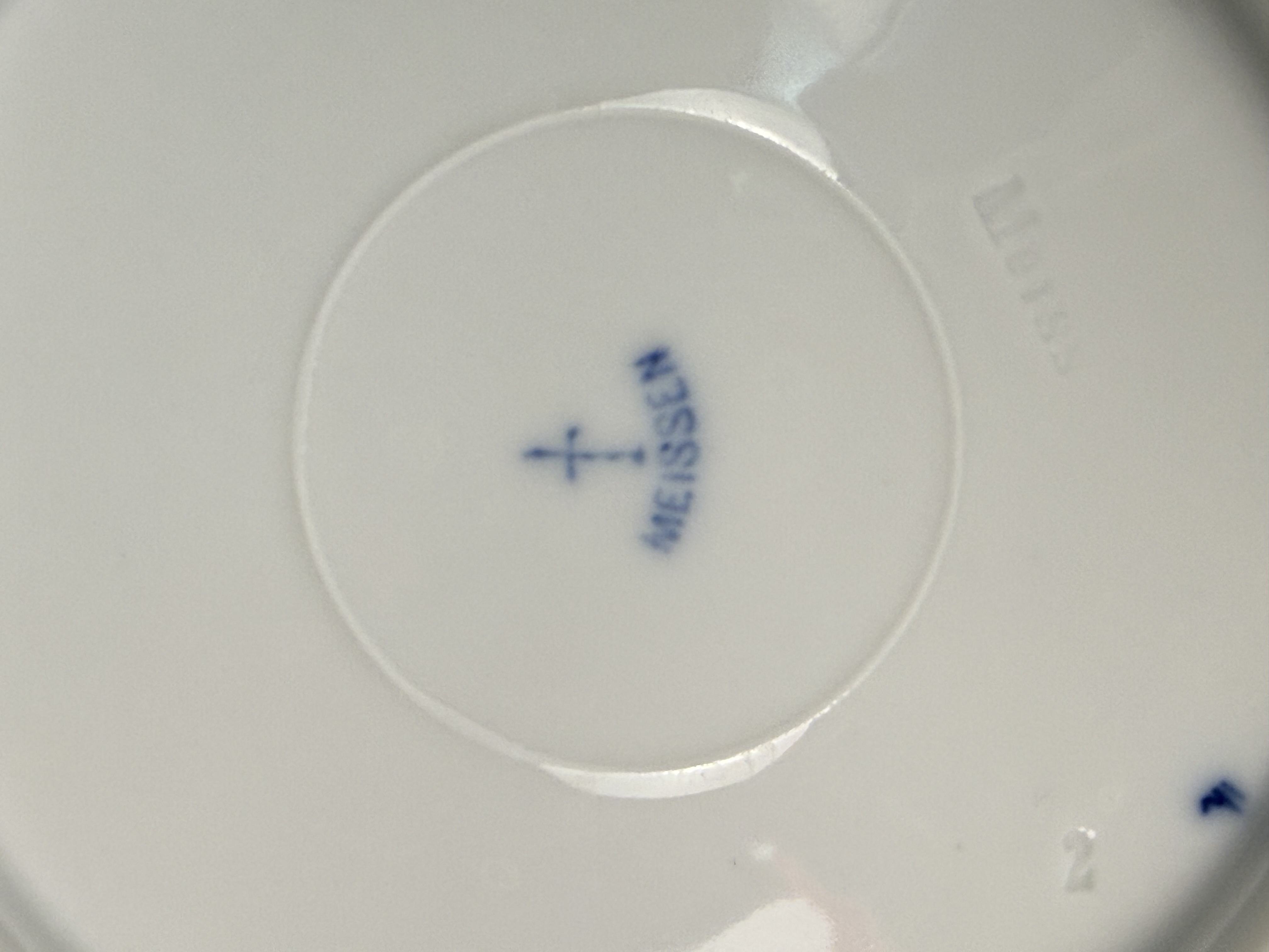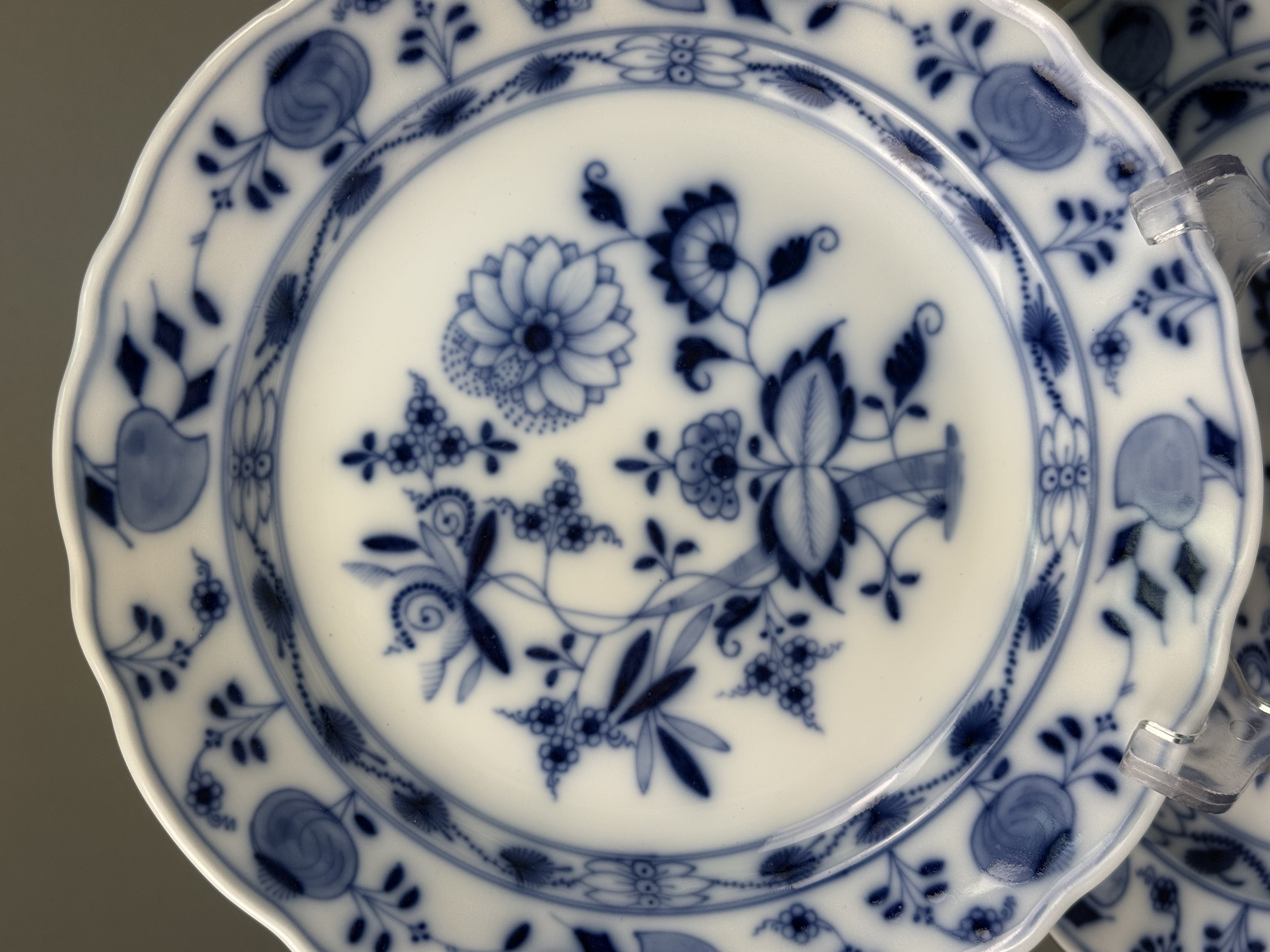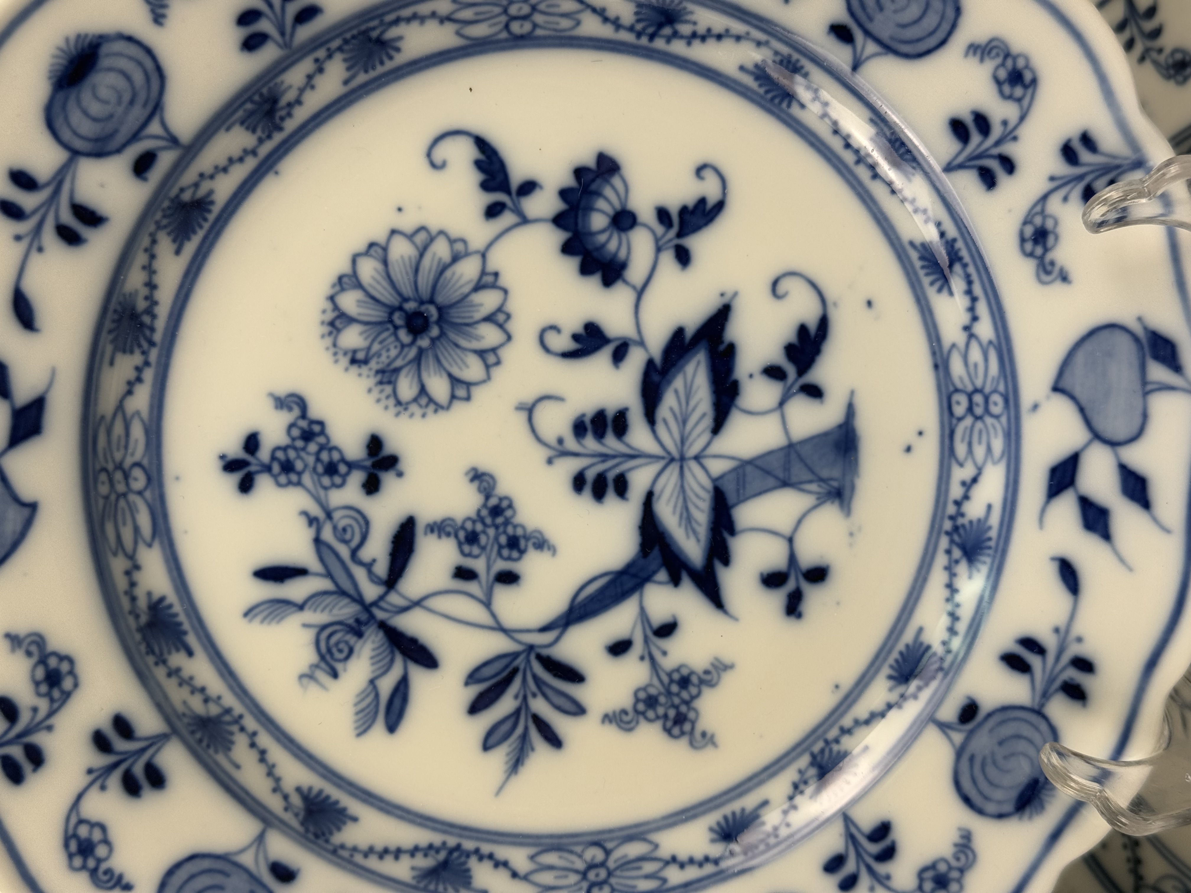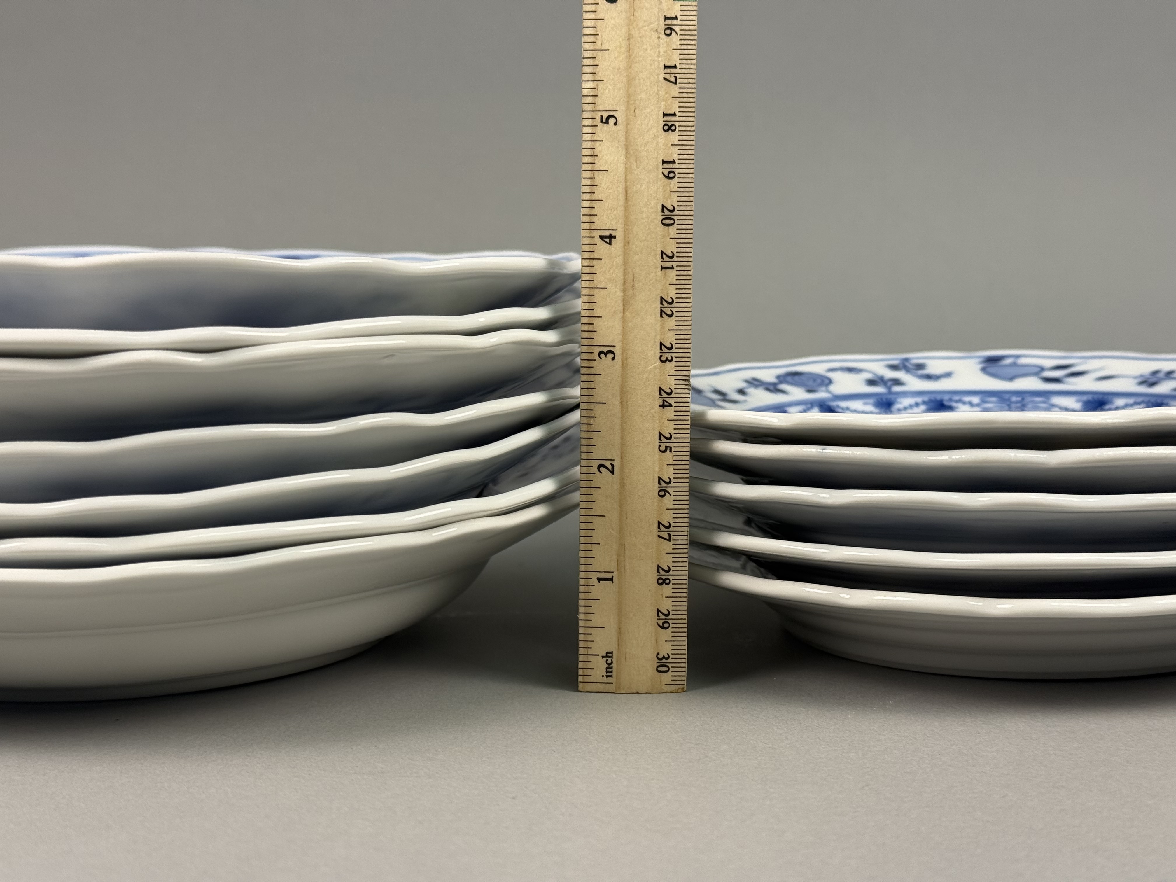 This set of twelve porcelain plates is produced by the Carl Teichert factory in Meissen, Germany, commonly known as City Meissen. The plates are decorated in the traditional Blue Onion or Zwiebelmuster pattern using an underglaze blue transfer-ware technique. The decoration features a central floral and foliate motif with a stylized bamboo stalk, surrounded by a border of alternating pomegranates, peaches, and floral sprigs. Each plate is designed with a circular form and a scalloped rim. The larger plates bear an underglaze blue mark consisting of the name MEISSEN in an arch below a cross and arrow symbol, along with an impressed MEISSEN mark. The smaller plates feature an underglaze blue oval mark containing the name MEISSEN with a small symbol to the right. Large Plates: Approx. 9.75 in diameter Small Plates: Approx. 7.75 in diameter The plates are in good overall condition with no visible chips, cracks, or repairs. Minimal shelf wear is present on the foot rings.