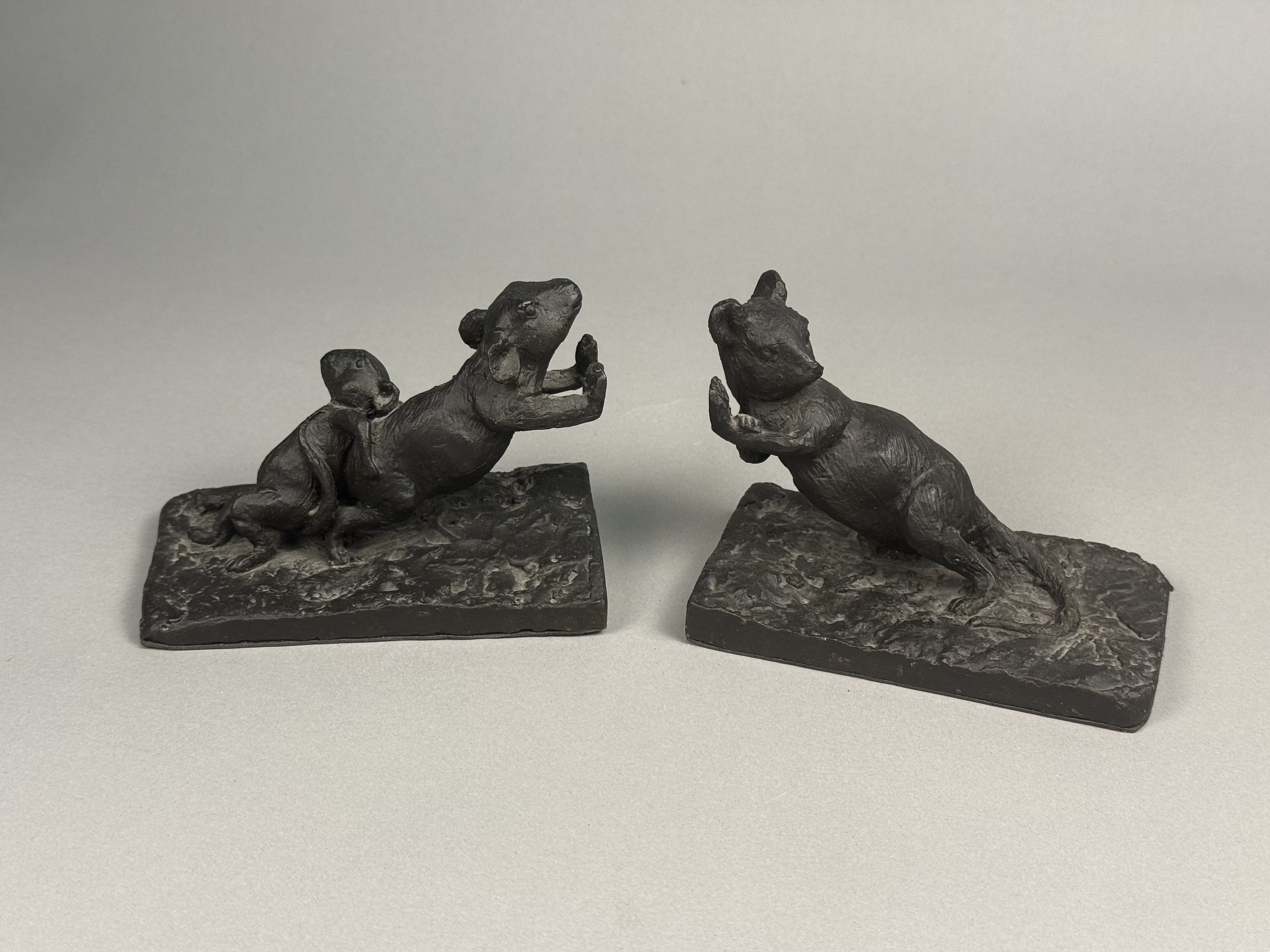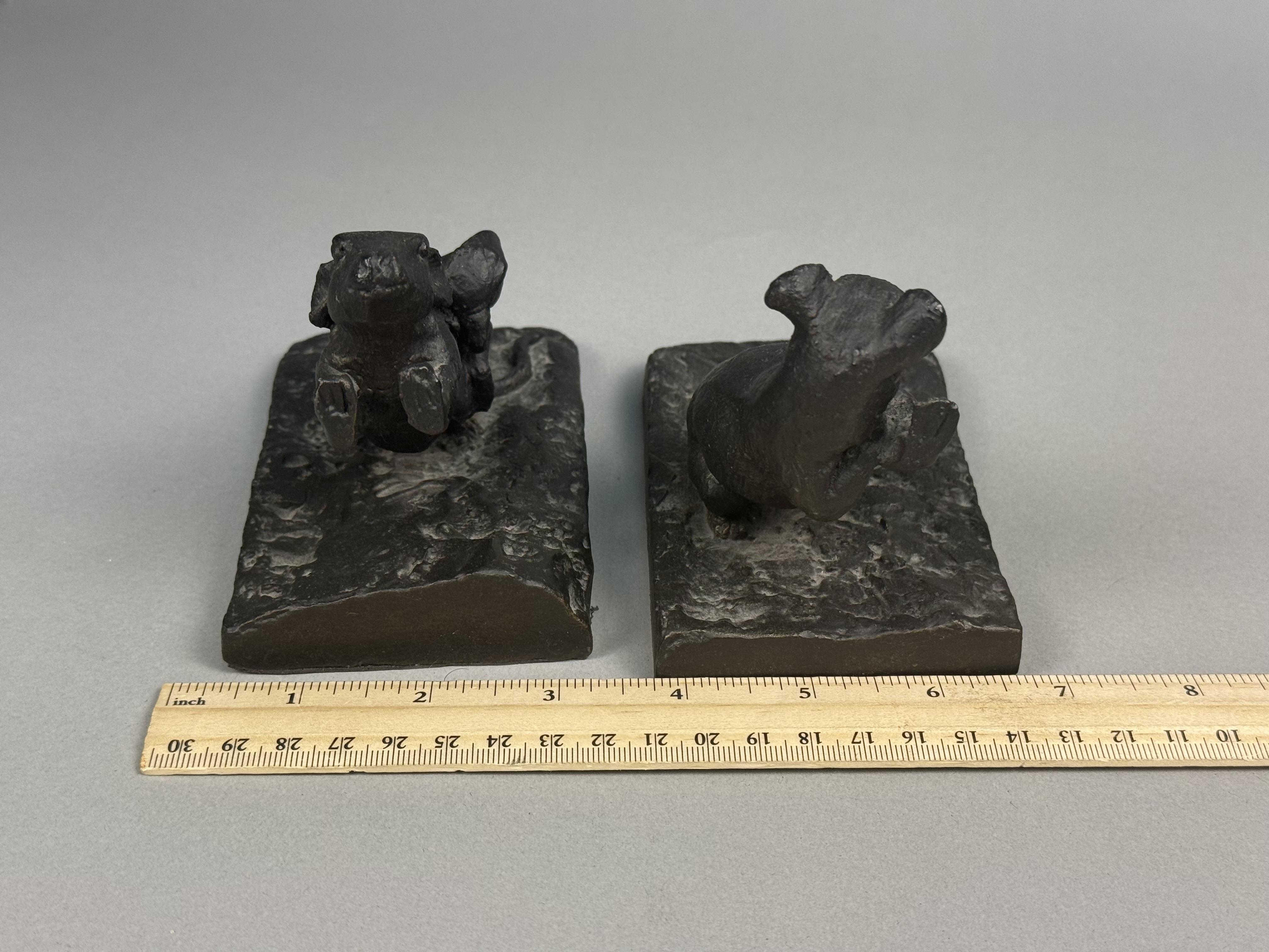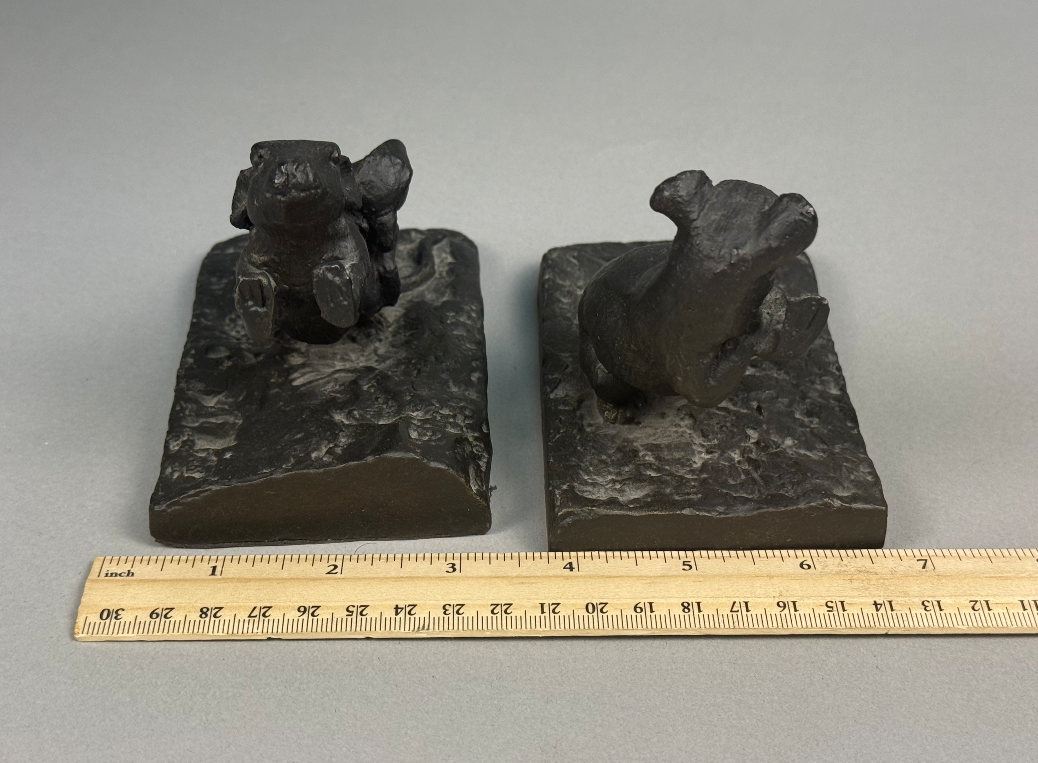 This pair of contemporary cast metal sculptures depicts rodents in expressive, upright poses. The figures are rendered in a gestural, heavily modeled style with a dark brown to black matte patina. One sculpture features two figures, a larger and a smaller rodent, while the second sculpture features a single larger figure. Both pieces are set on integral, rectangular, textured bases. No clearly legible characters, symbols, foundry marks, or signatures are present on the bases or bodies of the sculptures. The casting method appears to be consistent with sand casting or a similar process, resulting in a textured surface. 3 x 5 inches The sculptures are in good condition with no visible chips, cracks, or repairs to the casting. The matte patina is well-preserved with minimal signs of wear.