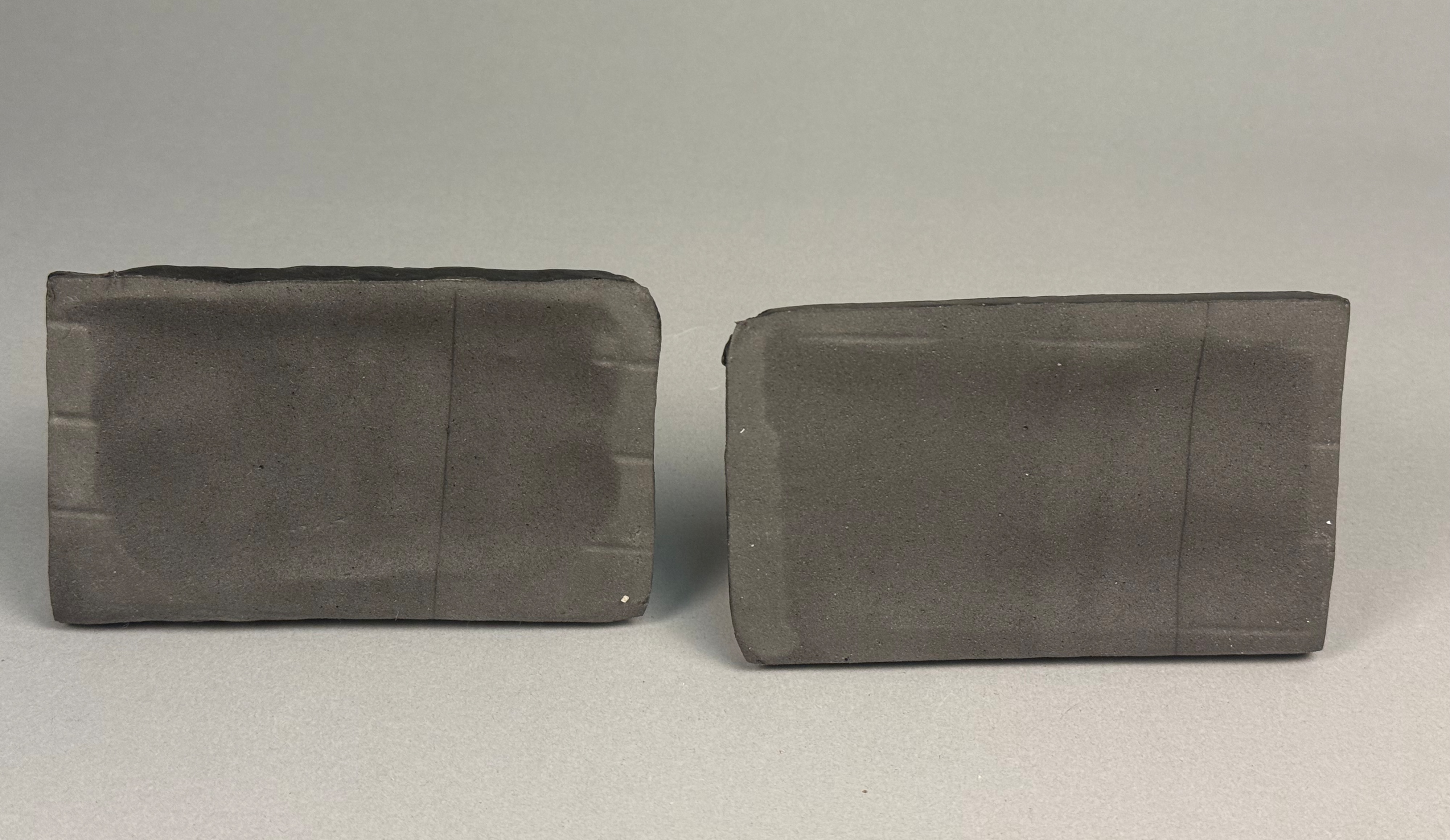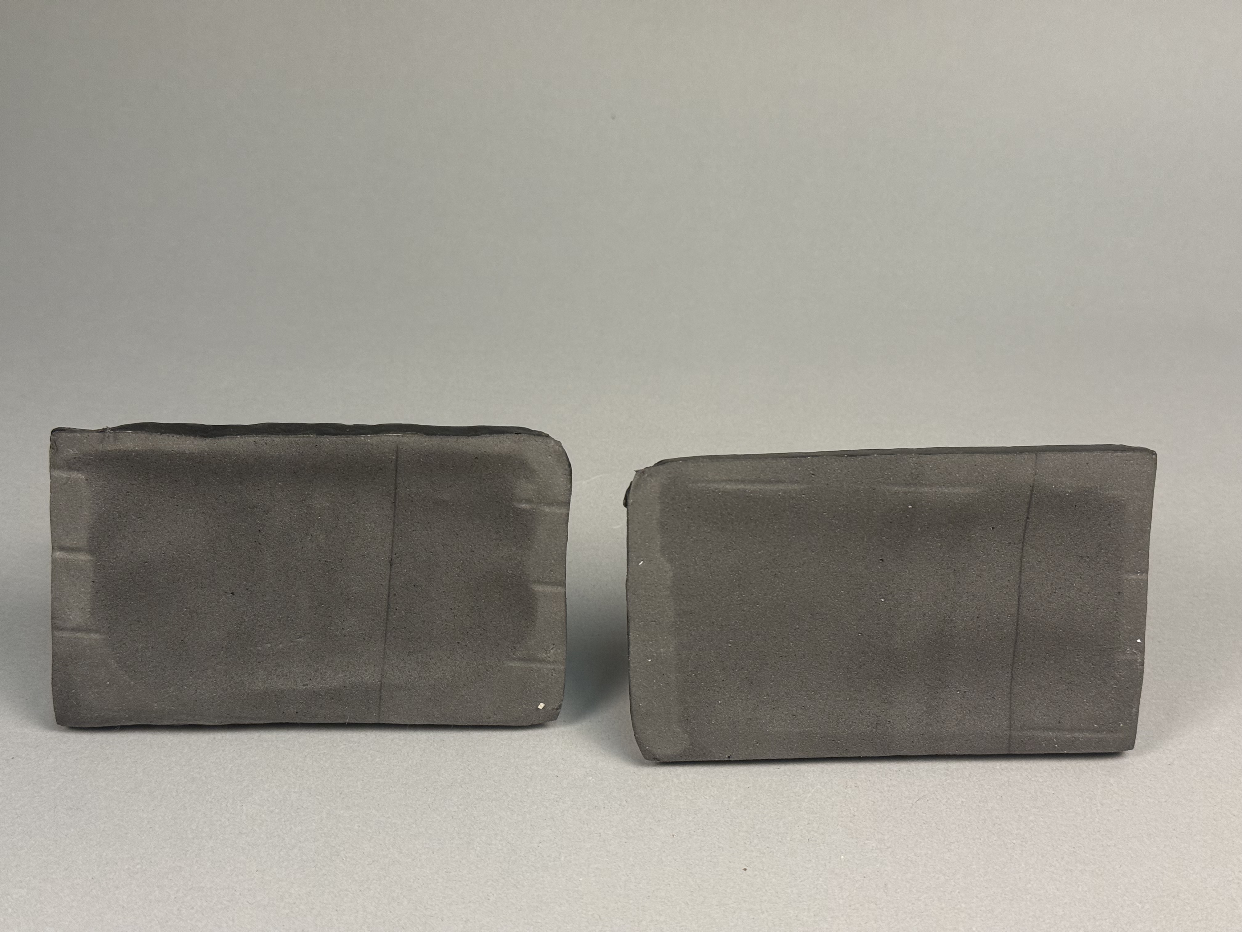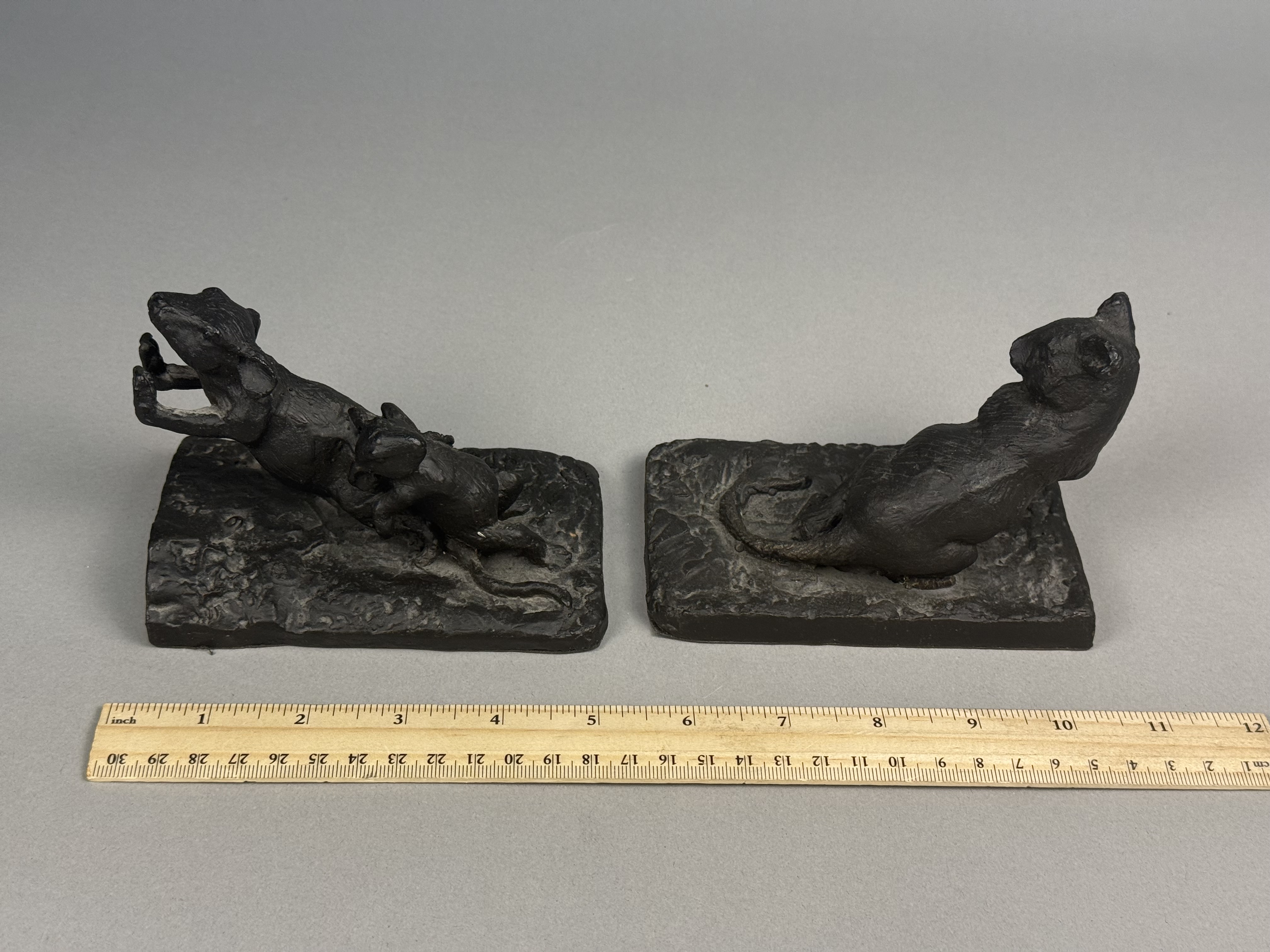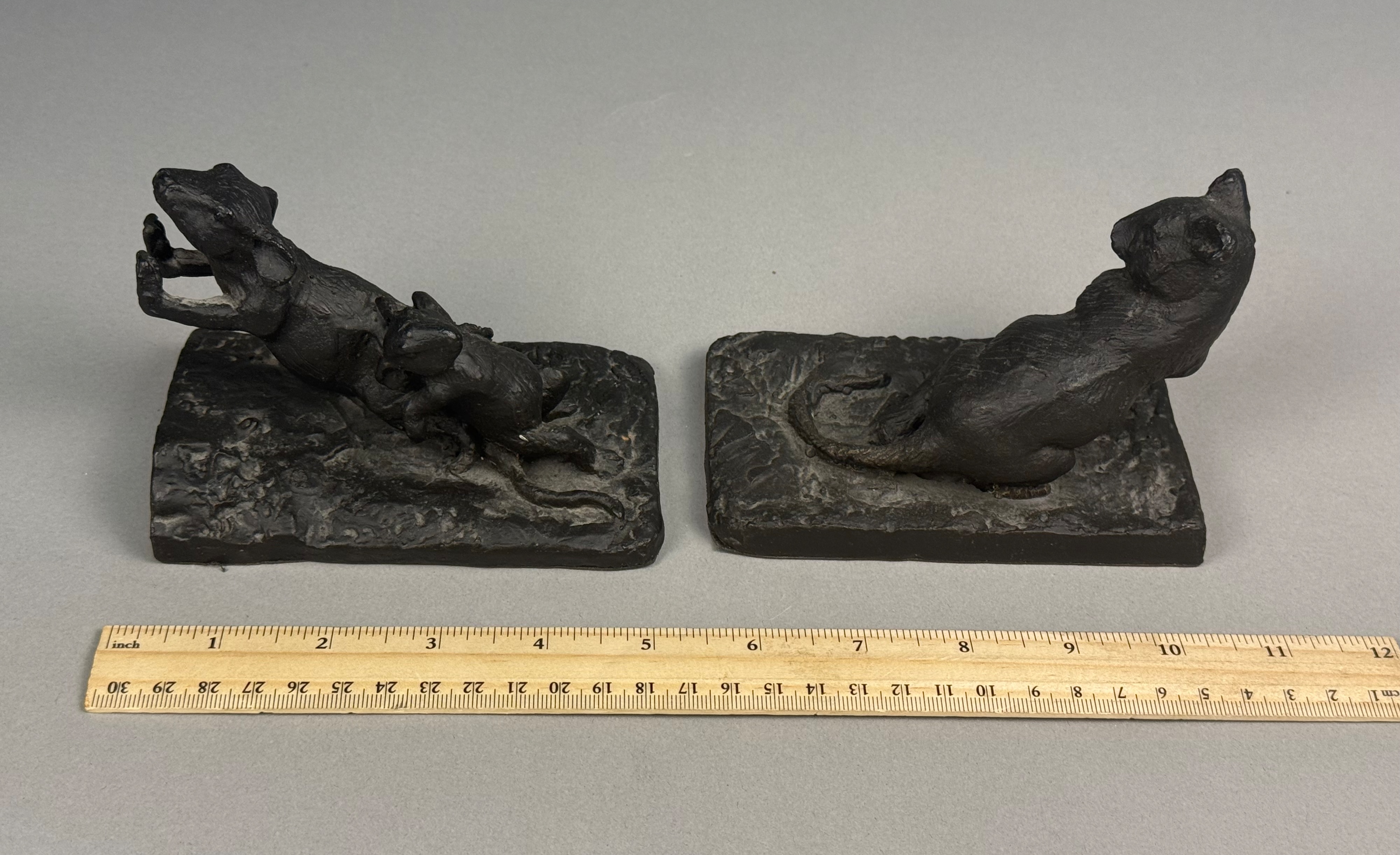 This pair of contemporary cast metal sculptures depicts rodents in expressive, upright poses. The figures are rendered in a gestural, heavily modeled style with a dark brown to black matte patina. One sculpture features two figures, a larger and a smaller rodent, while the second sculpture features a single larger figure. Both pieces are set on integral, rectangular, textured bases. No clearly legible characters, symbols, foundry marks, or signatures are present on the bases or bodies of the sculptures. The casting method appears to be consistent with sand casting or a similar process, resulting in a textured surface. 3 x 5 inches The sculptures are in good condition with no visible chips, cracks, or repairs to the casting. The matte patina is well-preserved with minimal signs of wear.