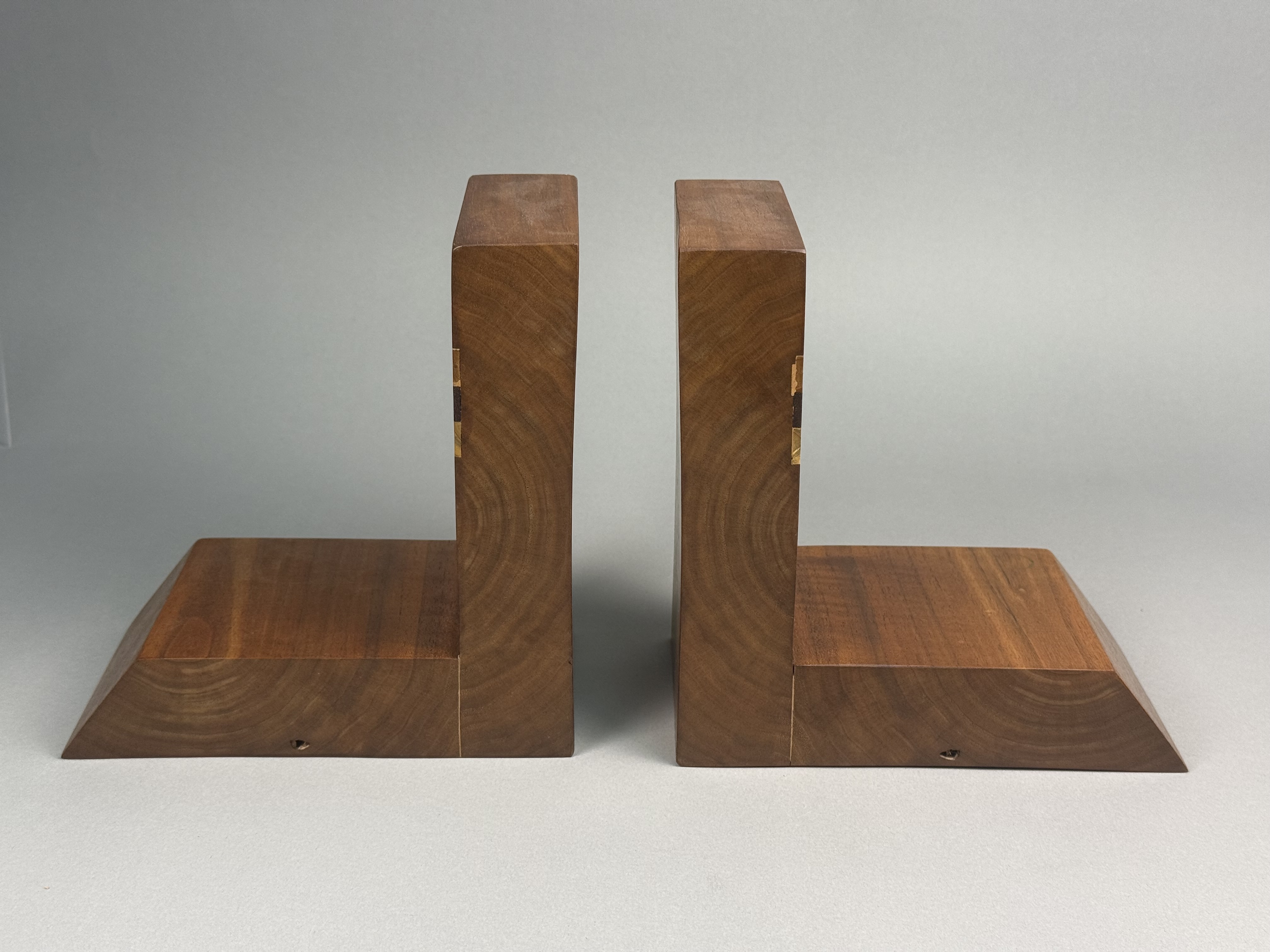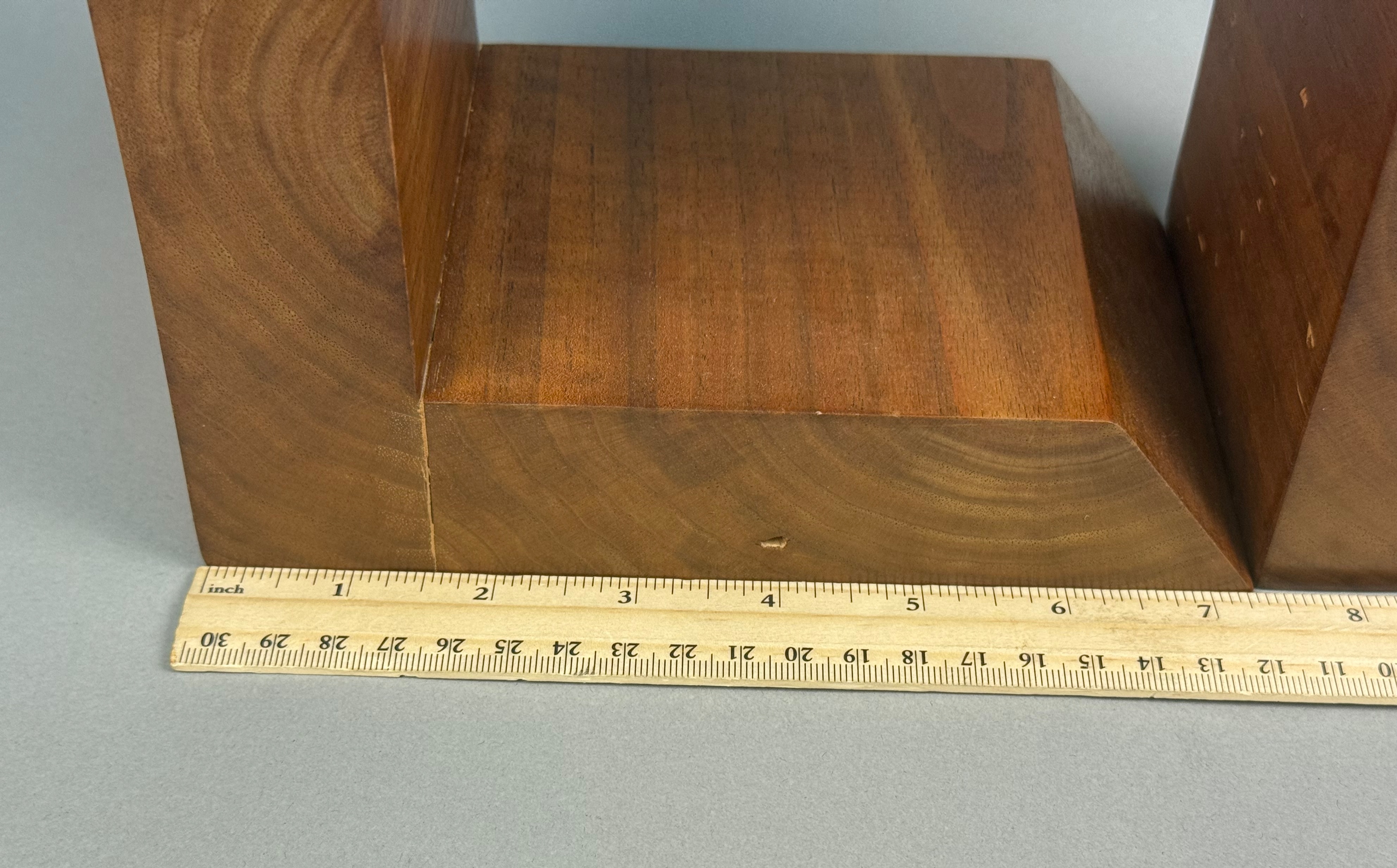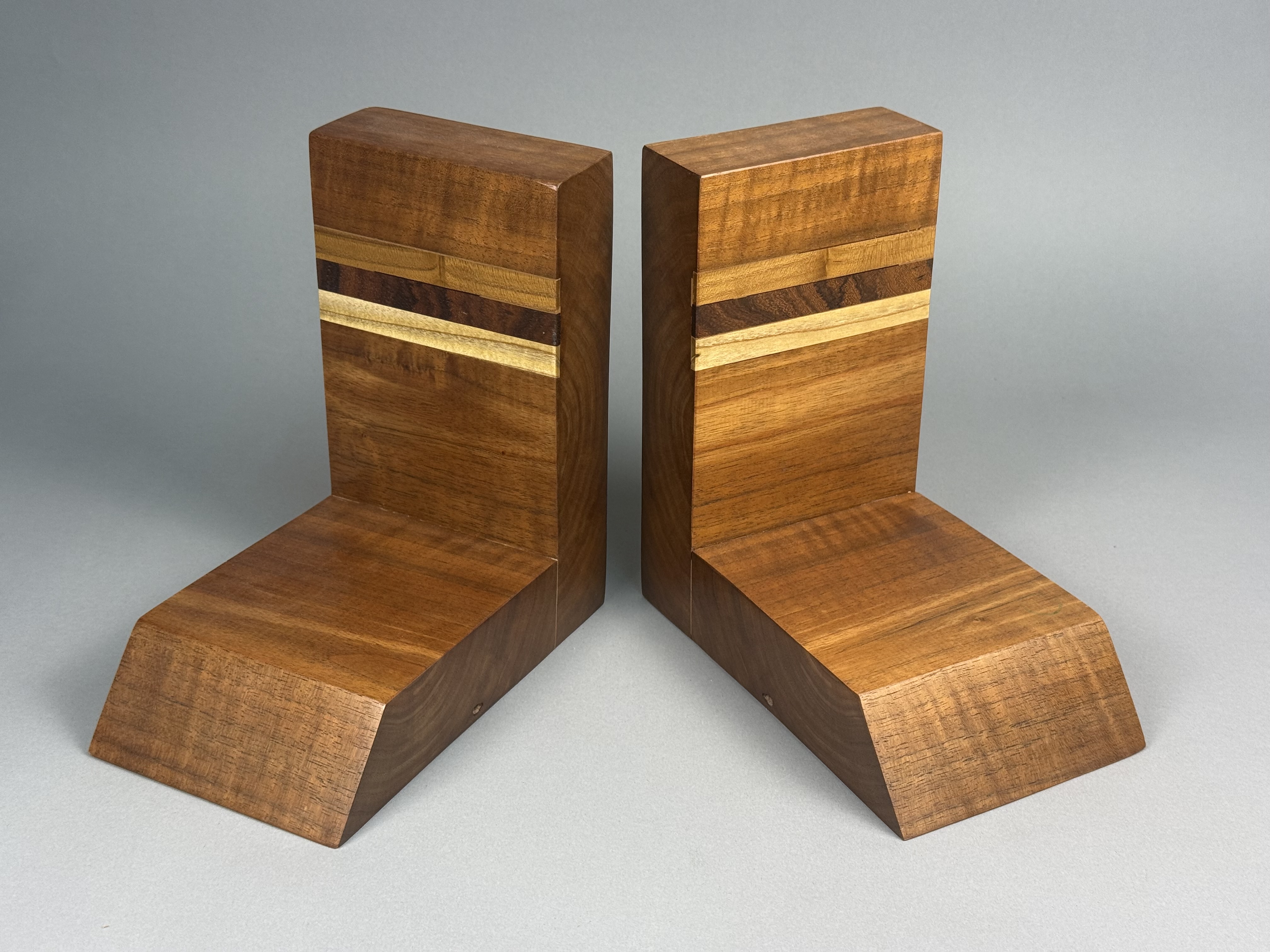 A pair of handcrafted wooden bookends of modernist L-shaped form. The pieces are constructed from laminated hardwoods with a polished finish, featuring prominent natural wood grain throughout. Each bookend is accented with horizontal decorative inlay bands of contrasting wood species in dark brown and light blonde tones. The bases are designed with a prominent beveled front edge. No maker marks, signatures, or labels are present on the visible surfaces. Height: 7.75 inches Base Length: 7.5 inches The items are in good condition. Visible minor surface scratches, small dings, and light wear consistent with age and use. No structural damage or repairs are observed.