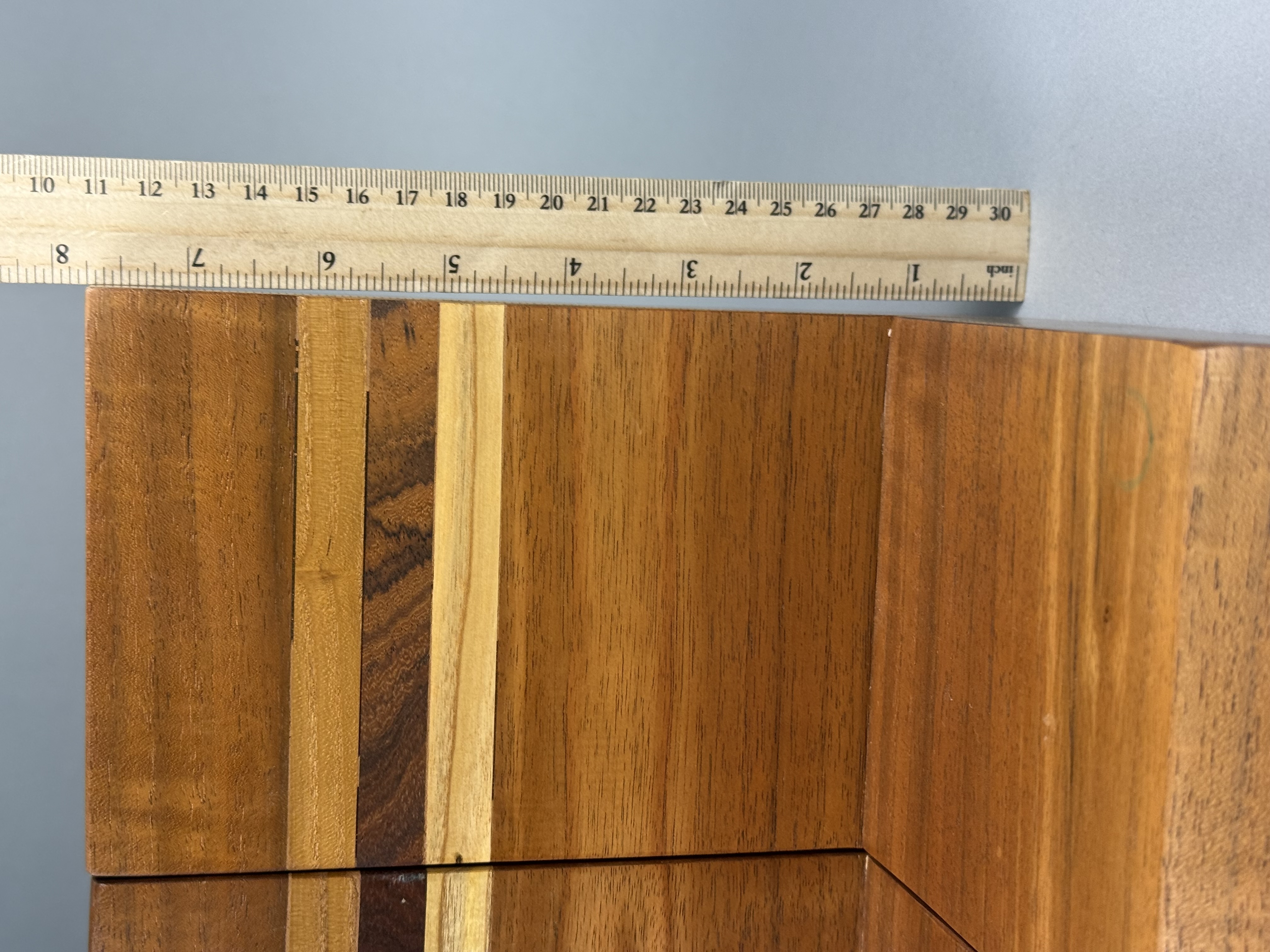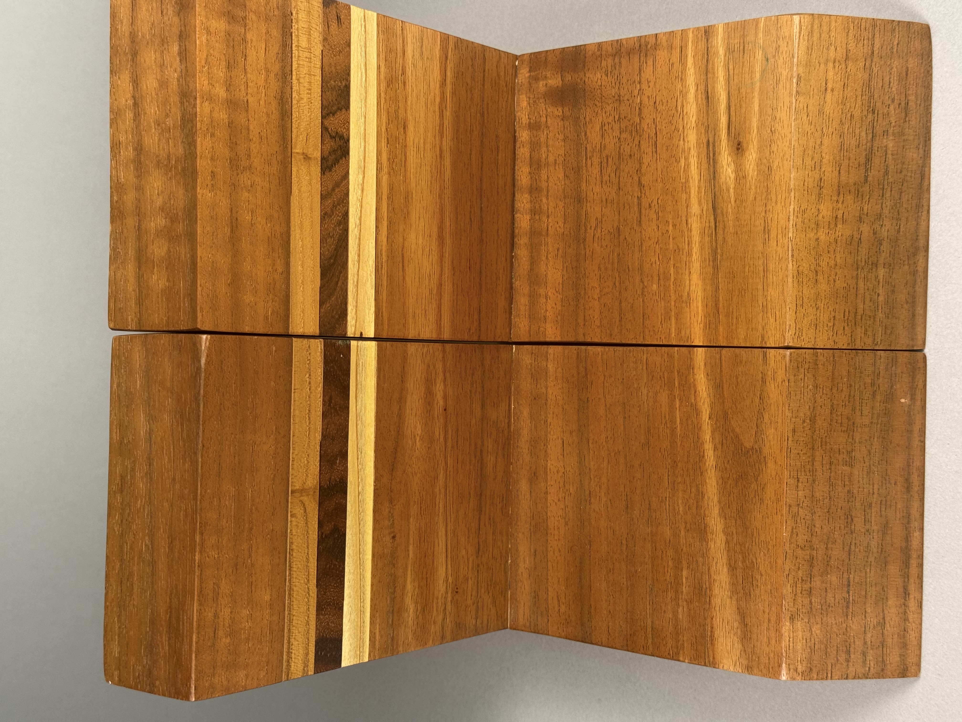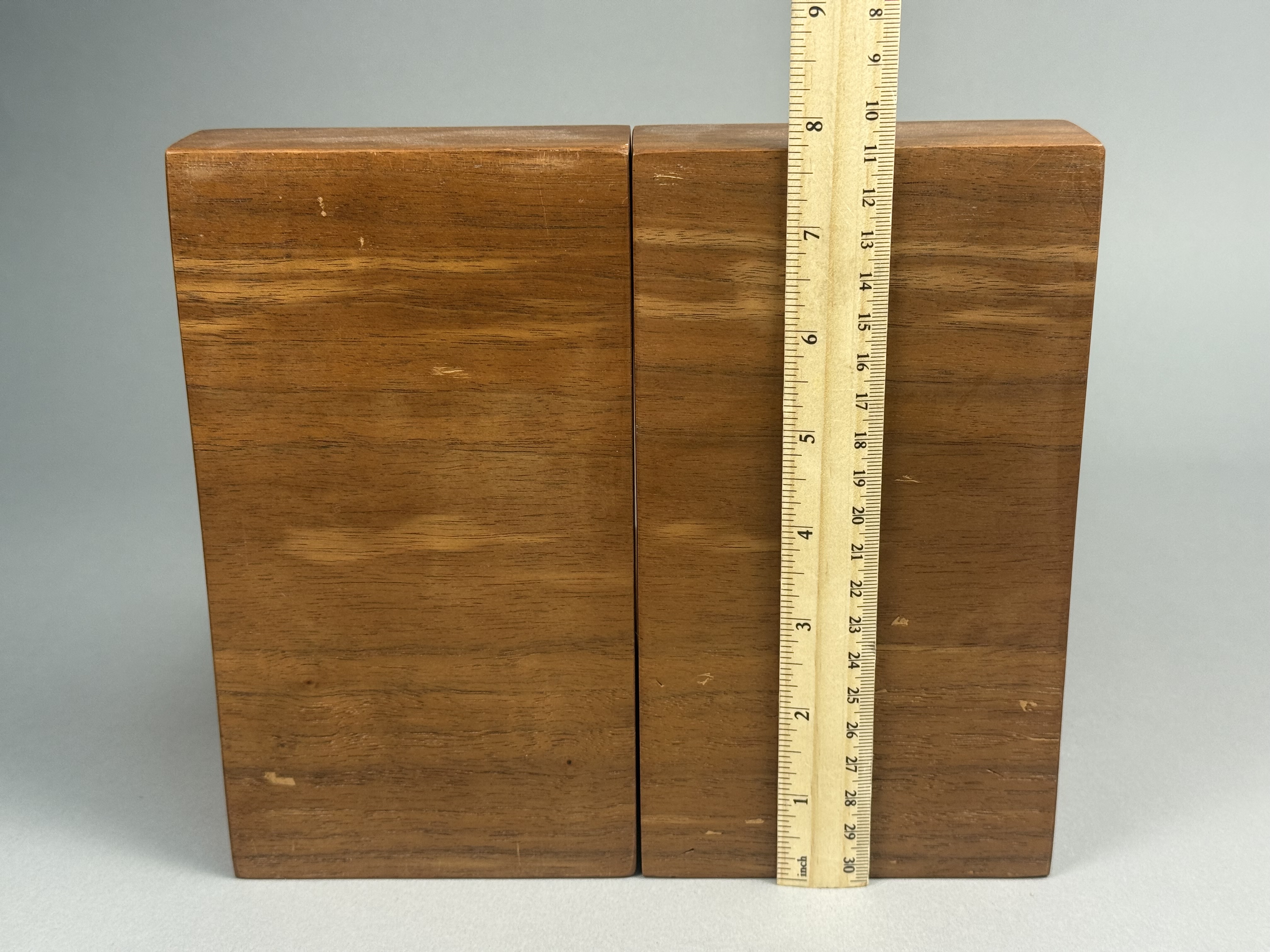 A pair of handcrafted wooden bookends of modernist L-shaped form. The pieces are constructed from laminated hardwoods with a polished finish, featuring prominent natural wood grain throughout. Each bookend is accented with horizontal decorative inlay bands of contrasting wood species in dark brown and light blonde tones. The bases are designed with a prominent beveled front edge. No maker marks, signatures, or labels are present on the visible surfaces. Height: 7.75 inches Base Length: 7.5 inches The items are in good condition. Visible minor surface scratches, small dings, and light wear consistent with age and use. No structural damage or repairs are observed.