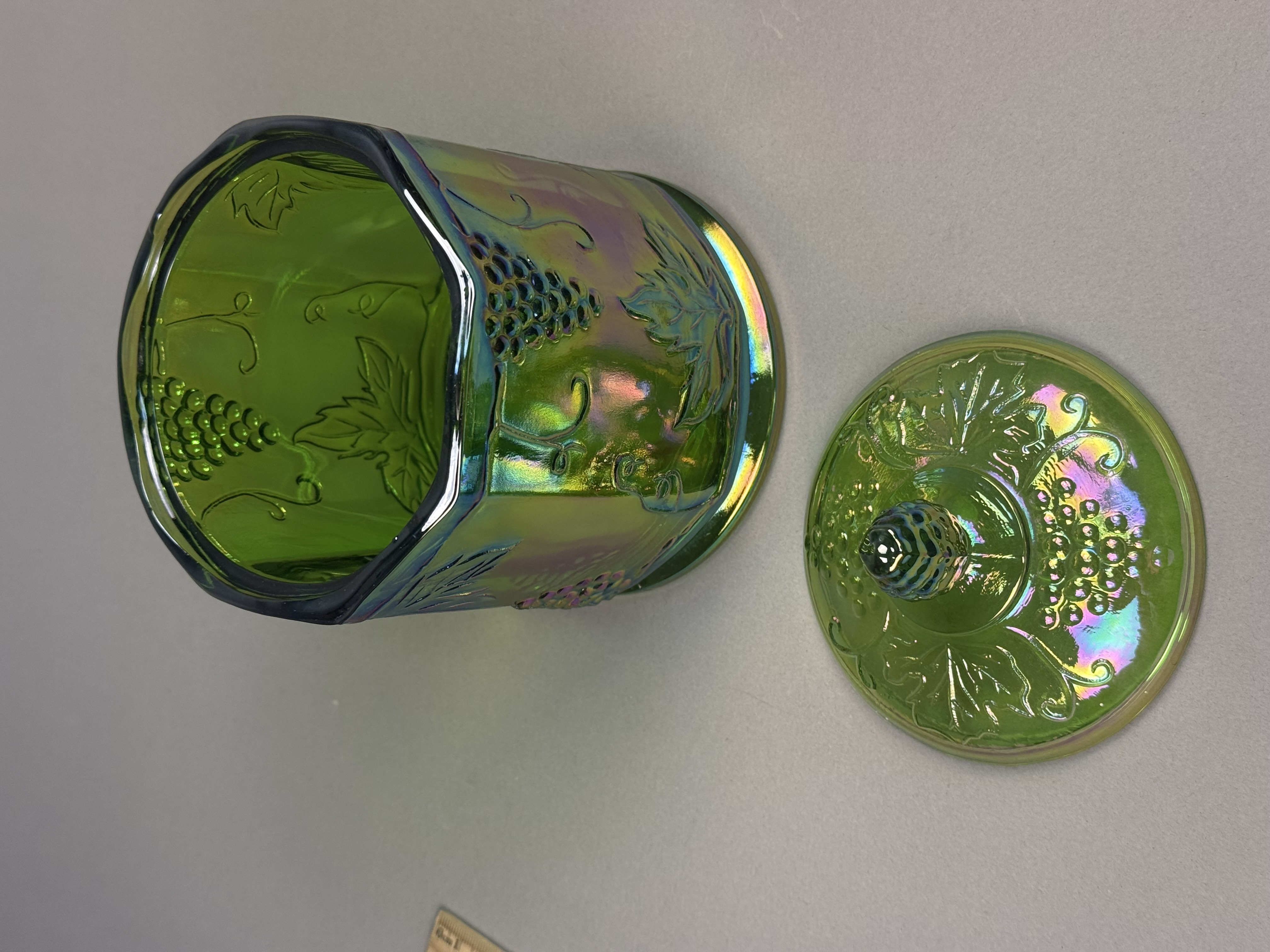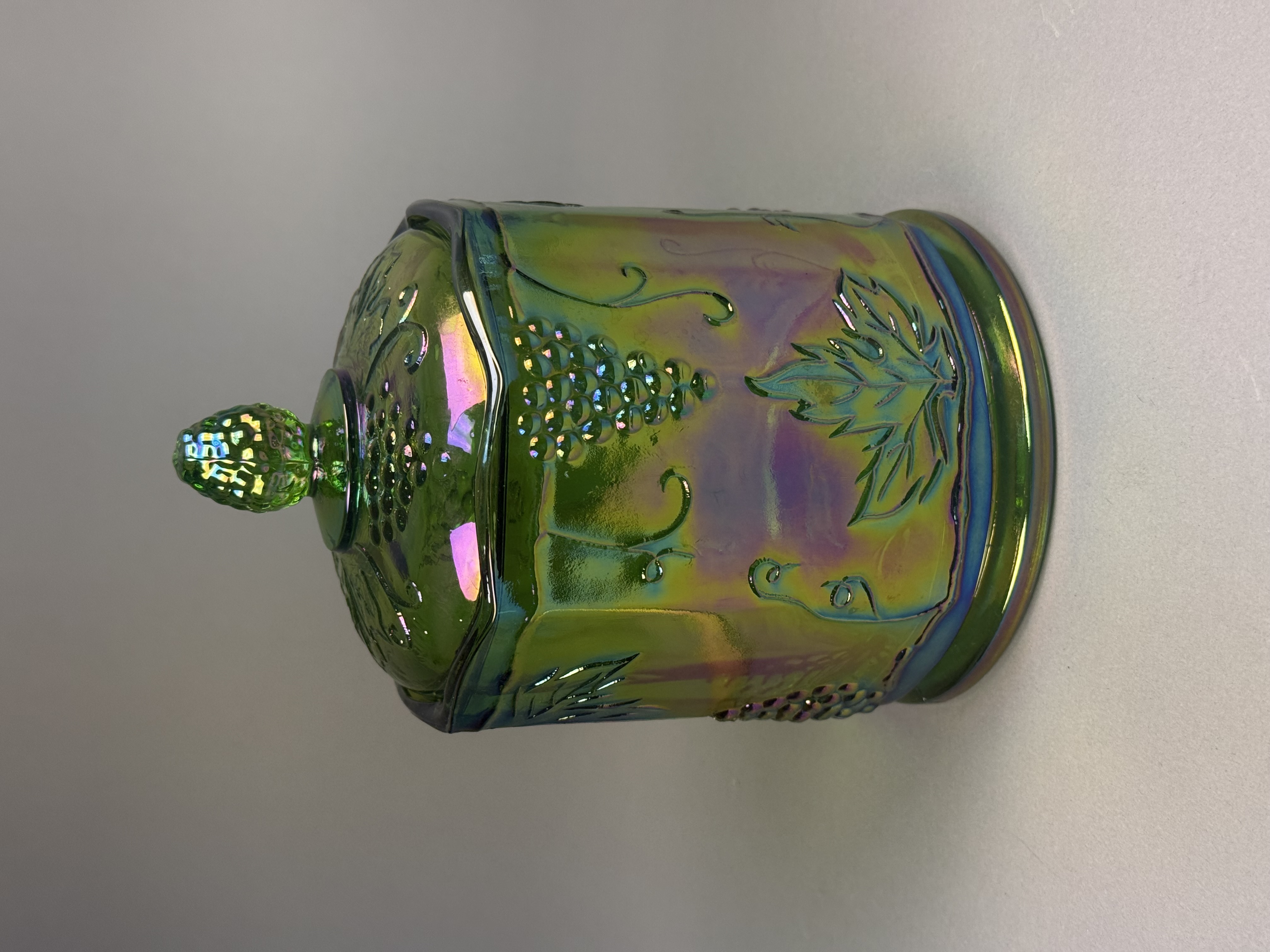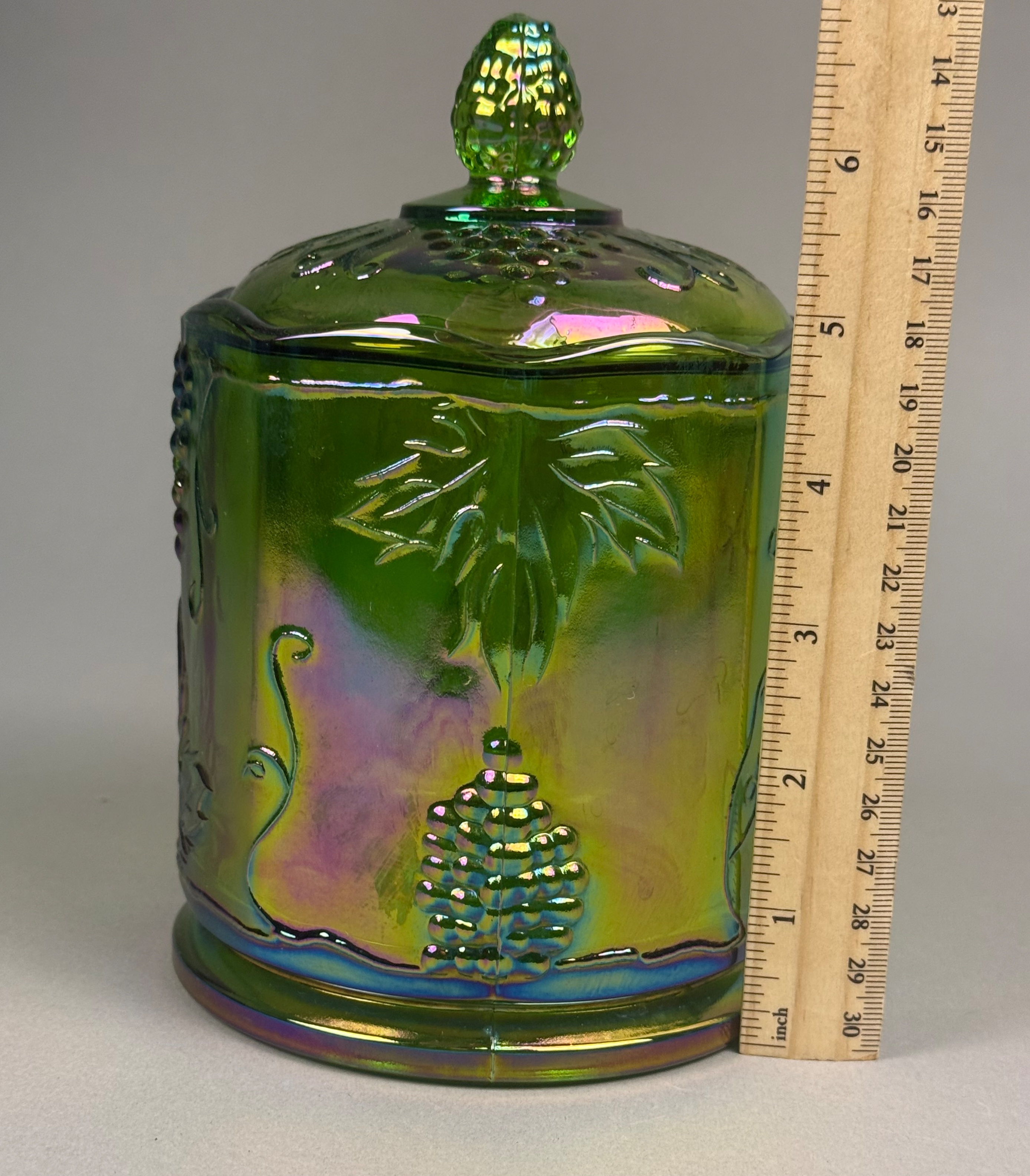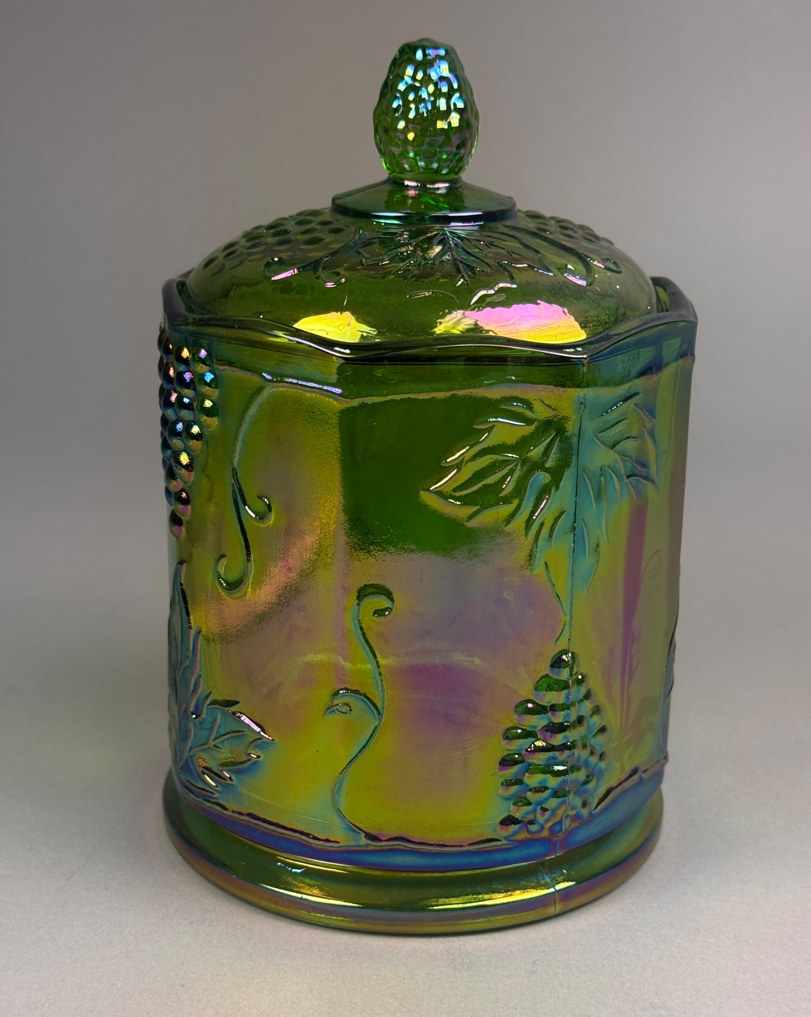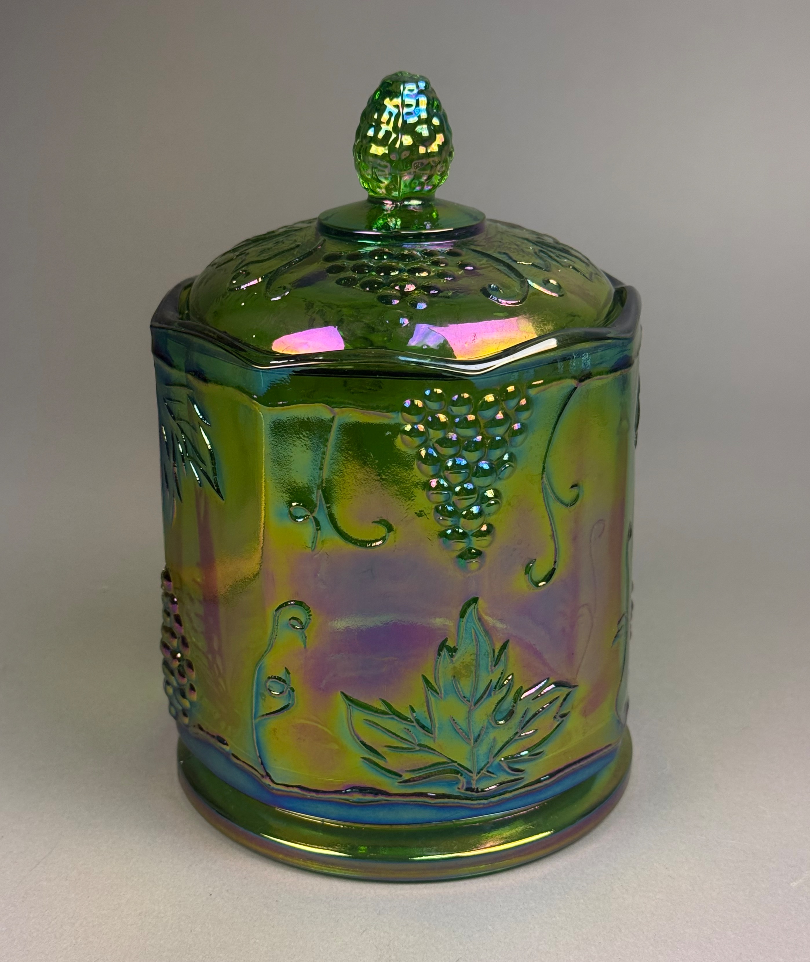 This lidded canister is produced in the Harvest Grape pattern by the Indiana Glass Company. The item is composed of pressed carnival glass with a lime green base color treated with a vivid iridescent finish that reflects tones of magenta, blue, and gold. The body features an octagonal, paneled form decorated with relief-molded grape clusters, large serrated leaves, and curling vine tendrils. The matching lid is topped with a molded finial in the shape of a grape cluster. The construction shows visible mold seams on the body and lid, characteristic of the pressing process. The base is molded and recessed with no pontil mark. Height: 7 inches Diameter: 4.5 inches m is in excellent condition with no visible chips, cracks, or repairs. The iridescent coating is well-preserved with strong color saturation. Minor manufacturing bubbles and mold roughness are present, which are consistent with the production era and technique.