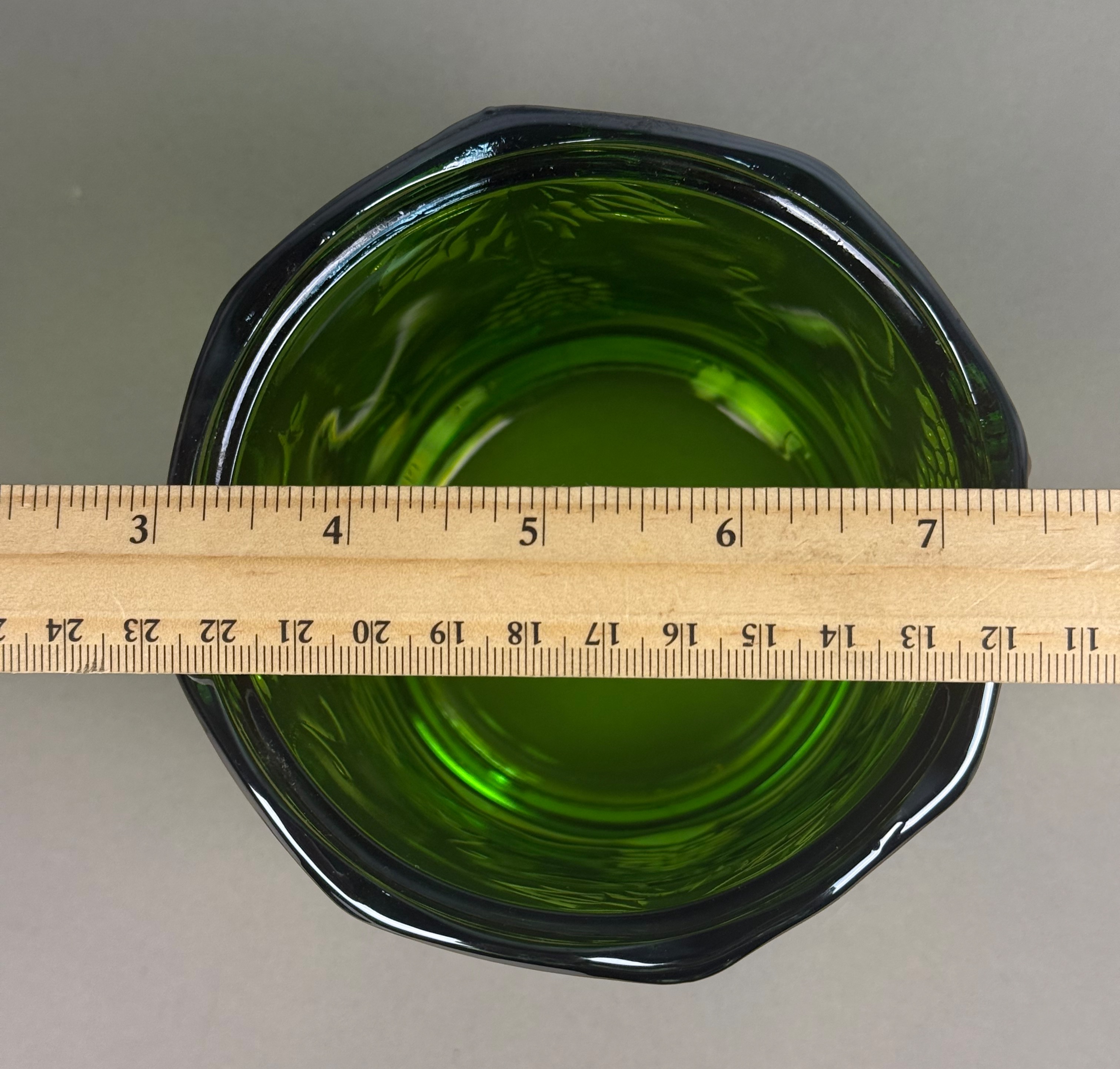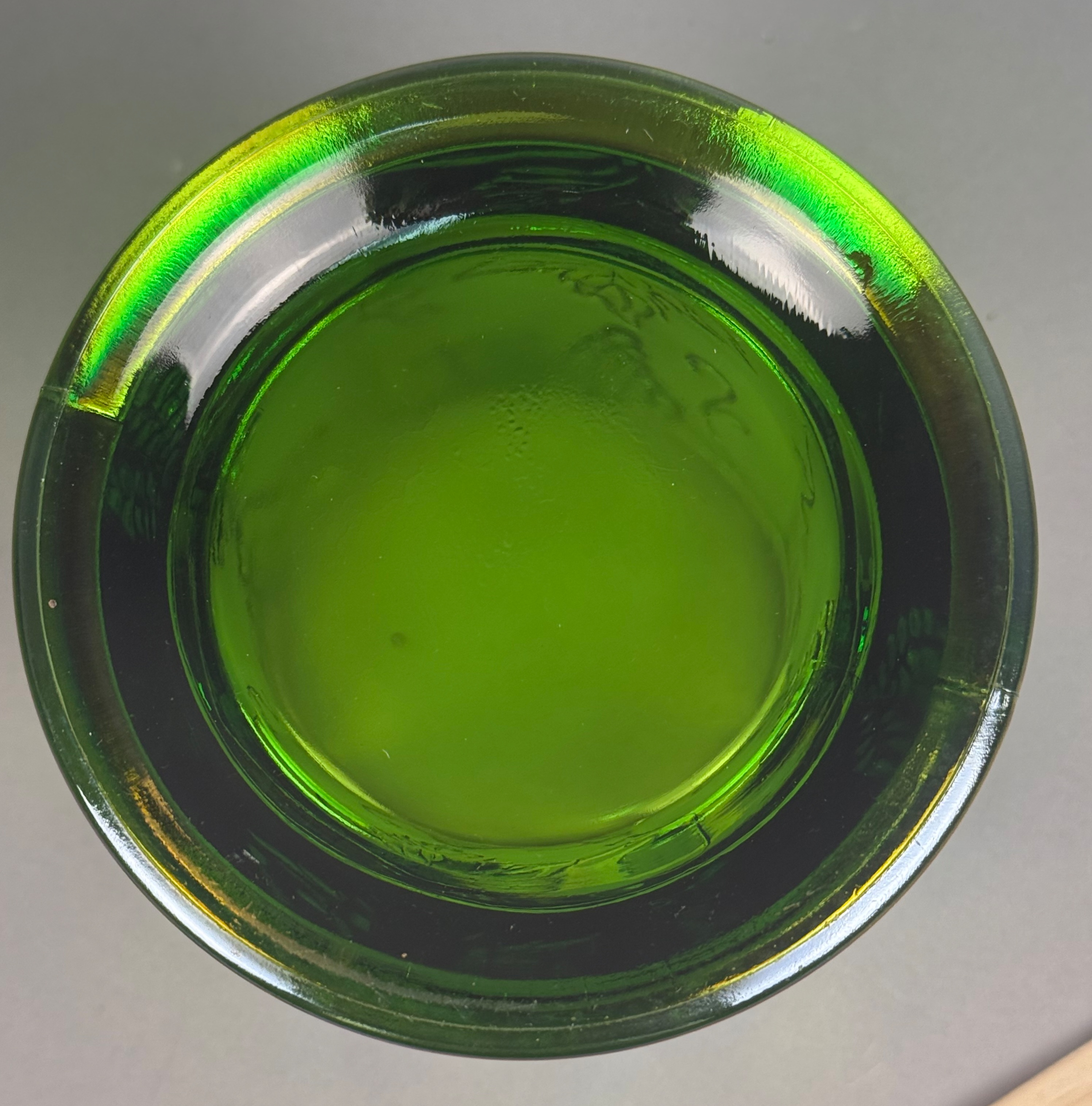The item is in excellent condition with no visible chips, cracks, or repairs. The iridescent coating is well-preserved with strong color saturation. Minor manufacturing bubbles and mold roughness are present, which are consistent with the production era and technique.