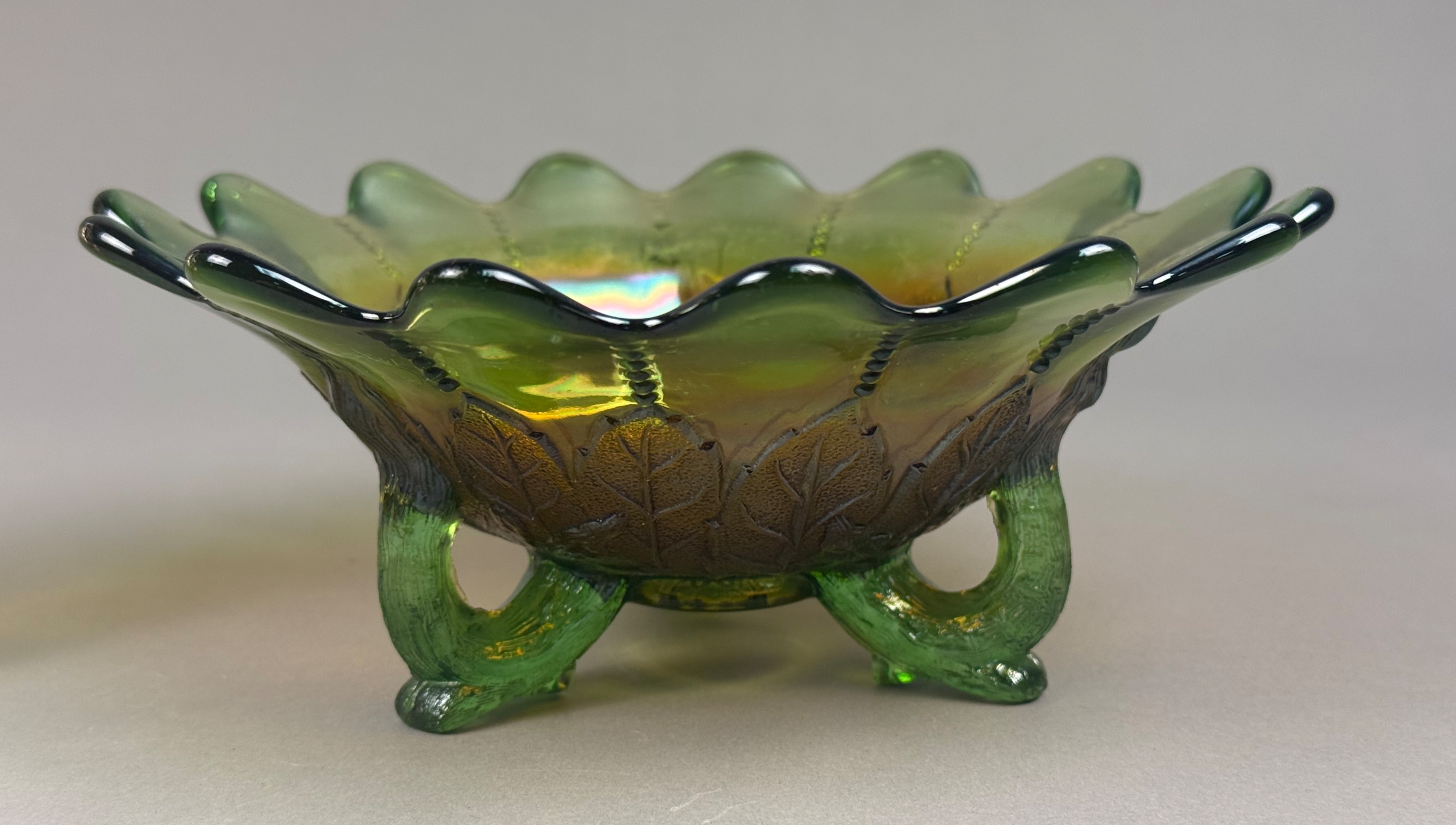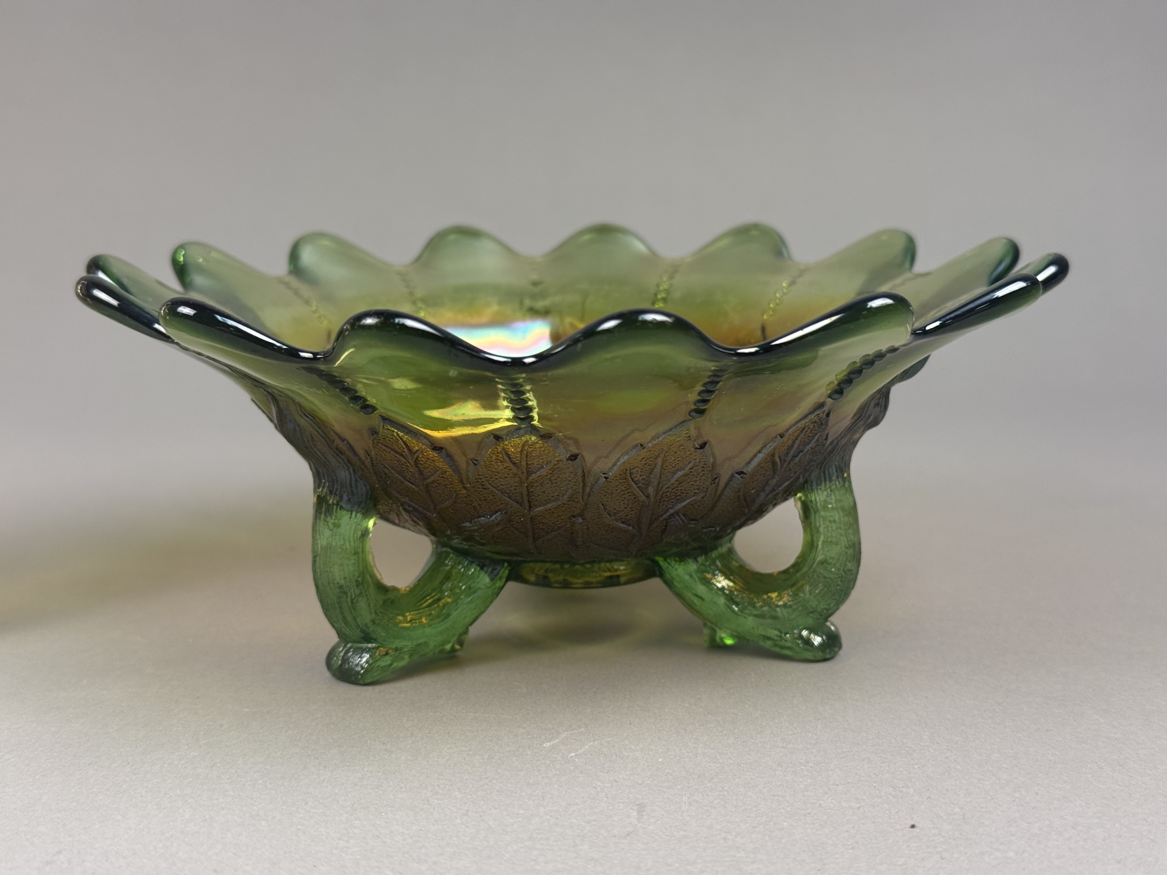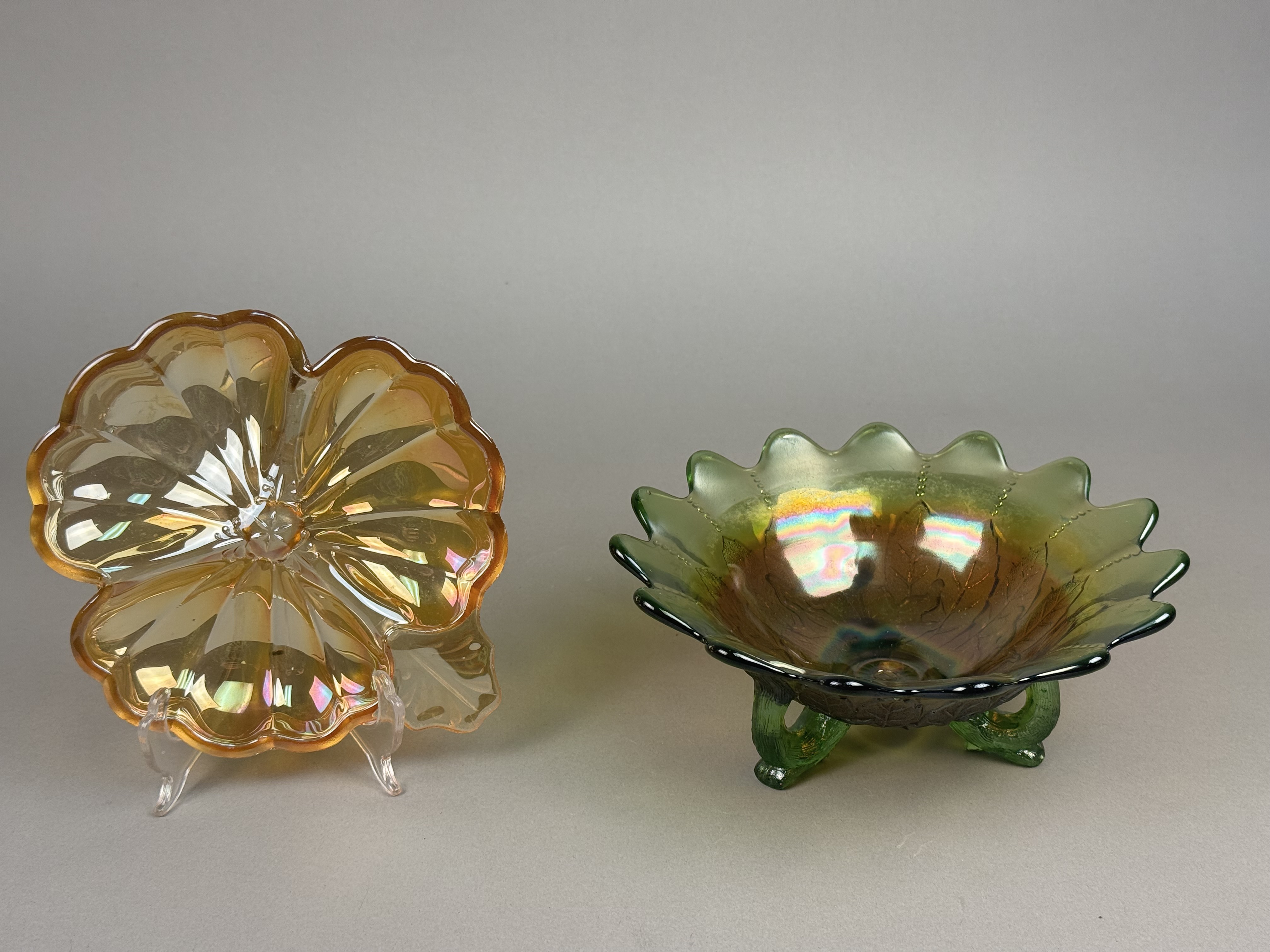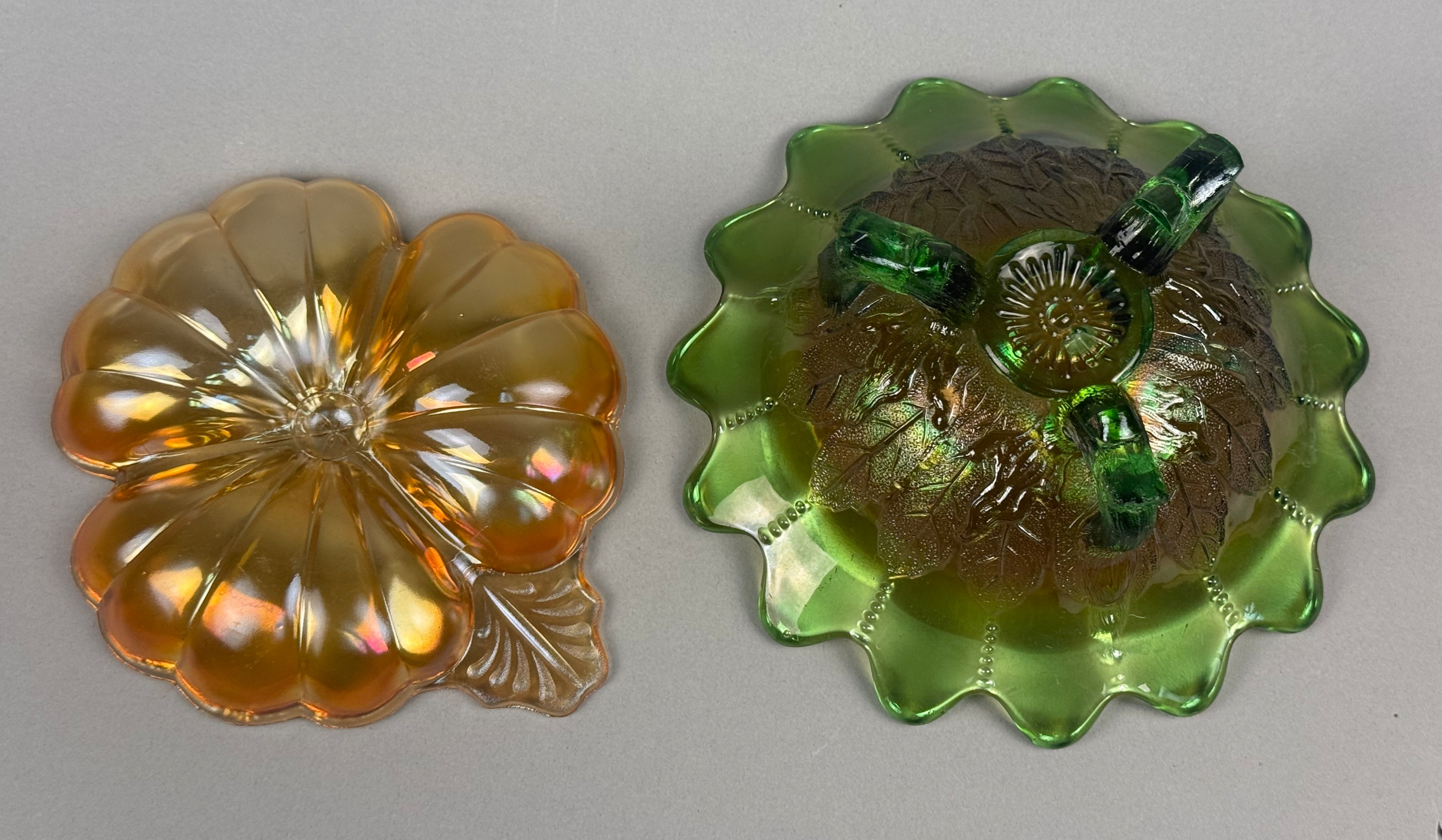 This lot features two pieces of iridescent pressed carnival glass. The first item is a green glass footed bowl featuring an embossed leaf design on the exterior, consistent with the Holly pattern. The bowl is supported by three scrolled twig feet and features a wide scalloped rim with a stippled beaded line design on the interior. The second item is a marigold iridescent dish shaped as a stylized flower with a single integral leaf handle. This piece is attributed to the Fenton Art Glass Company in the Pansy pattern. Both items are produced using pressed glass techniques with an applied iridescent finish that creates a multi-colored metallic sheen. Neither piece possesses a pontil mark, as is characteristic of pressed glass. Green bowl: 7.5 inches in diameter Marigold dish: 8 inches in width Both pieces are in good condition with no visible chips, cracks, or repairs. The iridescent finishes remain vibrant across both items.