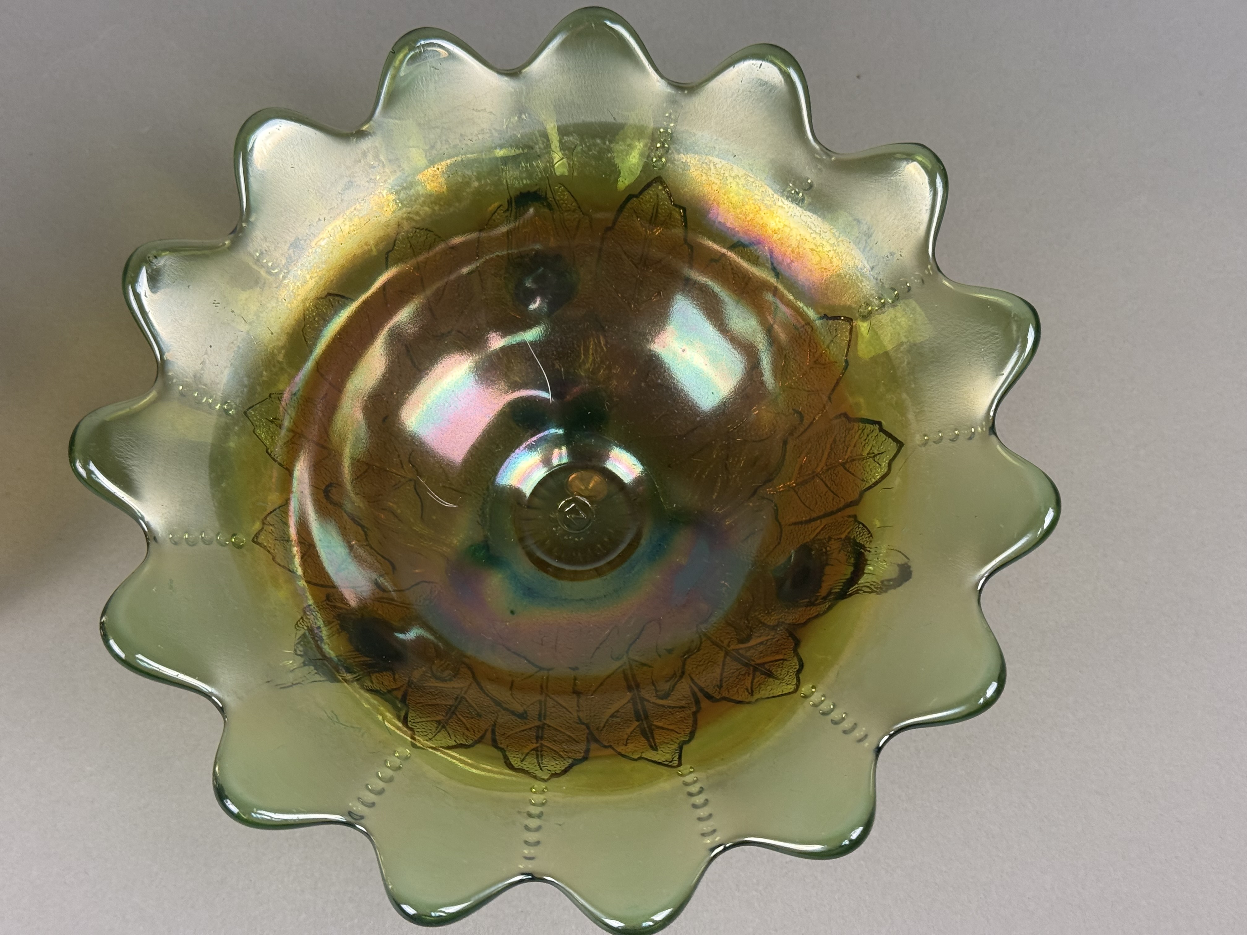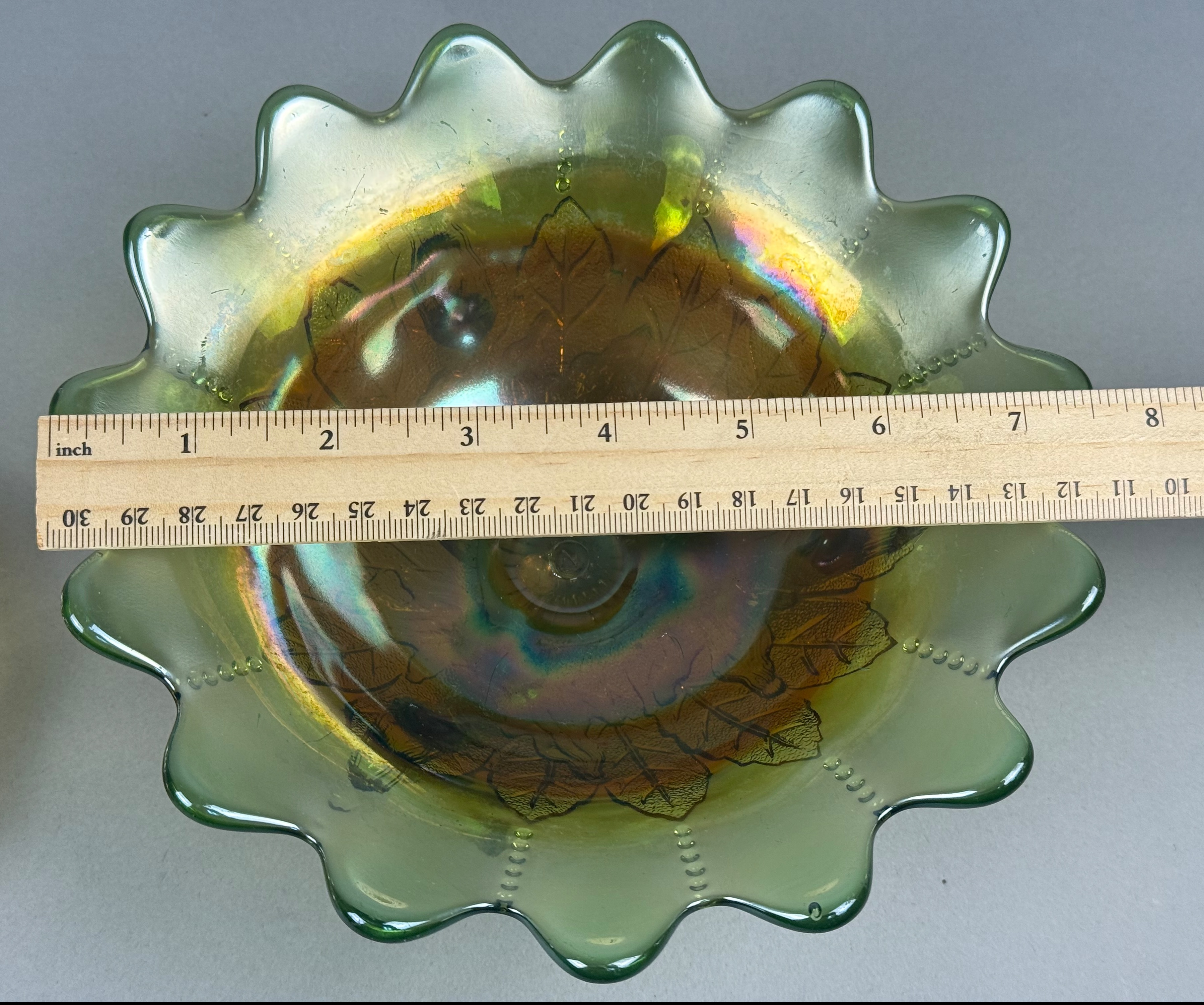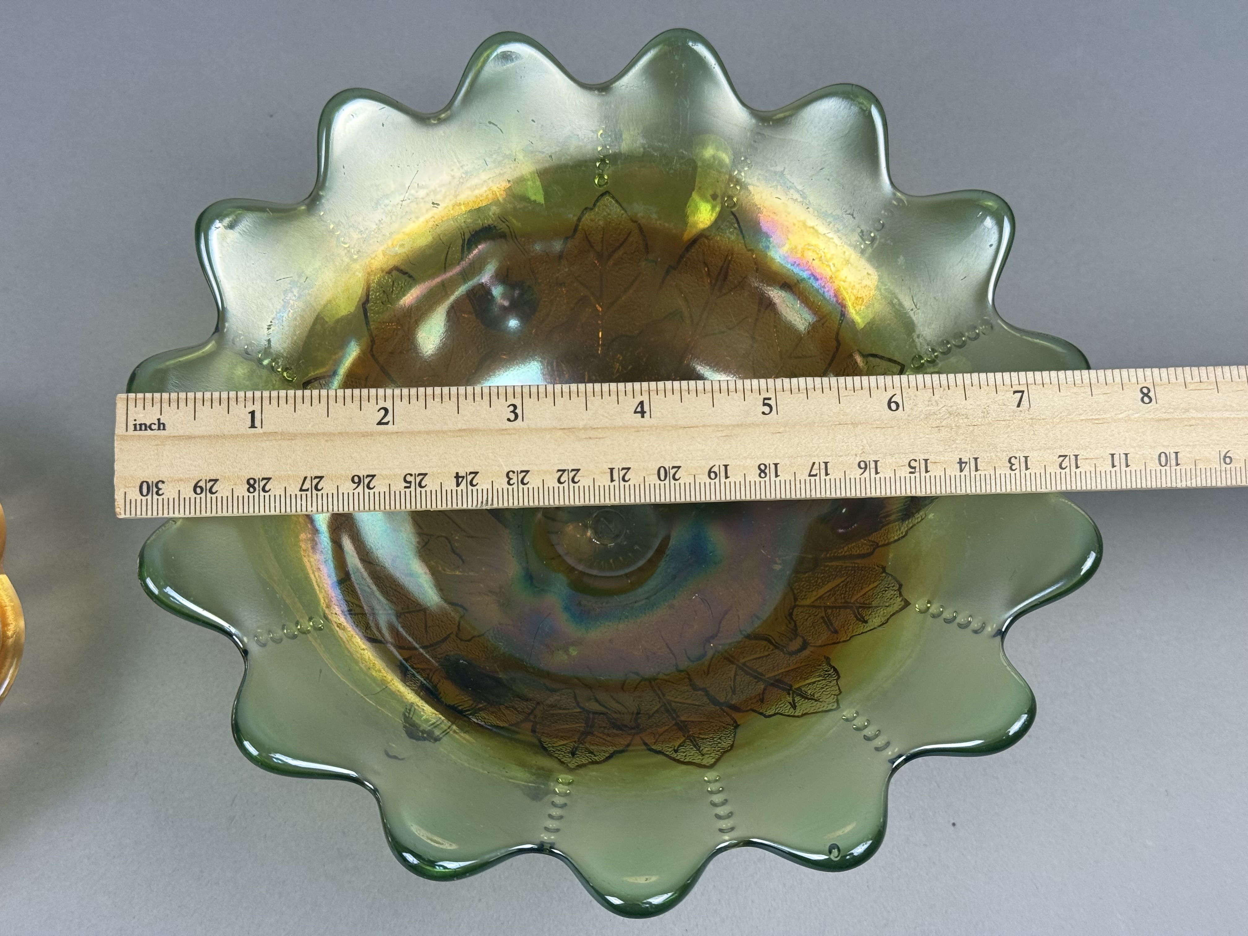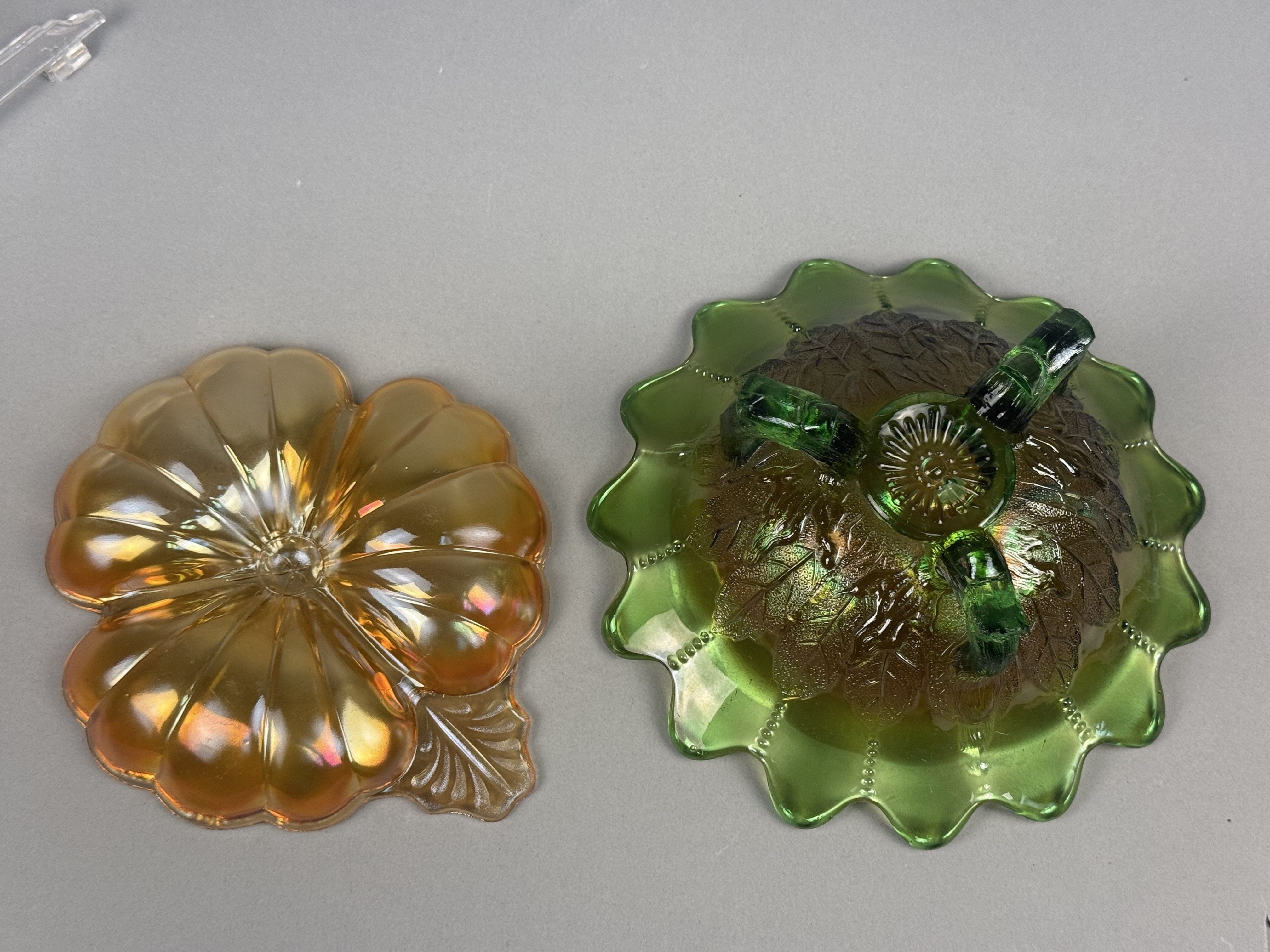 This lot features two pieces of iridescent pressed carnival glass. The first item is a green glass footed bowl featuring an embossed leaf design on the exterior, consistent with the Holly pattern. The bowl is supported by three scrolled twig feet and features a wide scalloped rim with a stippled beaded line design on the interior. The second item is a marigold iridescent dish shaped as a stylized flower with a single integral leaf handle. This piece is attributed to the Fenton Art Glass Company in the Pansy pattern. Both items are produced using pressed glass techniques with an applied iridescent finish that creates a multi-colored metallic sheen. Neither piece possesses a pontil mark, as is characteristic of pressed glass. Green bowl: 7.5 inches in diameter Marigold dish: 8 inches in width Both pieces are in good condition with no visible chips, cracks, or repairs. The iridescent finishes remain vibrant across both items.