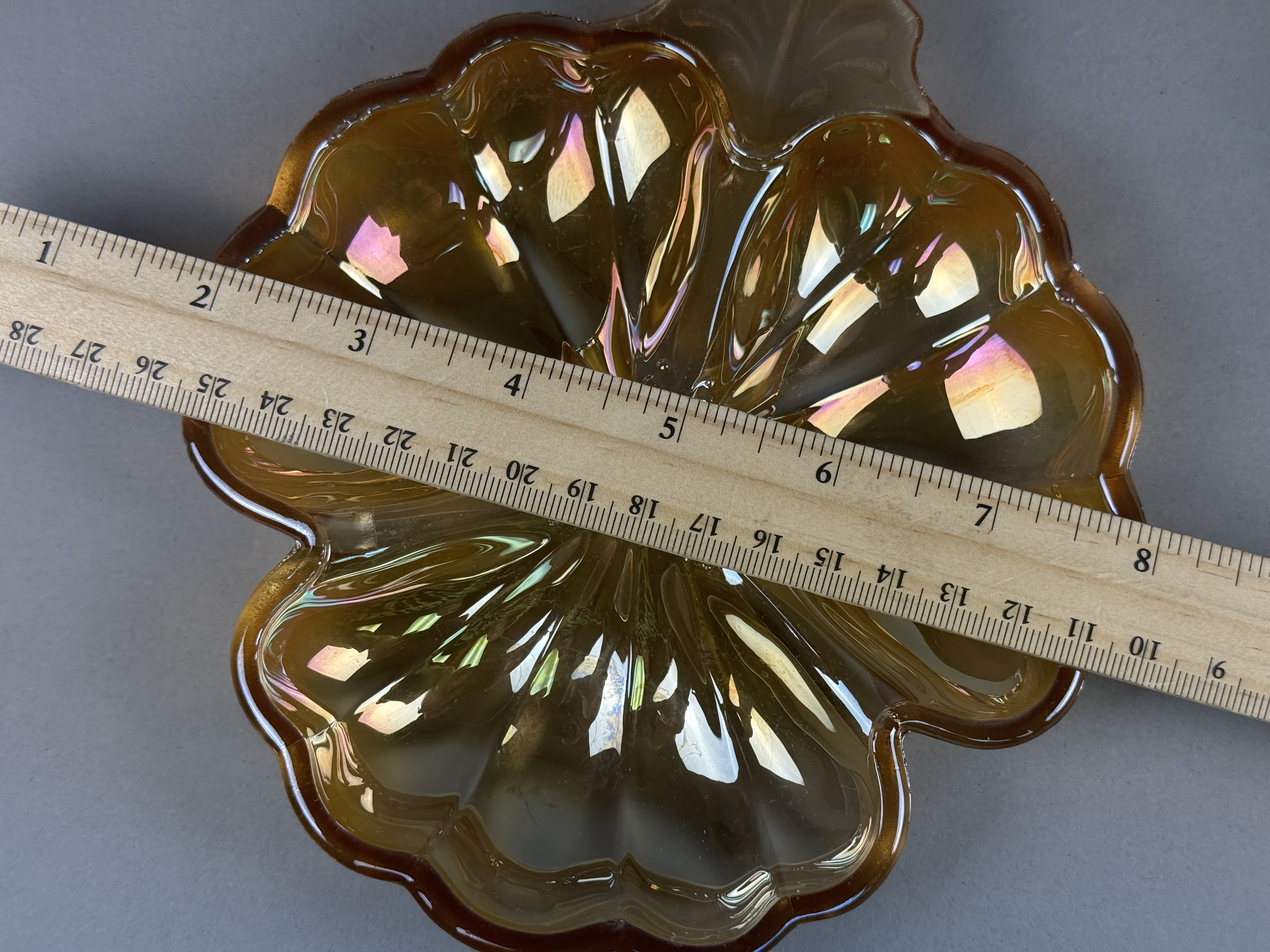 Both pieces are in good condition with no visible chips, cracks, or repairs. The iridescent finishes remain vibrant across both items.