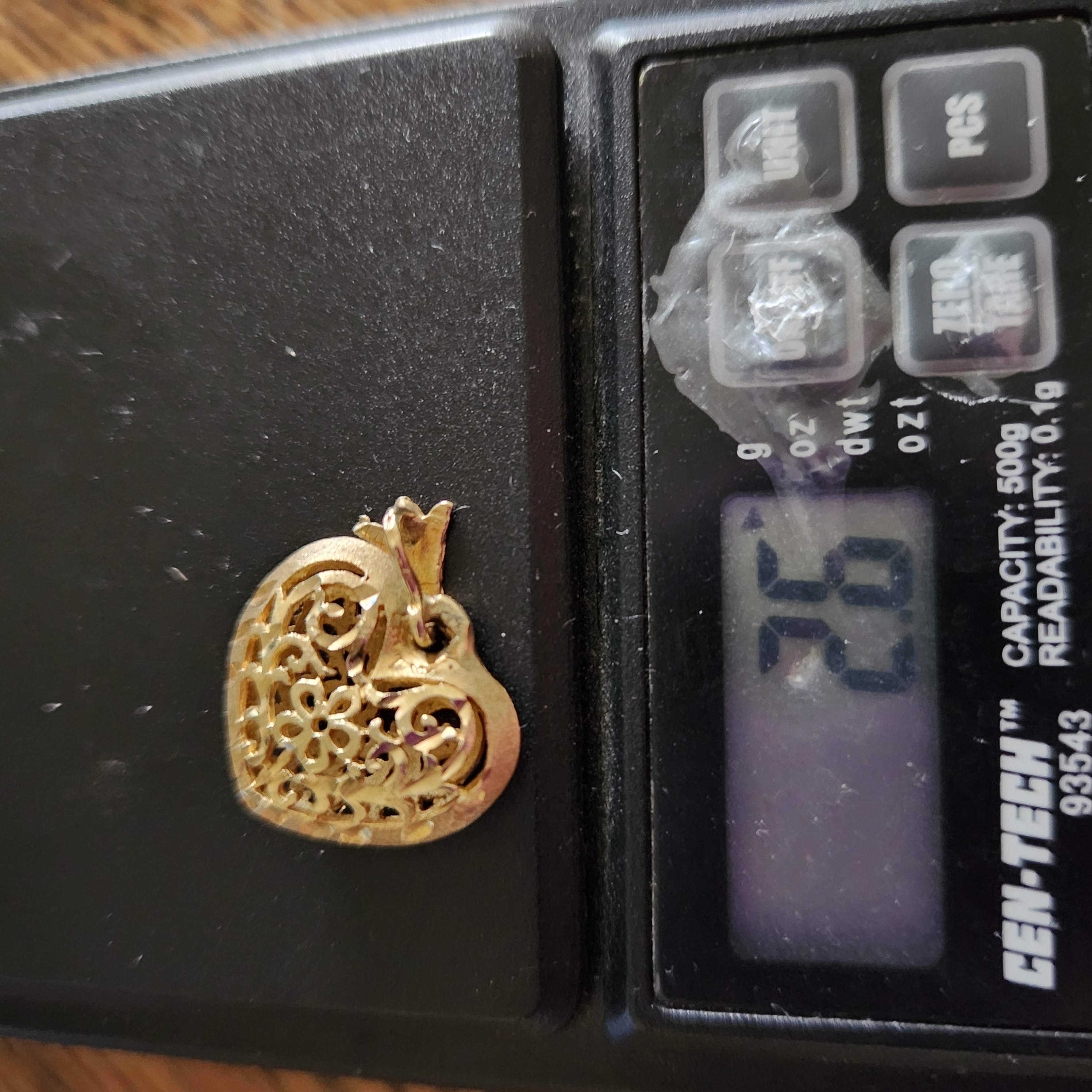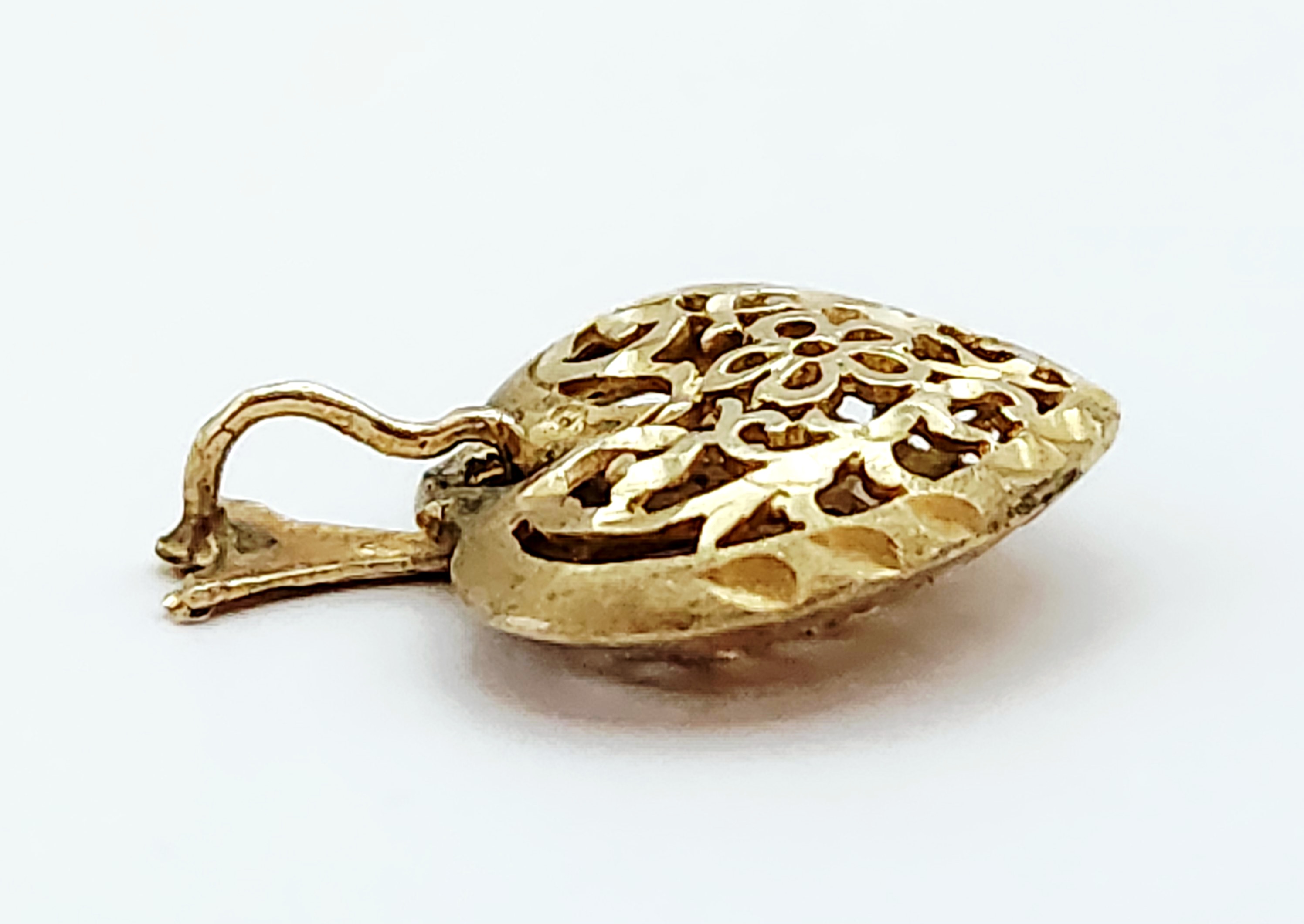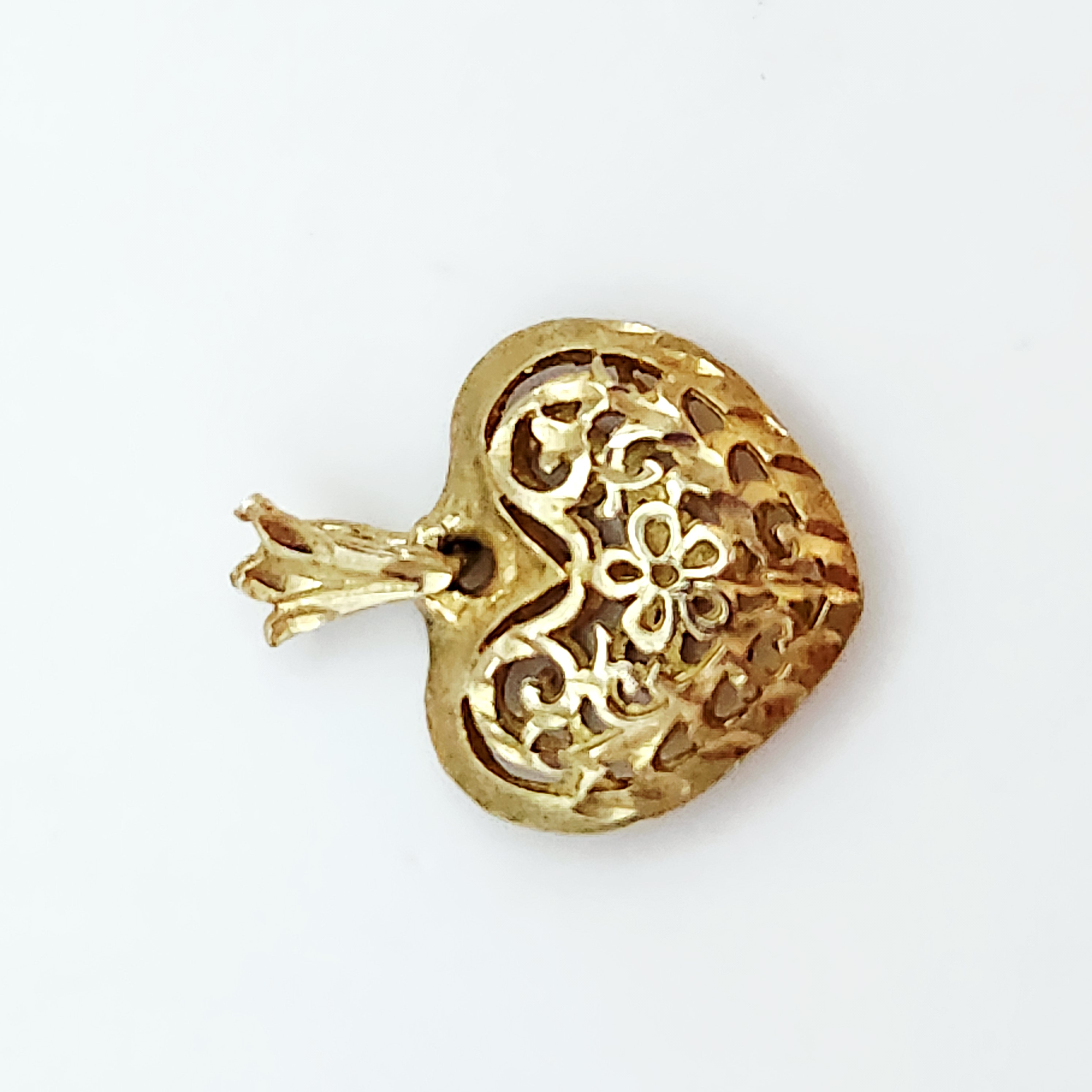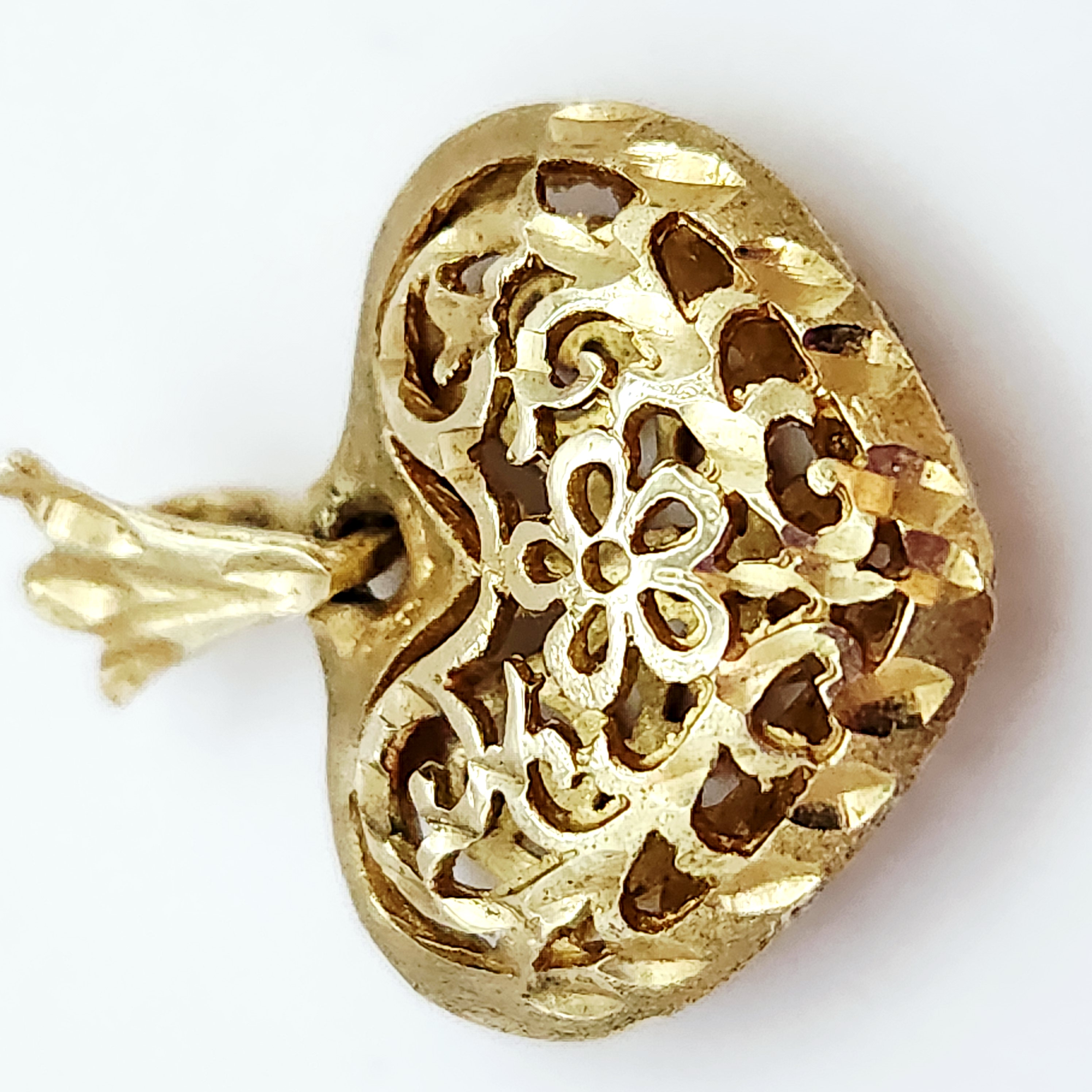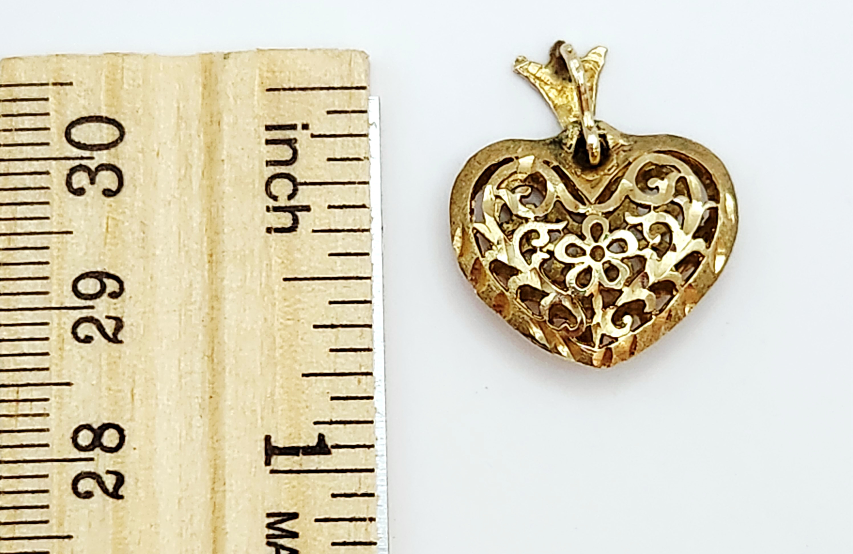This item is crafted in 10 karat yellow gold and features a hollow, puffed heart pendant. The heart is decorated with an intricate openwork filigree design centered around a stylized four-petal flower motif. The piece is suspended from a hinged lever-back closure. The hallmark is illegible, pendant acid tested 10K.