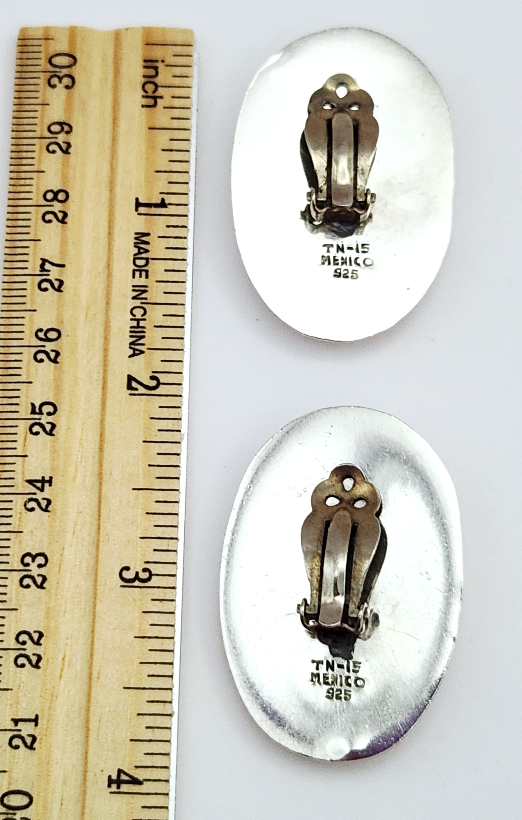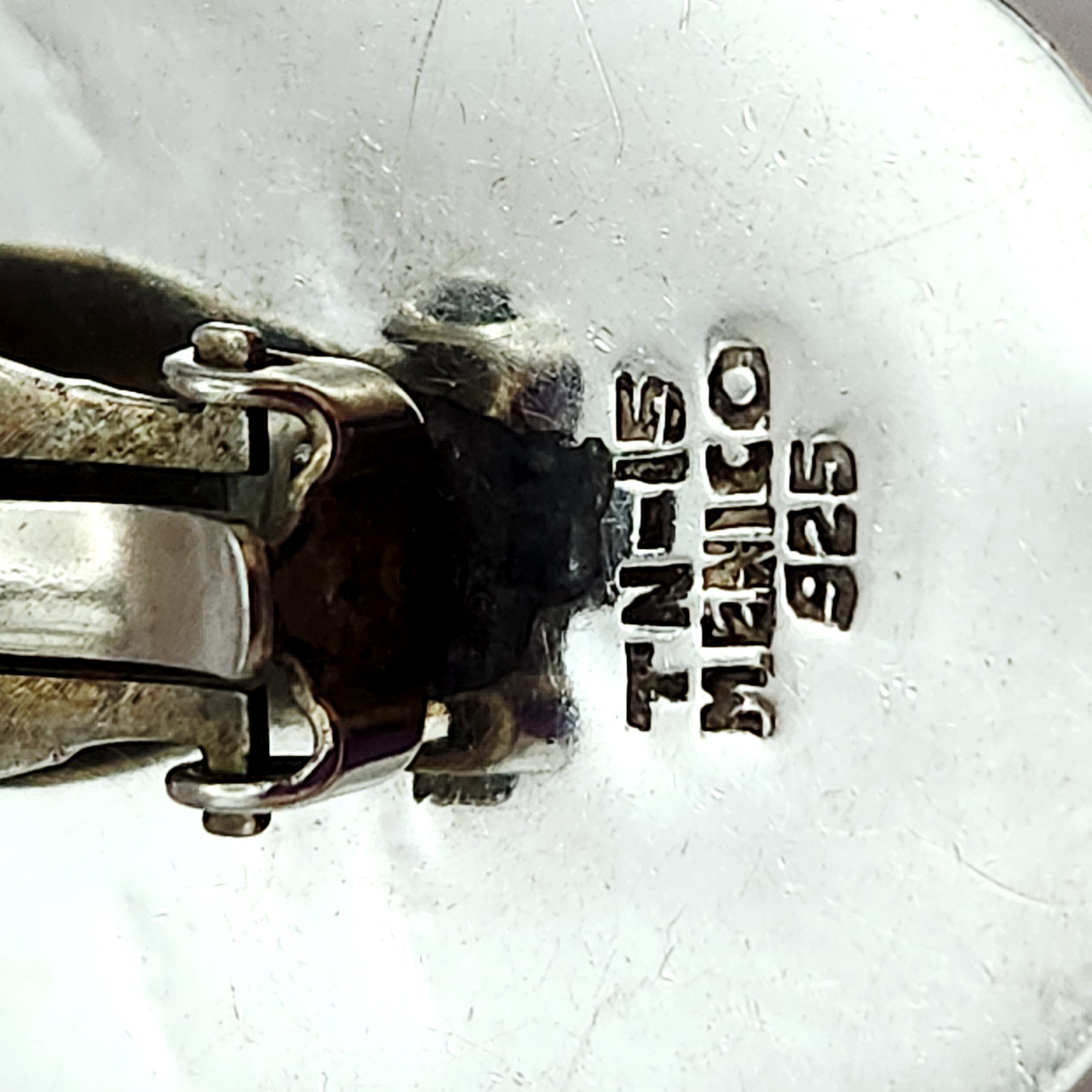 Hallmarked TN-15, MEXICO, and 925. The TN-15 registration mark indicates production in Taxco, Mexico, by a registered silversmith under the alphanumeric system implemented circa 1979. Oval convex form with partial linear ribbing.
