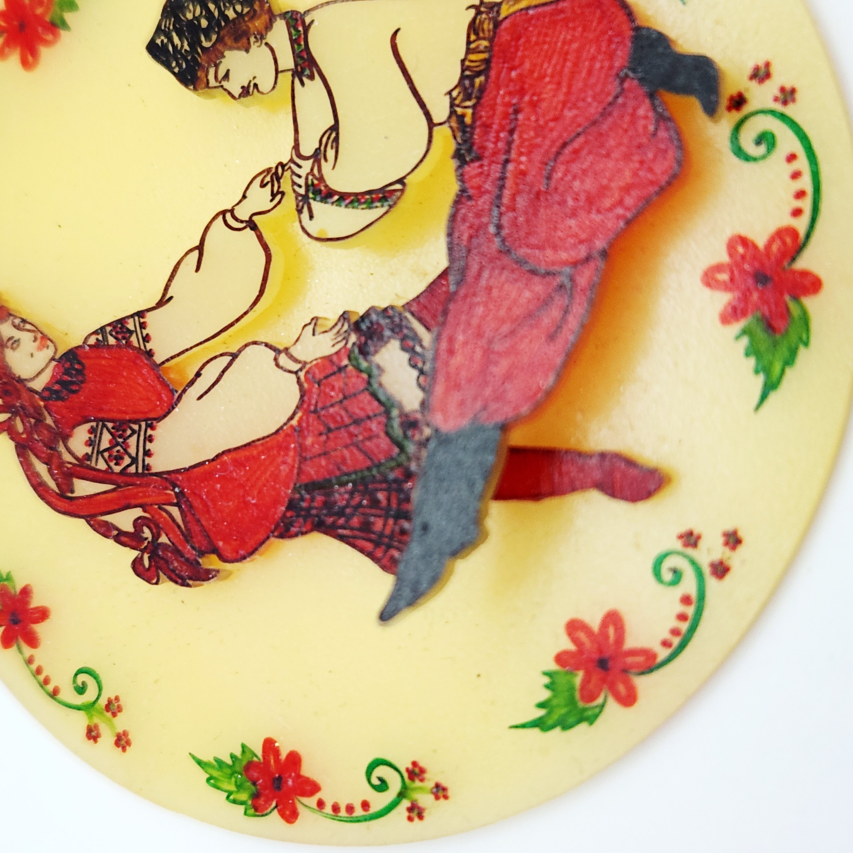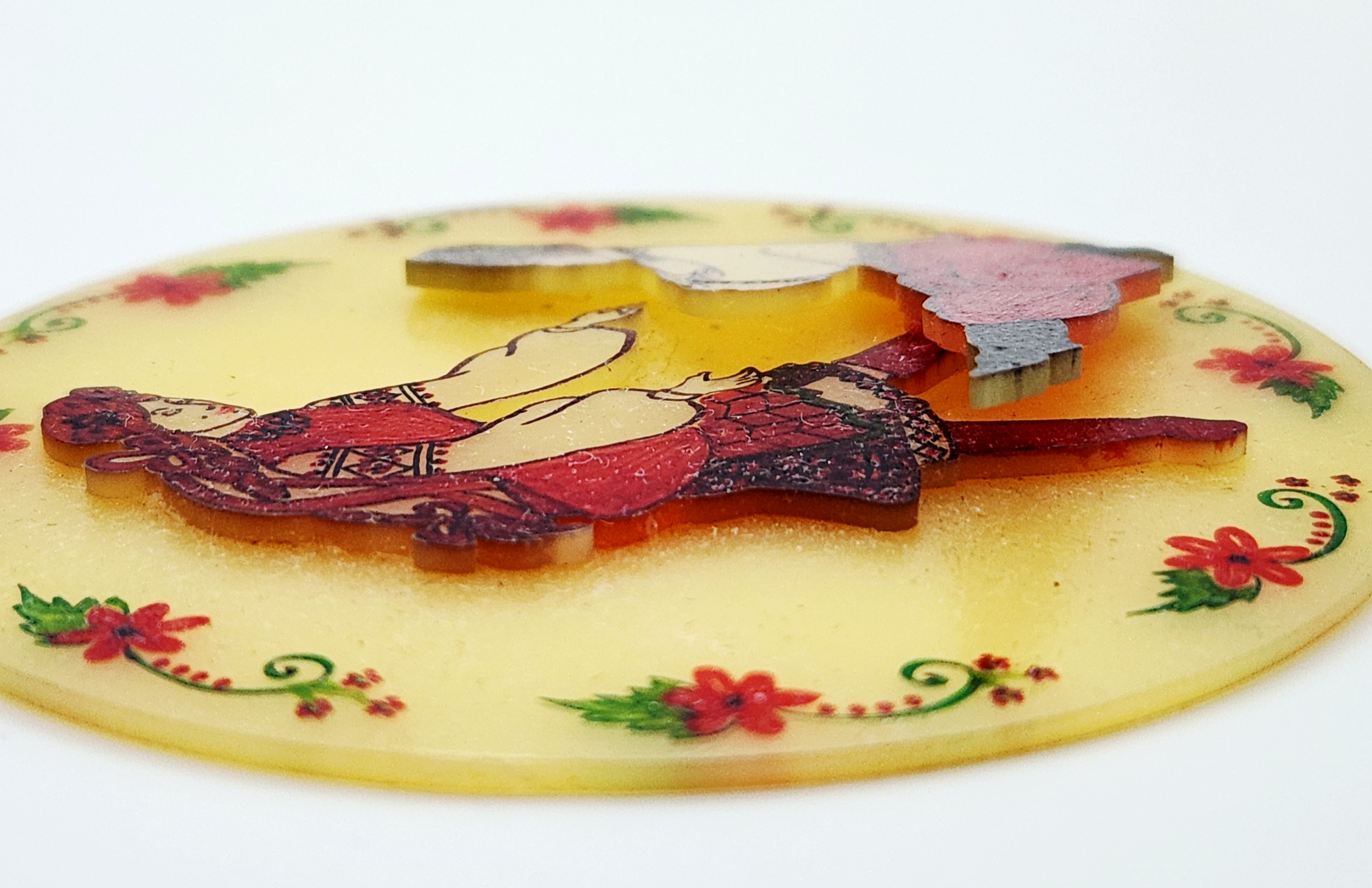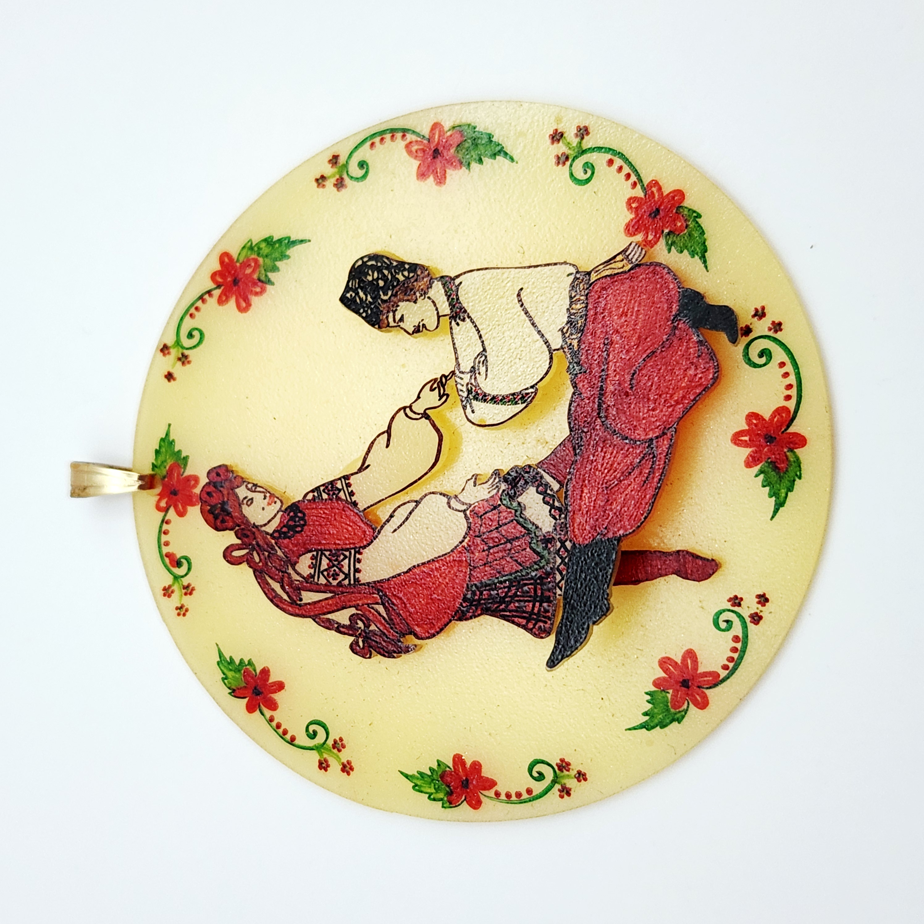 This large circular pendant is constructed from a translucent, pale-yellow resinous material. The face of the piece features an applied, three-dimensional central relief depicting a male and female figure in traditional folk attire, detailed with red, black, and white pigments. This central scene is enclosed by a decorative painted border of red flowers and green foliate scrolls. The pendant is fitted with a simple, polished yellow-metal bail for suspension. The metal appears to be a non-precious base metal as no hallmarks, maker’s marks, or purity stamps are visible on the bail or the body of the piece. The reverse highlights the translucent nature of the material. The style is indicative of mid-20th century folk art costume jewelry. Measurements: approximately 3 inches in diameter.