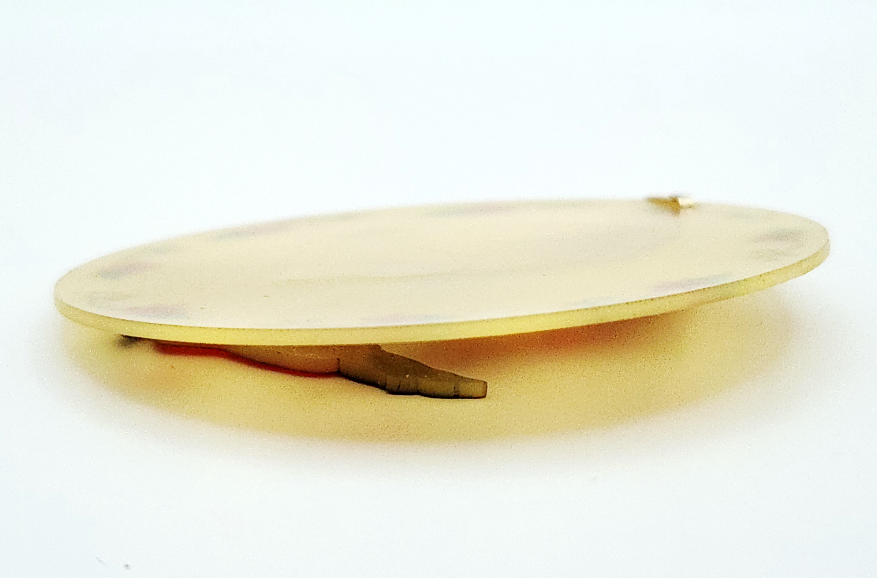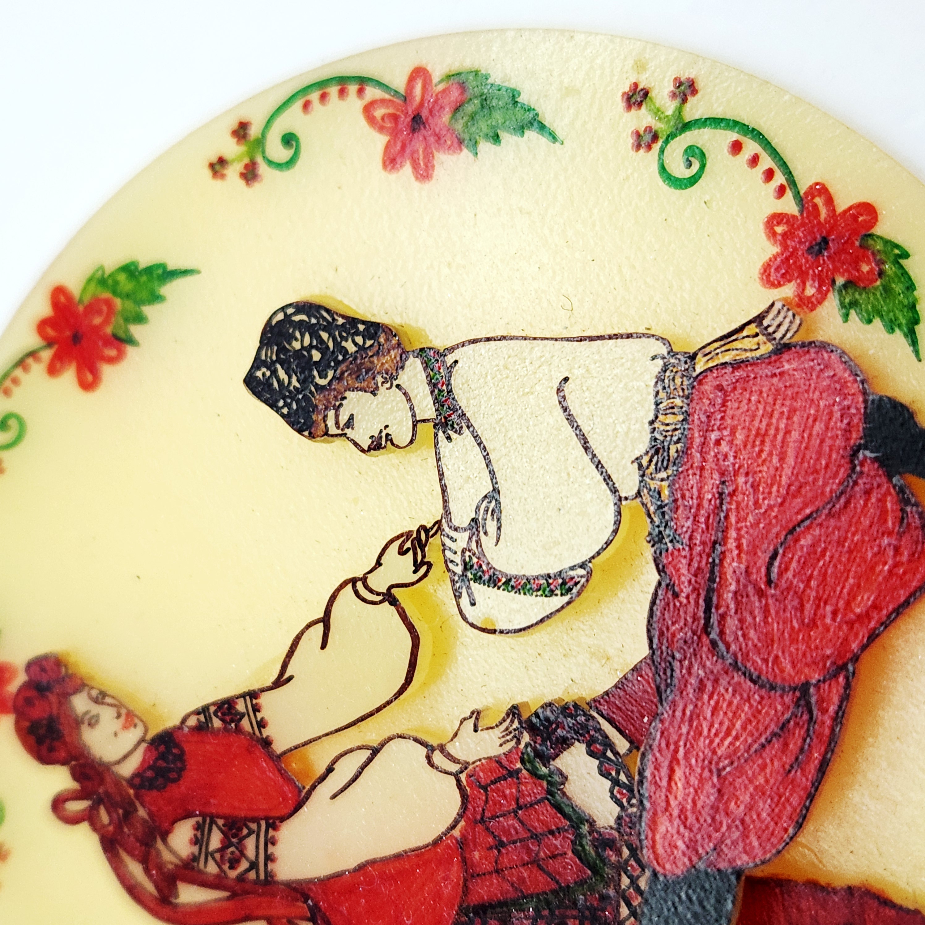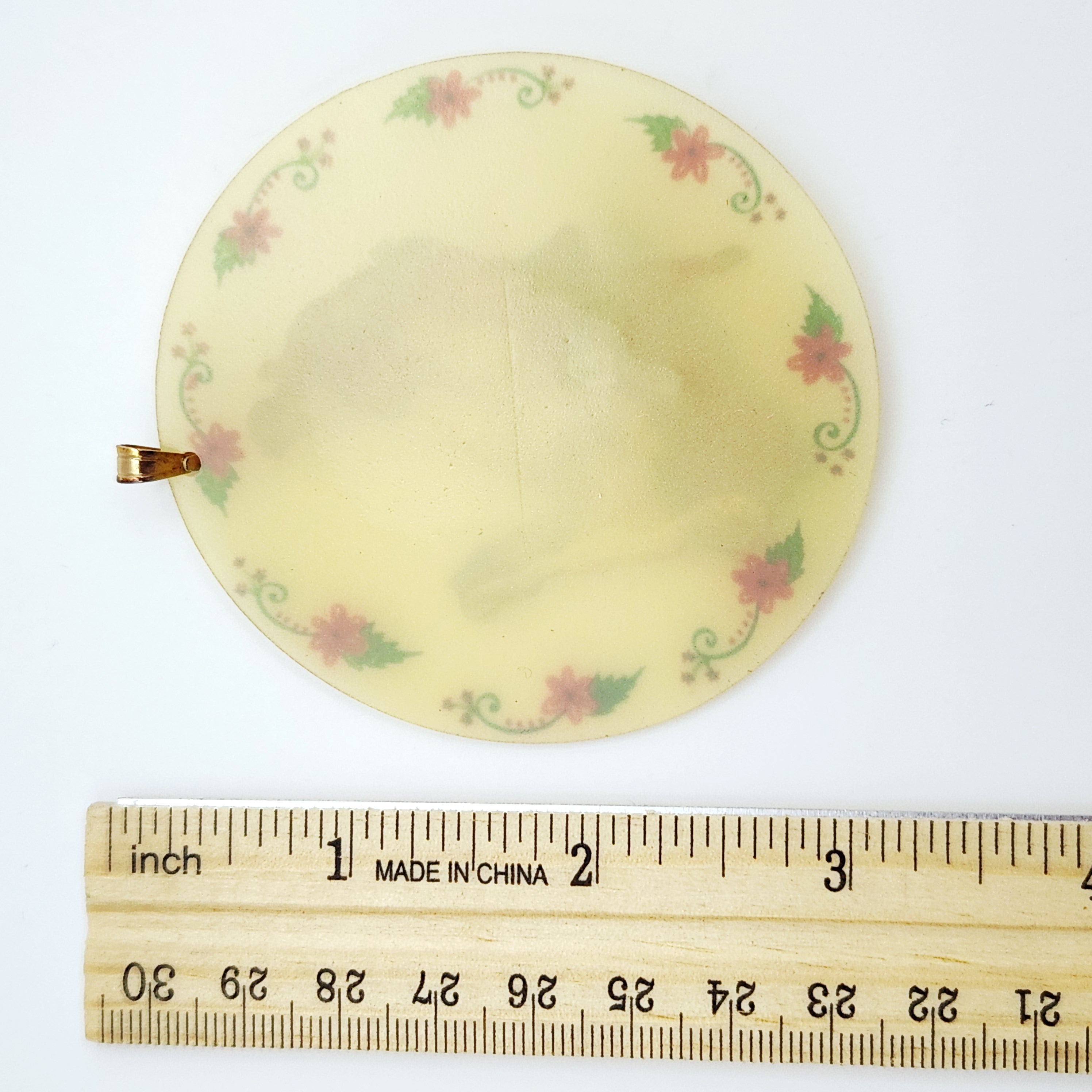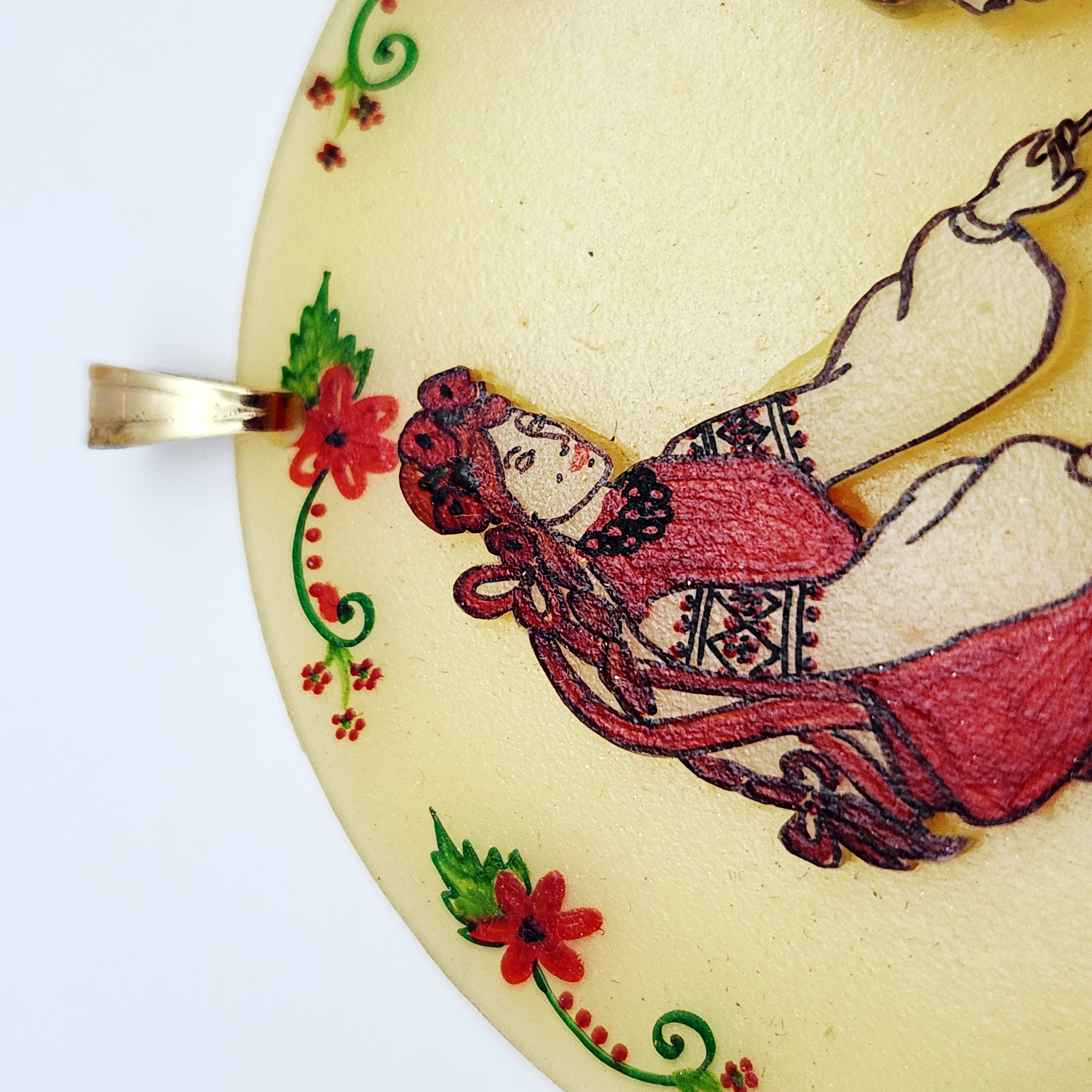 This large circular pendant is constructed from a translucent, pale-yellow resinous material. The face of the piece features an applied, three-dimensional central relief depicting a male and female figure in traditional folk attire, detailed with red, black, and white pigments. This central scene is enclosed by a decorative painted border of red flowers and green foliate scrolls. The pendant is fitted with a simple, polished yellow-metal bail for suspension. The metal appears to be a non-precious base metal as no hallmarks, maker’s marks, or purity stamps are visible on the bail or the body of the piece. The reverse highlights the translucent nature of the material. The style is indicative of mid-20th century folk art costume jewelry. Measurements: approximately 3 inches in diameter.