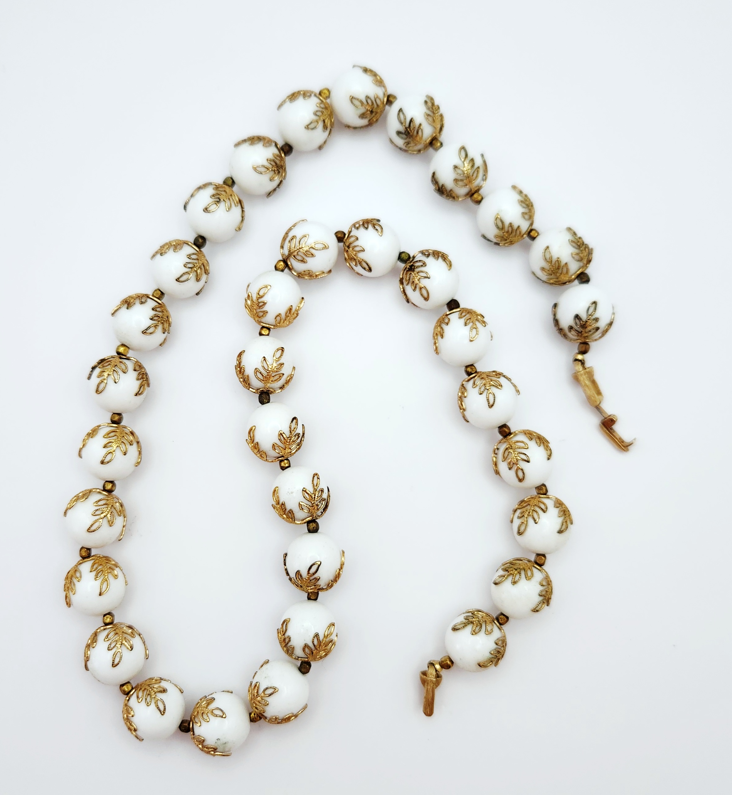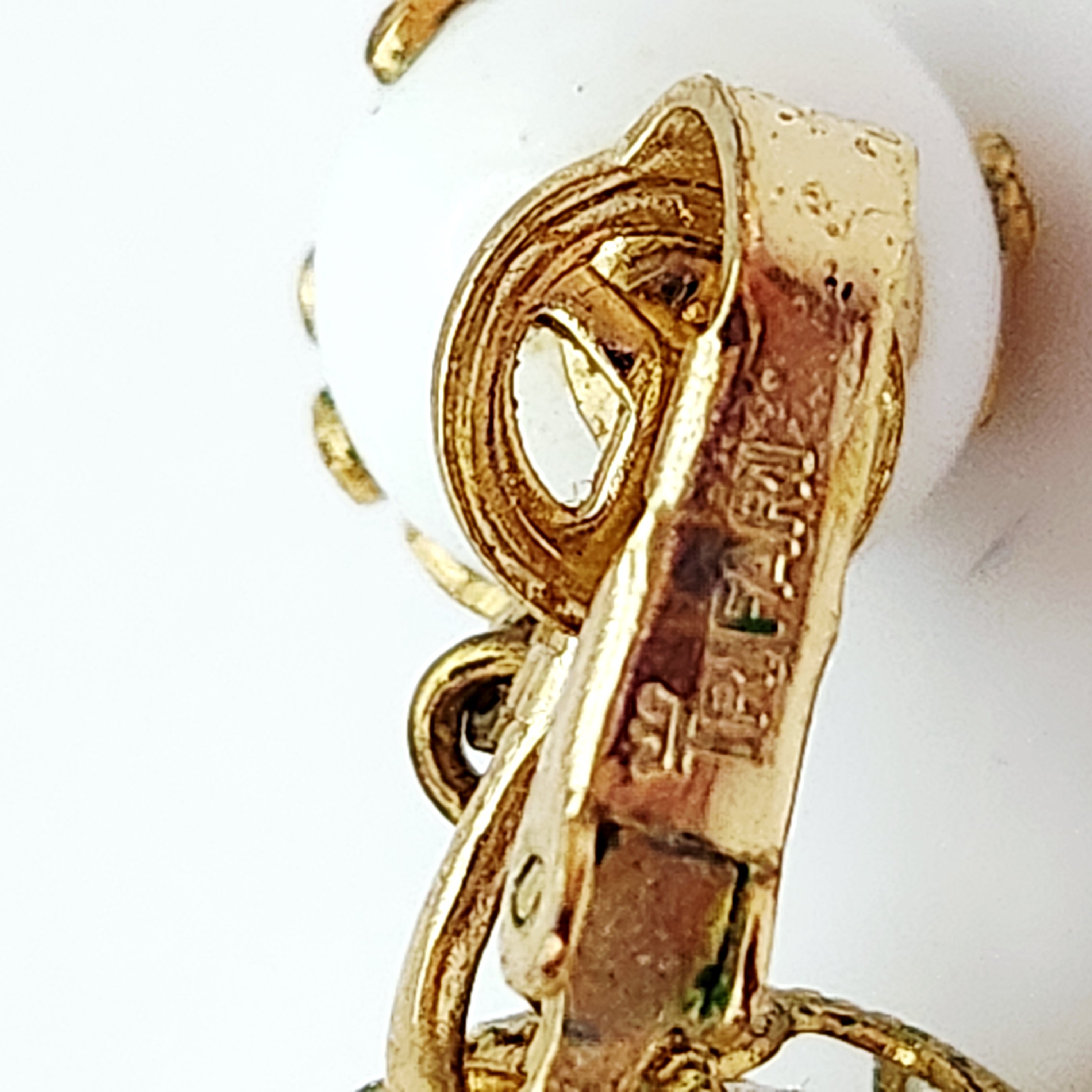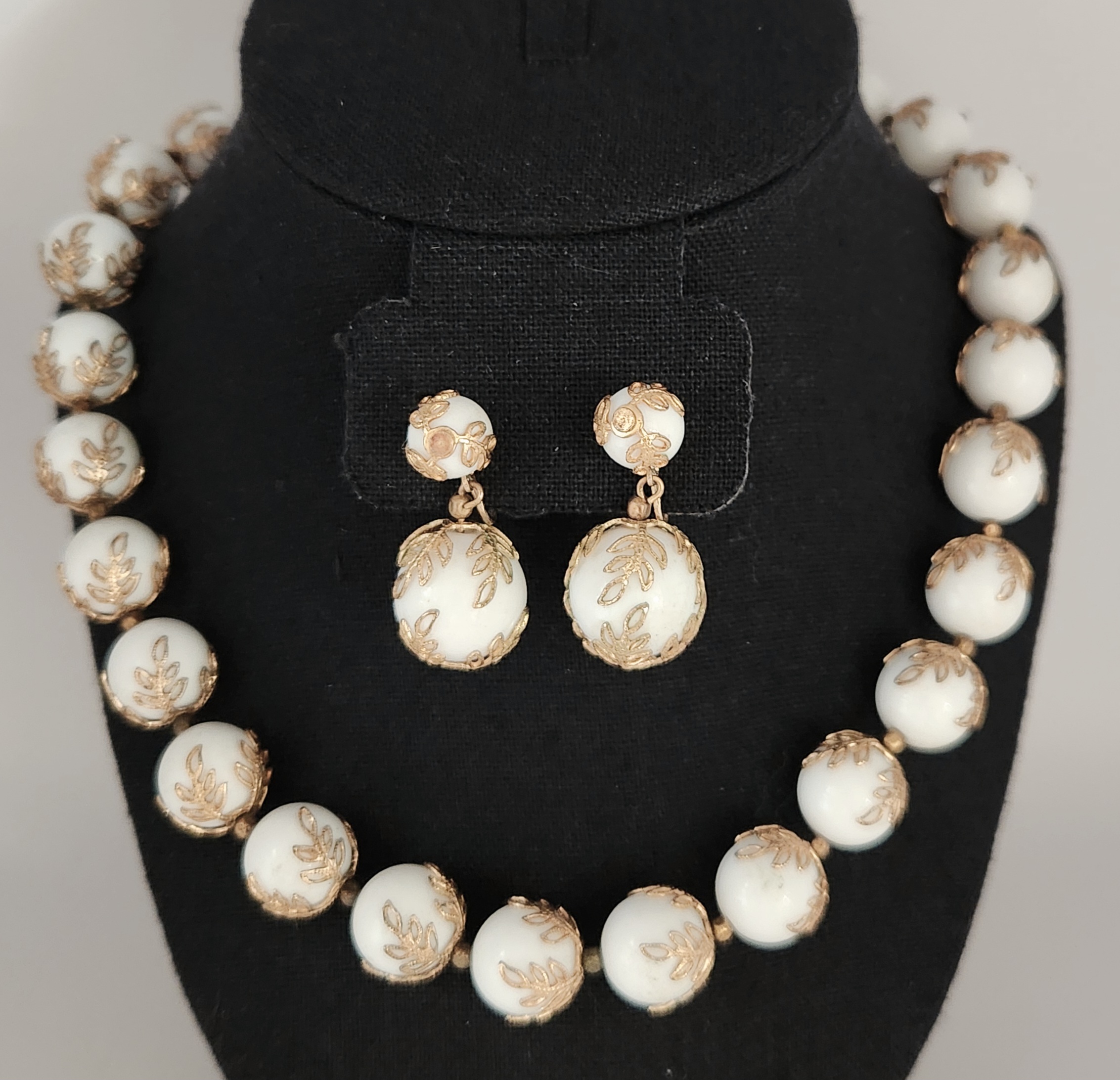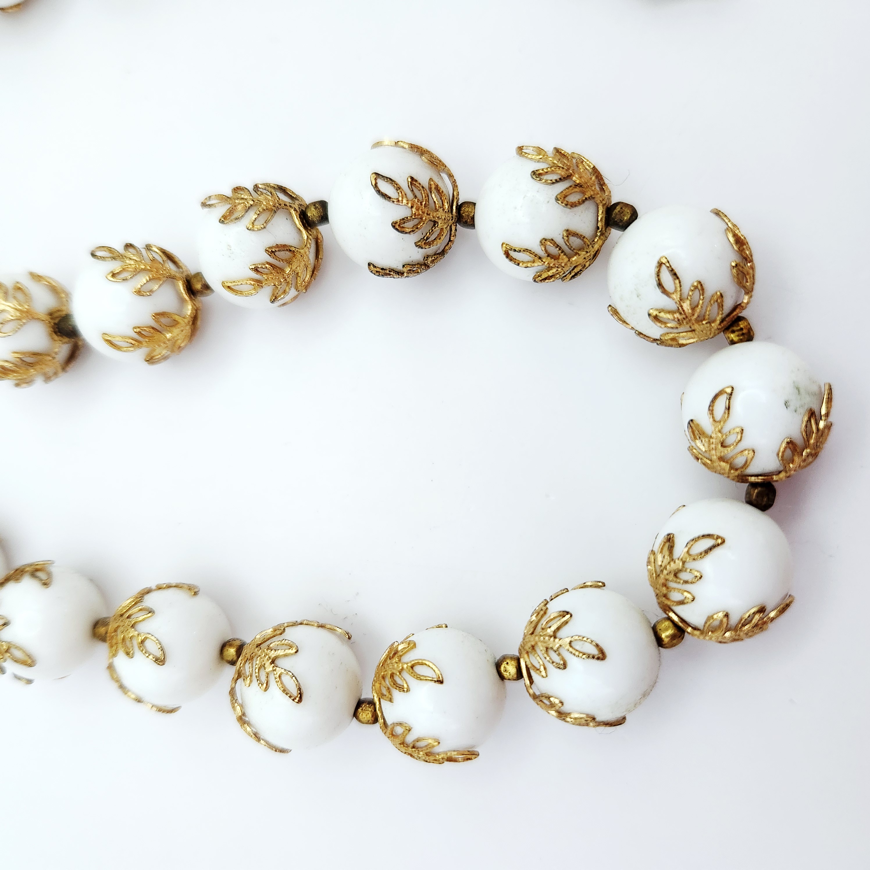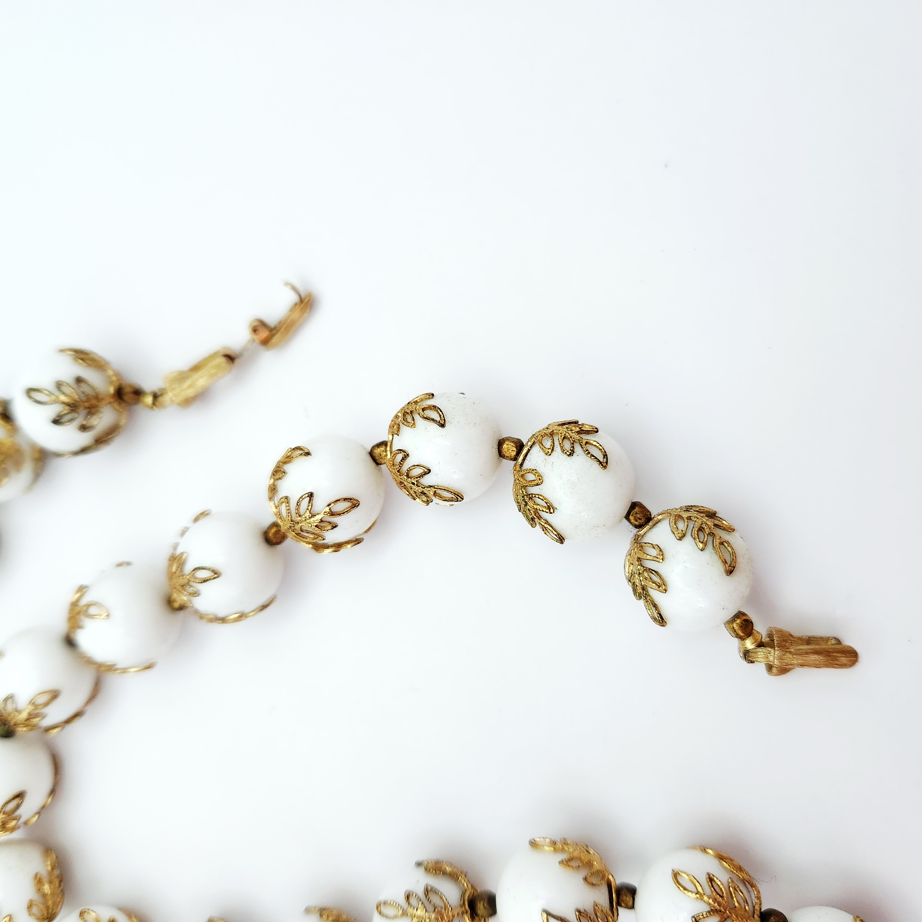 This vintage costume jewelry suite by Trifari includes a single-strand necklace and a pair of matching drop earrings, crafted in yellow gold-tone base metal. Both pieces feature round, white opaque beads that appear to be milk glass, accented with decorative filigree caps in a leaf-motif design. The necklace is composed of uniform beads separated by small gold-tone spacers and is finished with a textured fold-over clasp. The matching earrings feature a two-tier drop design with clip-on findings. Both the necklace clasp and earring backs are stamped with the TRIFARI maker mark topped with a crown symbol and a copyright mark. Necklace measures approximately 23 inches in length. Beads measure approximately 0.5 inches in diameter.