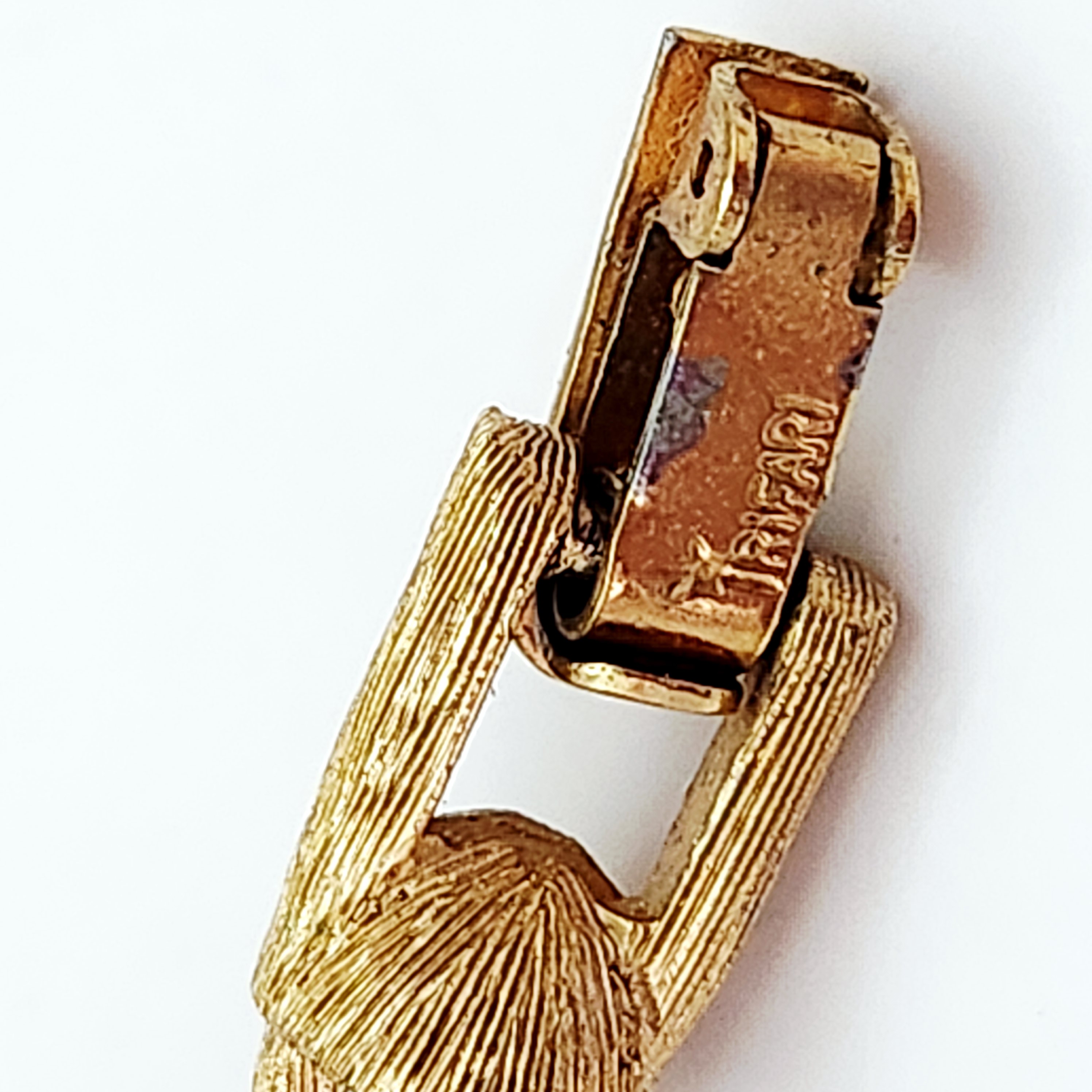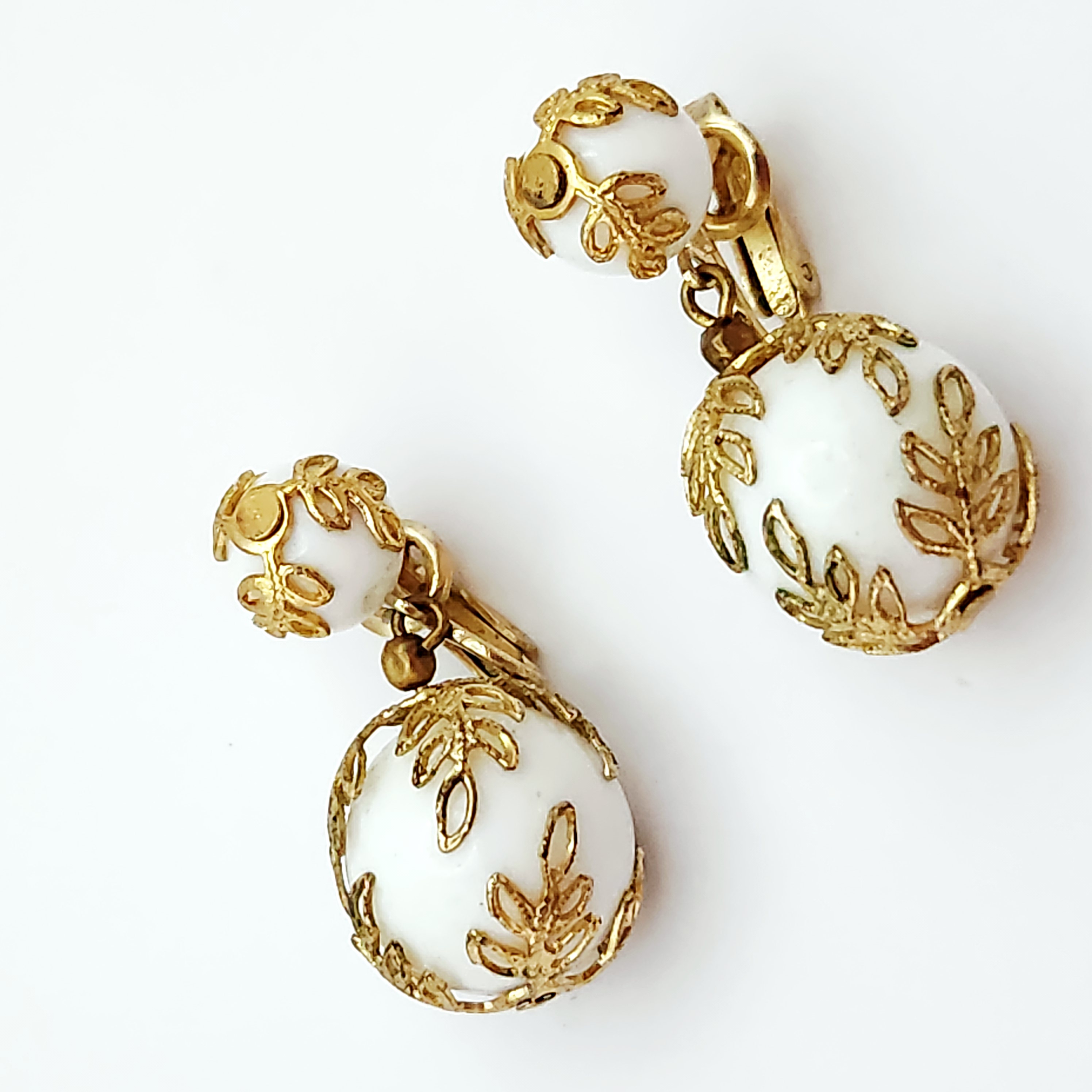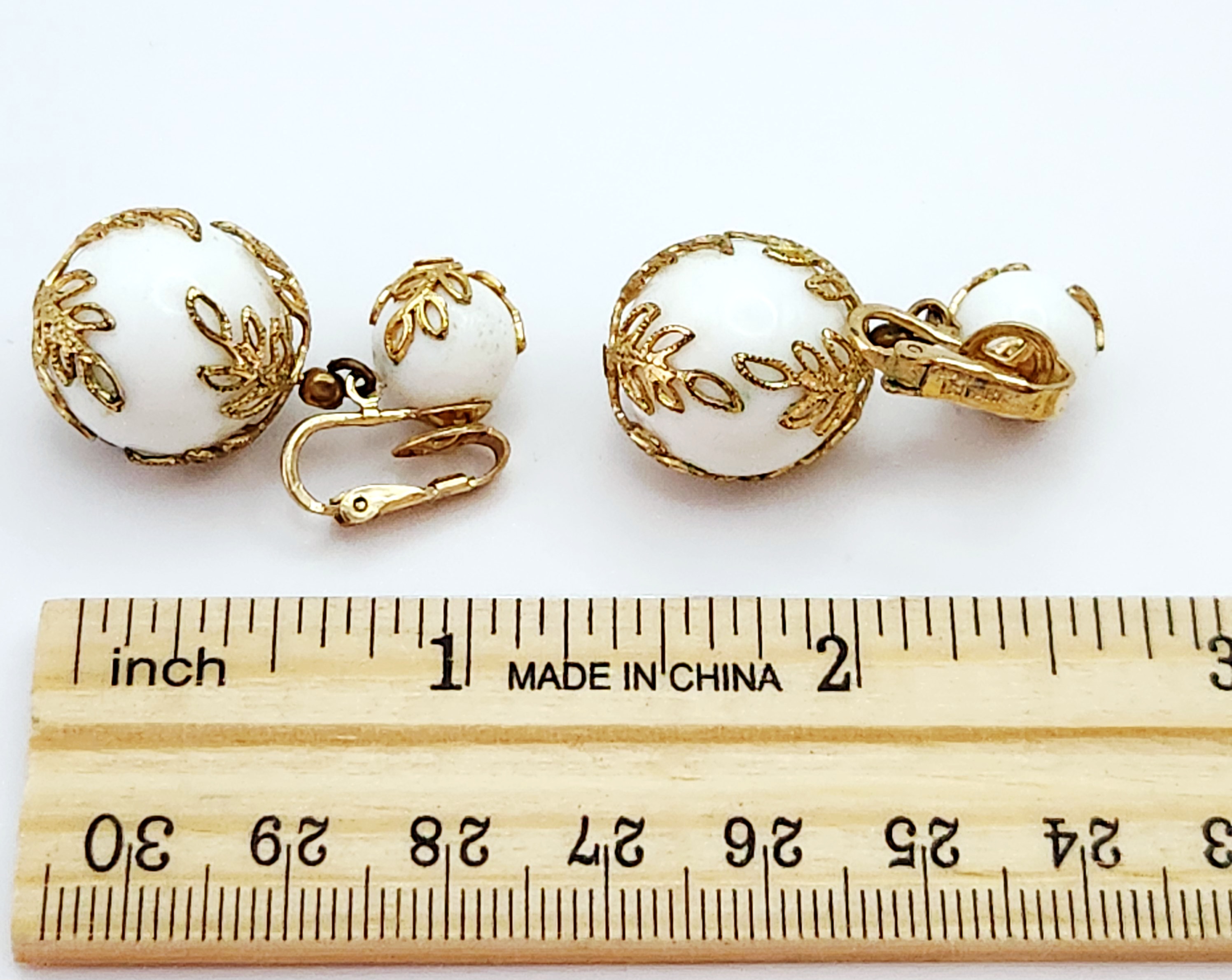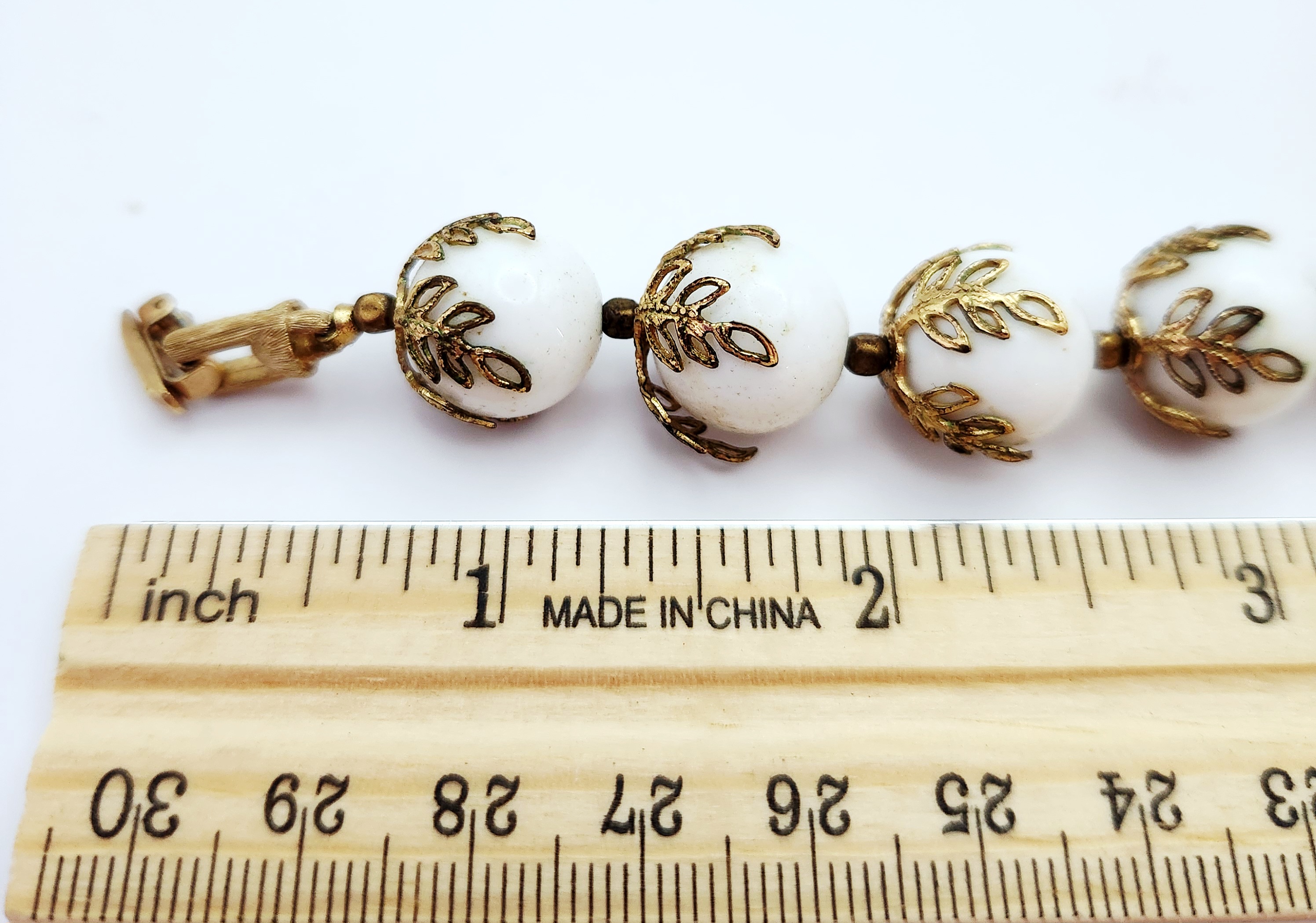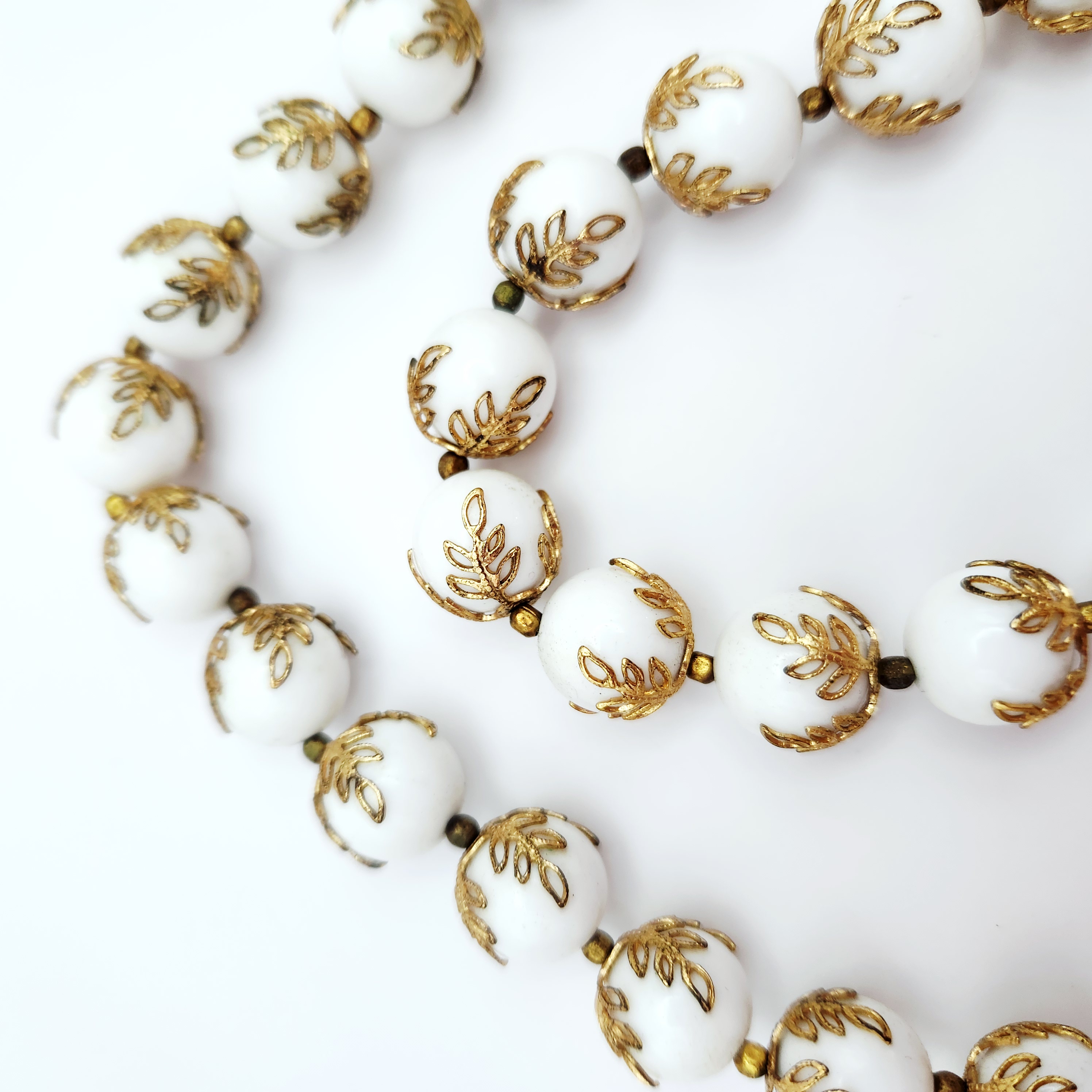 This vintage costume jewelry suite by Trifari includes a single-strand necklace and a pair of matching drop earrings, crafted in yellow gold-tone base metal. Both pieces feature round, white opaque beads that appear to be milk glass, accented with decorative filigree caps in a leaf-motif design. The necklace is composed of uniform beads separated by small gold-tone spacers and is finished with a textured fold-over clasp. The matching earrings feature a two-tier drop design with clip-on findings. Both the necklace clasp and earring backs are stamped with the TRIFARI maker mark topped with a crown symbol and a copyright mark. Necklace measures approximately 23 inches in length. Beads measure approximately 0.5 inches in diameter.