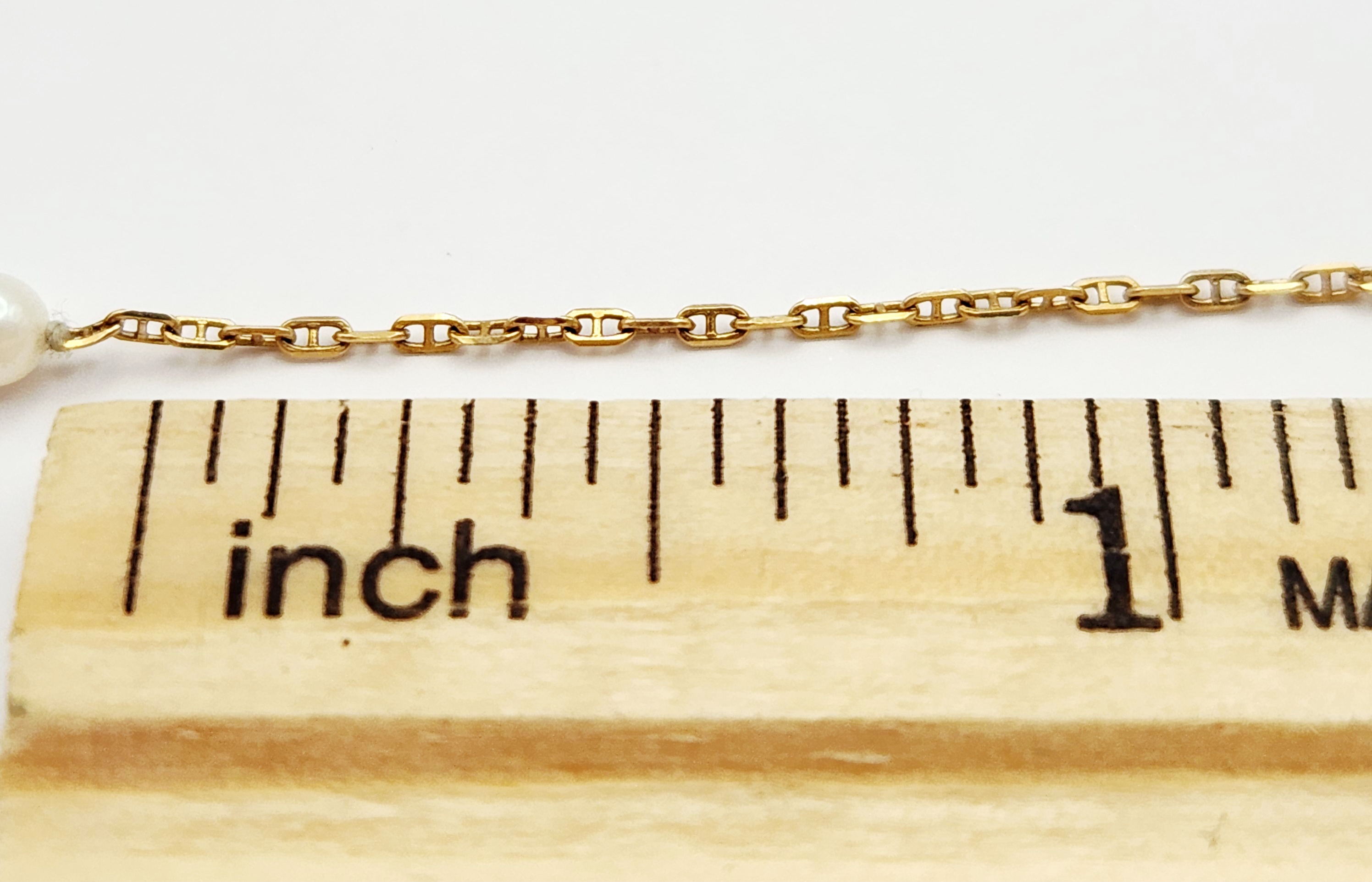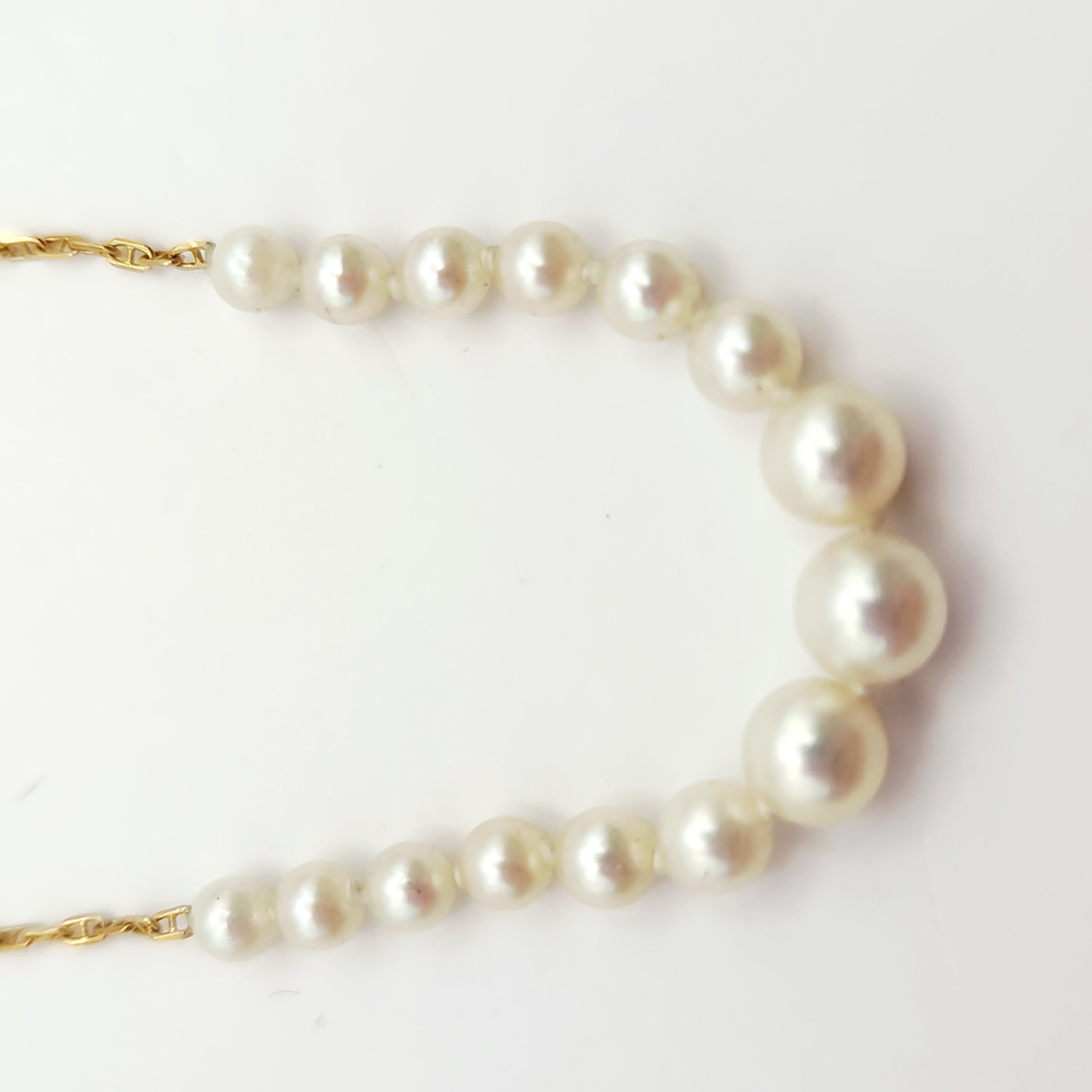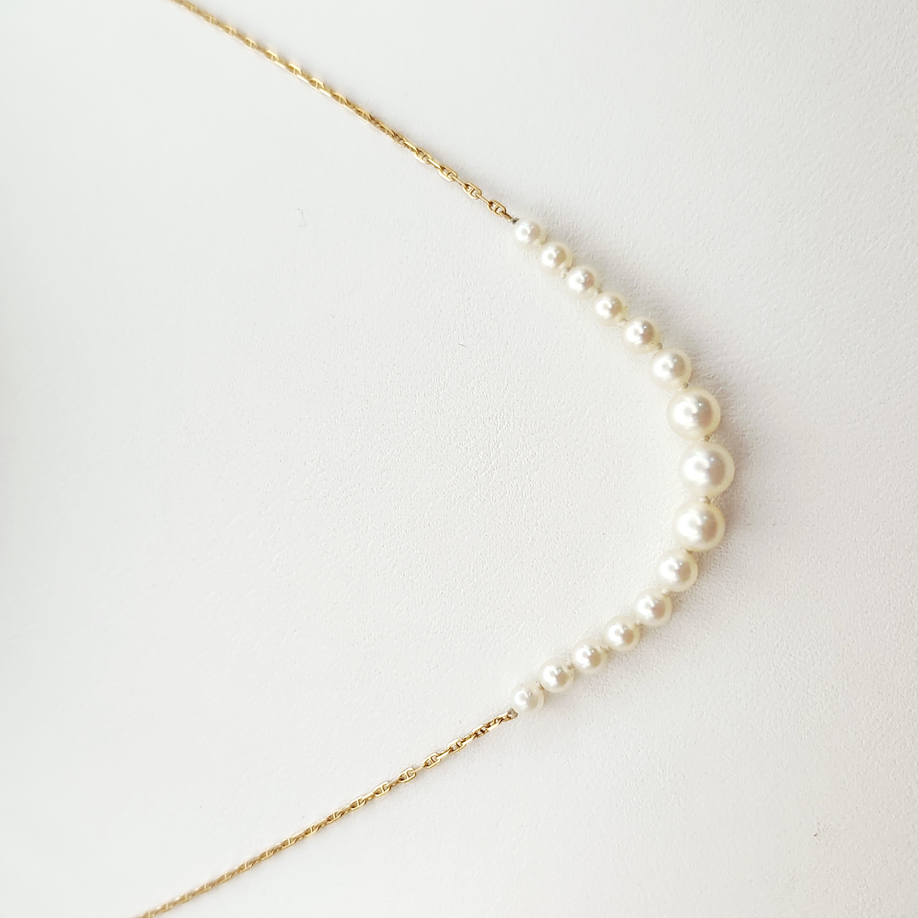The necklace is in good overall condition. The pearls exhibit a white body color with soft luster and minimal surface blemishes. The gold chain is intact with no kinks or visible repairs. The spring ring clasp is in good working order.