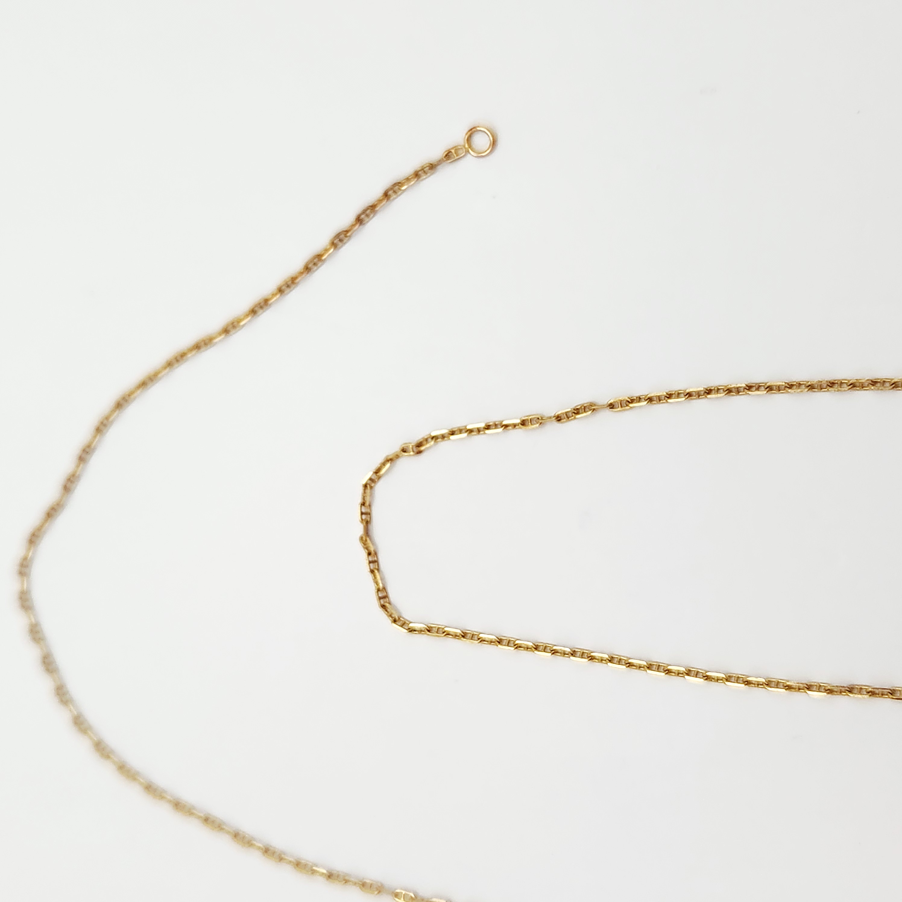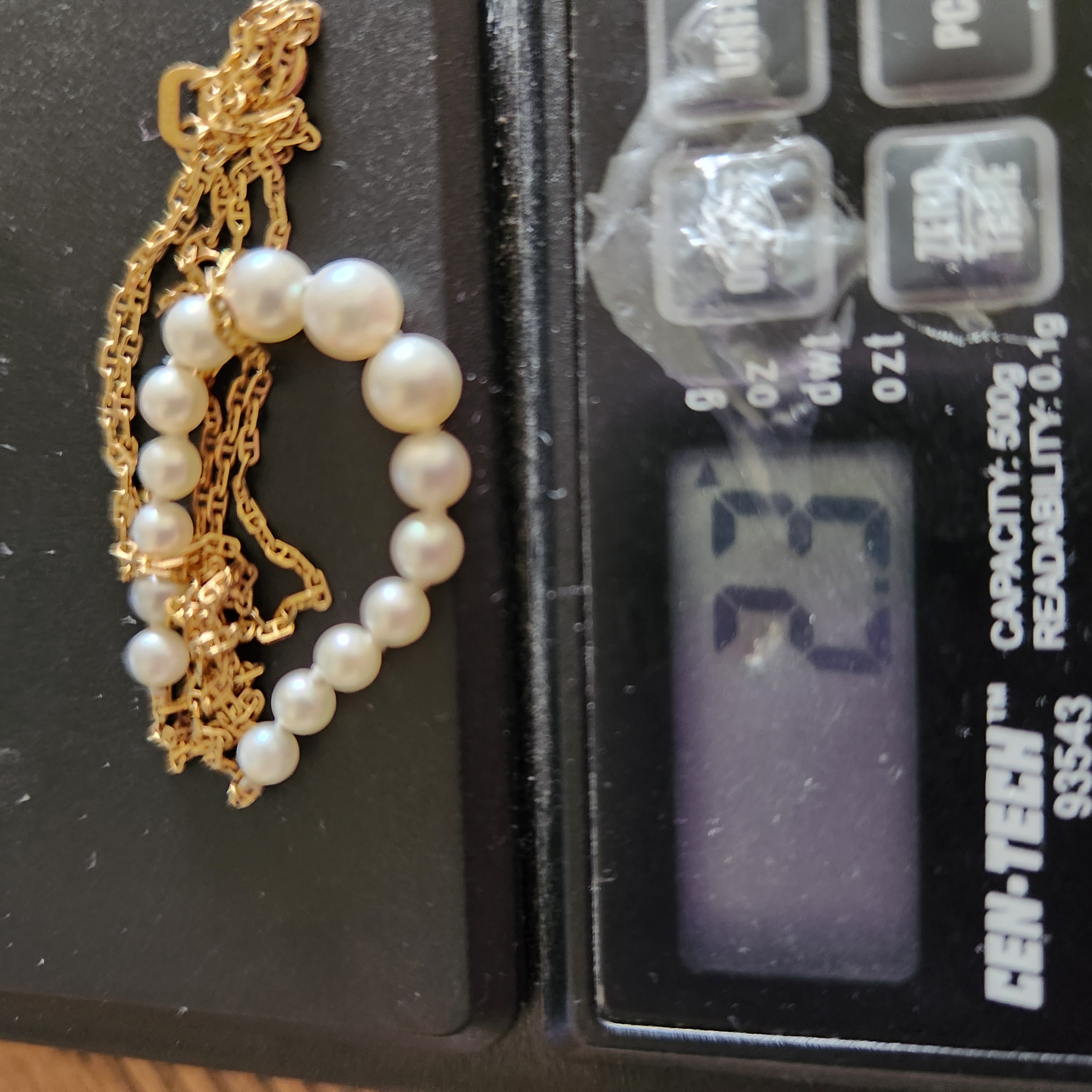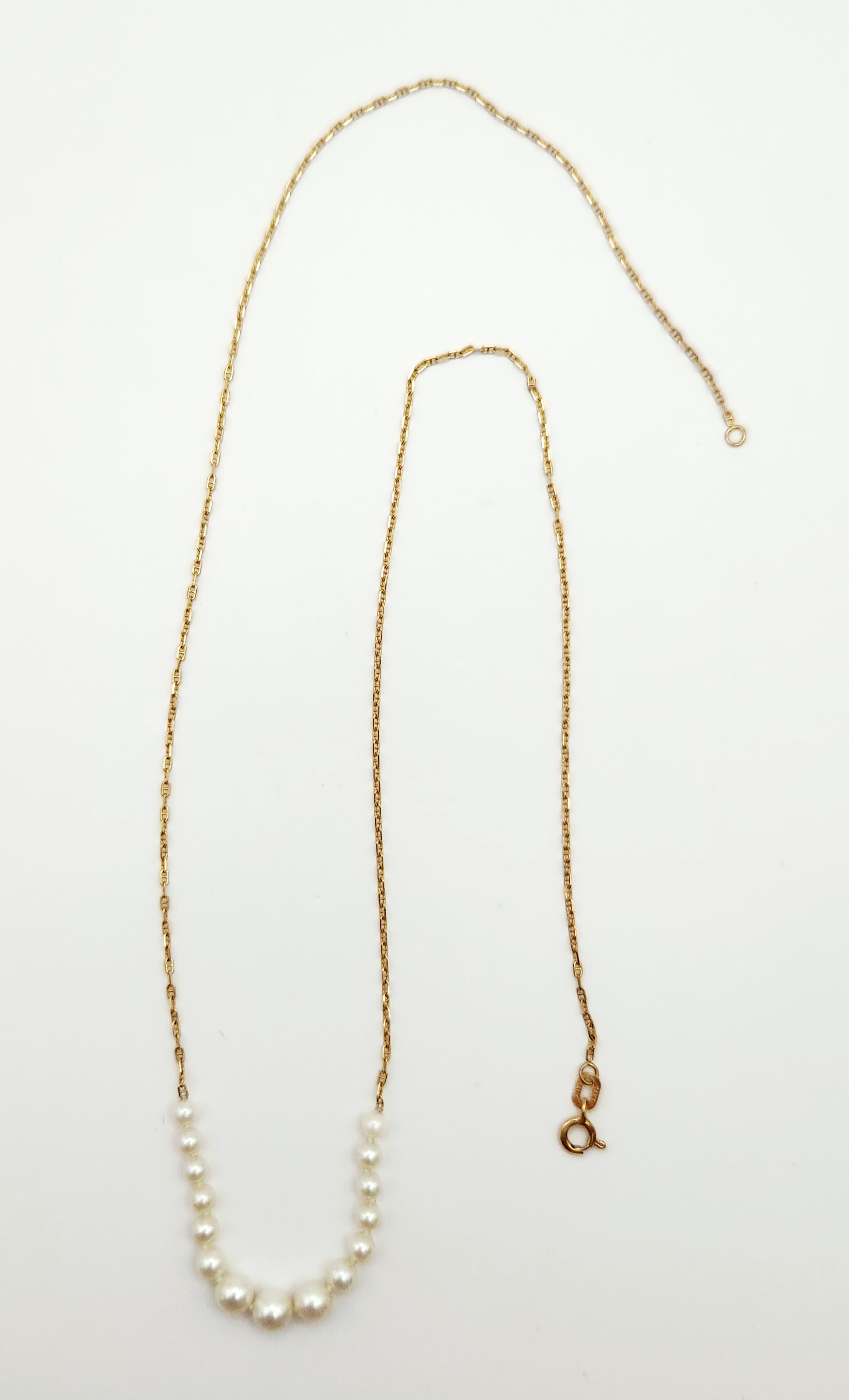 The necklace is in good overall condition. The pearls exhibit a white body color with soft luster and minimal surface blemishes. The gold chain is intact with no kinks or visible repairs. The spring ring clasp is in good working order.