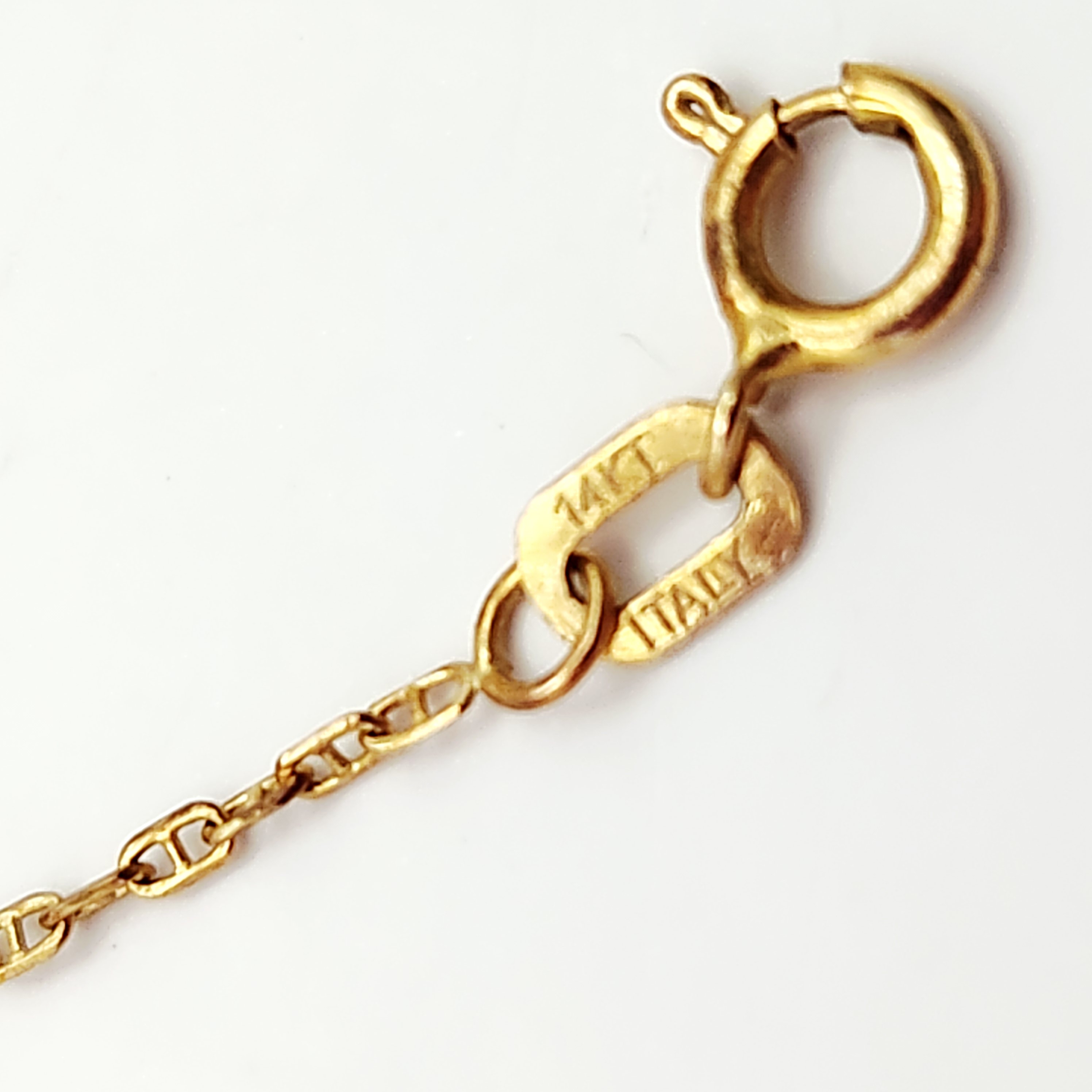 This necklace is crafted in 14 karat yellow gold and features a central graduated strand of fifteen white pearls. The pearls appear to be cultured and range in size from approximately 3mm at the outer edges to 6mm at the center. The pearls are integrated into a fine yellow gold anchor link chain. The piece is secured with a spring ring clasp. Hallmarks include 14KT and ITALY stamped on the terminal tag. Total weight is 2.3 grams. The necklace measures 18 inches in length.