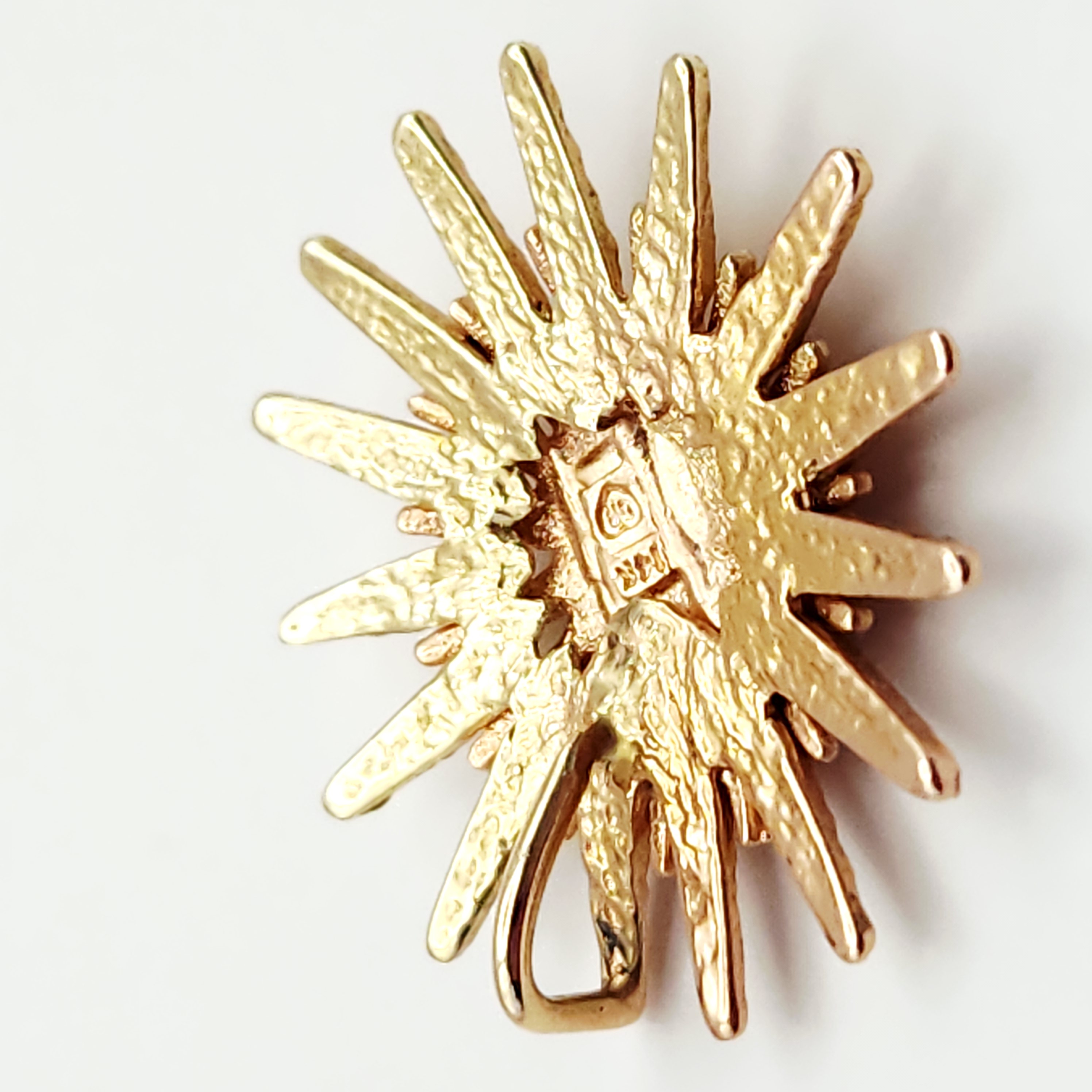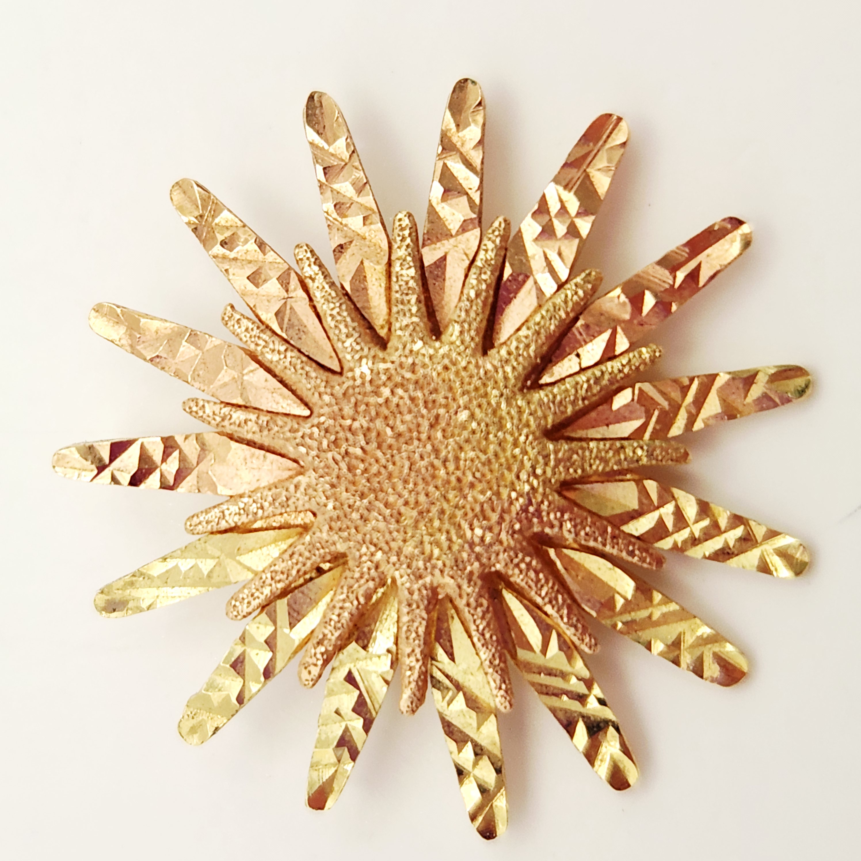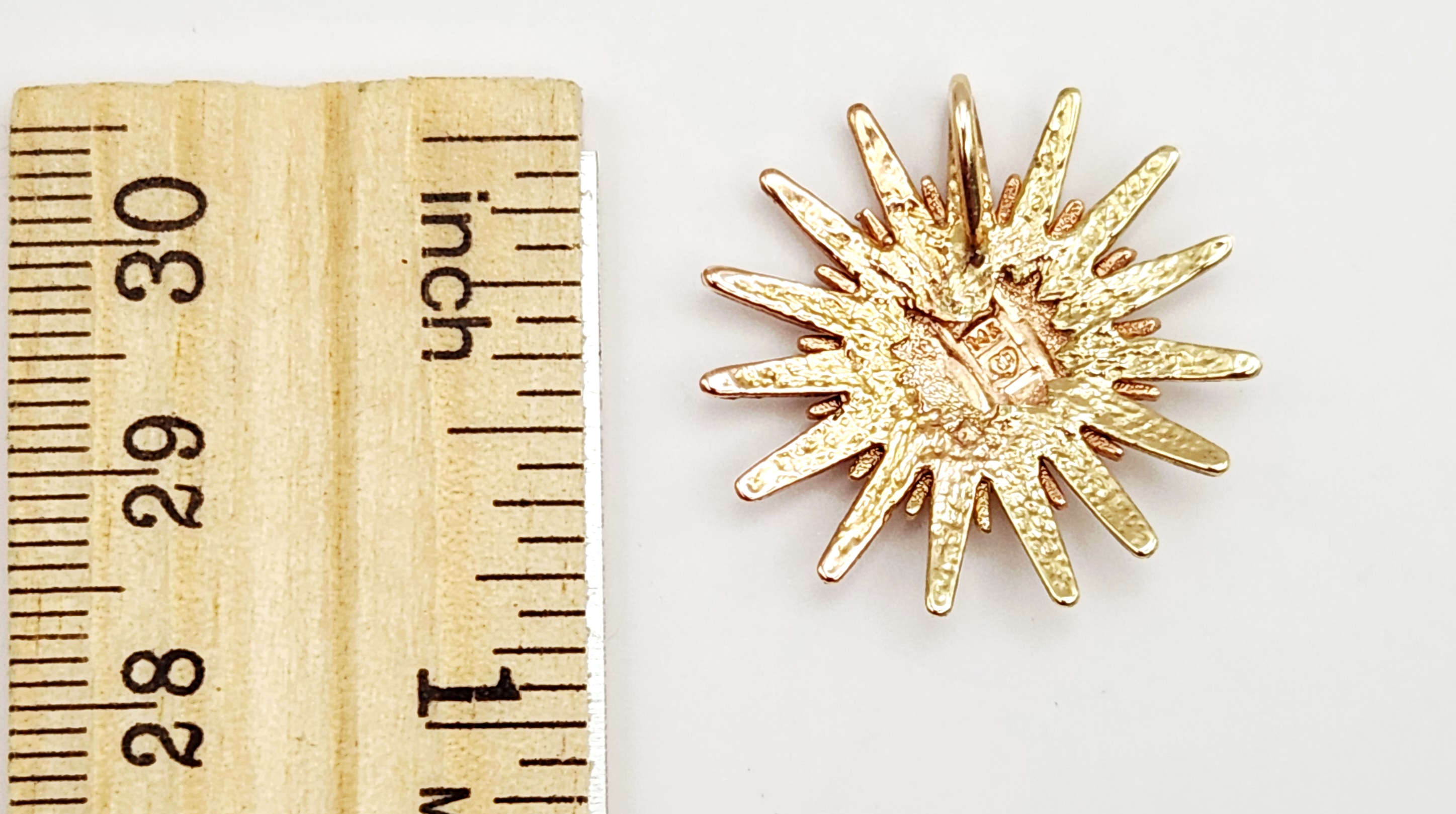This 14 karat yellow gold pendant features a multi-tiered sunburst or starburst design. The central dome has a stippled texture, from which two layers of rays radiate. The shorter inner rays have a textured surface matching the center, while the longer outer rays are finished with diamond-cut geometric facets. On the reverse, the piece includes an integrated bail and a rectangular stamp. Weight: 2.8 grams. Diameter: Approximately 1 inch.