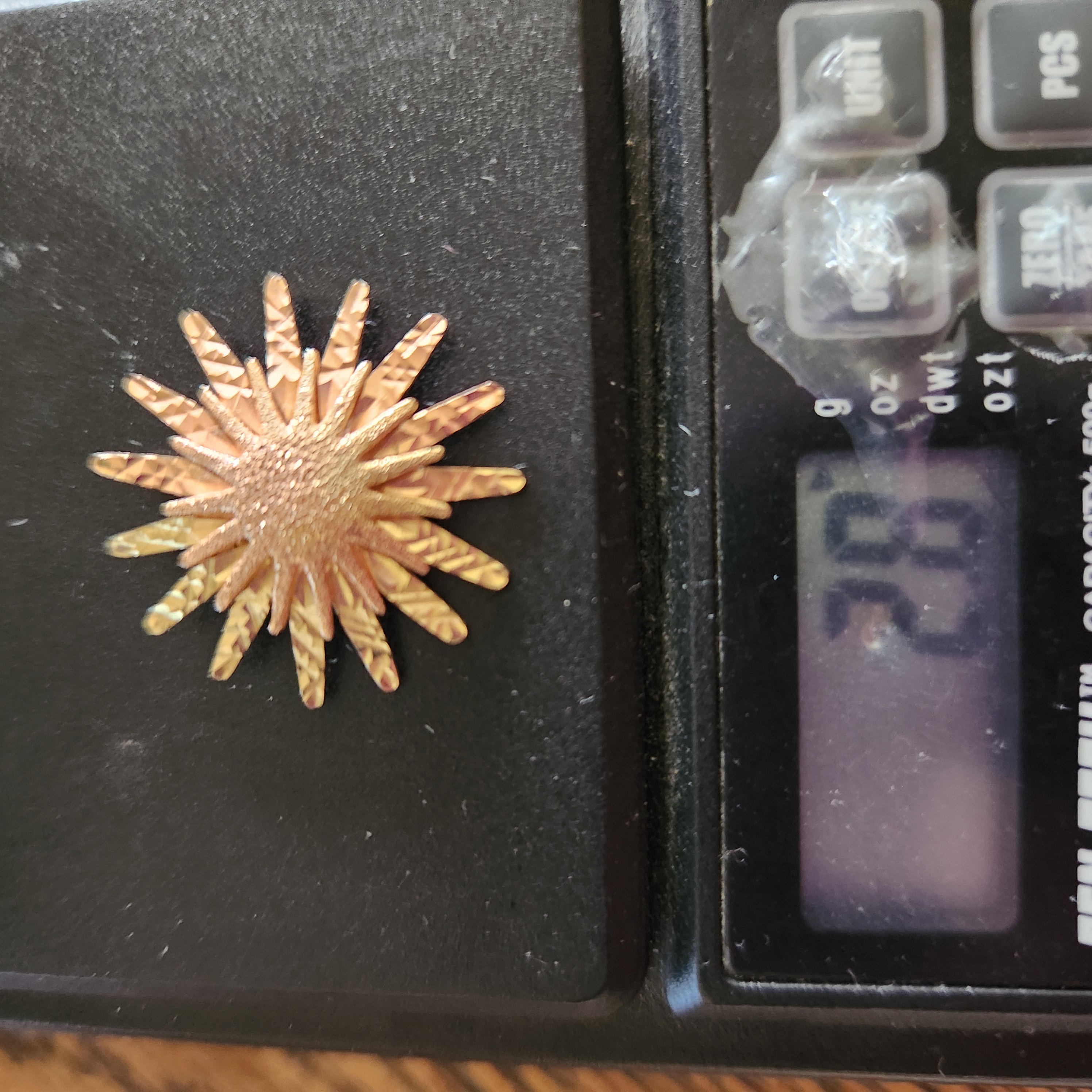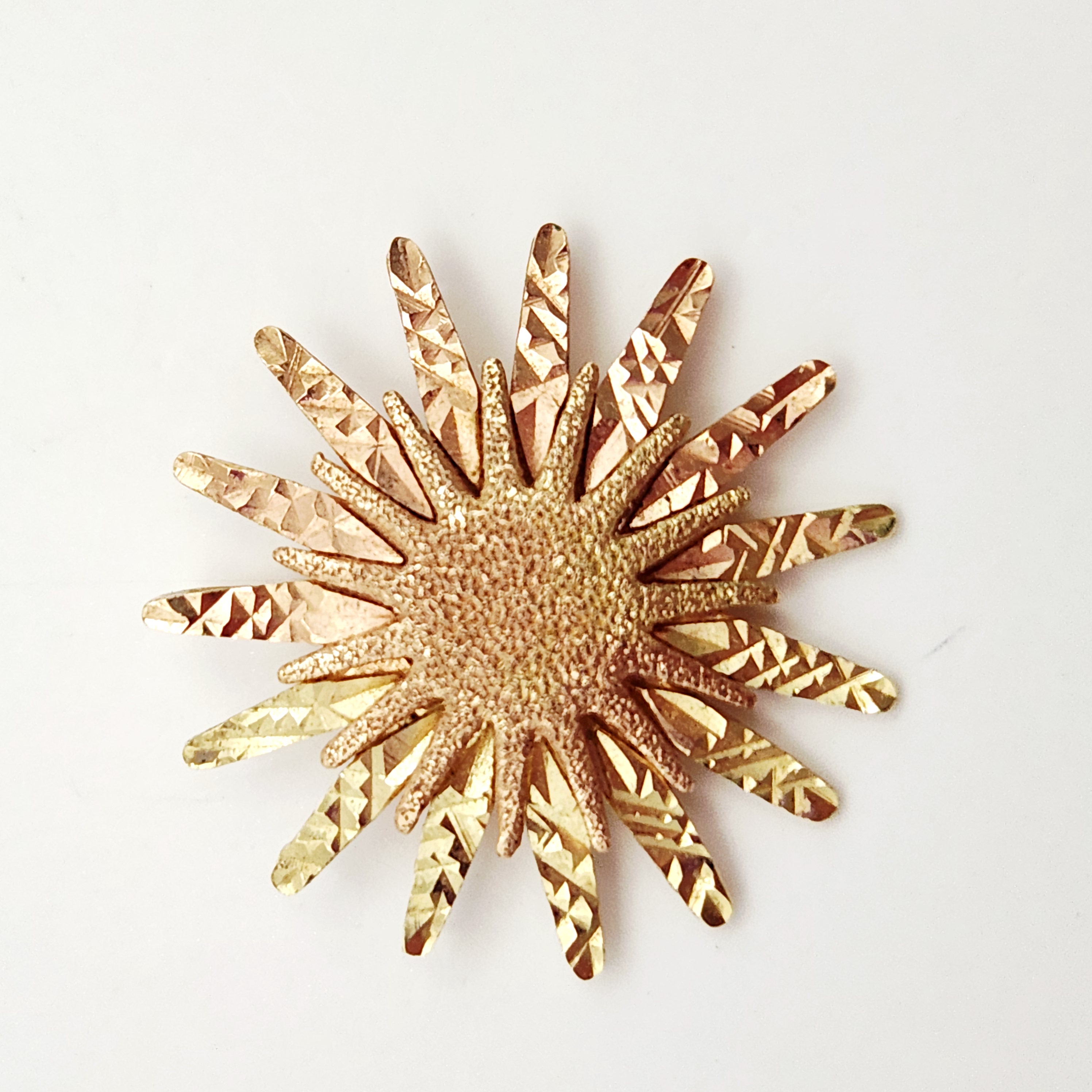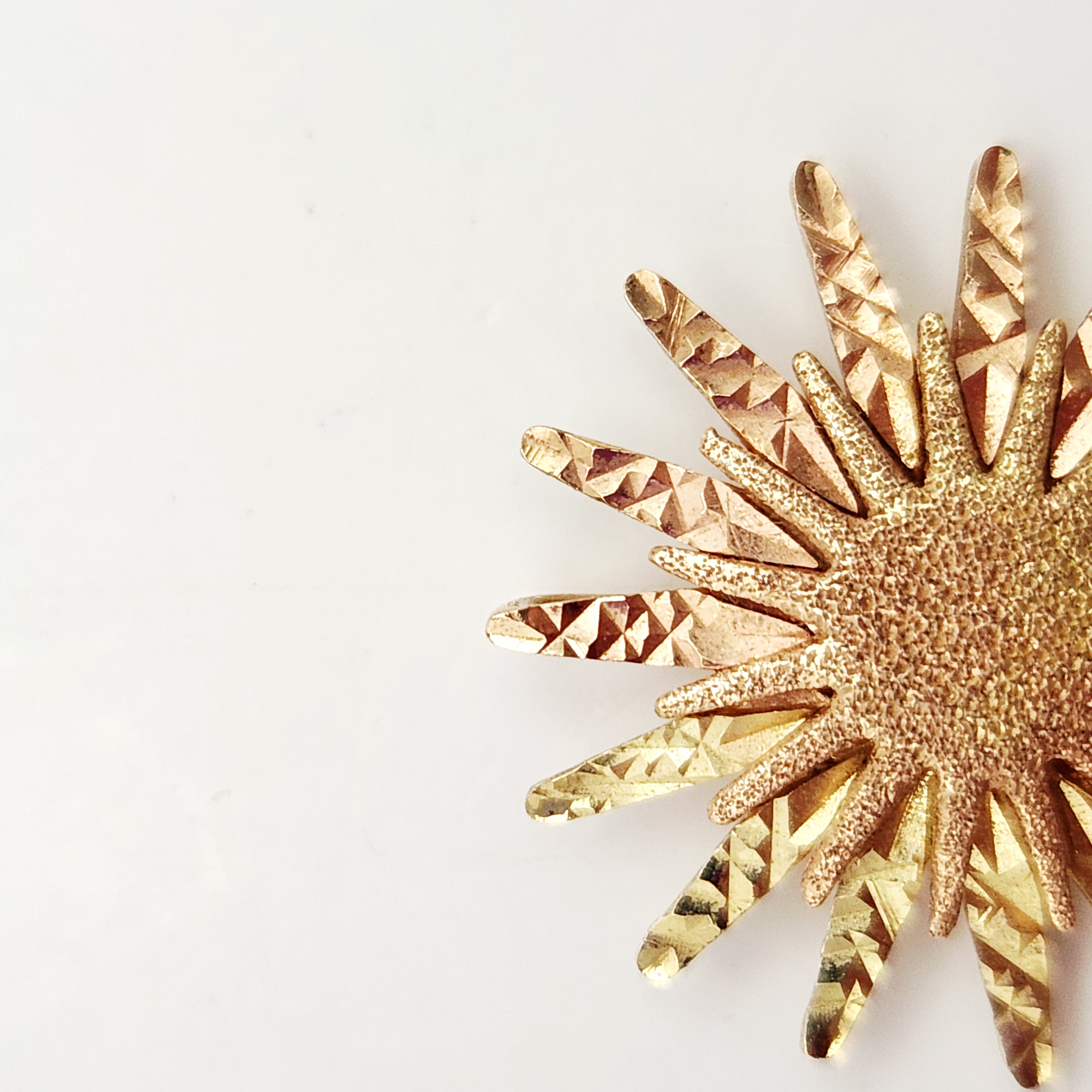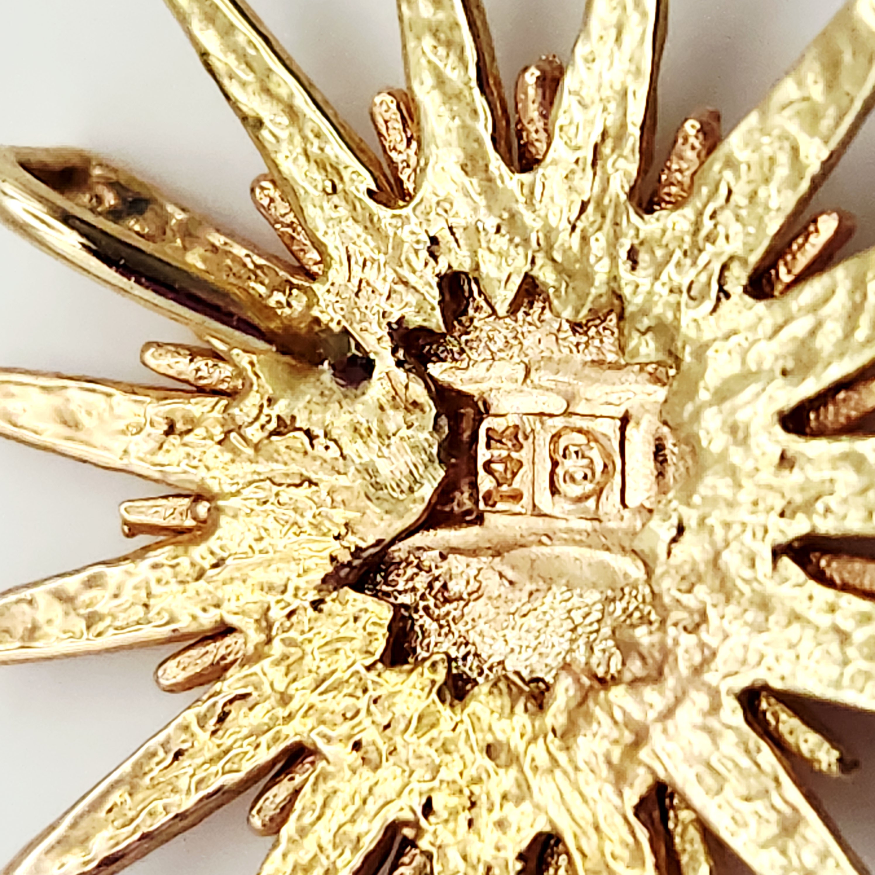 This 14 karat yellow gold pendant features a multi-tiered sunburst or starburst design. The central dome has a stippled texture, from which two layers of rays radiate. The shorter inner rays have a textured surface matching the center, while the longer outer rays are finished with diamond-cut geometric facets. On the reverse, the piece includes an integrated bail and a rectangular stamp. Weight: 2.8 grams. Diameter: Approximately 1 inch.