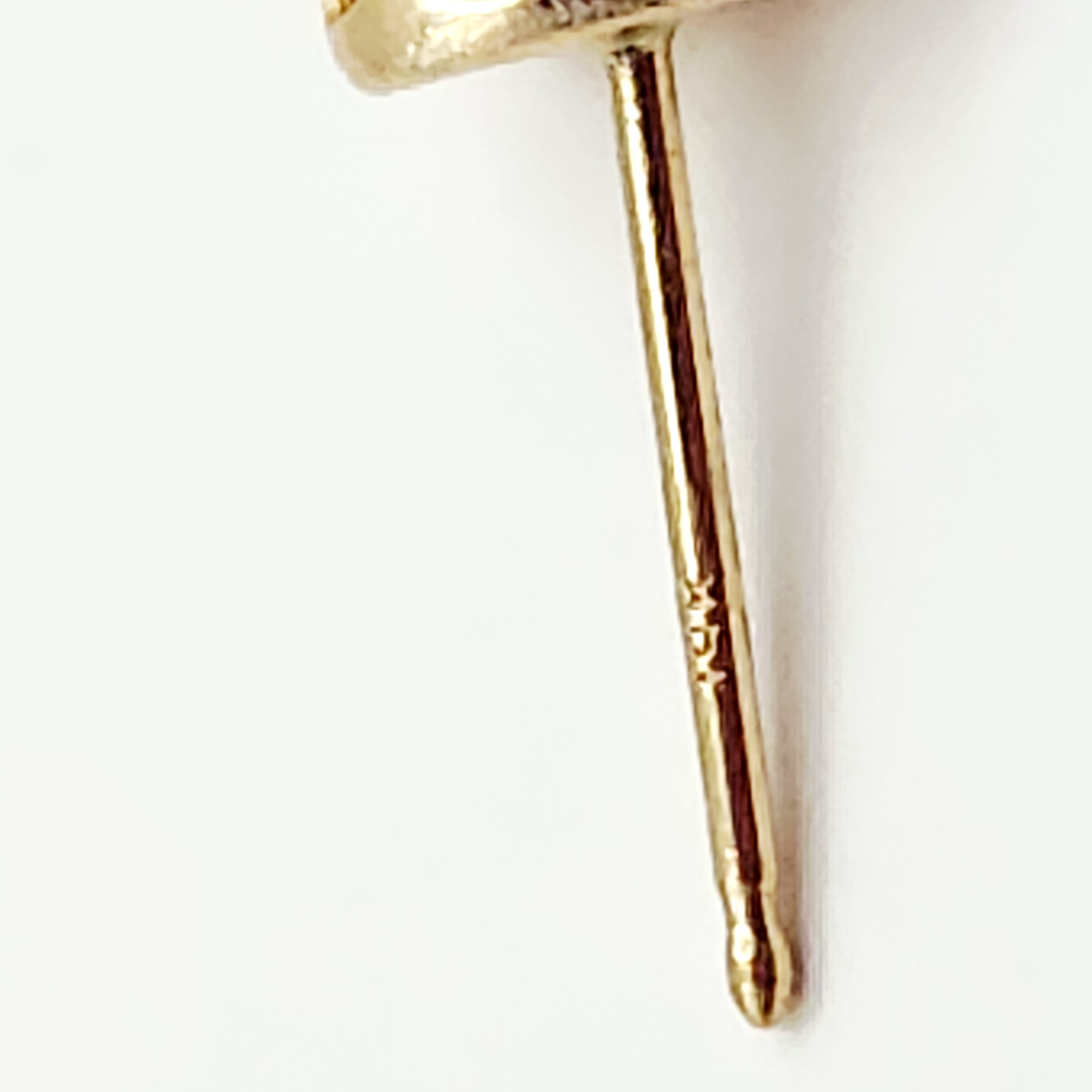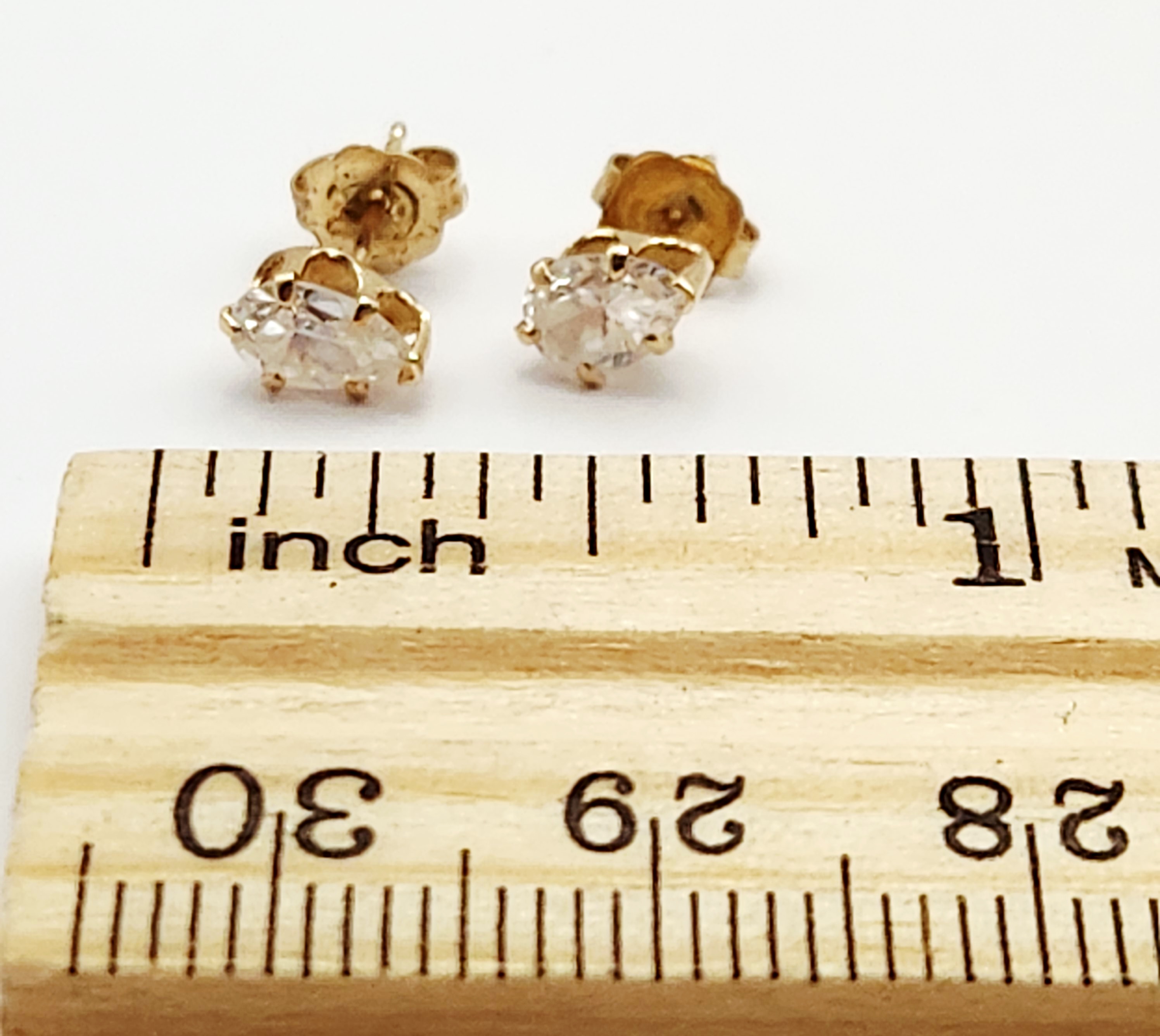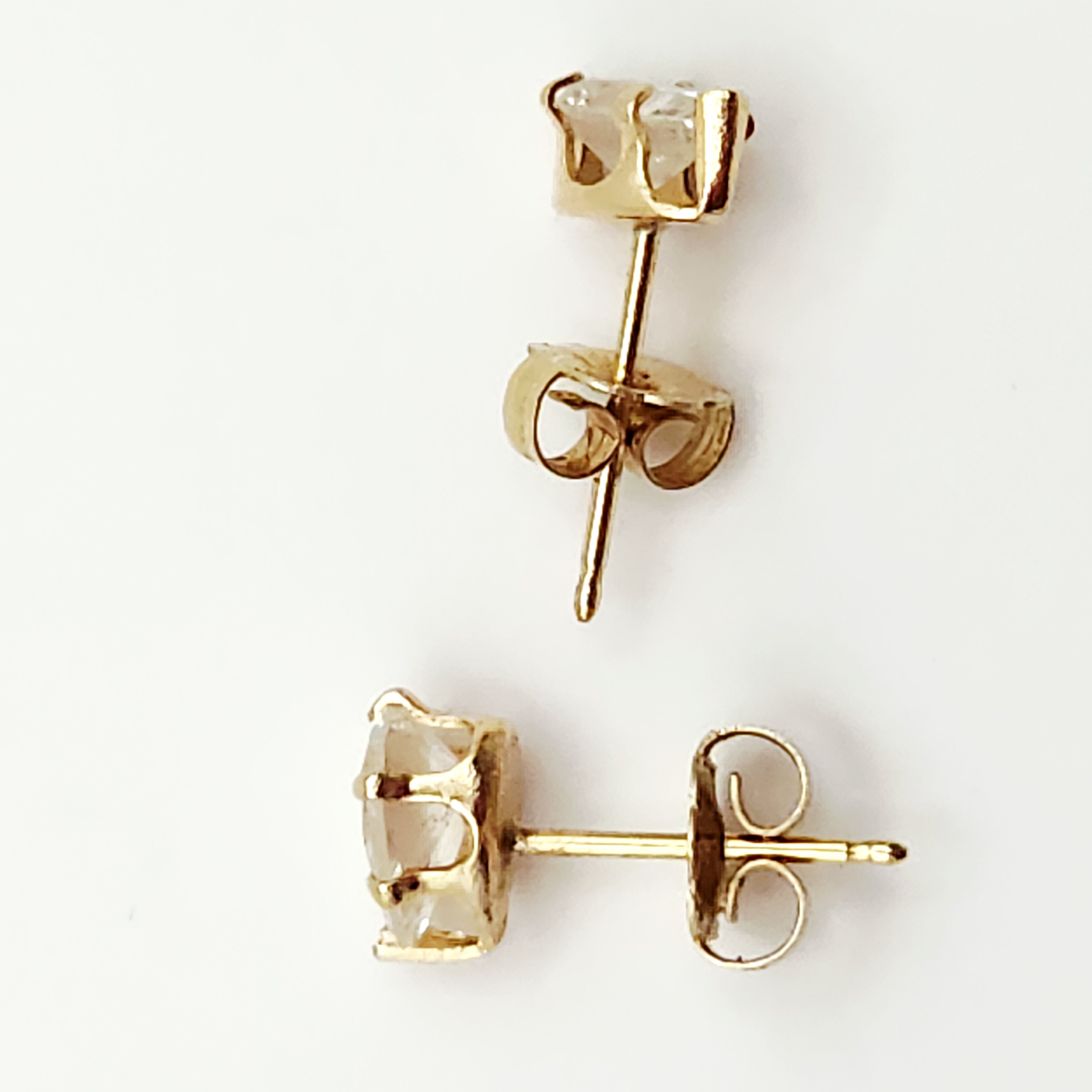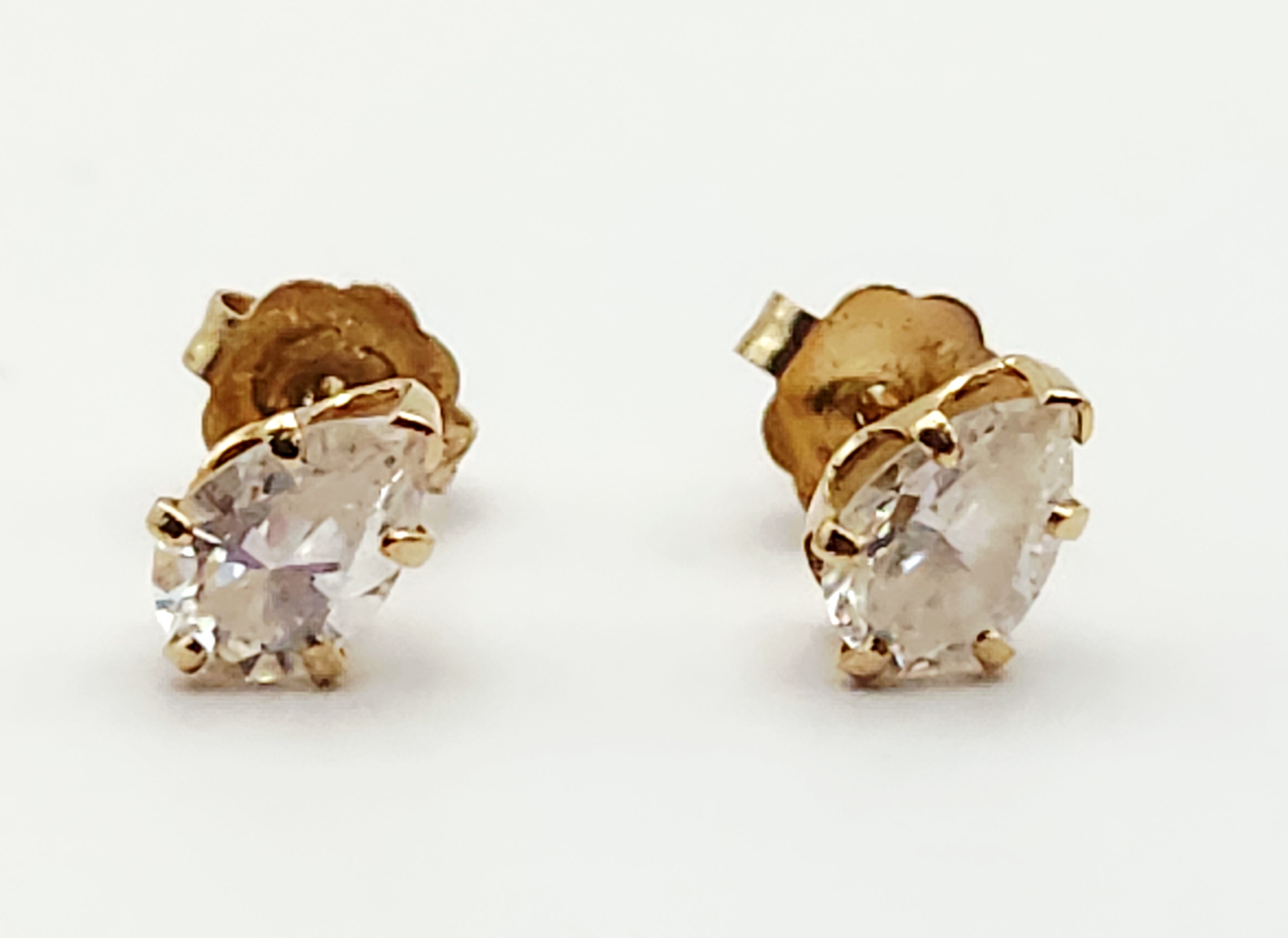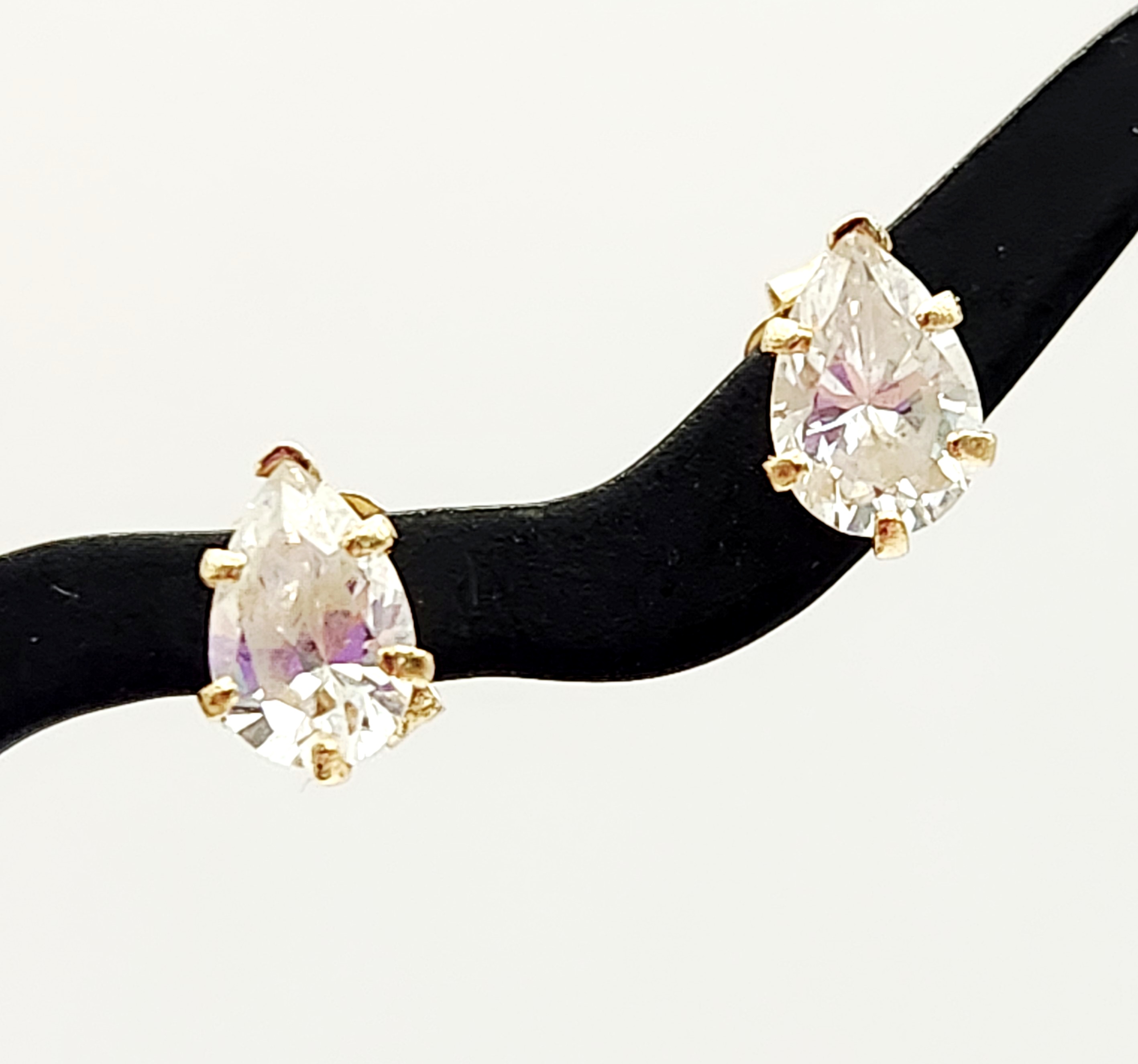 This pair of stud earrings is crafted in 14 karat yellow gold. Each earring features a single pear-cut CZ. The stones are secured in three-prong settings. The earrings are designed for pierced ears and are completed with post and butterfly backings. Hallmarks for 14 karat gold purity, transcribed as 14K, are visible on both the earring posts and the butterfly backs. Total weight of the pair is approximately 0.7 grams. Each earring measures approximately 1/4 inch in length.