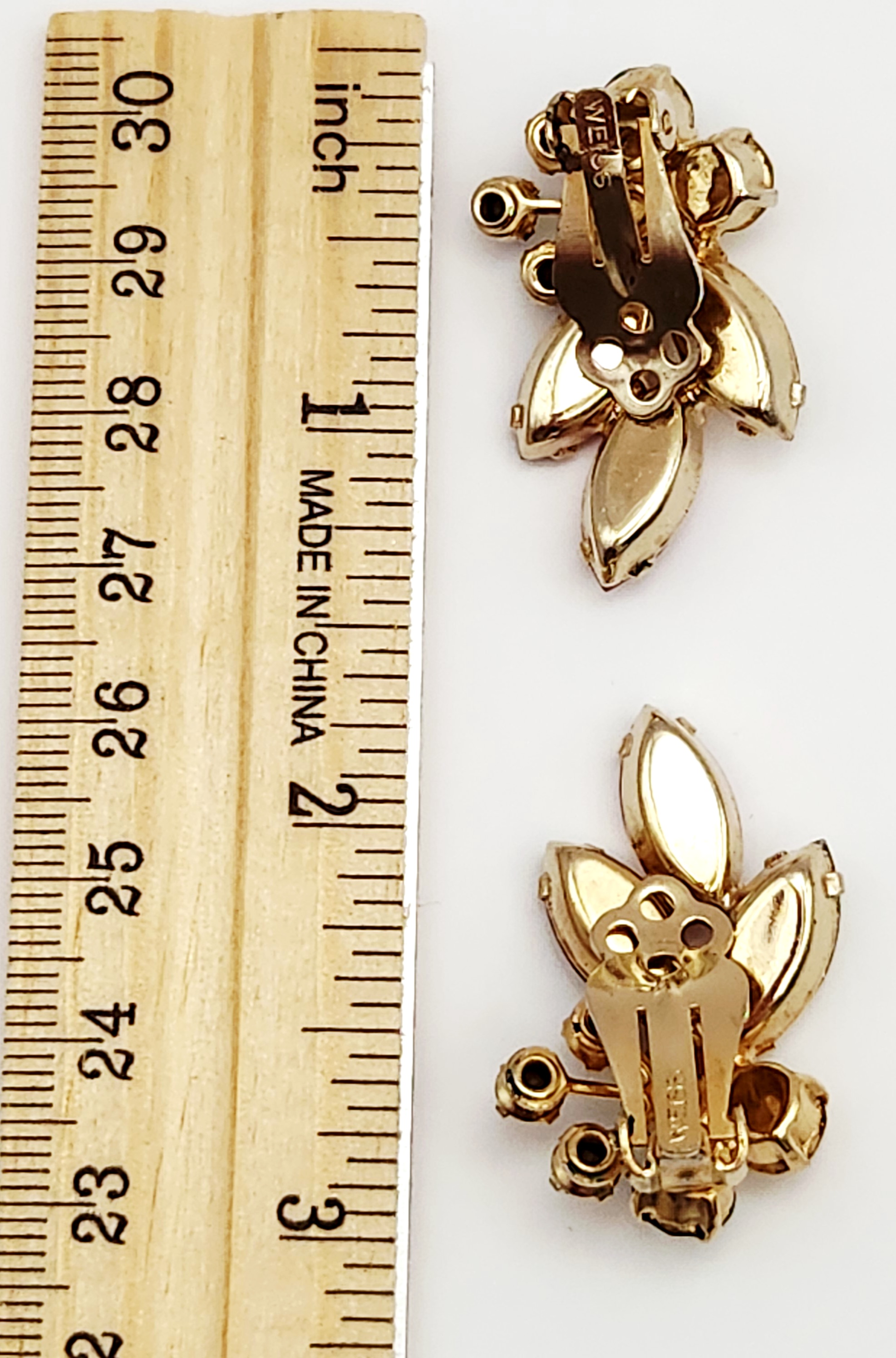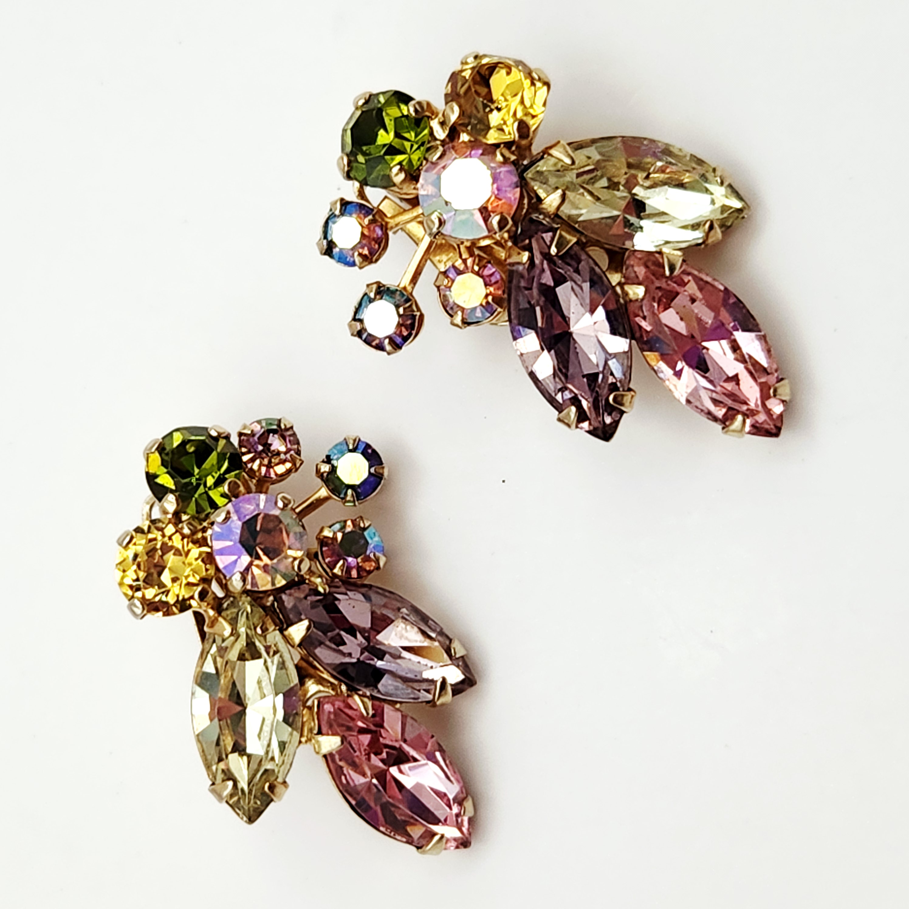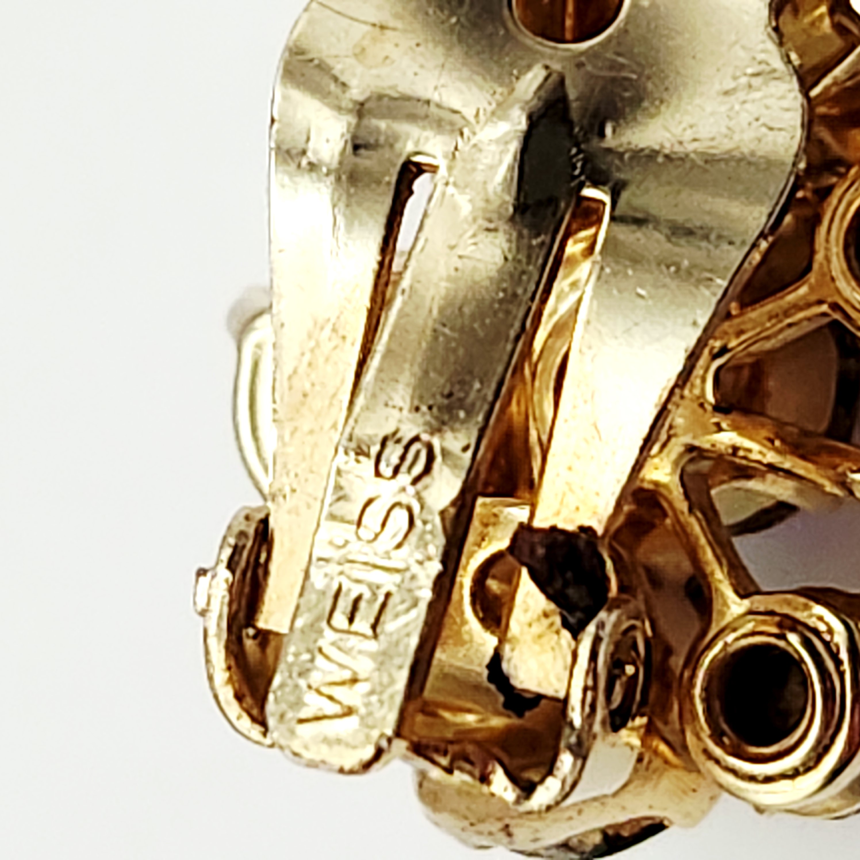 A collection of Weiss costume jewelry including a multi-colored rhinestone wreath brooch and two pairs of clip-on earrings measuring between 1.25 and 2 inches.
