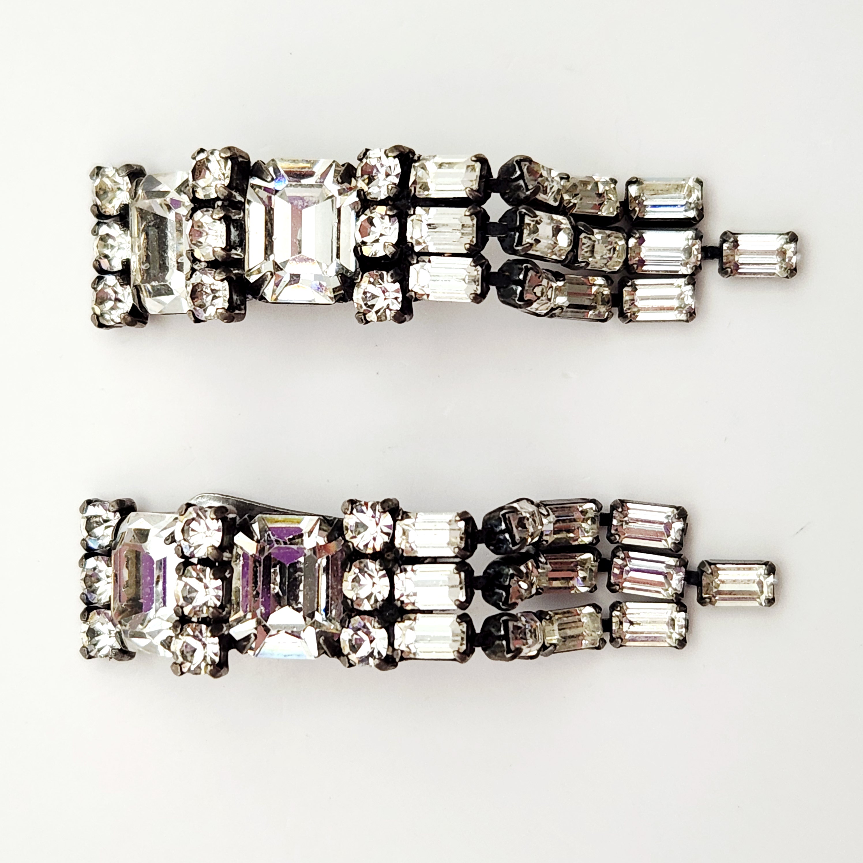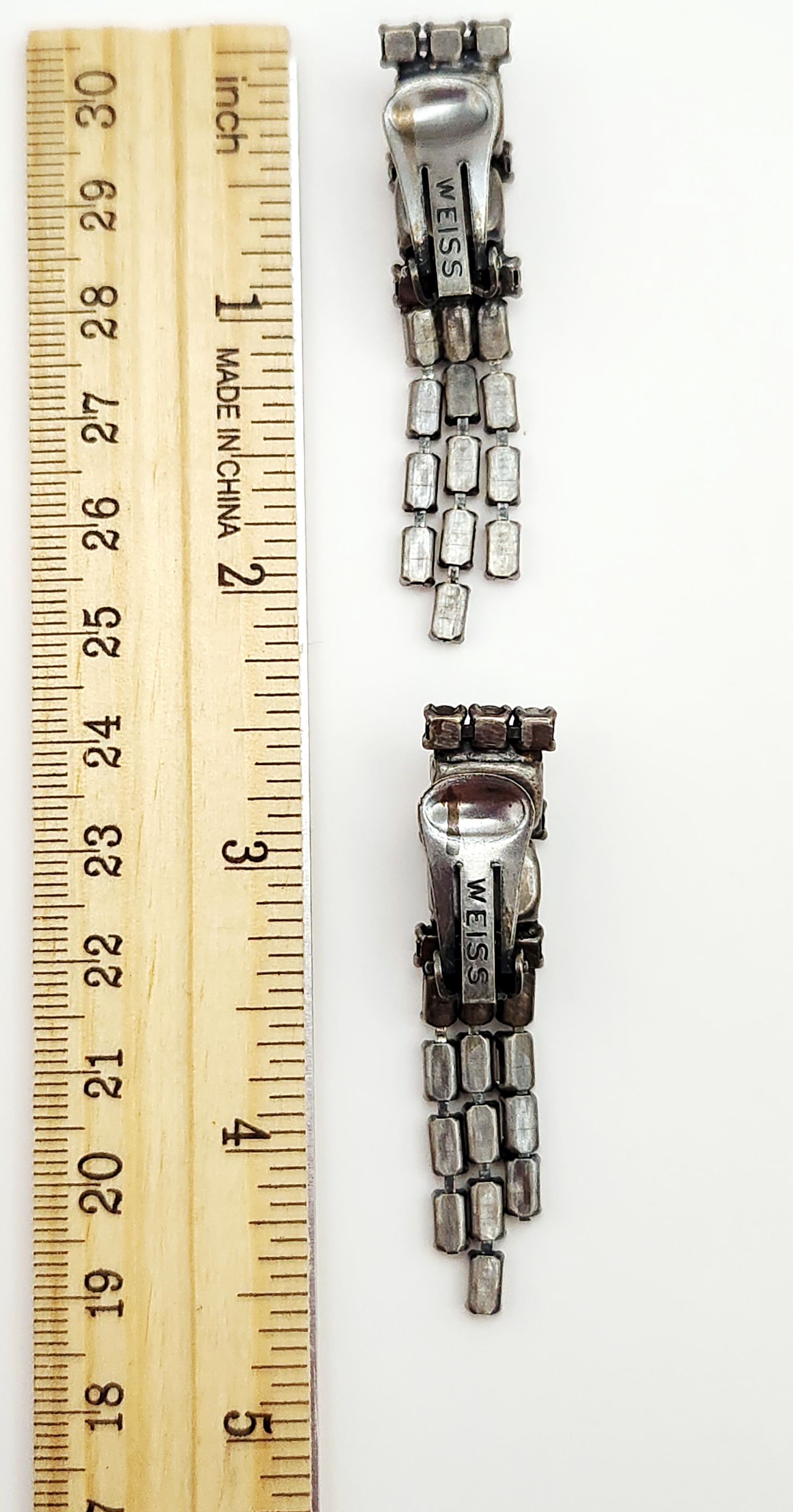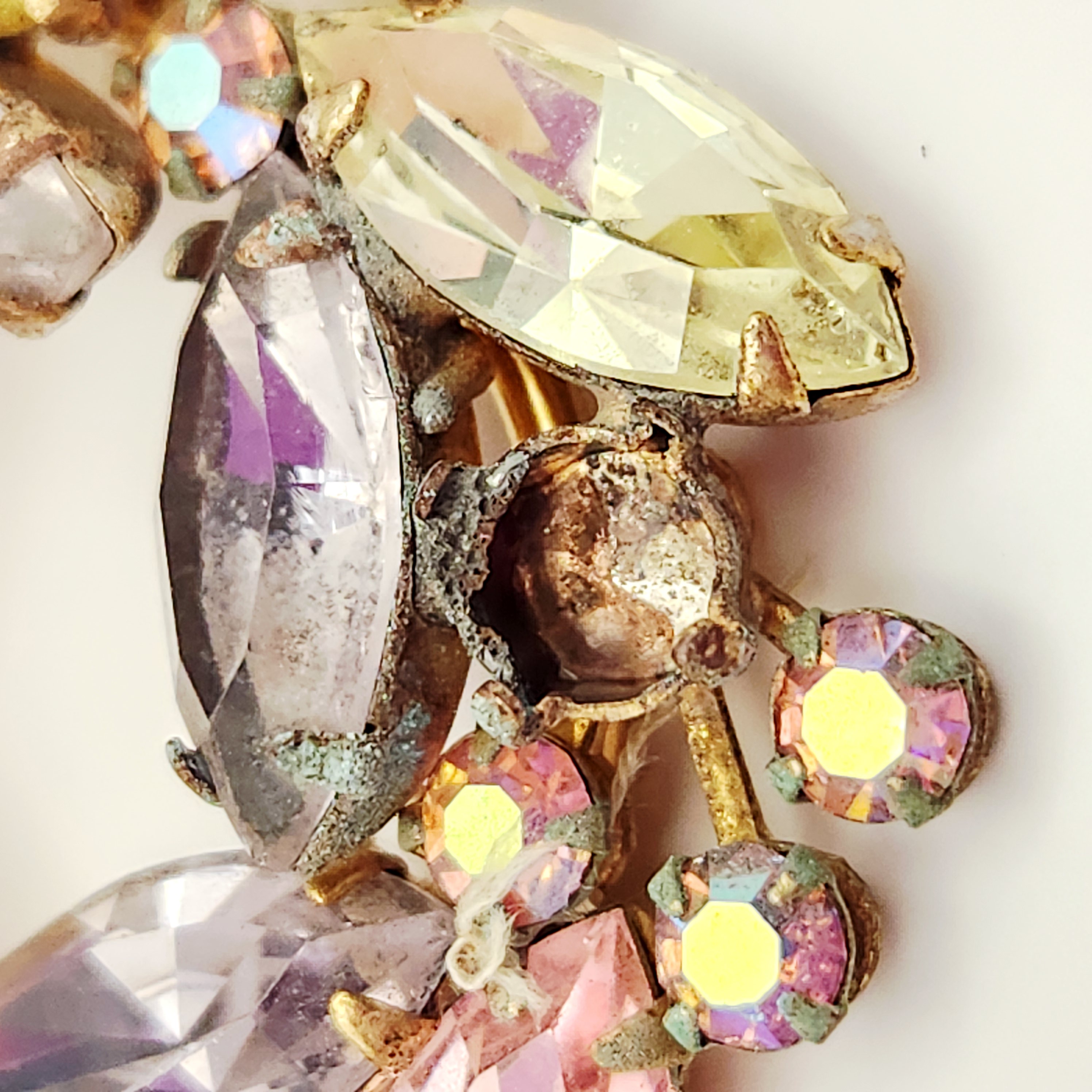 A collection of Weiss costume jewelry including a multi-colored rhinestone wreath brooch and two pairs of clip-on earrings measuring between 1.25 and 2 inches.