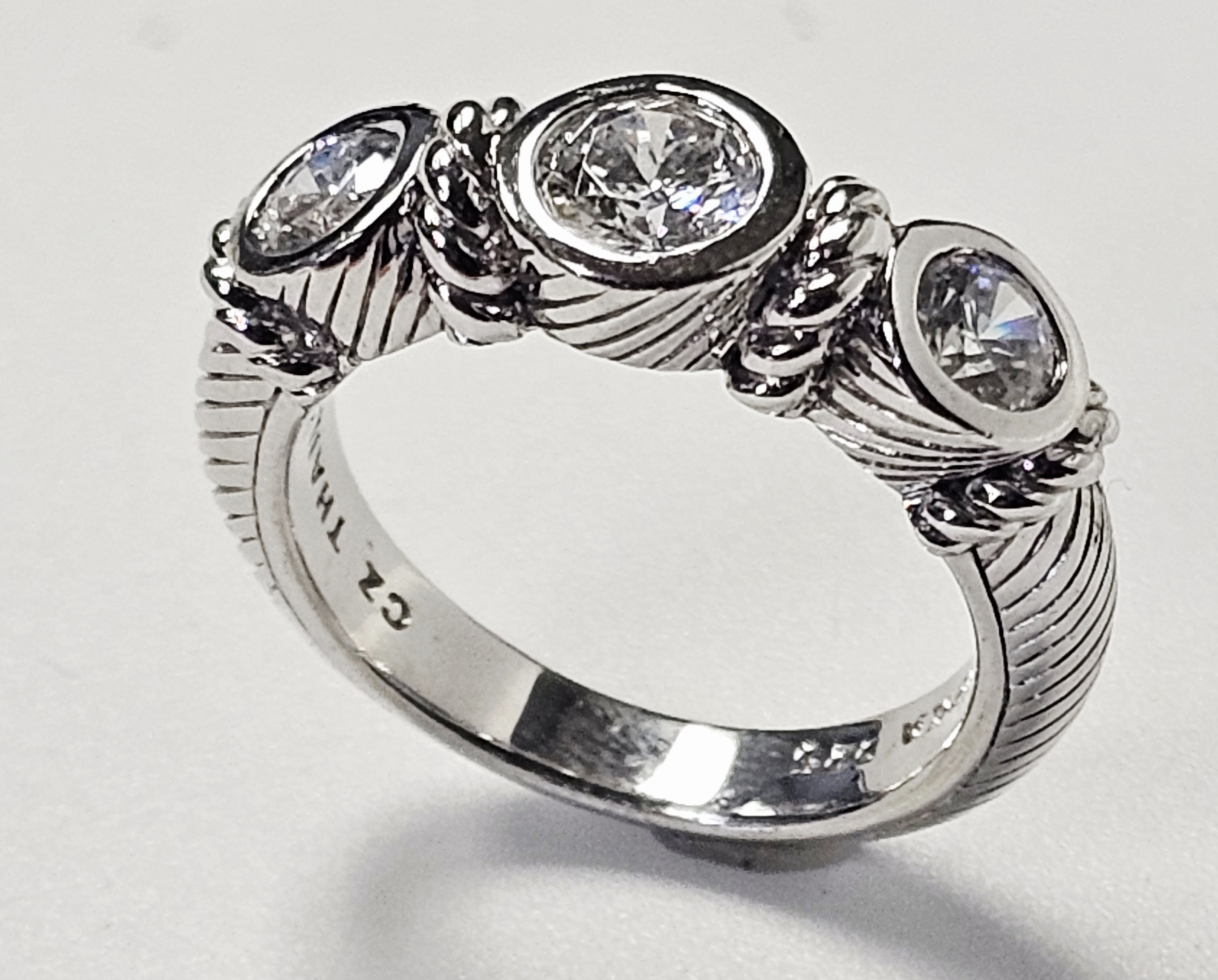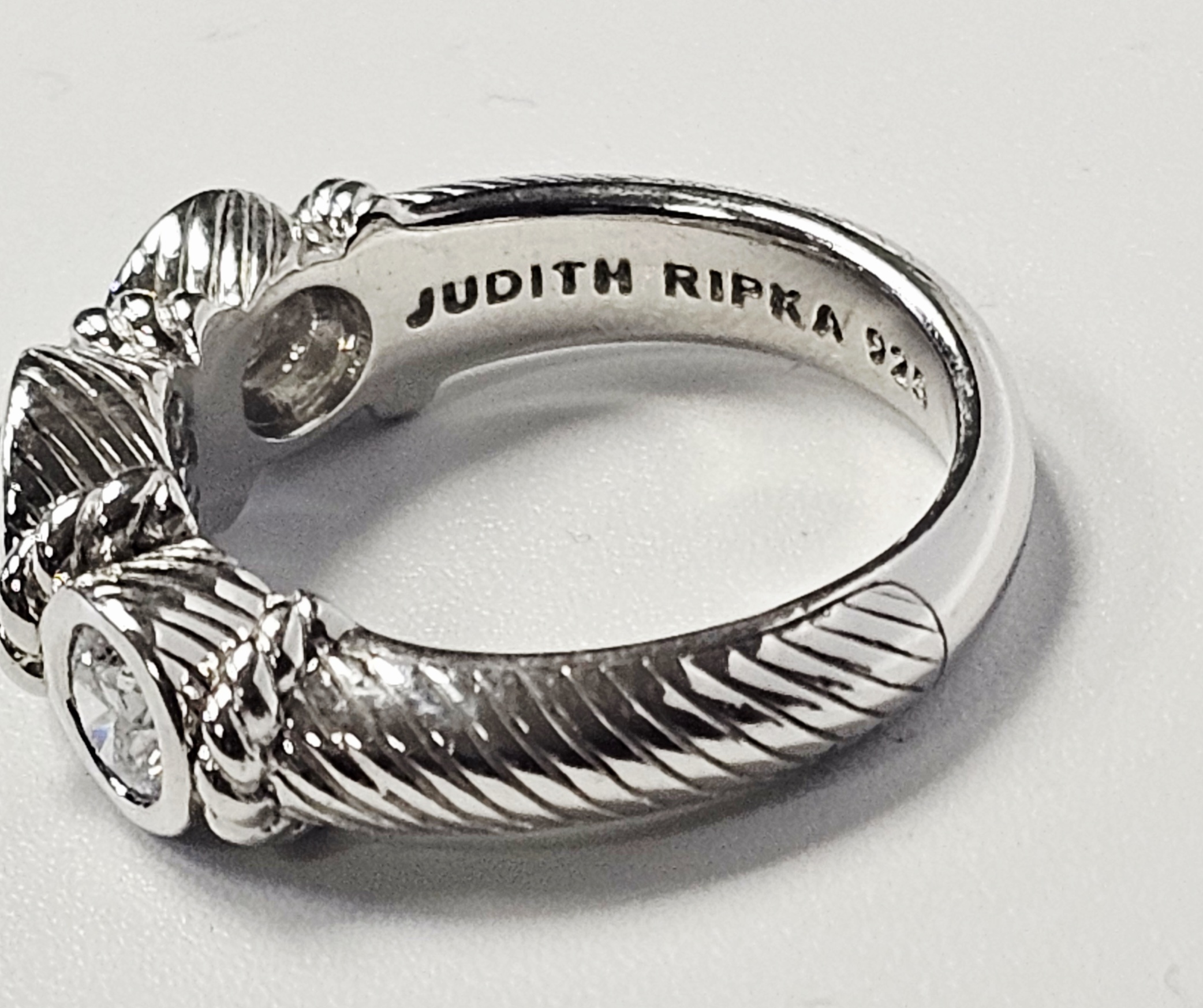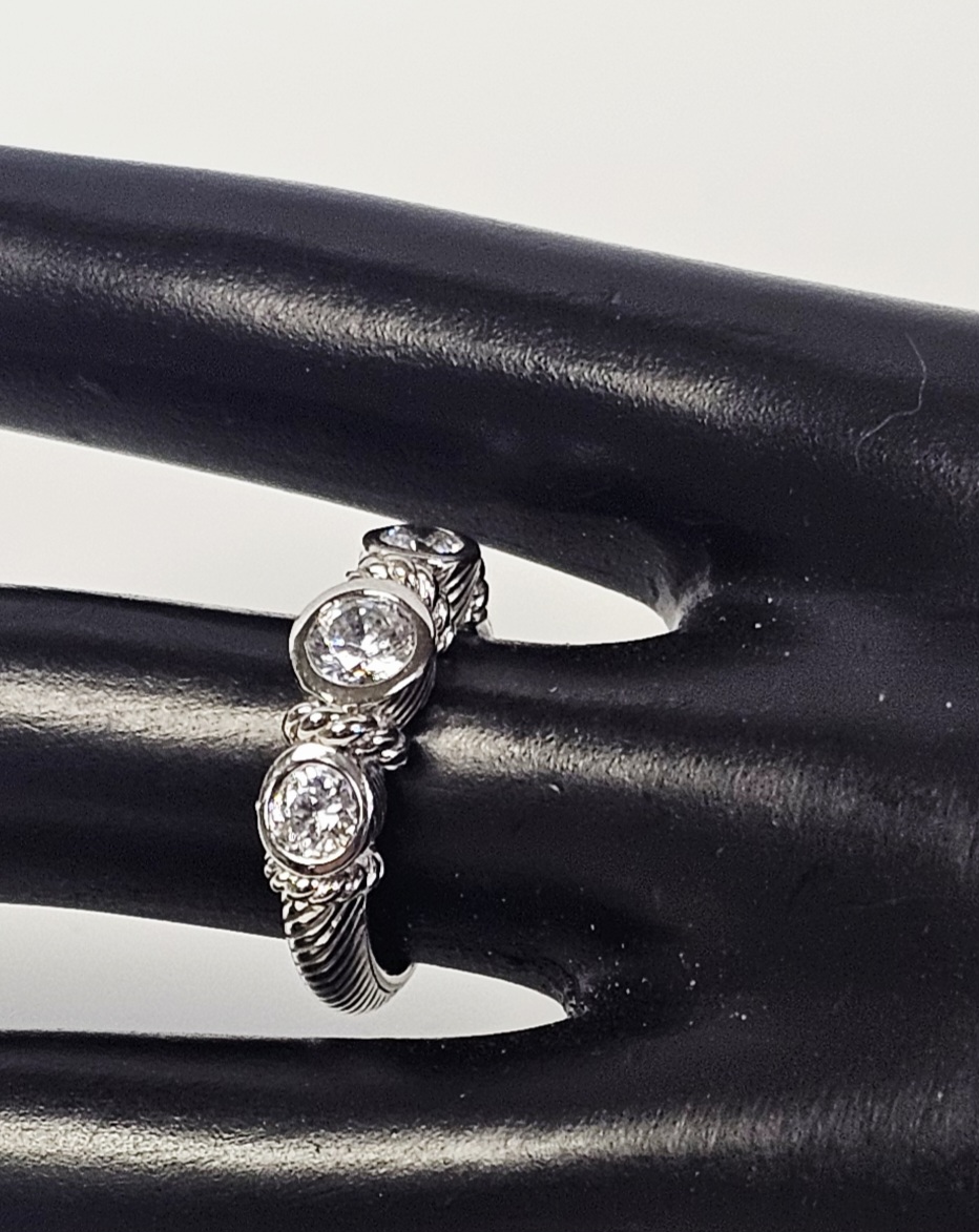 This ring is designed by Judith Ripka and crafted in sterling silver. The design features three graduated, round faceted clear cubic zirconia stones, each secured in a bezel setting. The band and settings are accented with a twisted cable-texture motif characteristic of the designer. The interior of the band is stamped with the maker’s mark JUDITH RIPKA, the purity mark 925, the stone identification CZ, and the origin THAILAND. Size: 6 Weight: 6.1 grams. The ring is in good condition with minor surface scratches and light tarnish consistent with light wear.