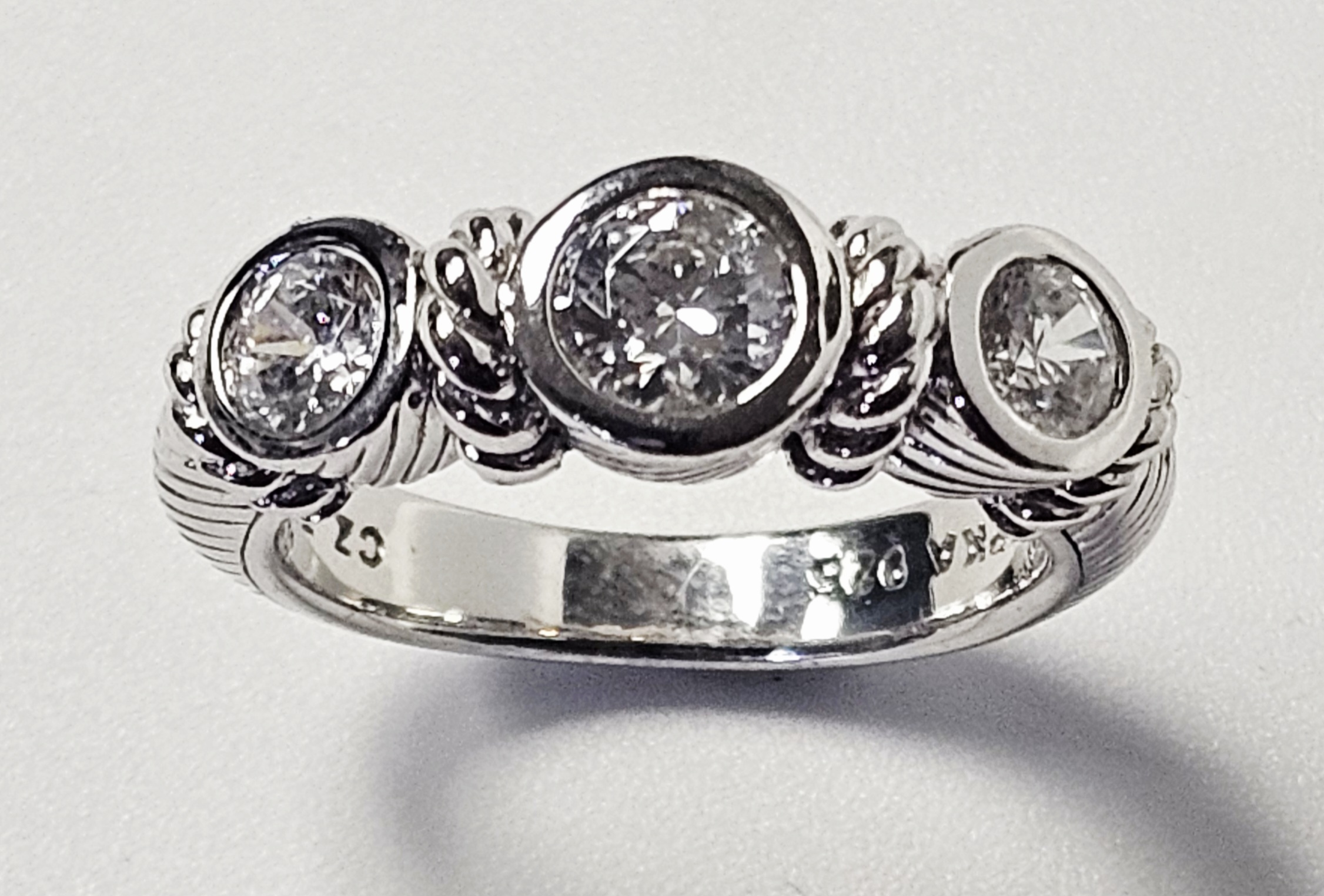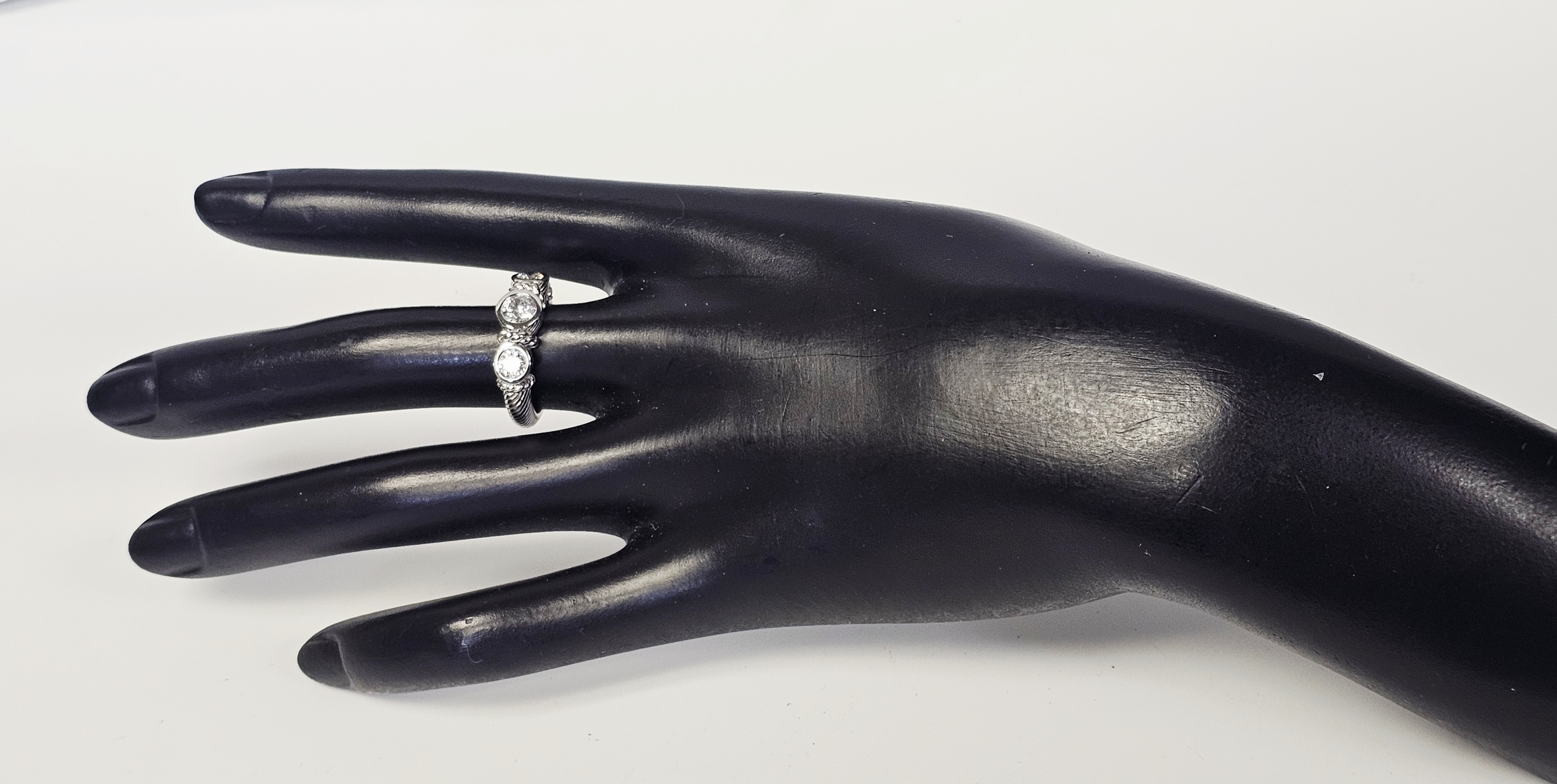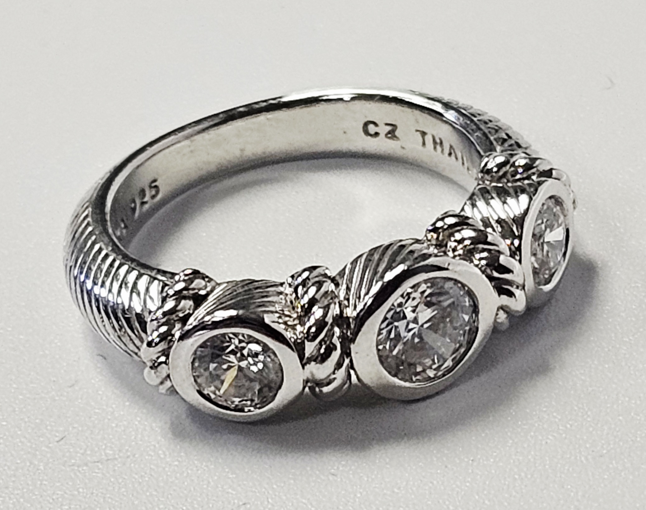 This ring is designed by Judith Ripka and crafted in sterling silver. The design features three graduated, round faceted clear cubic zirconia stones, each secured in a bezel setting. The band and settings are accented with a twisted cable-texture motif characteristic of the designer. The interior of the band is stamped with the maker’s mark JUDITH RIPKA, the purity mark 925, the stone identification CZ, and the origin THAILAND. Size: 6 Weight: 6.1 grams. The ring is in good condition with minor surface scratches and light tarnish consistent with light wear.