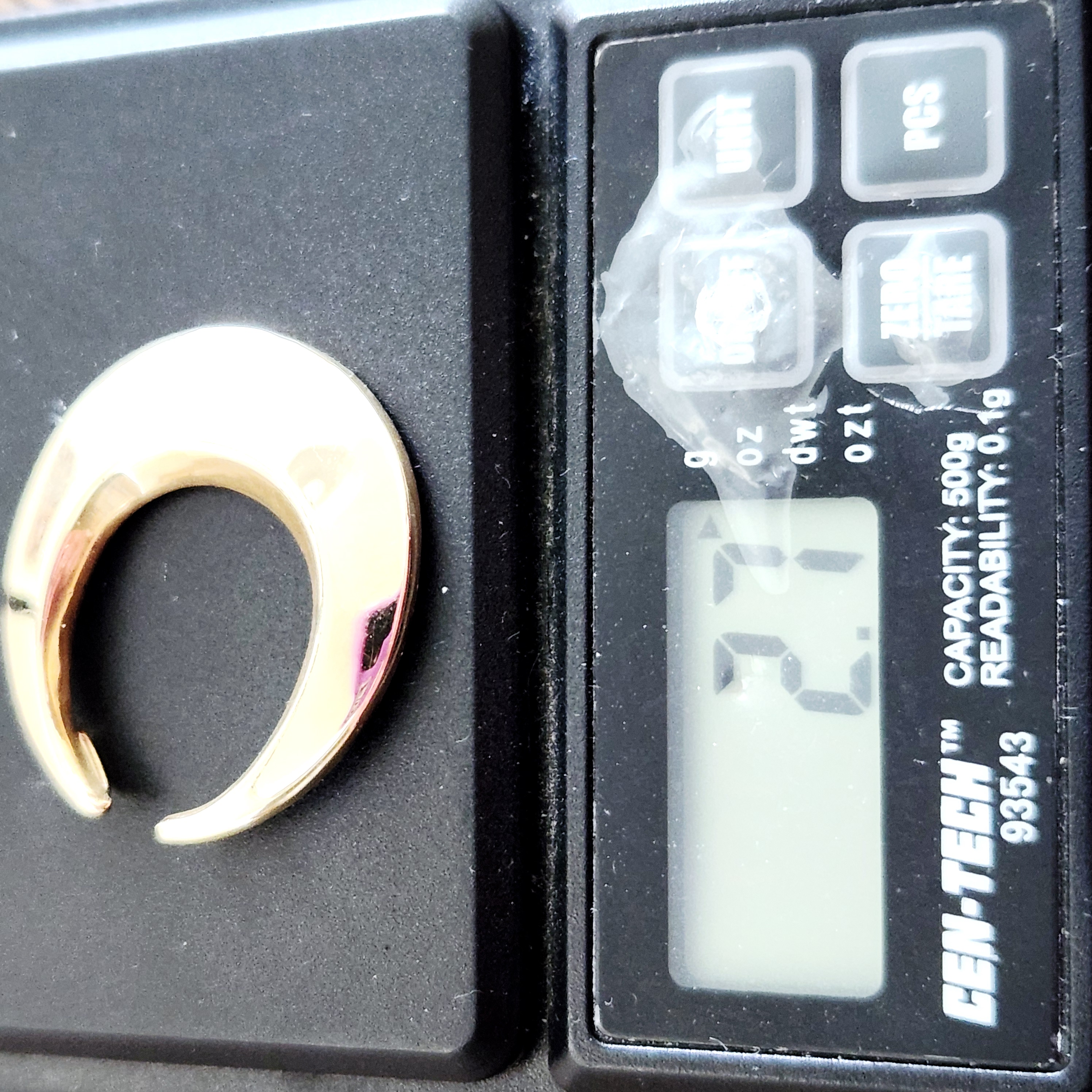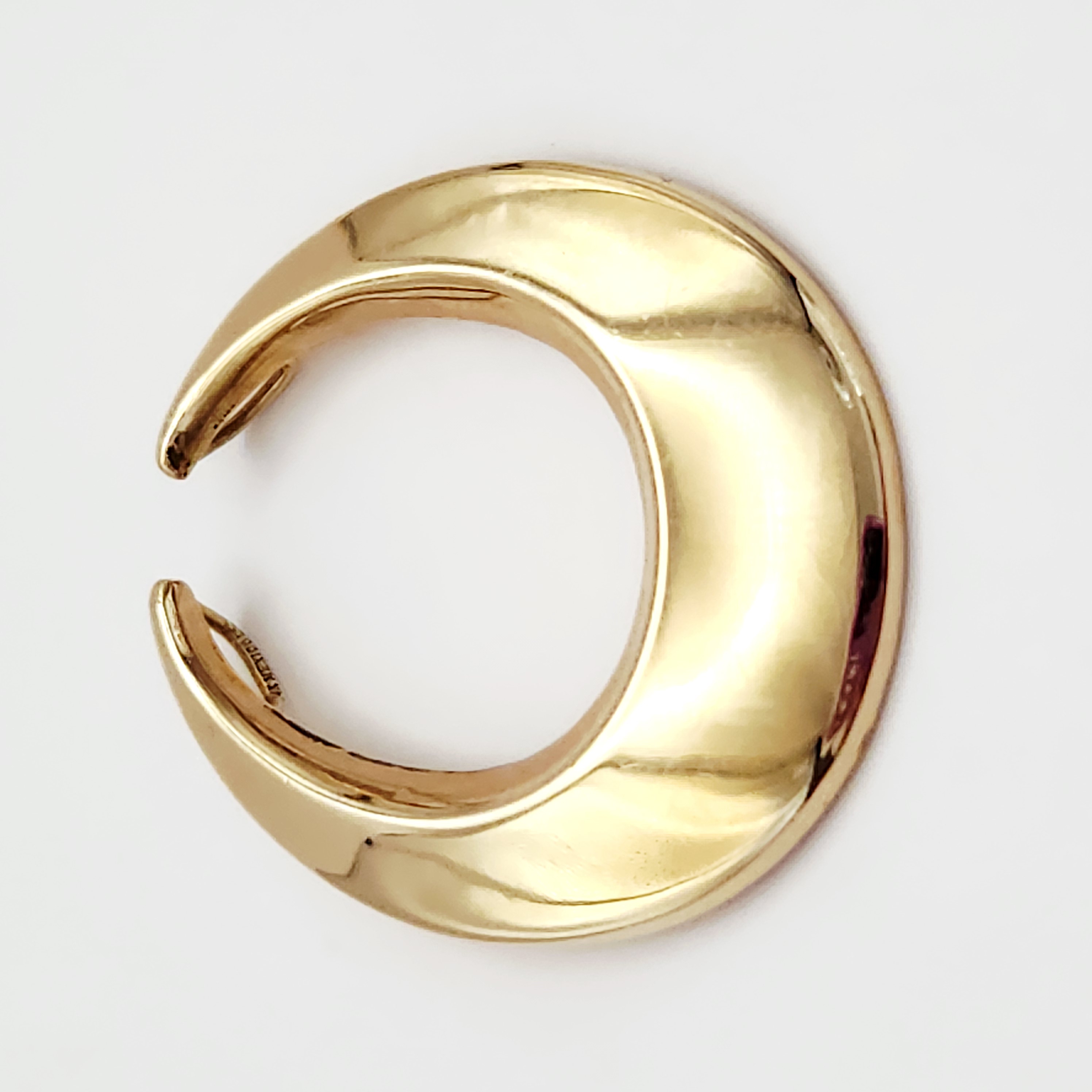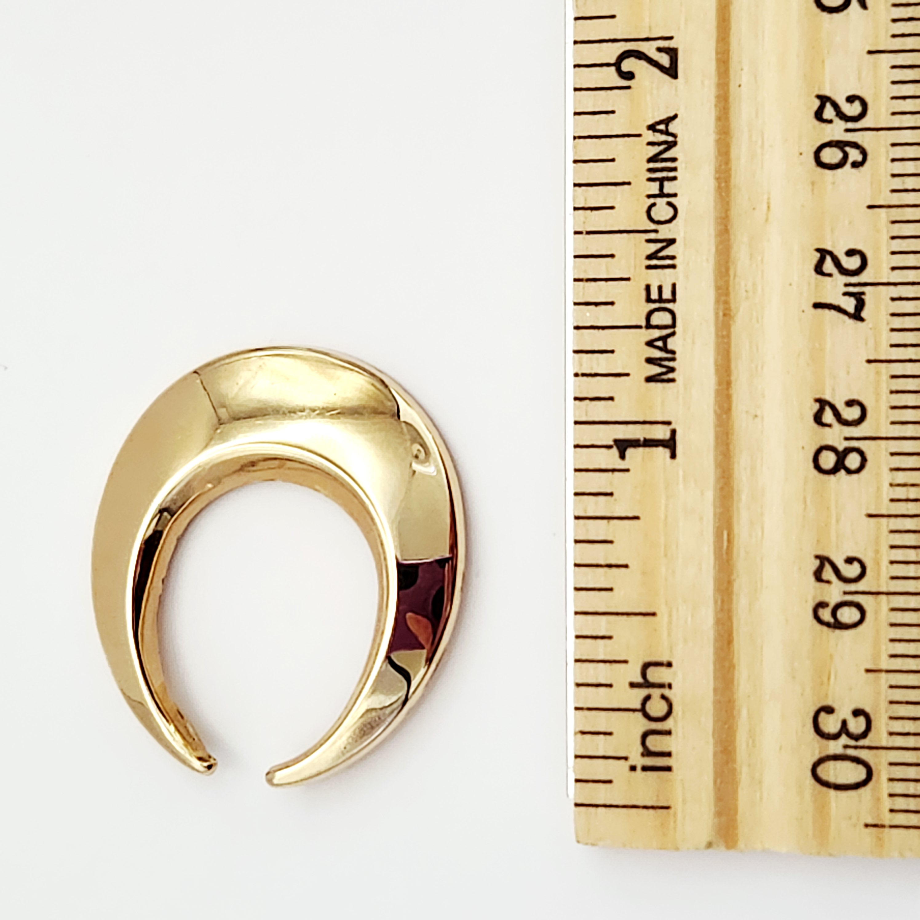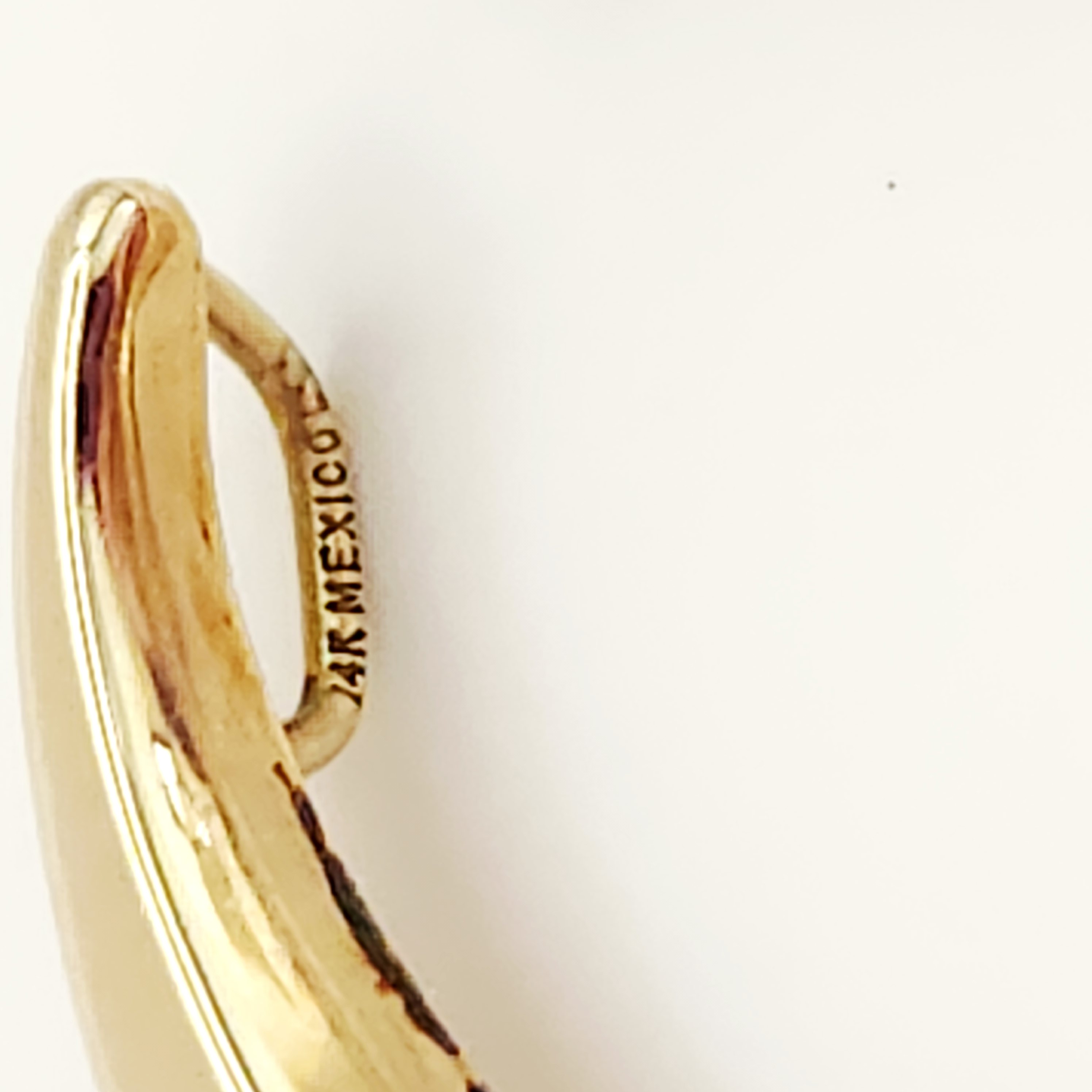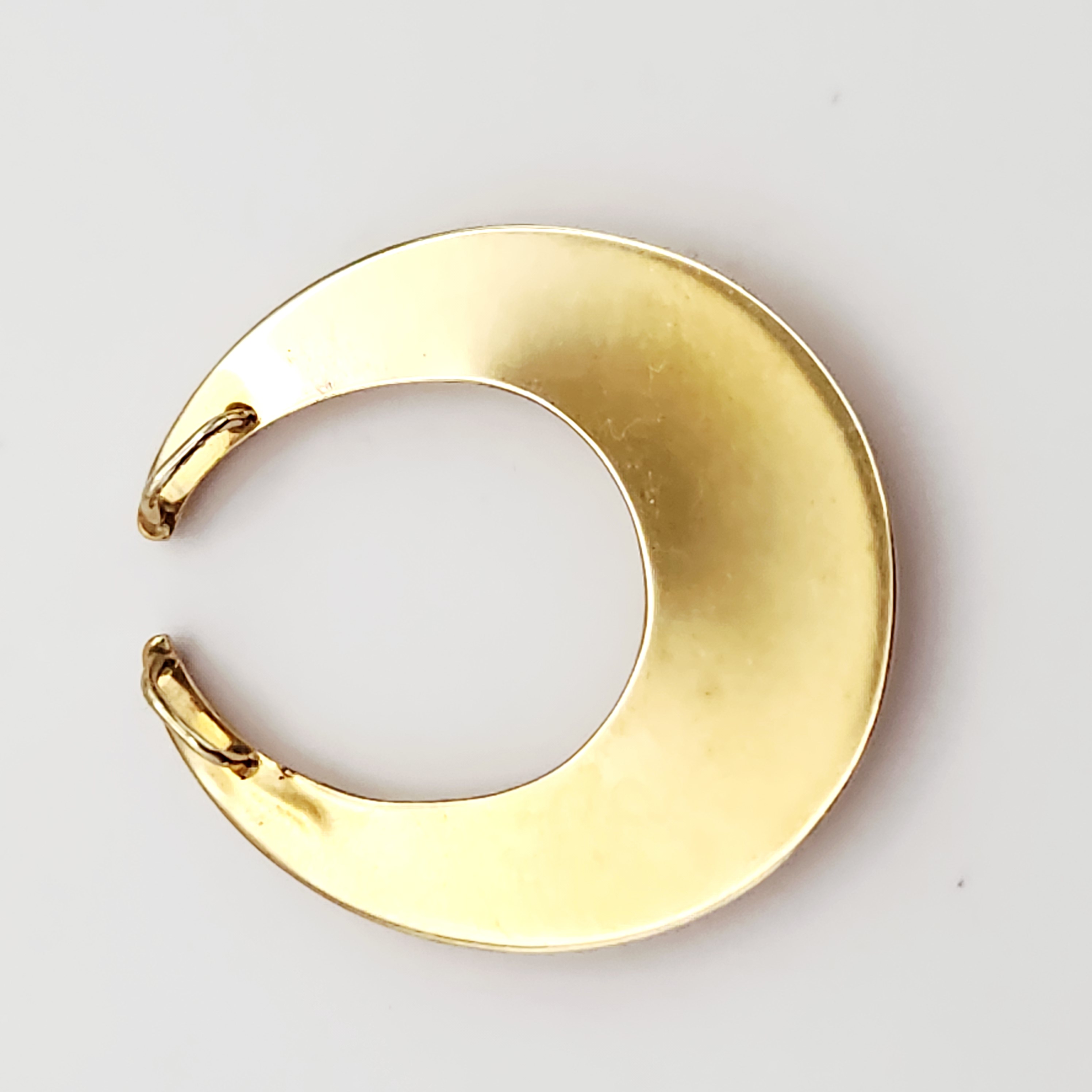 This crescent-shaped pendant is crafted in 14 karat yellow gold. The design features a high-polish, convex front and a flat reverse. It is constructed with two integrated bales at the tips for suspension. The piece bears the hallmark 14K MEXICO on one of the bales.