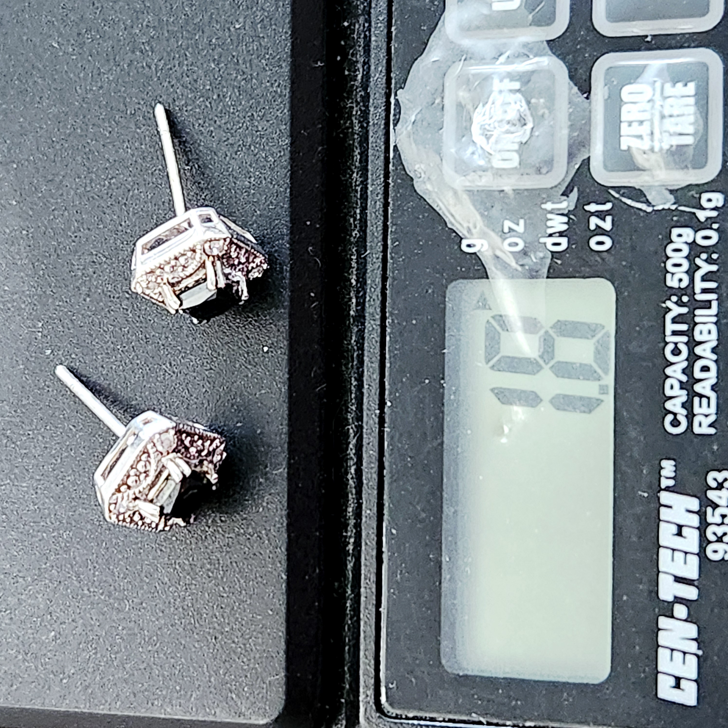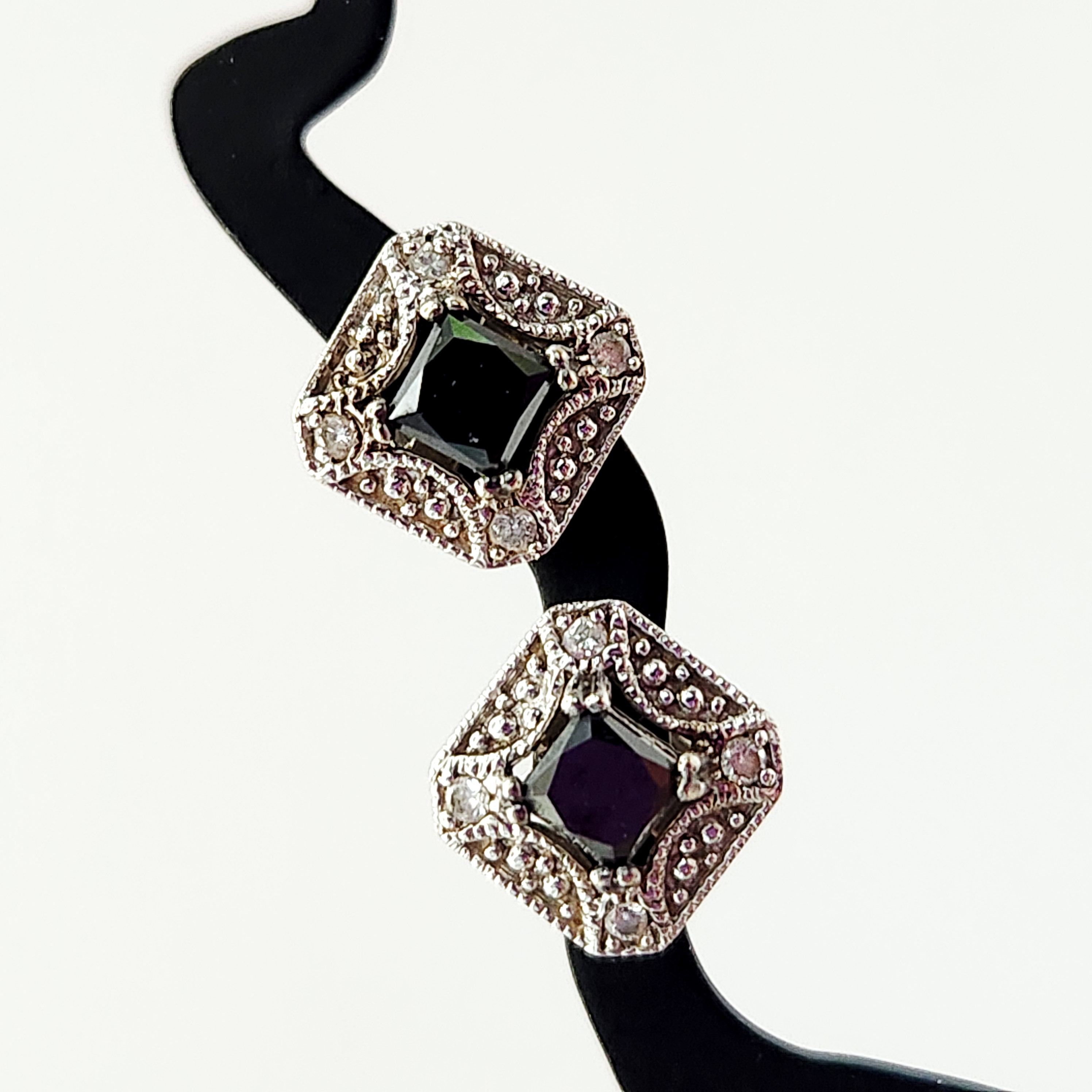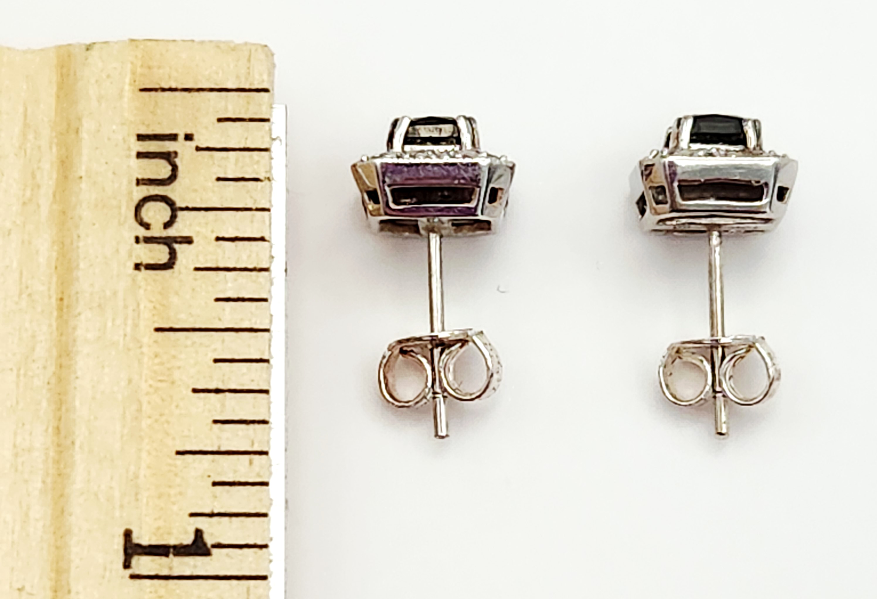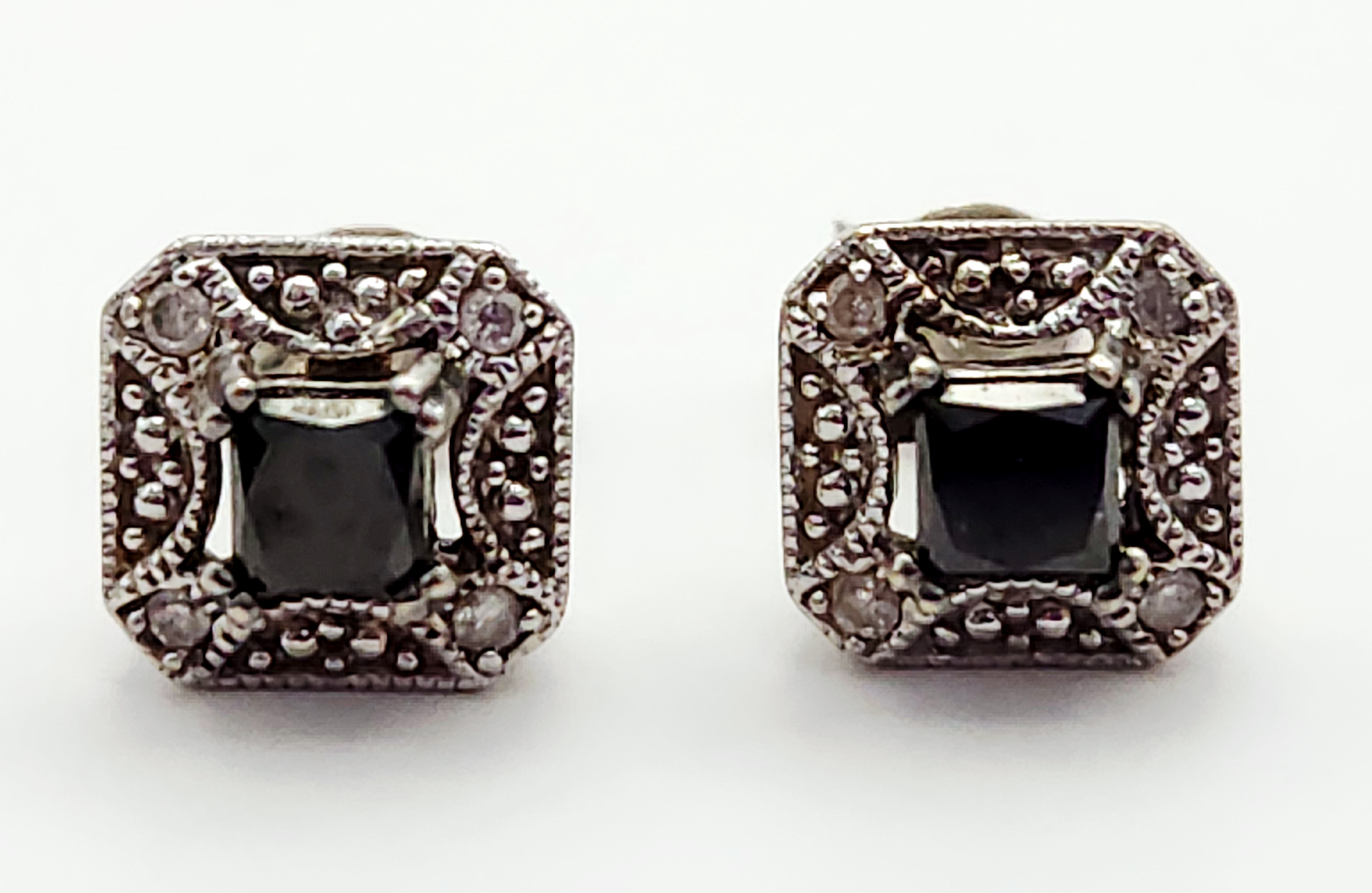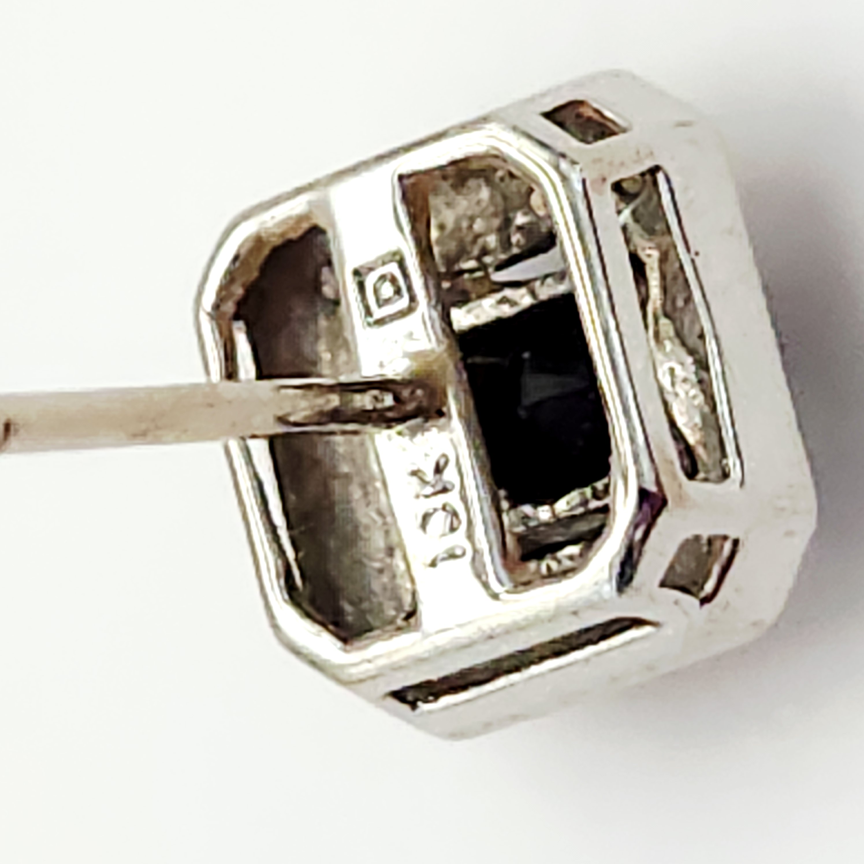 This pair of square halo stud earrings is crafted in 10-karat white gold. Each earring features a central princess-cut black gemstone, which appears to be onyx or spinel, surrounded by a border of small, round, clear stones. The settings include milgrain-style beaded detailing and open-work galleries. The reverse of the earring bodies is stamped 10K, while the removable friction backs are marked 925 and ITALY, indicating they are sterling silver.