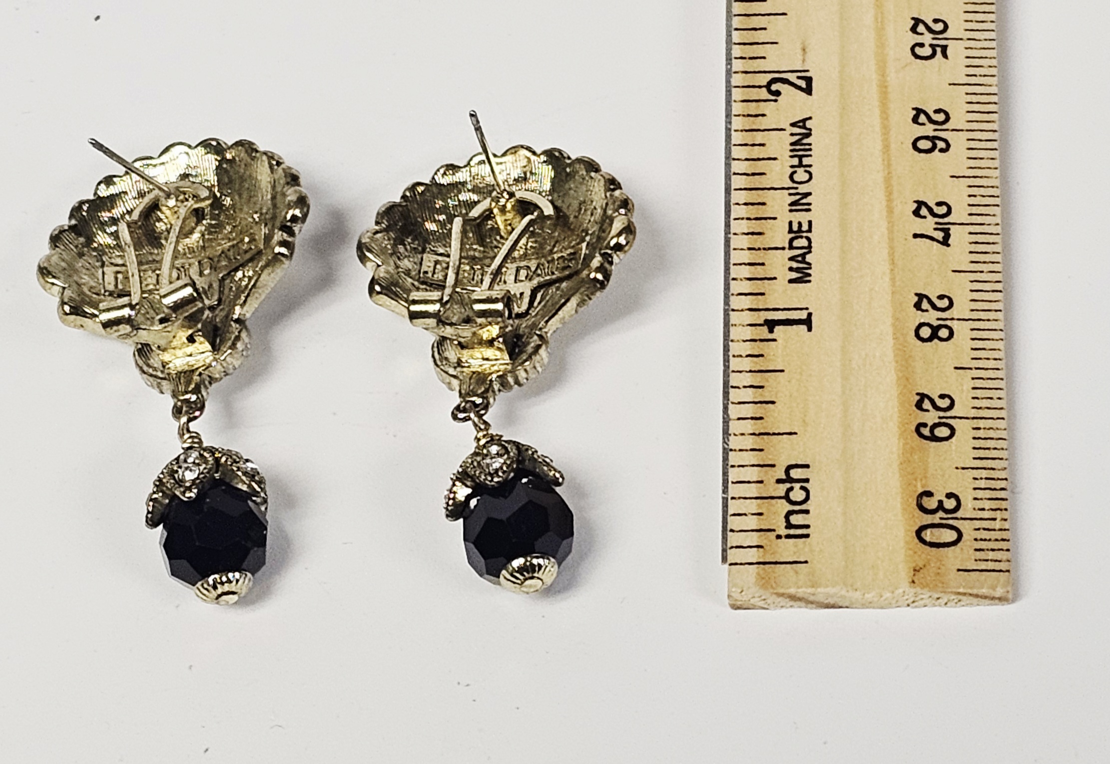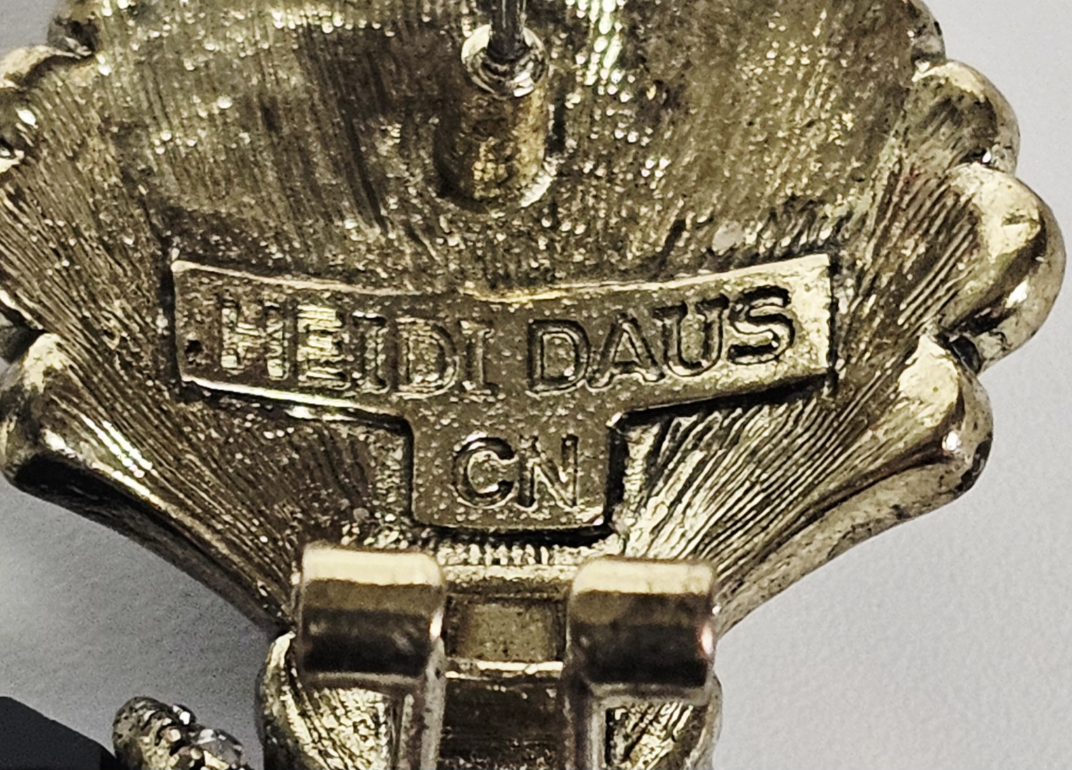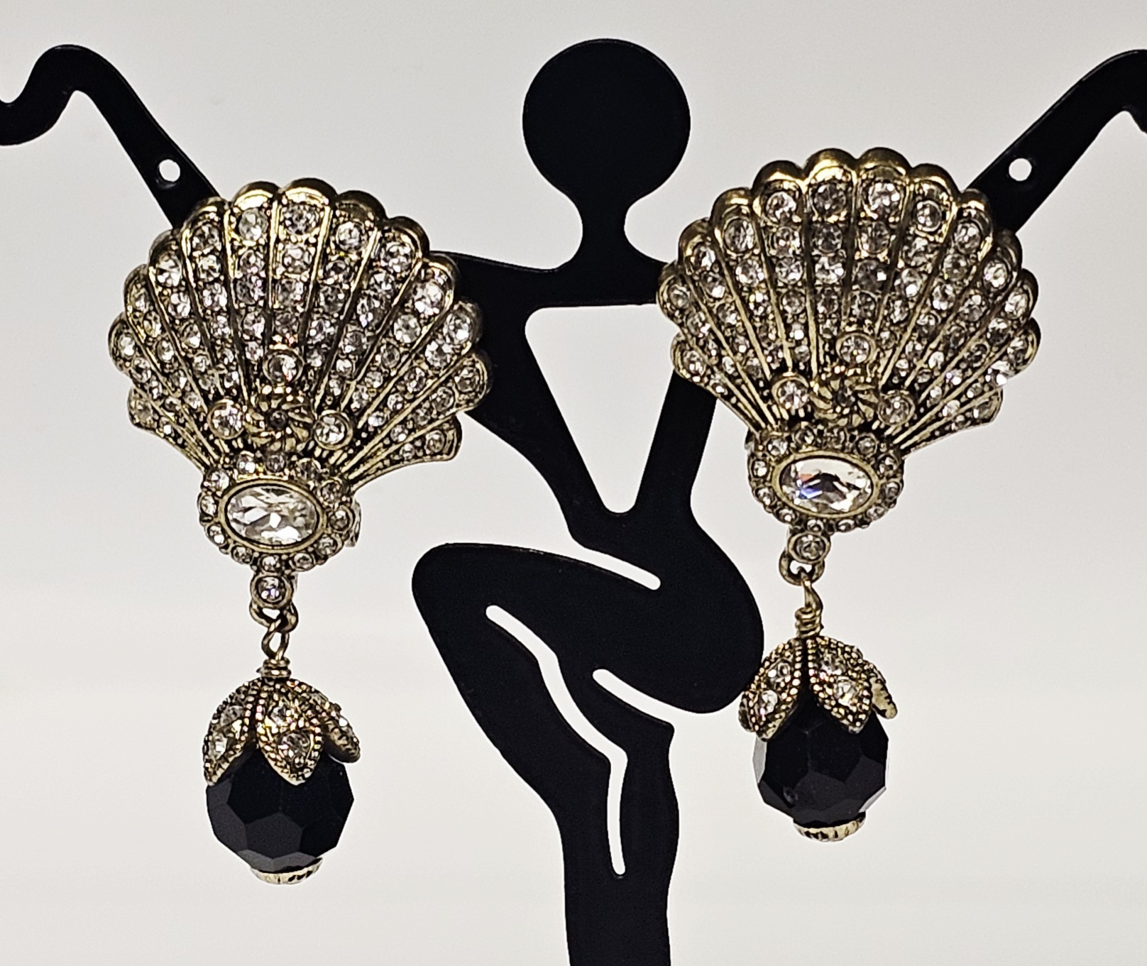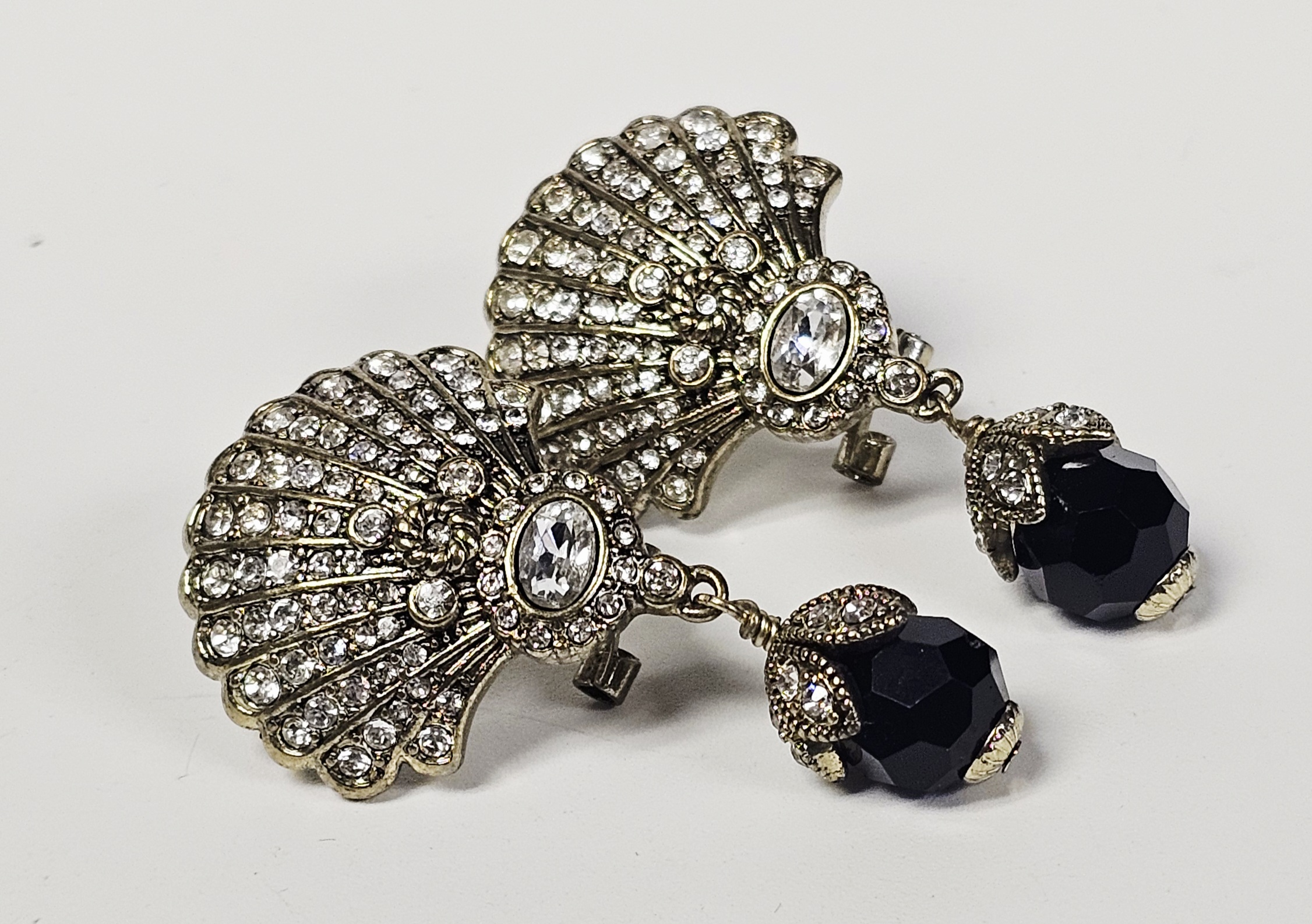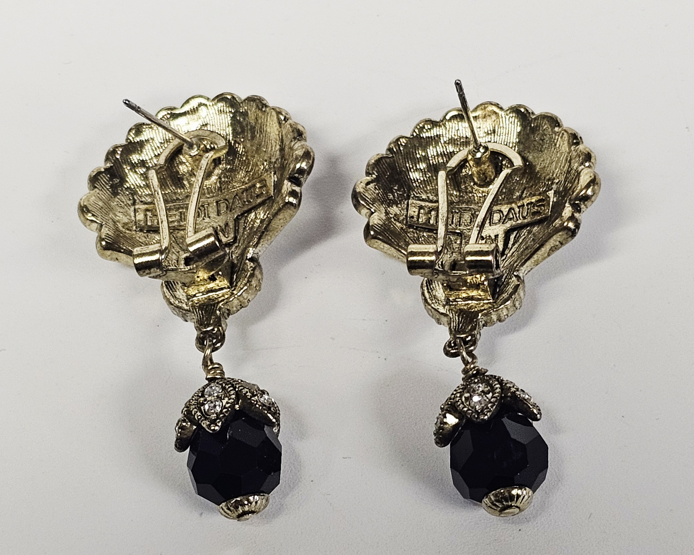 This matched pair of drop earrings is produced by designer Heidi Daus. The earrings feature fan-shaped tops with a shell-like ribbed texture, pavé-set with numerous round colorless crystals and a central oval-cut colorless crystal. Suspended from the tops are large, faceted black beads, likely glass, held by decorative caps set with additional colorless crystals. The pieces are constructed from an antiqued gold-tone base metal. The reverse of each earring contains a raised rectangular cartouche with the characters HEIDI DAUS above a smaller rectangle marked CN, indicating the country of origin as China. The earrings are designed for pierced ears, featuring a post supplemented with a hinged omega-back clip for secure wear. Length: Approximately 2 inches. The earrings are in good used condition. All stones are present and appear securely set. There is minor surface wear and oxidation to the metal finish consistent with age and use.