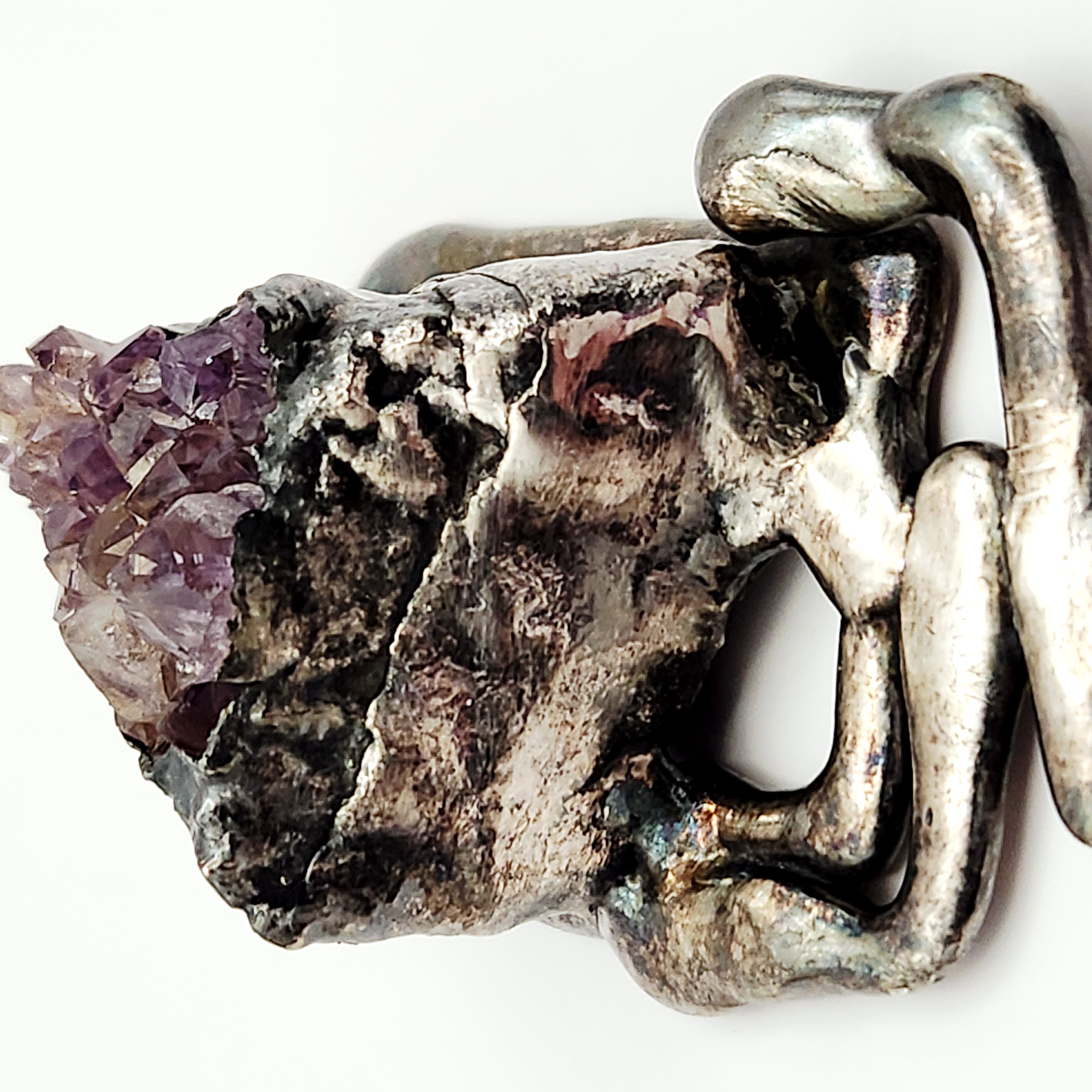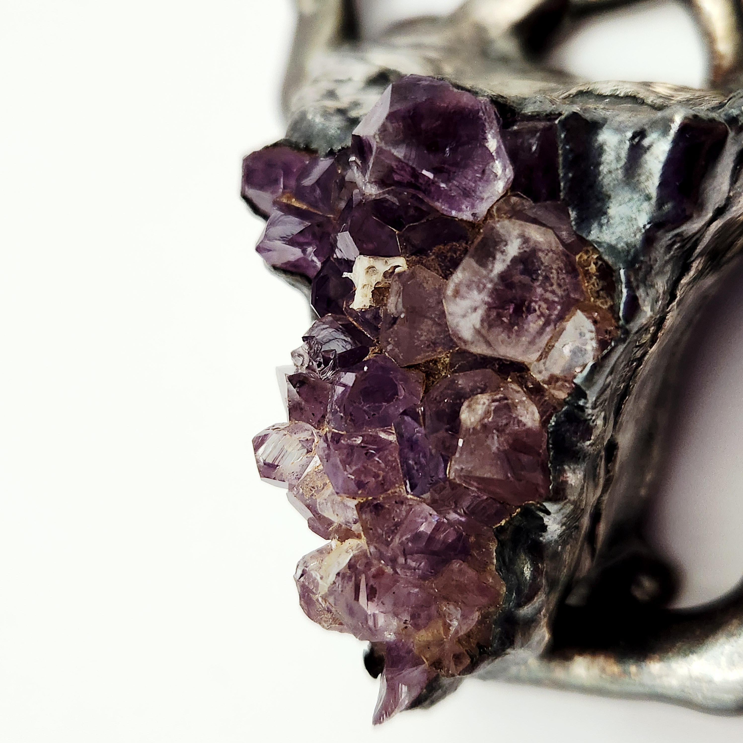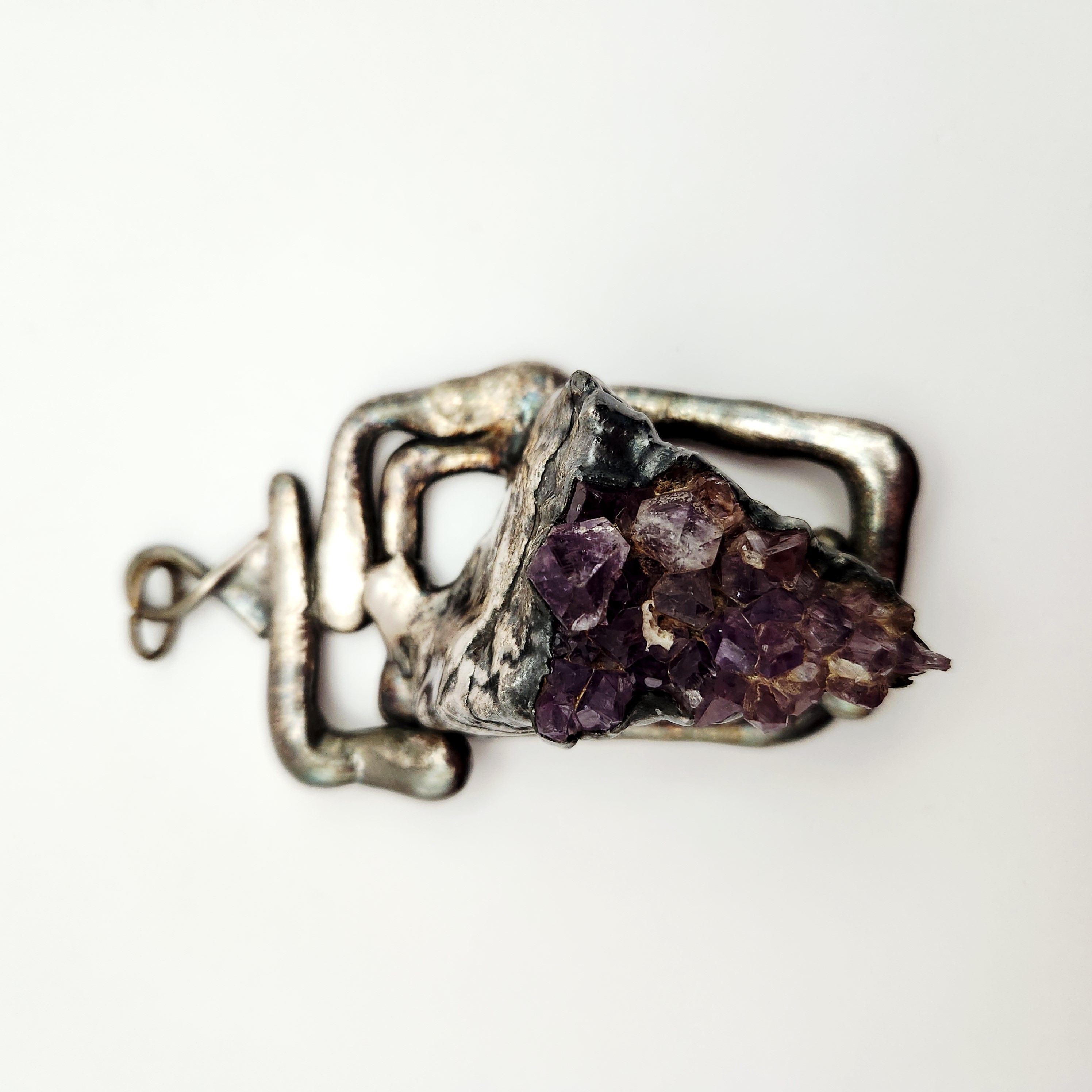 This modernist pendant is attributed to the Finnish designer Reino Olavi Saastamoinen, featuring a design consistent with his 1970s jewelry production. The piece is centered with a natural amethyst druzy cluster containing multiple purple quartz crystals of varying sizes and heights. The gemstone is set into a heavy metal frame characterized by a brutalist, molten texture and a dark oxidized finish. The reverse of the pendant shows a hollowed construction with visible iridescent and purple-toned tarnish. The piece includes an integrated sculptural bail. No maker marks or metal purity hallmarks are visible on the item.