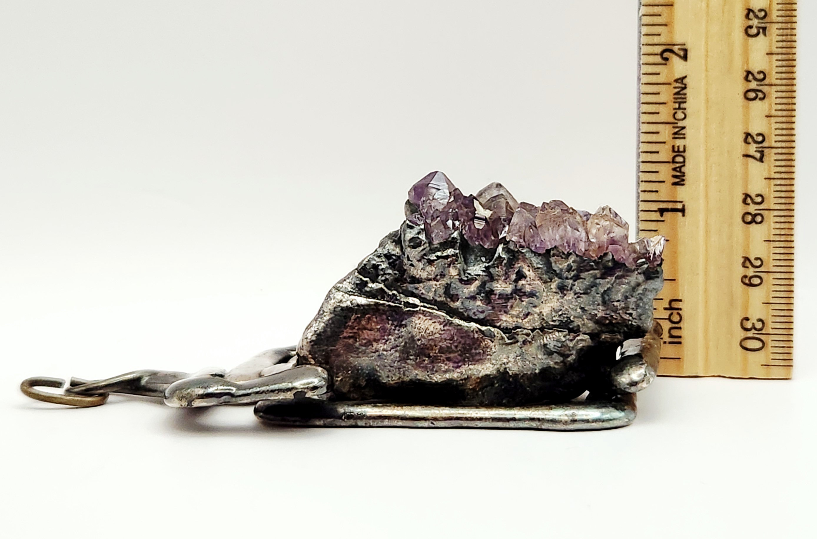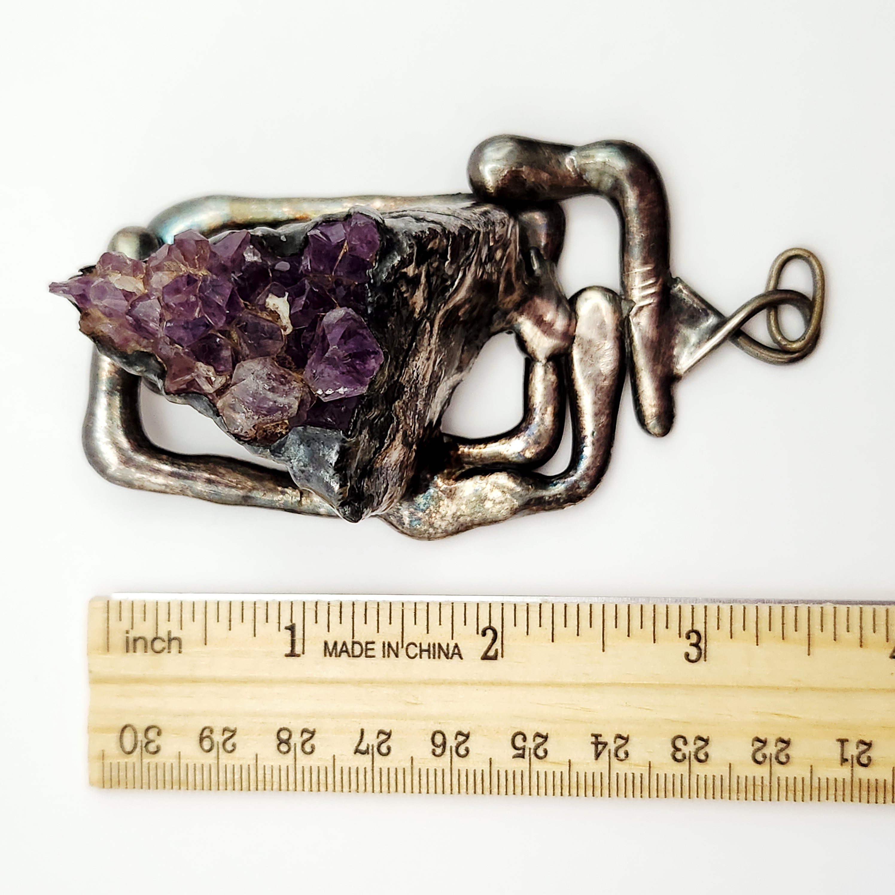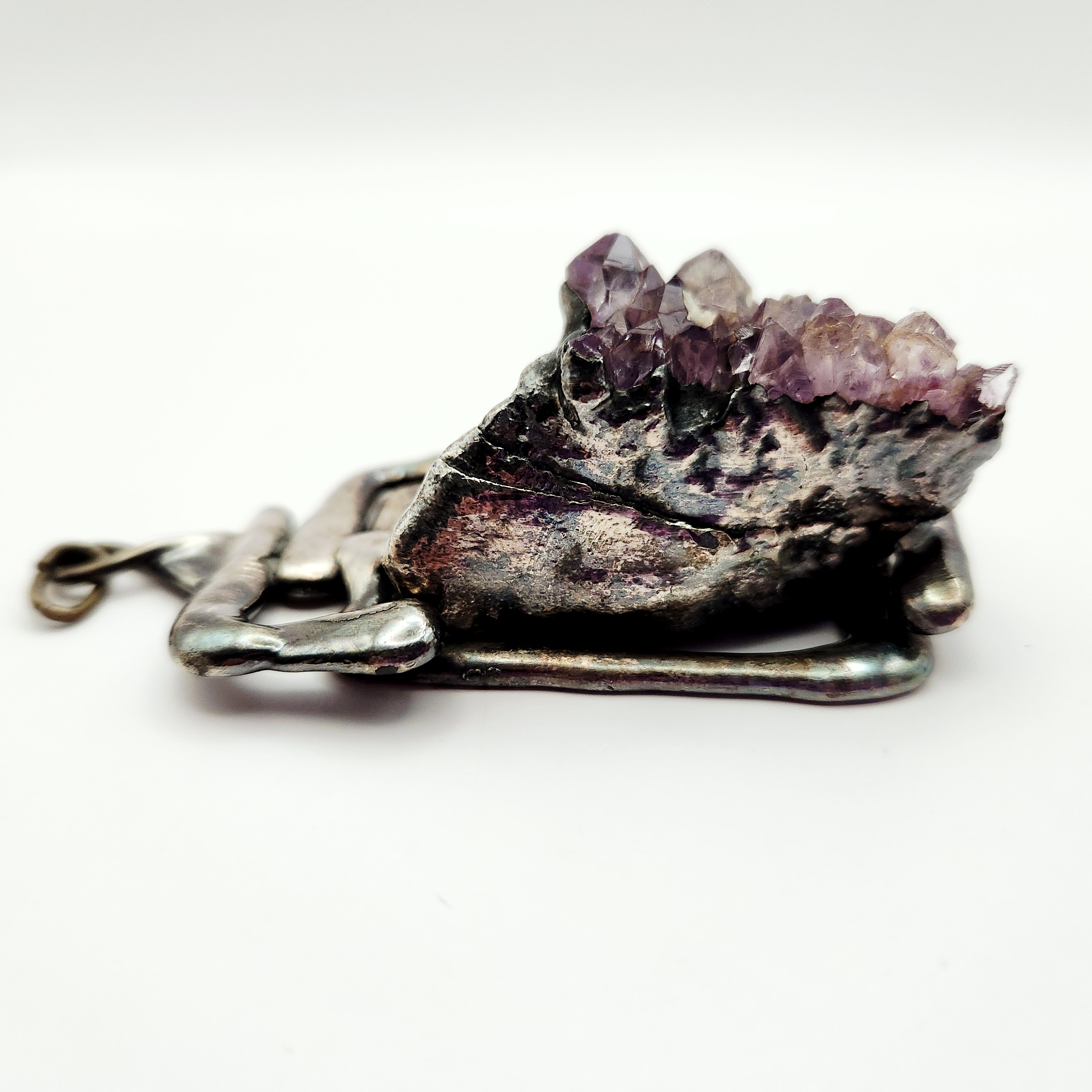The pendant is in good vintage condition. The metal surfaces exhibit significant oxidation and tarnish consistent with the brutalist aesthetic and the age of the piece. The amethyst crystals remain intact with natural inclusions and irregular surface features characteristic of raw druzy formations.