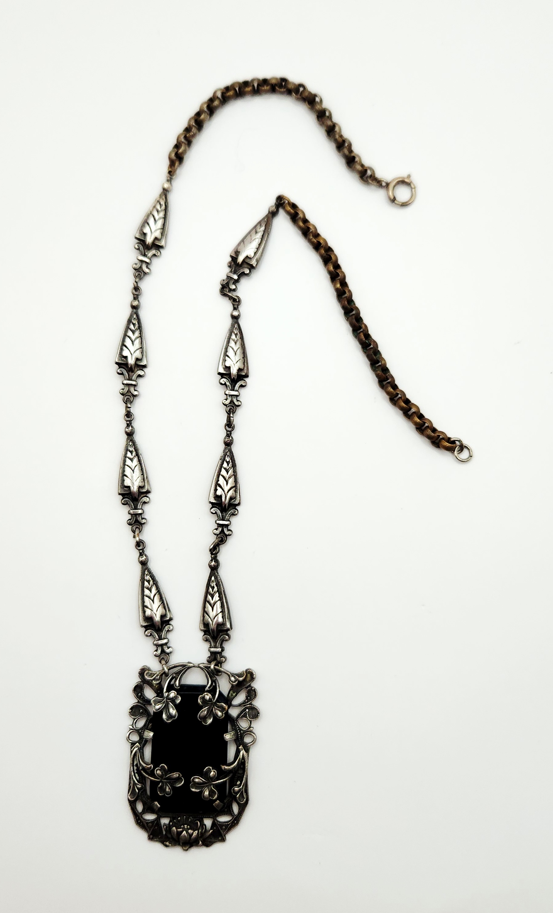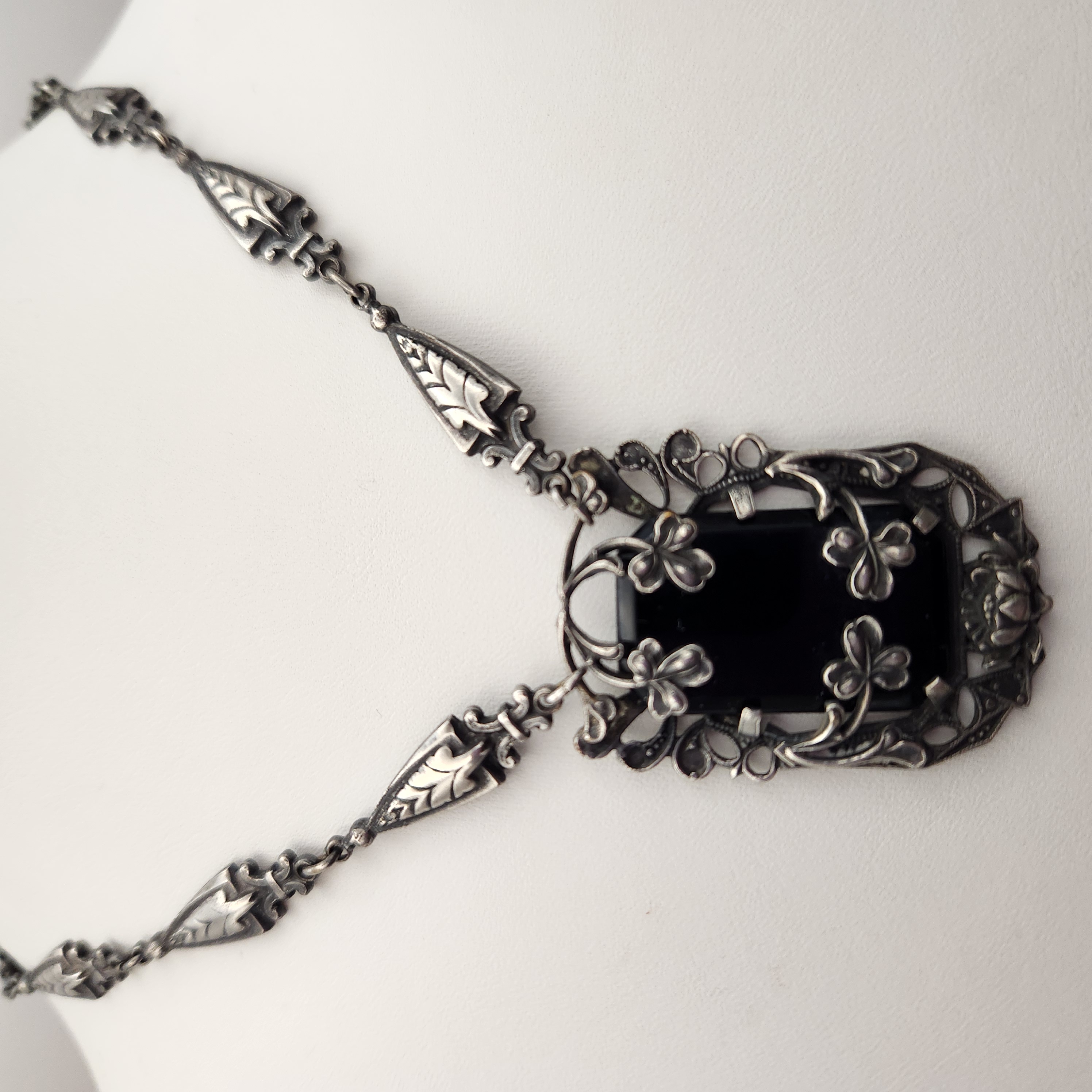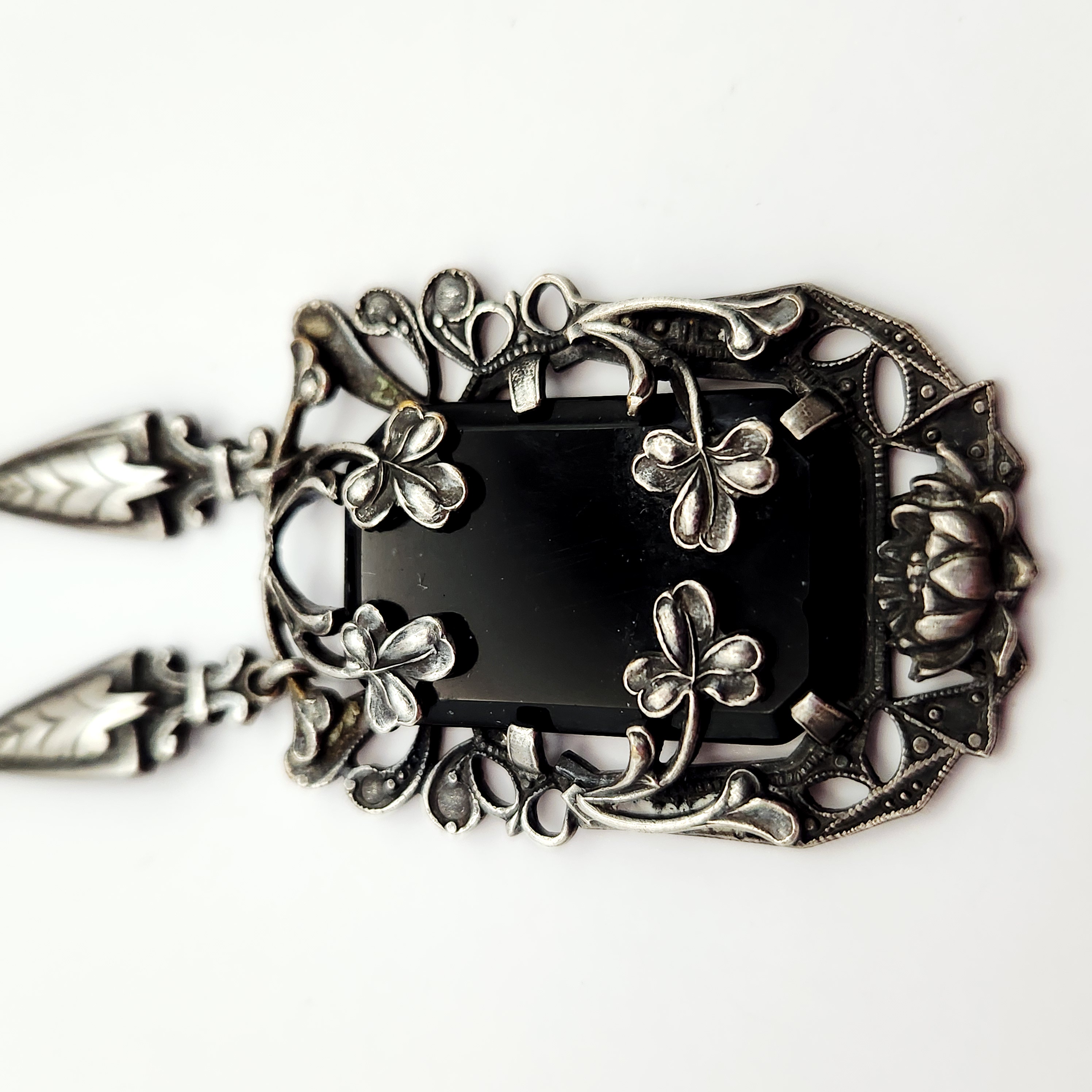A silver-tone necklace featuring an 18-inch chain with leaf-shaped links and an ornate rectangular black stone pendant measuring approximately 1.75 inches long decorated with shamrock motifs.