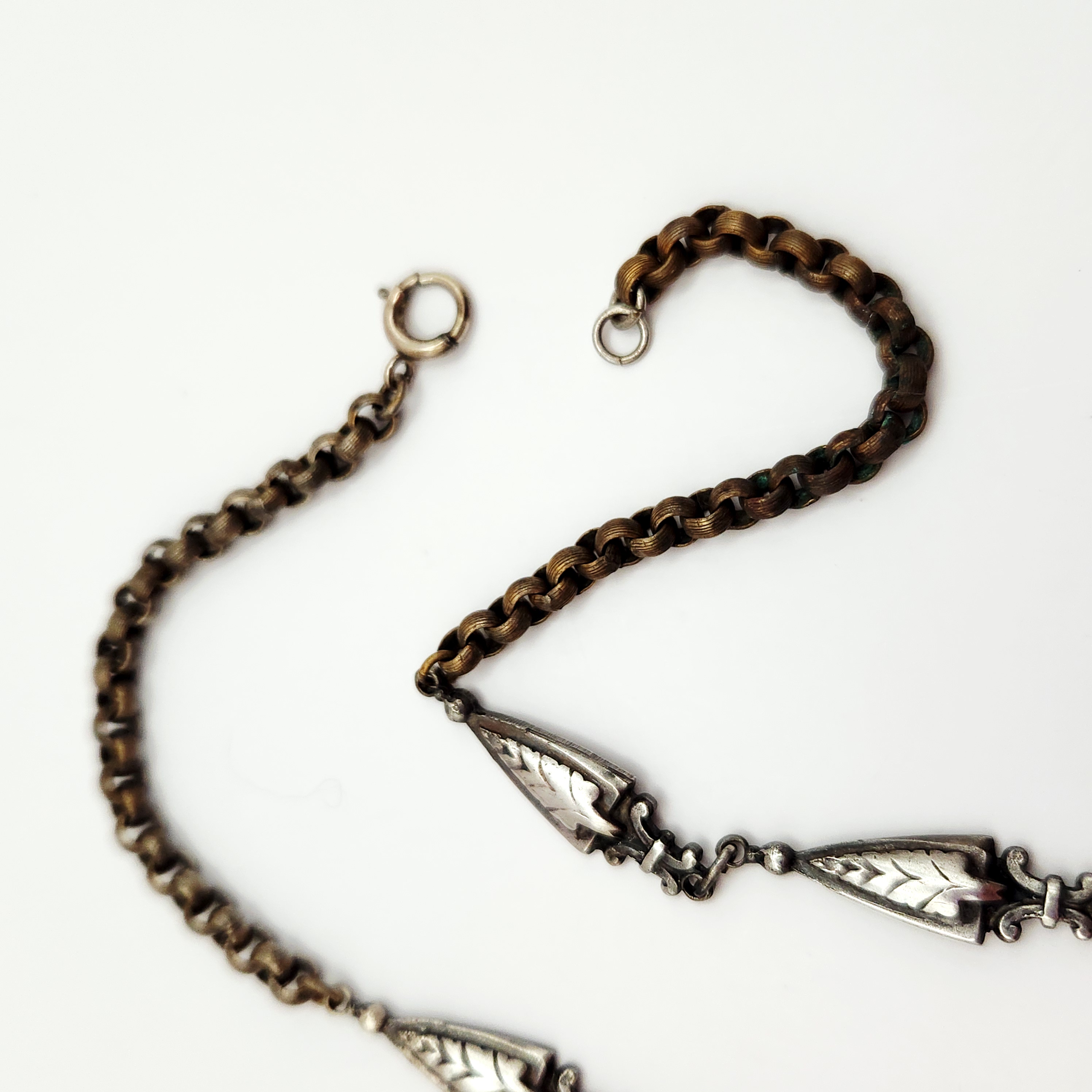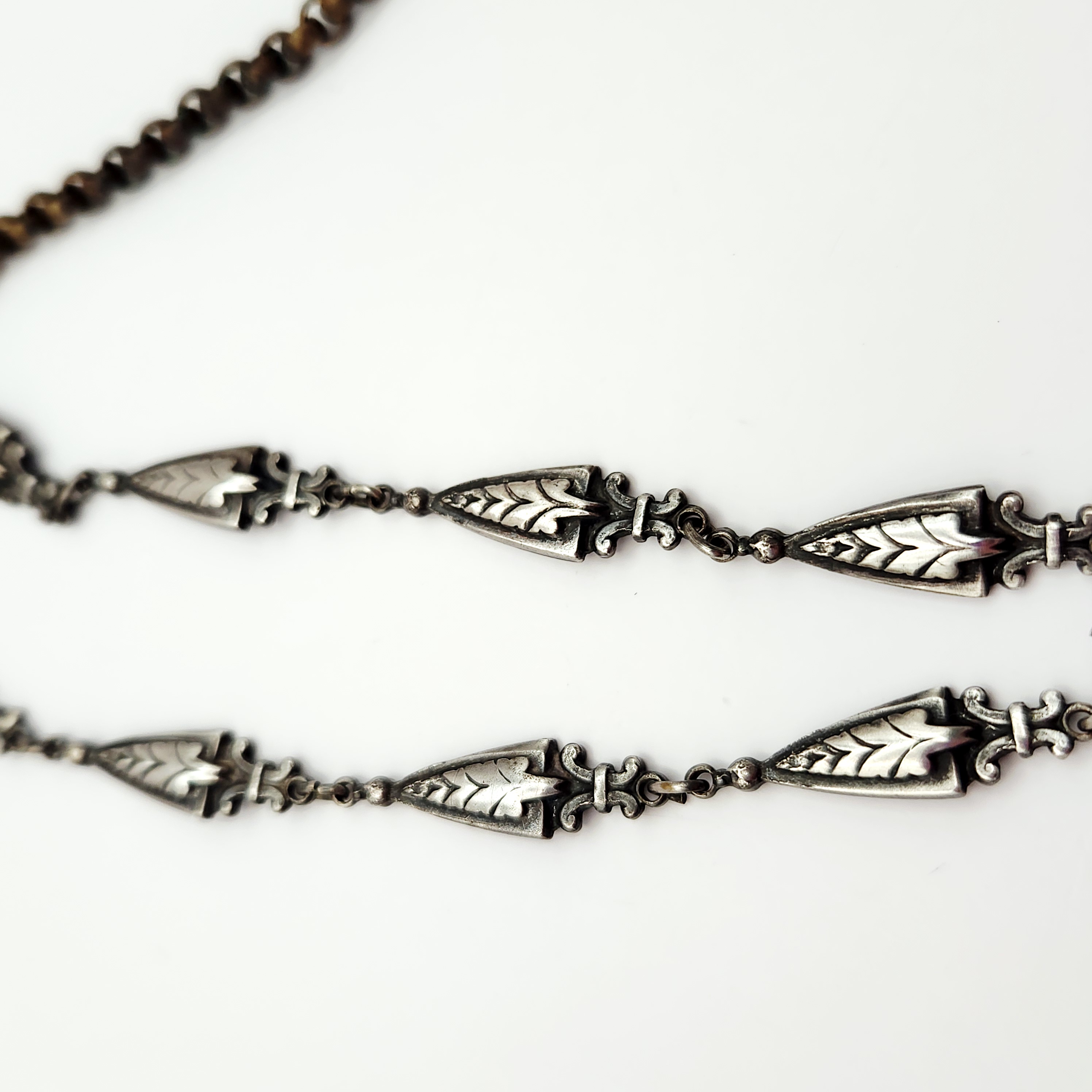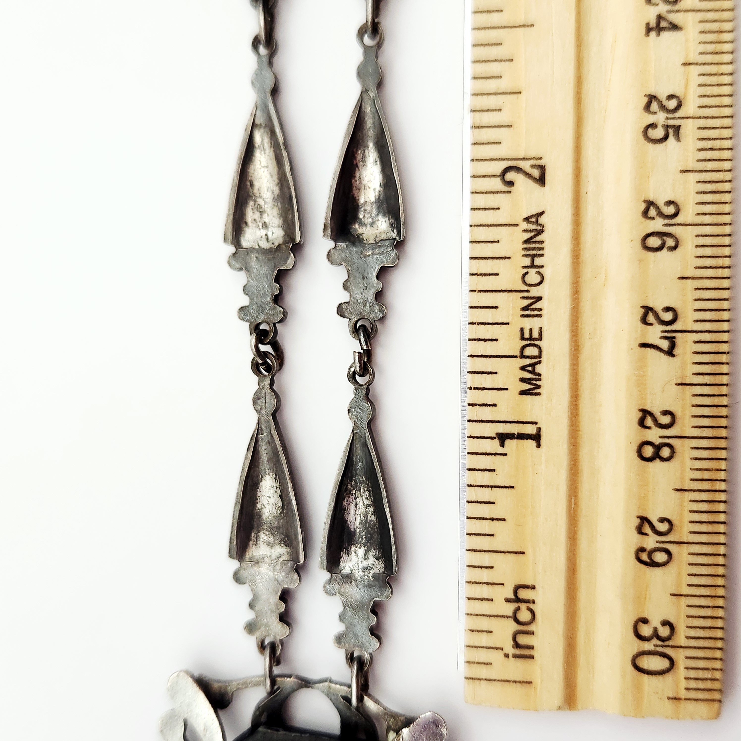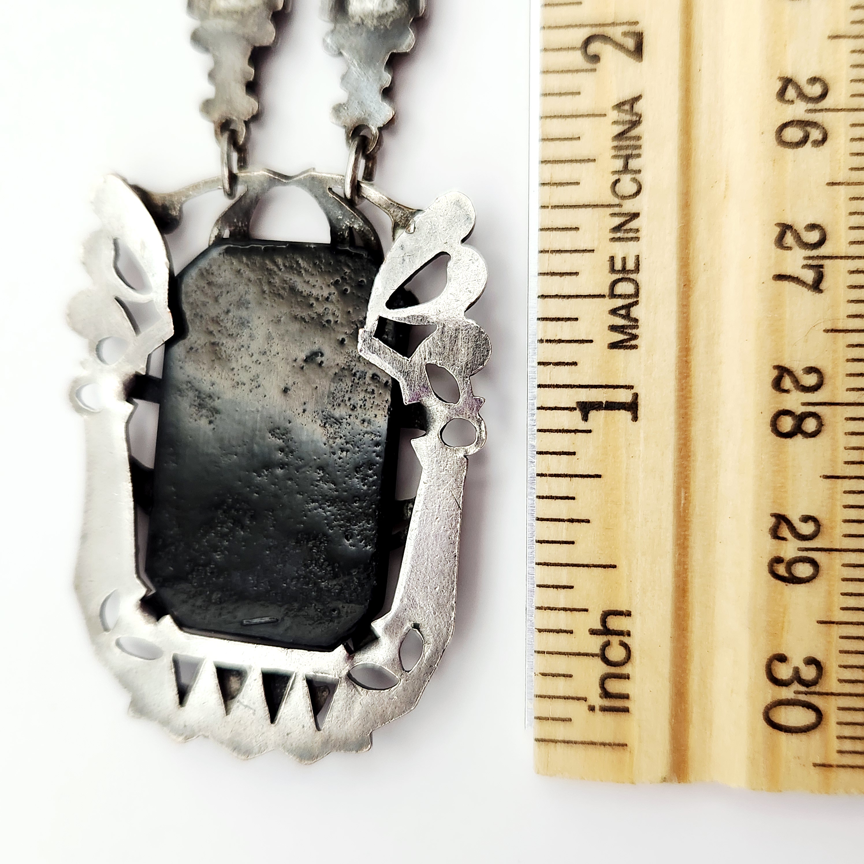 A silver-tone necklace featuring an 18-inch chain with leaf-shaped links and an ornate rectangular black stone pendant measuring approximately 1.75 inches long decorated with shamrock motifs.