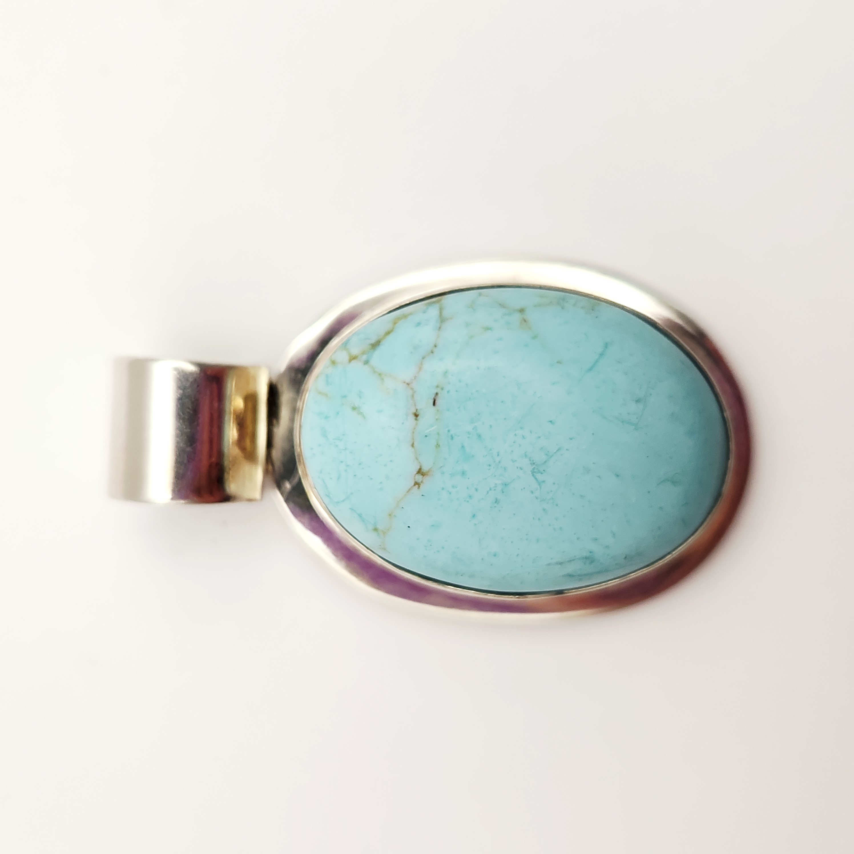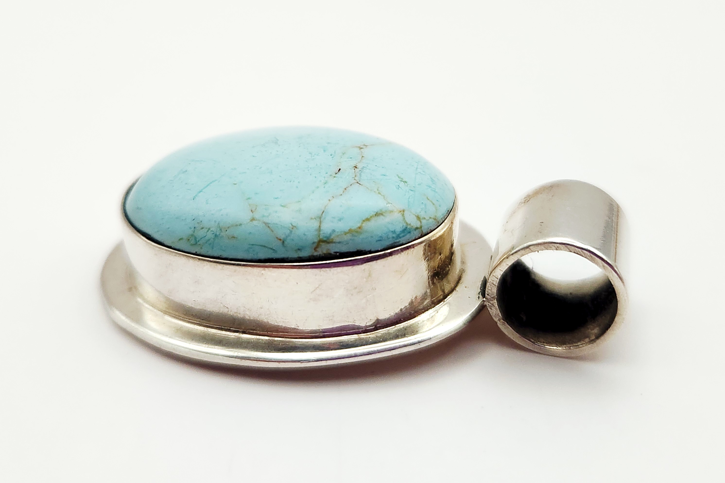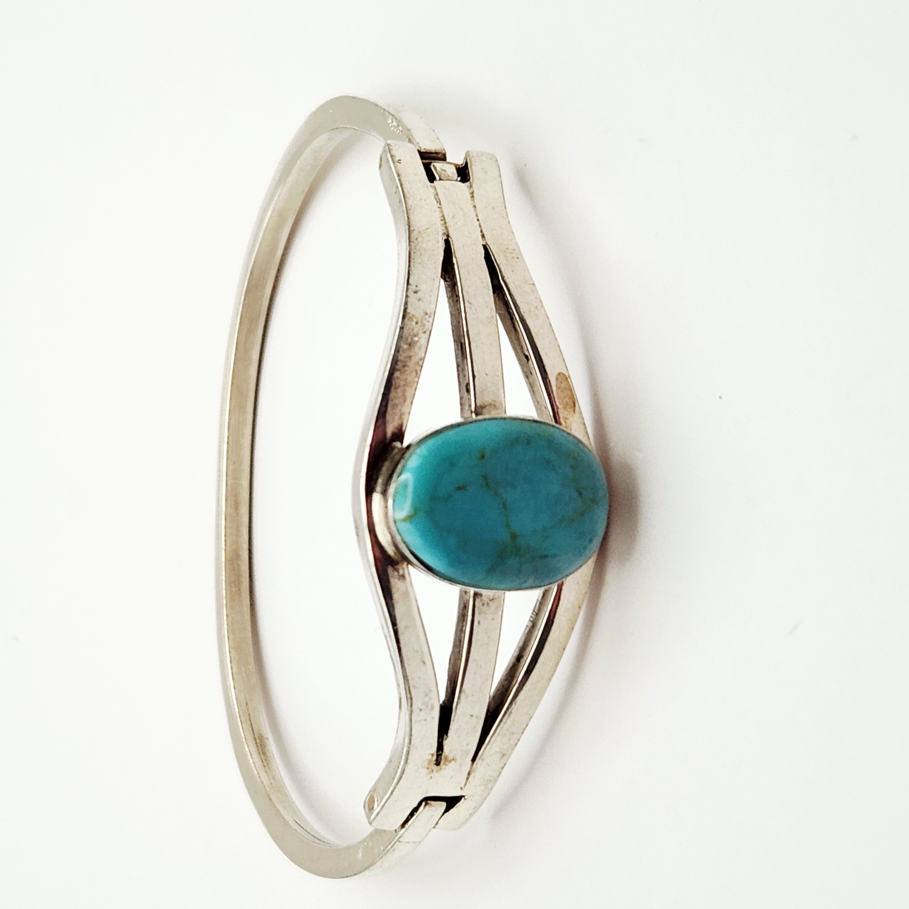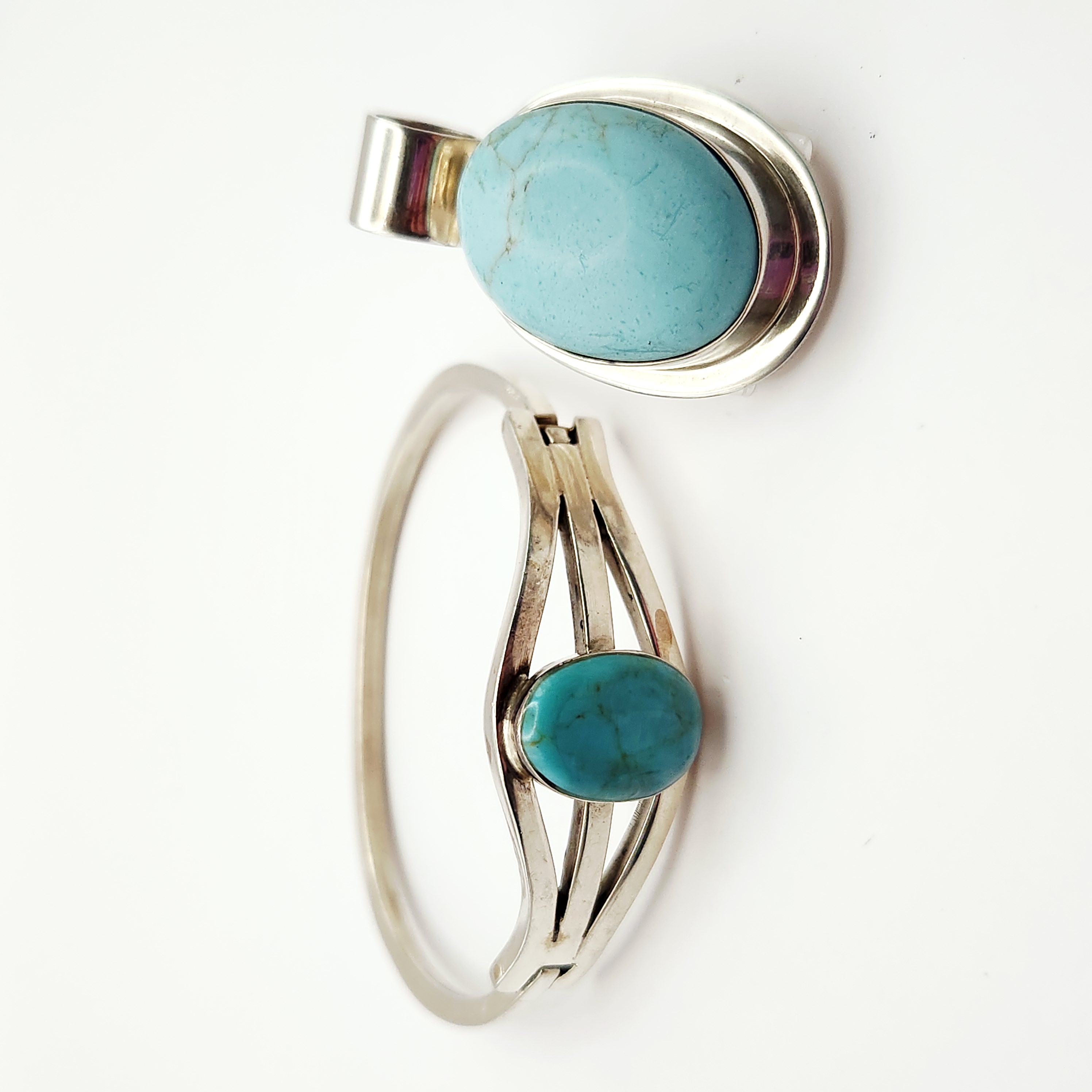 This lot consists of two jewelry items of Mexican origin featuring sterling silver and turquoise-stones. The first item is a pendant set with an oval cabochon turquoise, displaying a light sky blue color and a fine, sandy-brown matrix. The stone is housed in a plain bezel setting. The back of the pendant is stamped with the registration mark TH-215, MEXICO, and 925. The second item is a hinged bangle bracelet featuring an oval cabochon turquoise, characterized by a medium blue-green color and a dark, webbed matrix. The bracelet features a triple-split shoulder design and is marked on the interior with TU-61, MEXICO, and 925.