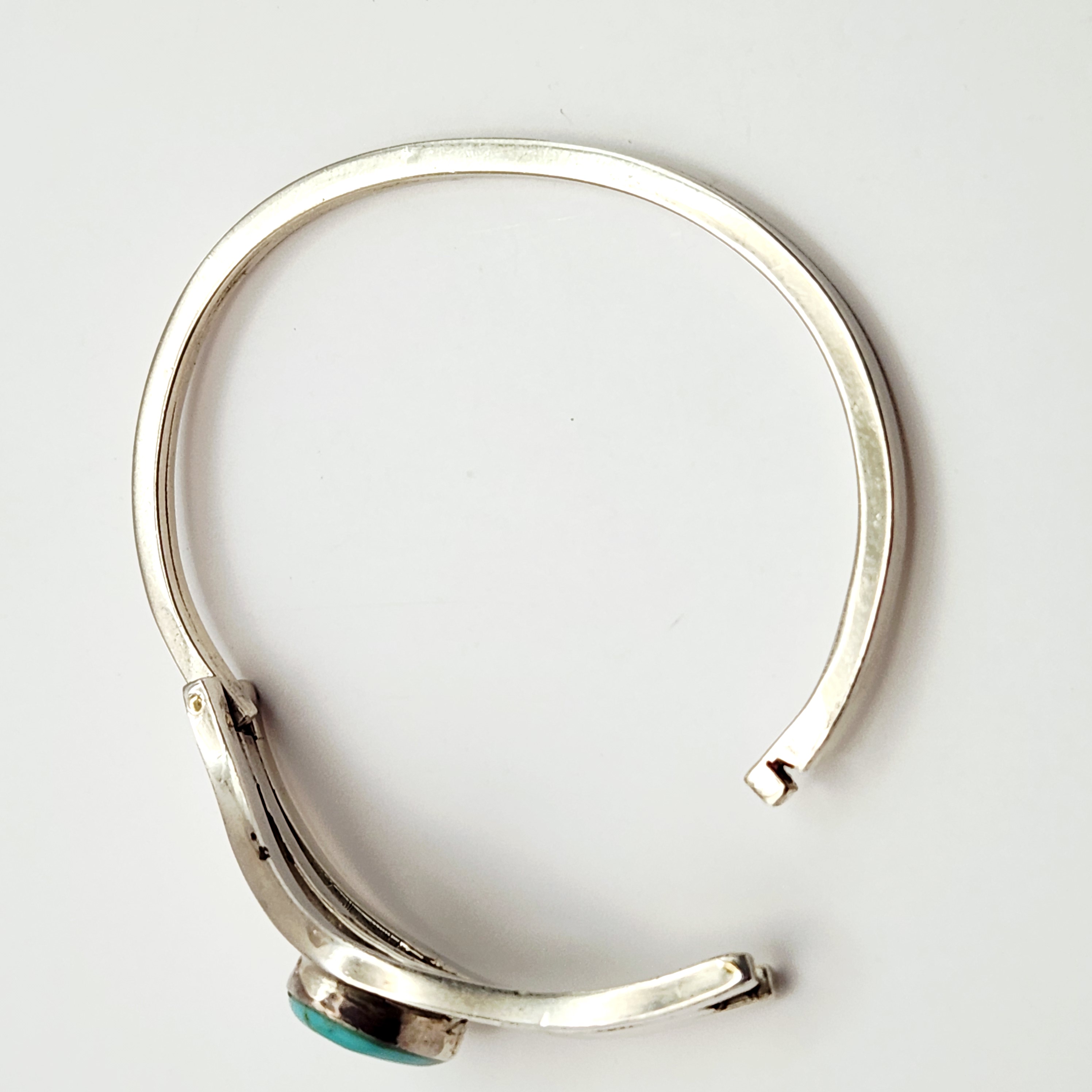Both items show signs of wear including surface scratches and tarnishing consistent with age. The bangle exhibits moderate tarnishing in the recessed areas of the design. The hinge on the bracelet is functional. The stones appear secure in their settings with no visible chips or cracks; the matrix lines and surface variations are natural characteristics of the material.