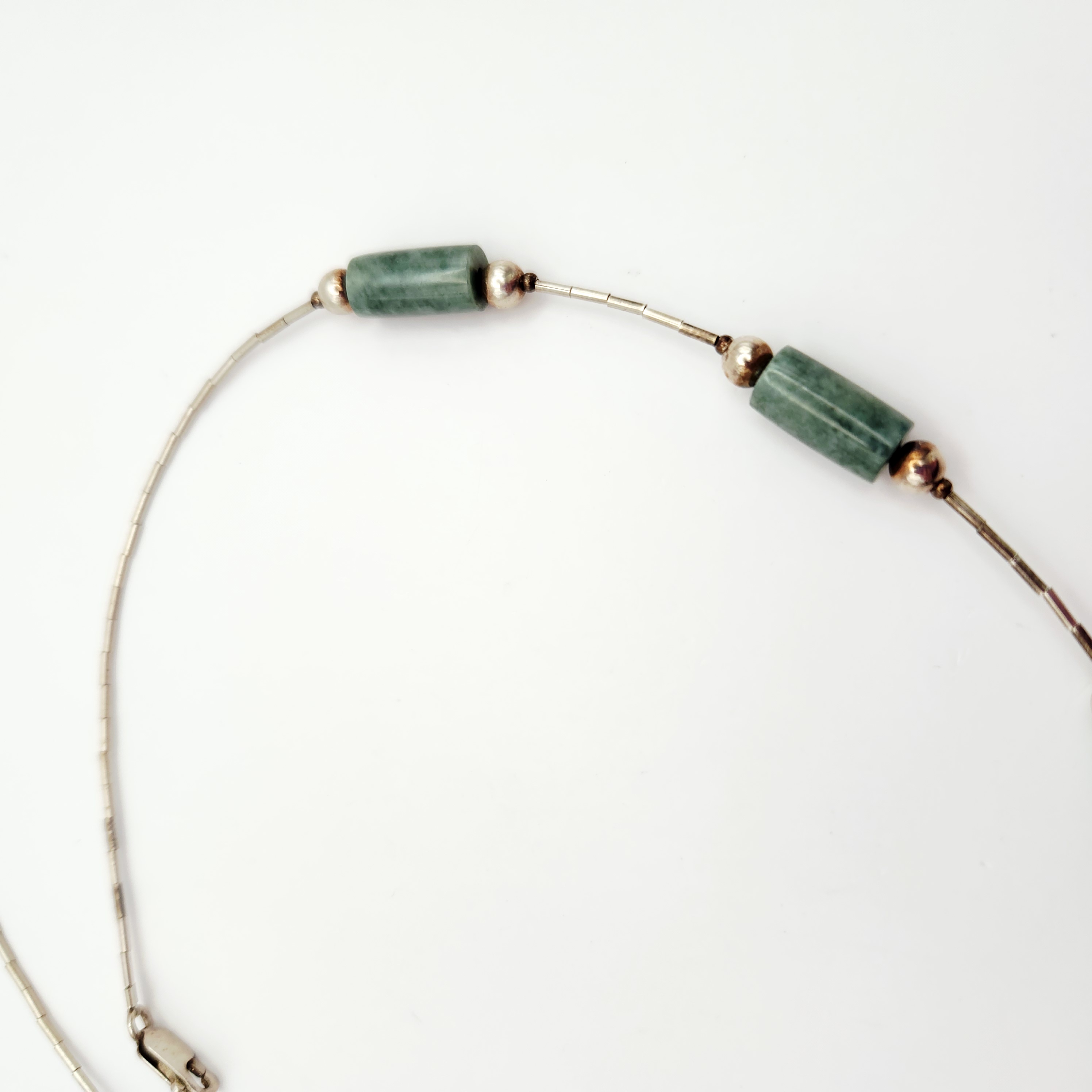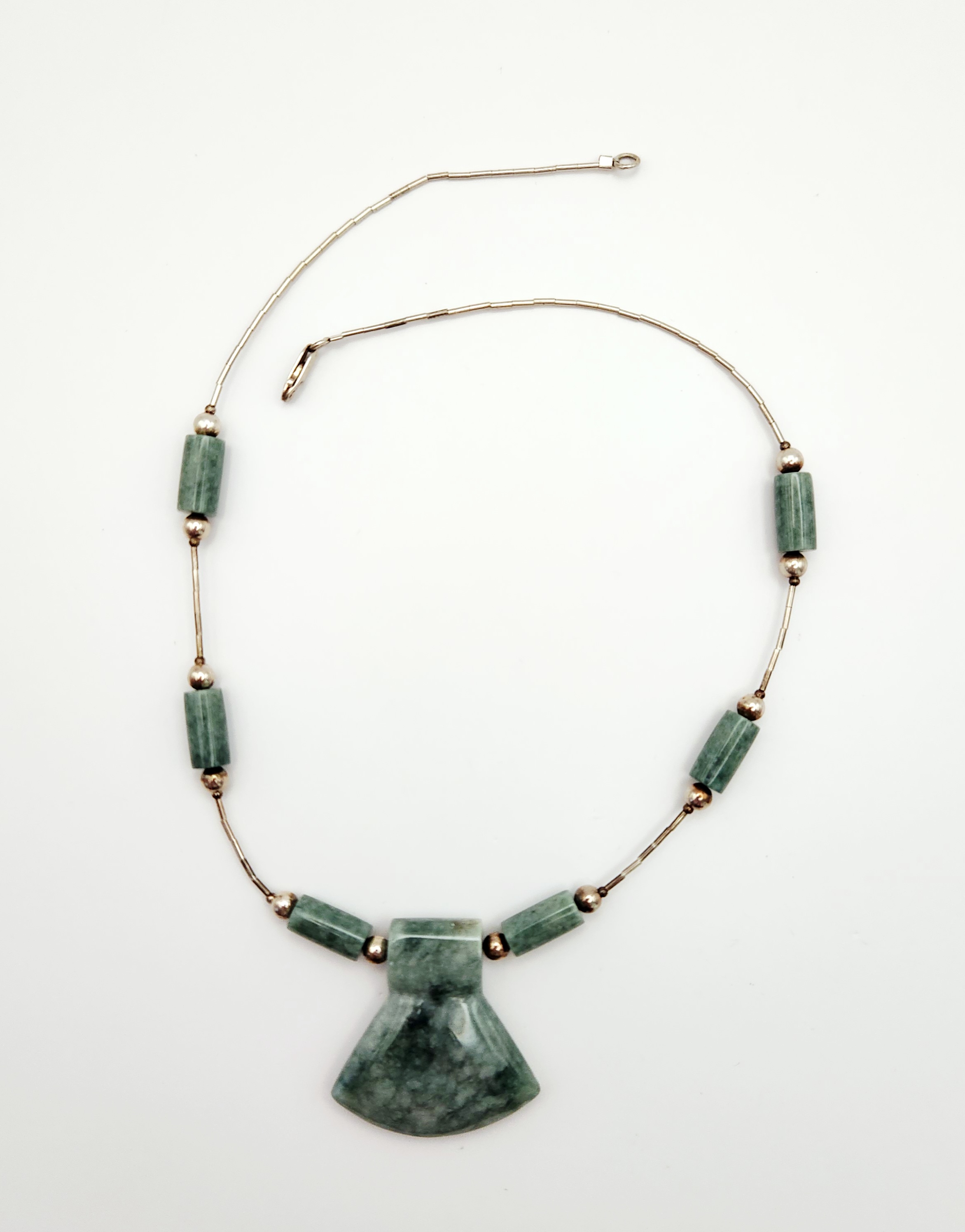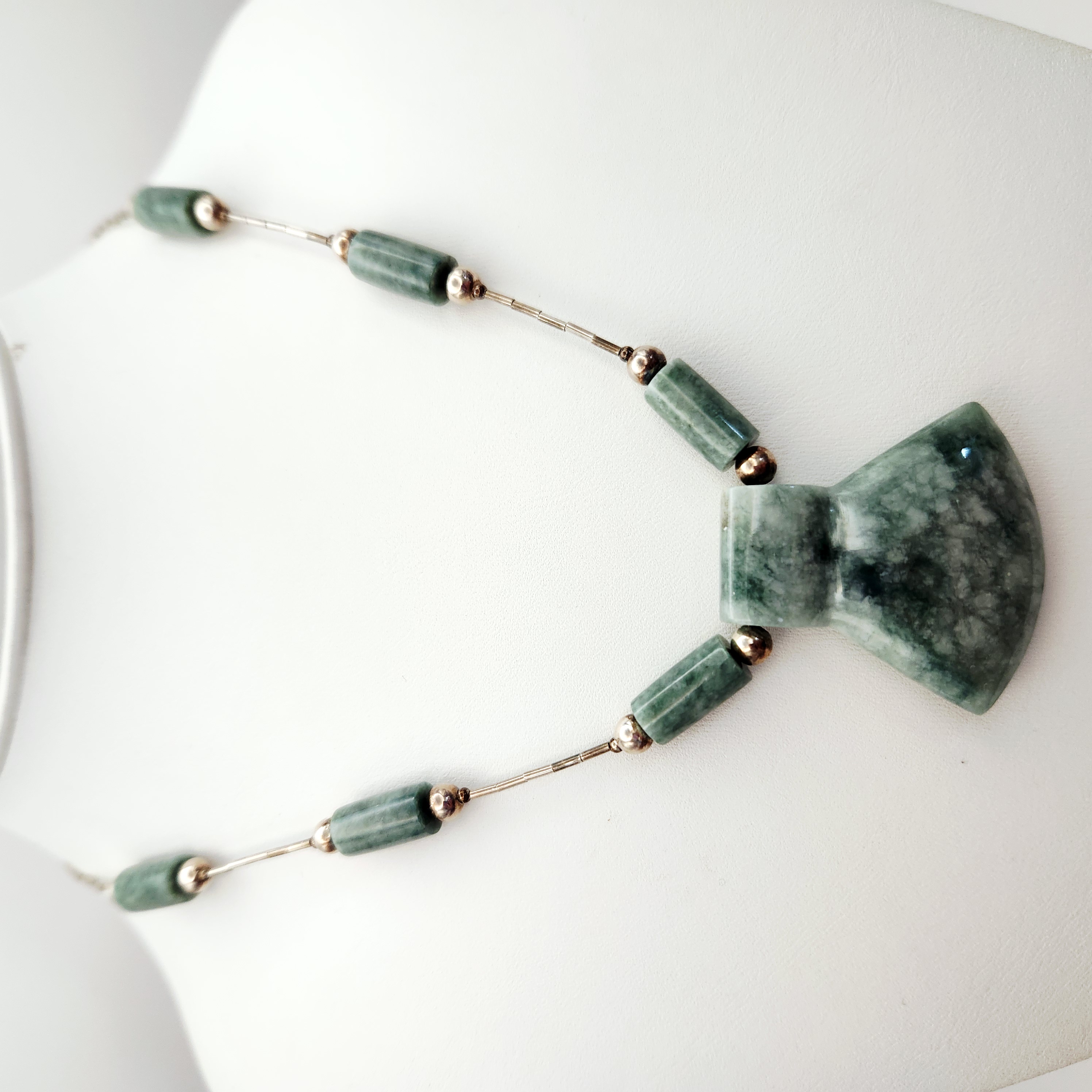 This necklace features a central carved jade pendant and six cylindrical jade tube beads. The jade is a mottled green color with natural variations in tone and texture. The pendant is carved into a flared, geometric shape. The strand is composed of sterling silver tubular beads, commonly known as liquid silver, and small round silver spacer beads. The piece is finished with a sterling silver lobster claw clasp. The interior of the clasp is stamped with the mark 925, indicating sterling silver purity. The construction combines Chinese jade components with Southwestern style silver beadwork. Length: 17 inches Pendant Width: 1.5 inches Weight: 31.9 grams. The necklace is in very good condition. There is minor surface tarnish on the silver beads and clasp consistent with age. The jade components show no visible chips, cracks, or signs of repair.