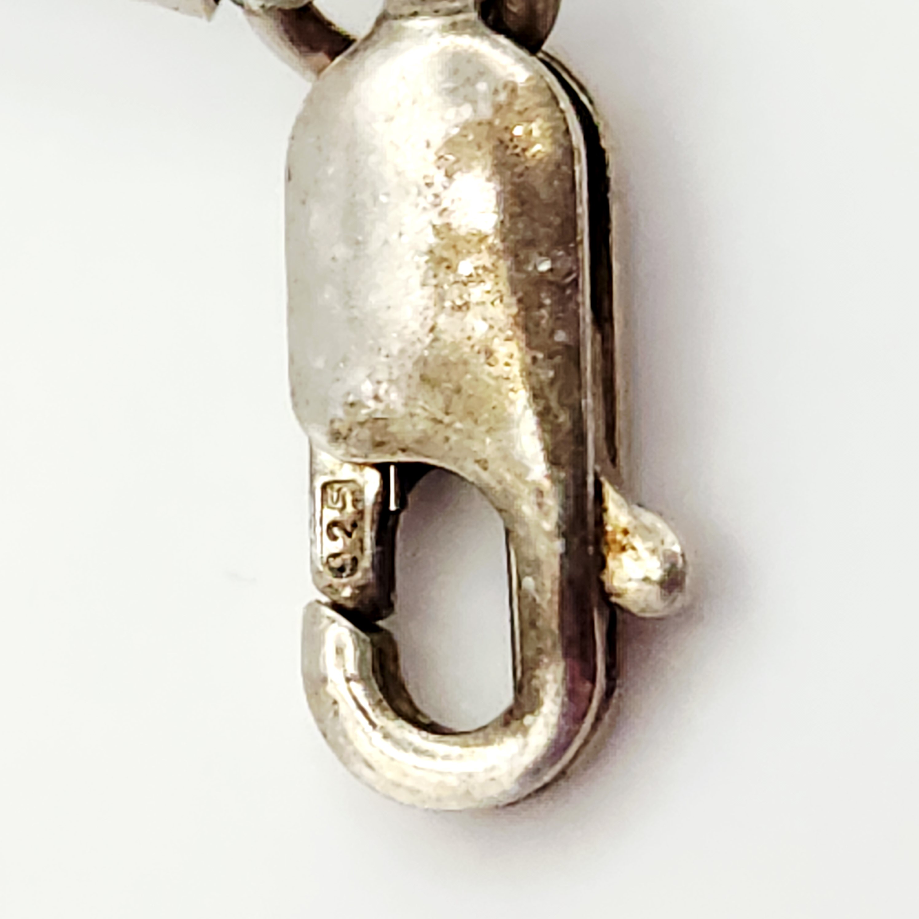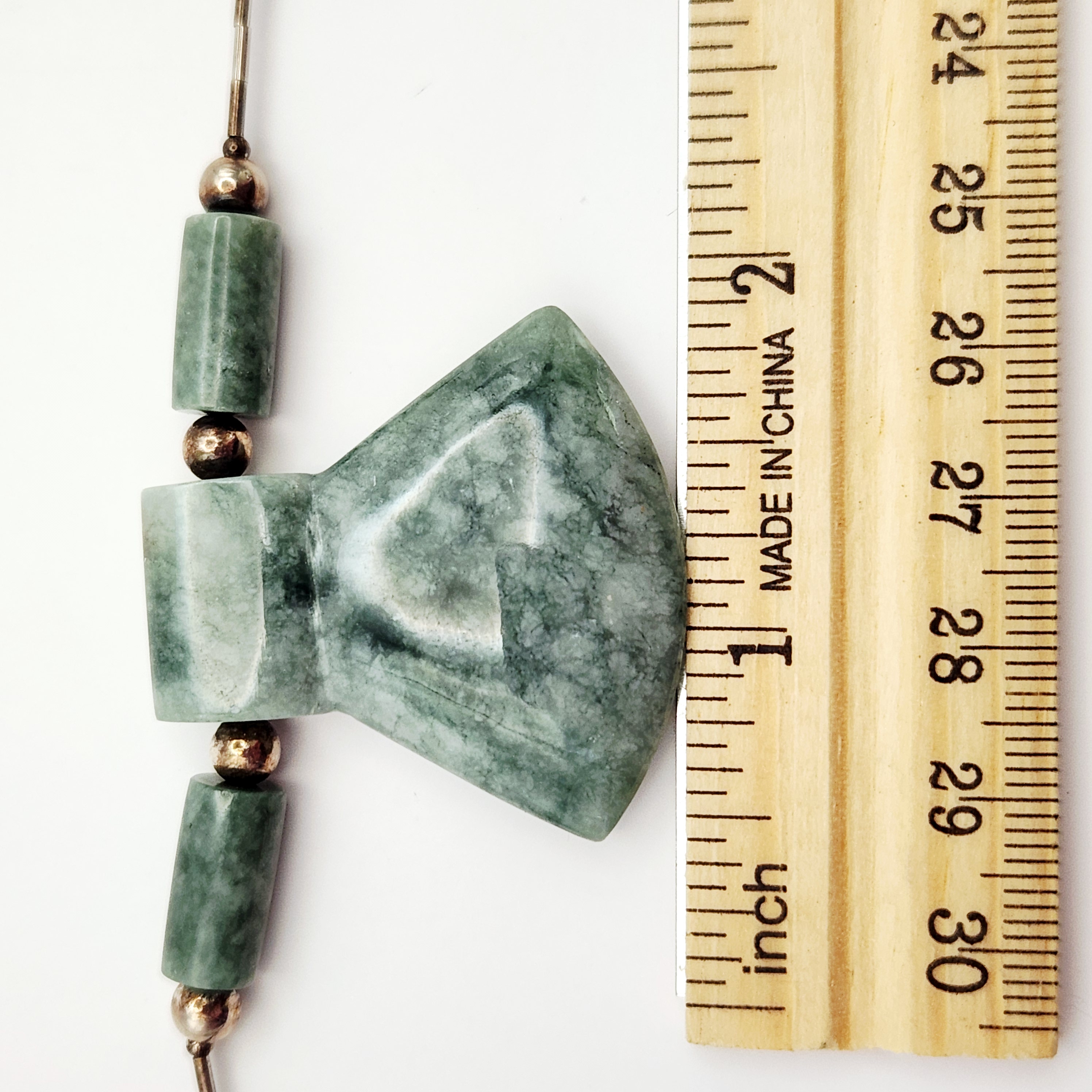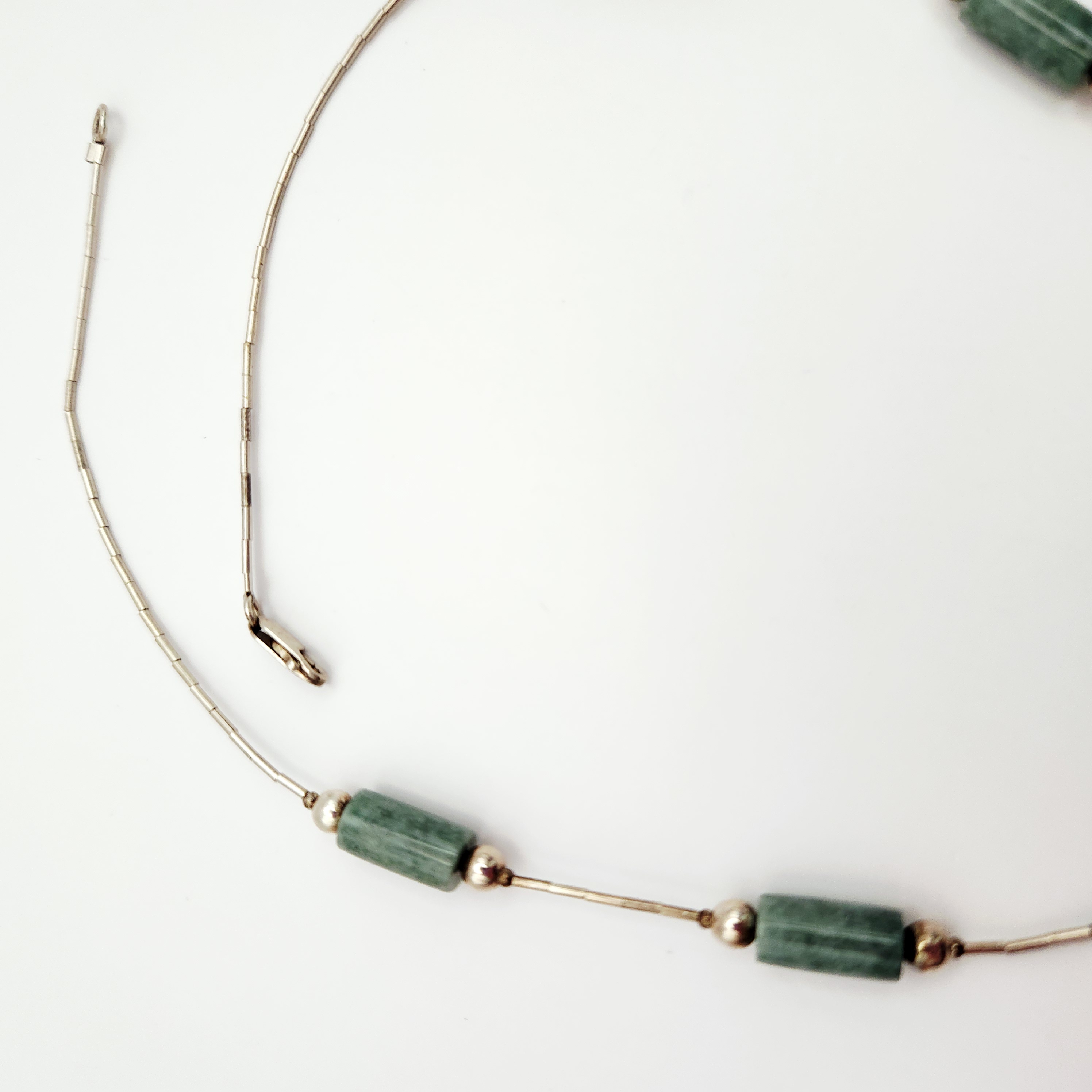 This necklace features a central carved jade pendant and six cylindrical jade tube beads. The jade is a mottled green color with natural variations in tone and texture. The pendant is carved into a flared, geometric shape. The strand is composed of sterling silver tubular beads, commonly known as liquid silver, and small round silver spacer beads. The piece is finished with a sterling silver lobster claw clasp. The interior of the clasp is stamped with the mark 925, indicating sterling silver purity. The construction combines Chinese jade components with Southwestern style silver beadwork. Length: 17 inches Pendant Width: 1.5 inches Weight: 31.9 grams. The necklace is in very good condition. There is minor surface tarnish on the silver beads and clasp consistent with age. The jade components show no visible chips, cracks, or signs of repair.