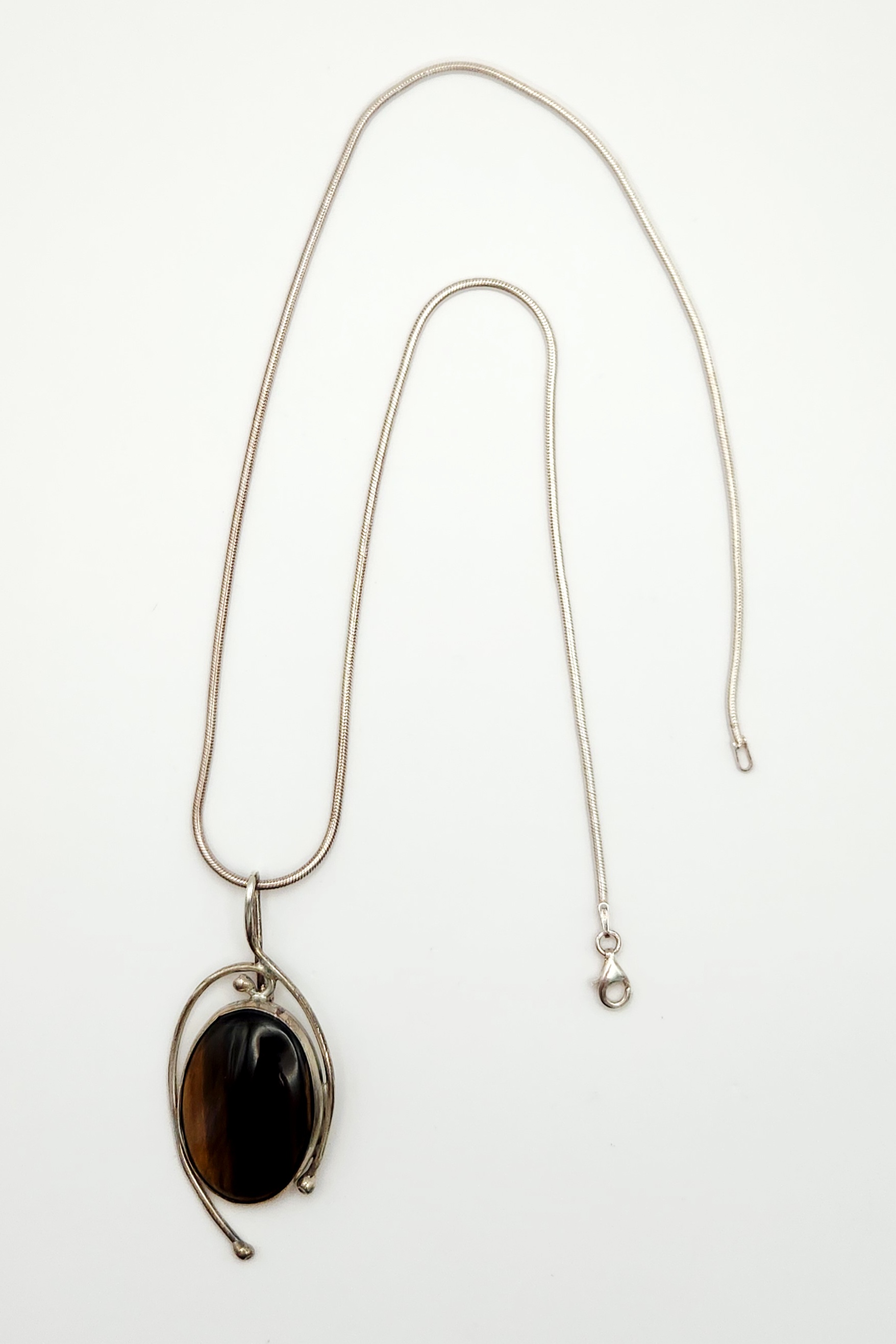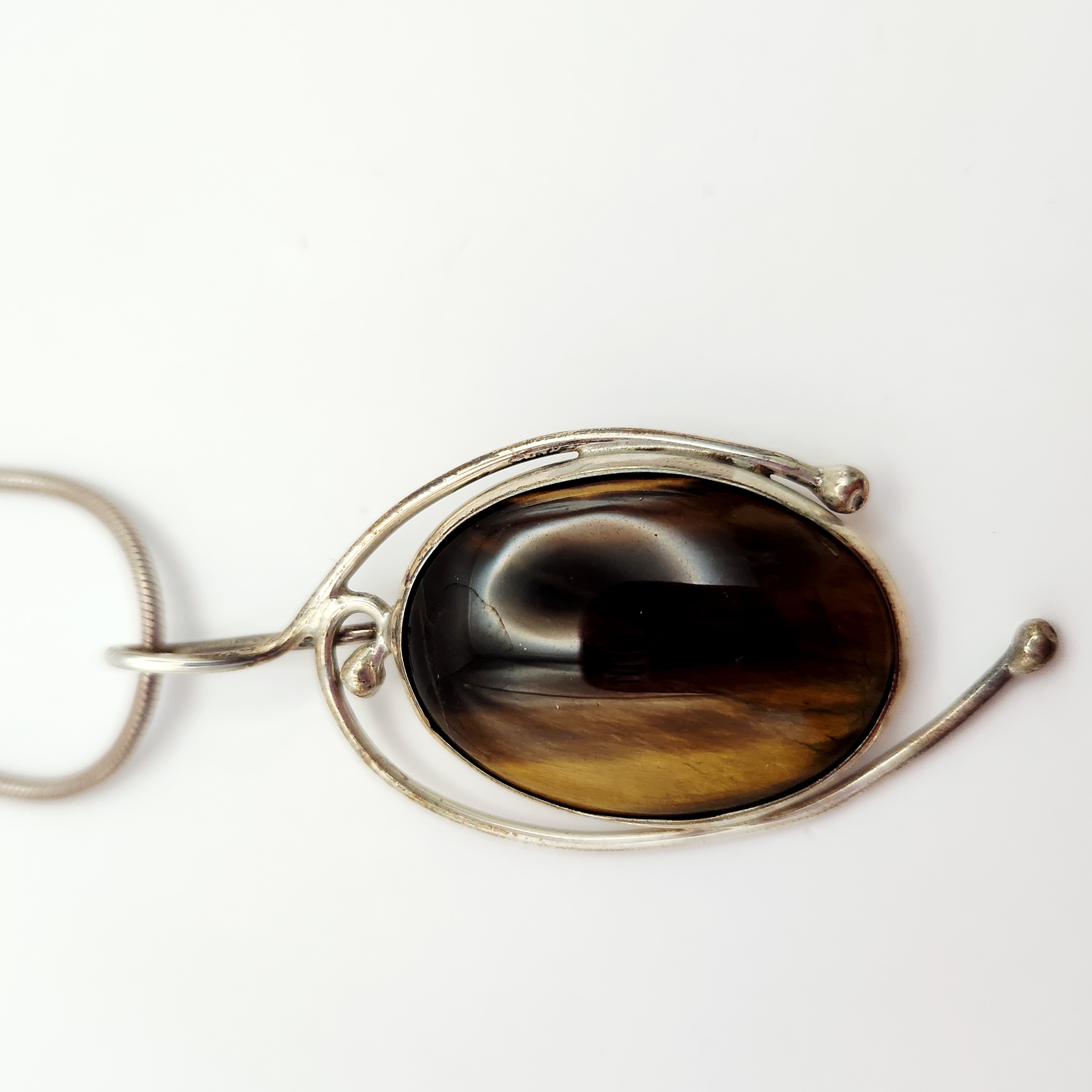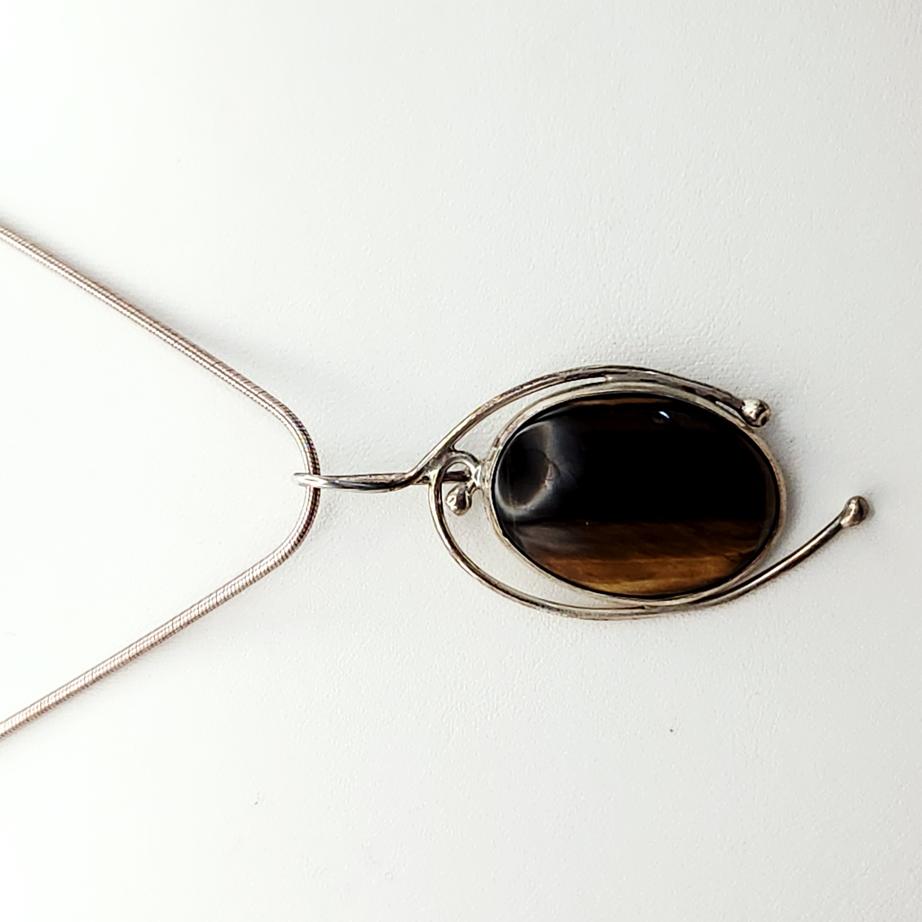 A modernist studio jewelry necklace featuring a pendant by J. Sanford. The pendant consists of a large oval tiger’s eye cabochon set within a stylized sterling silver frame featuring openwork wire designs and ball terminals. The pendant is suspended from a sterling silver snake chain. The reverse of the pendant is hand-engraved J Sanford. The lobster claw clasp and the chain end caps are stamped 925. Pendant length: approximately 1.5 inches Total weight: 18.6 grams. Good condition with minor surface scratches and light tarnish throughout consistent with age and wear.